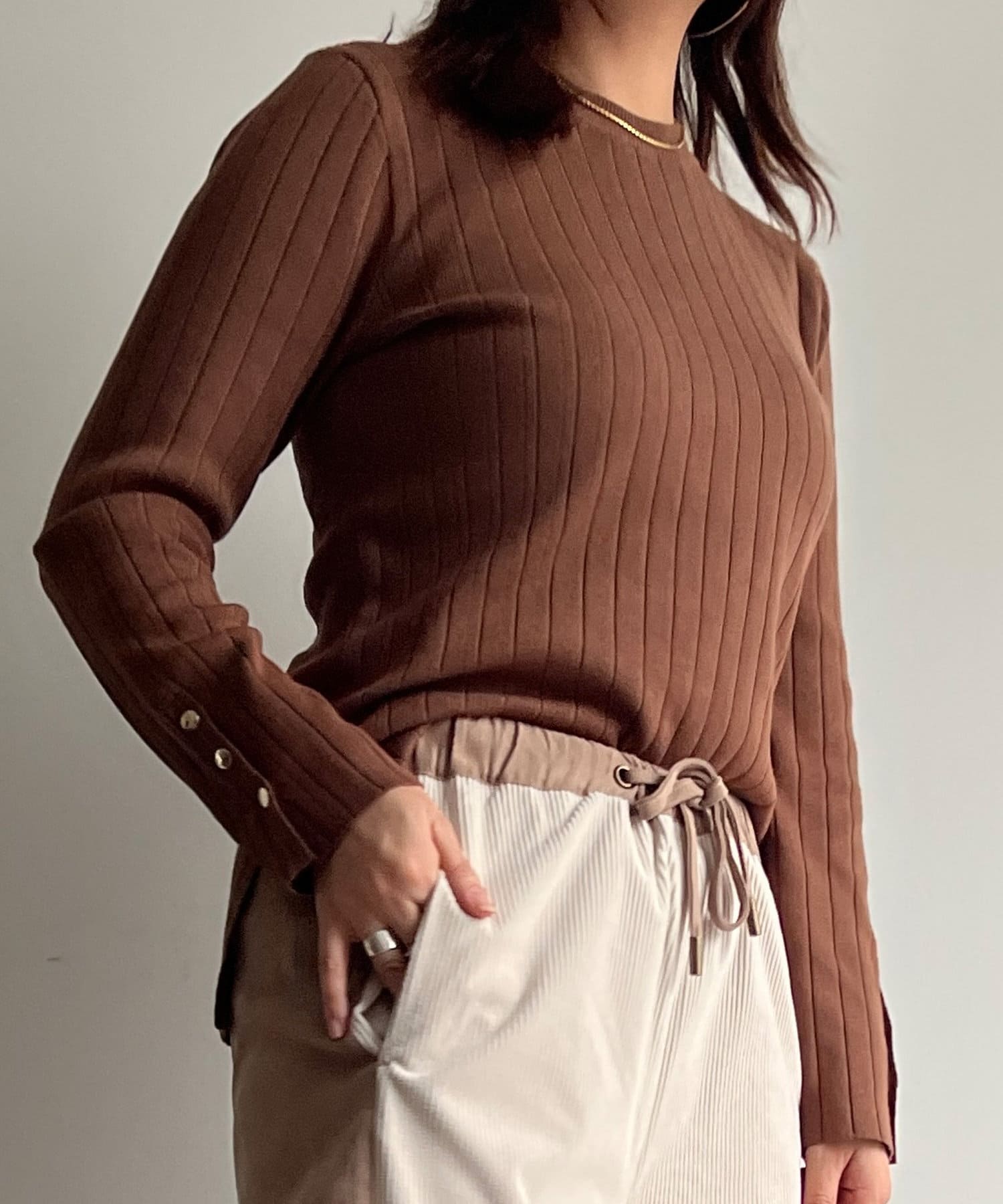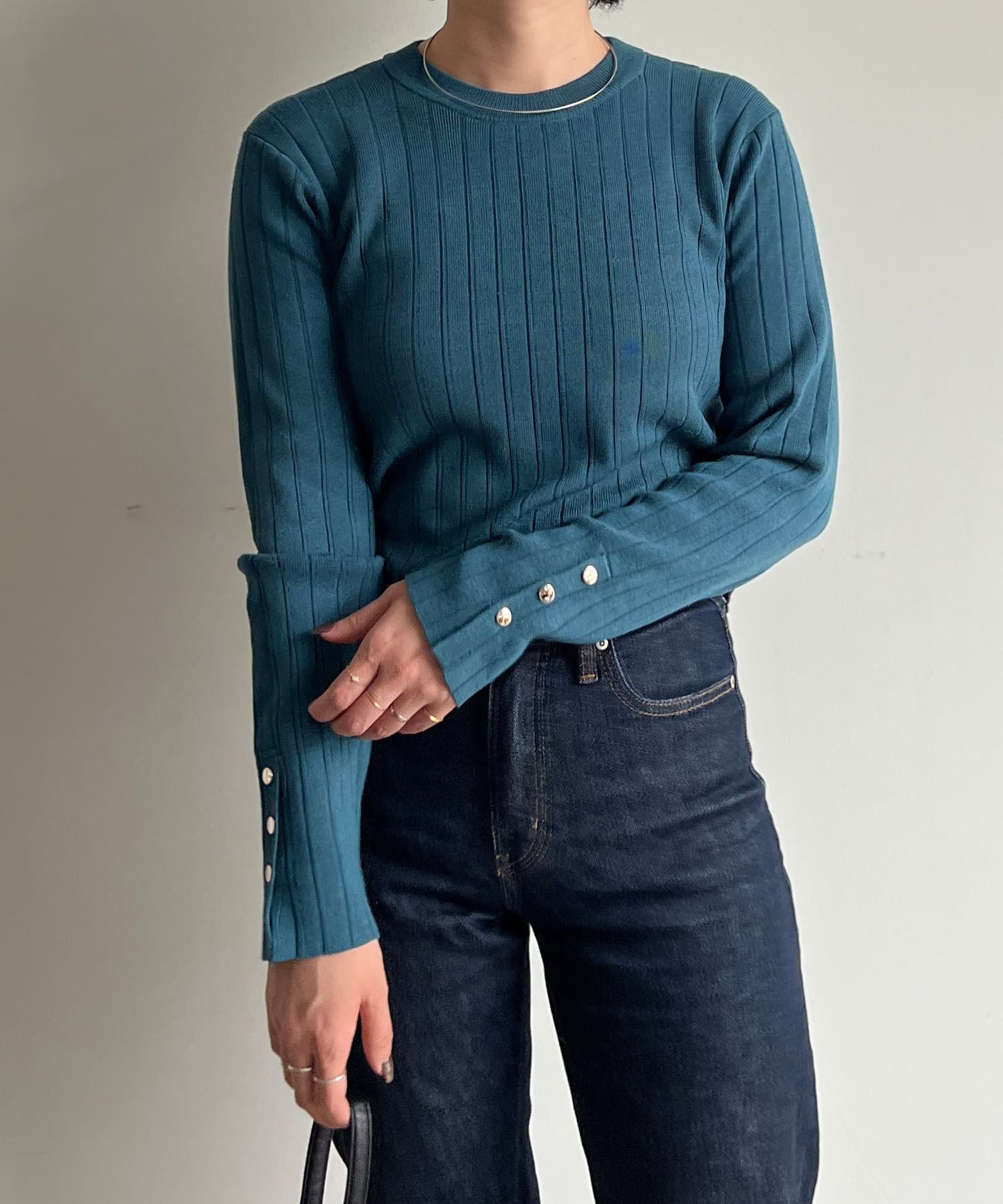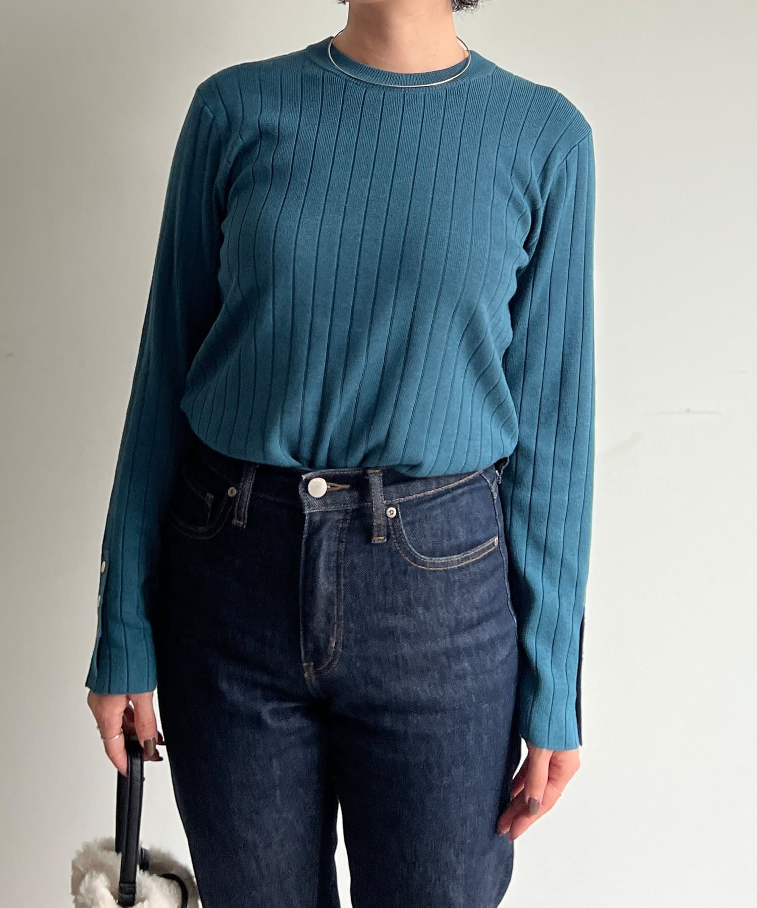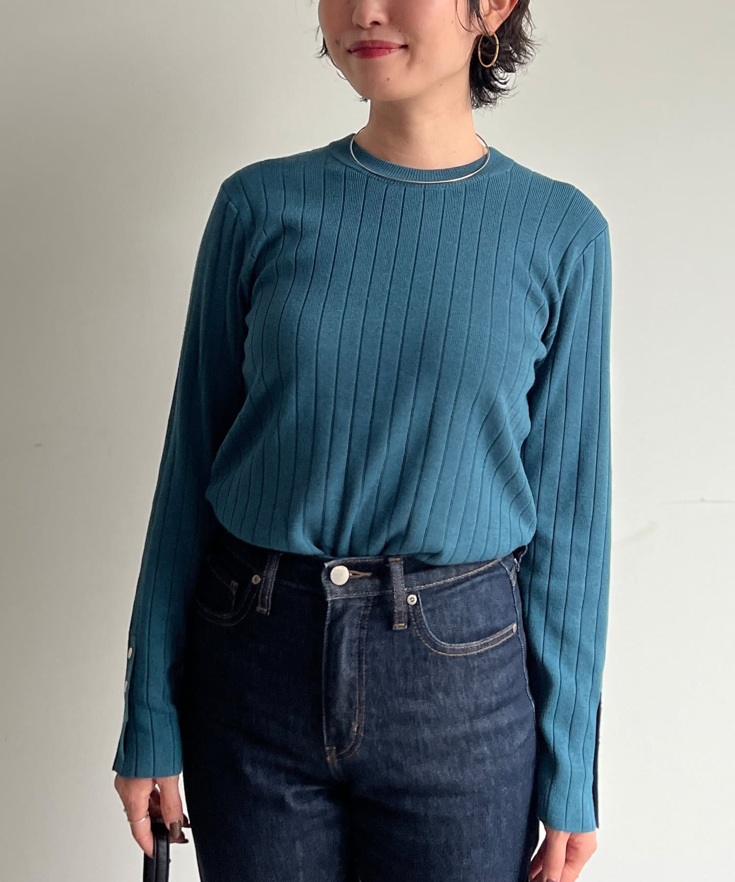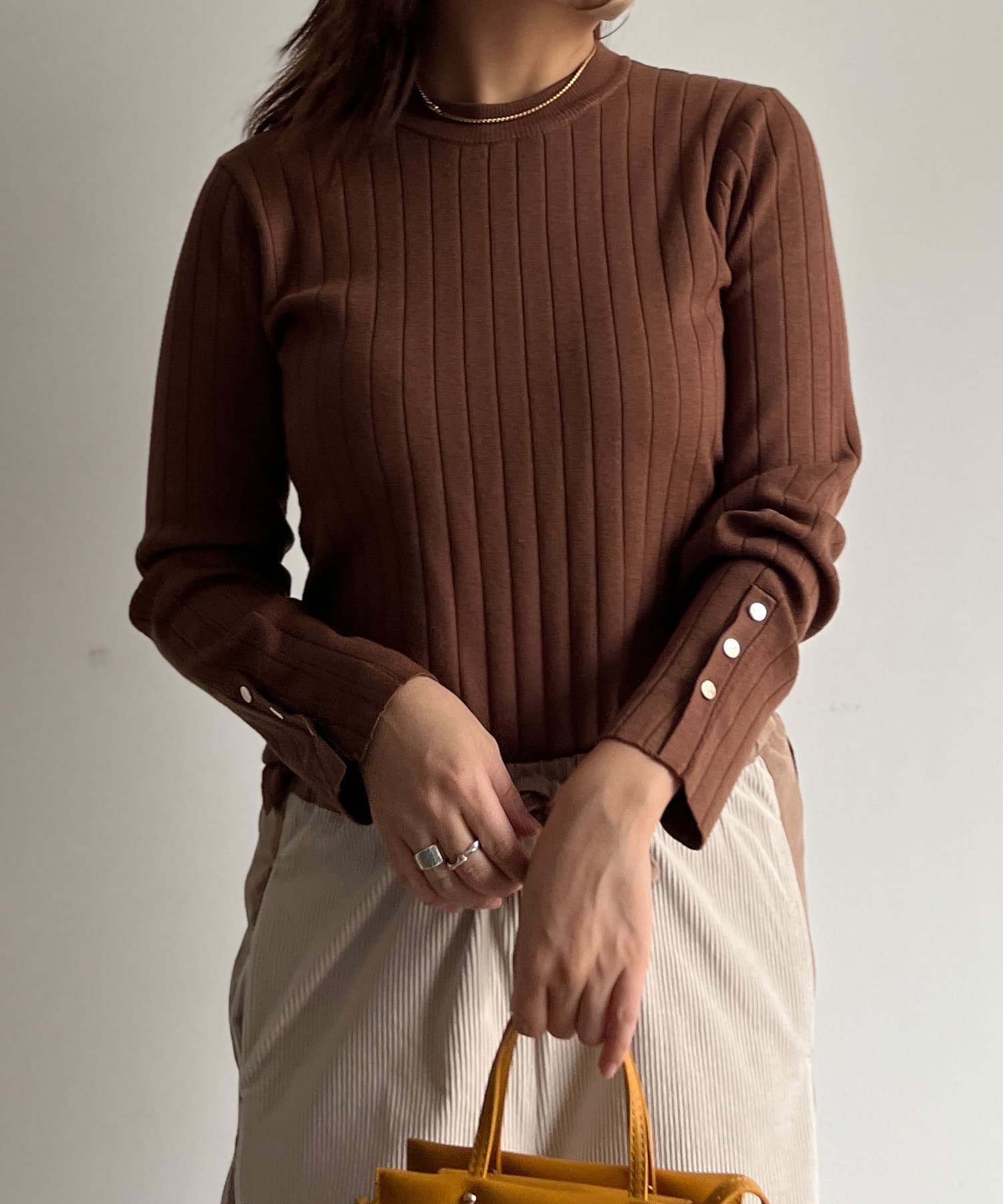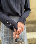 袖にはポイントとなるゴールヂボタンがついているので、インナーだけでなく1枚でシンプルな着こなしにもオススメのトップスです。