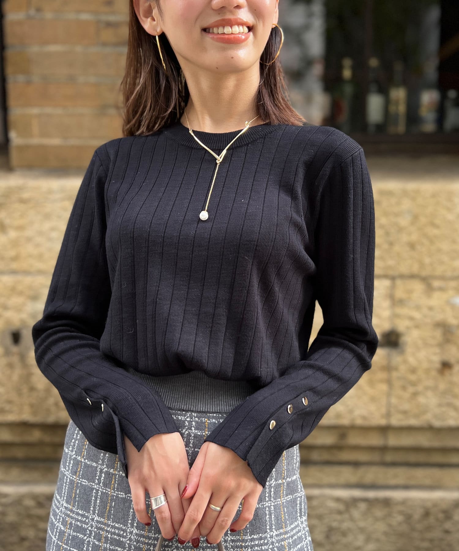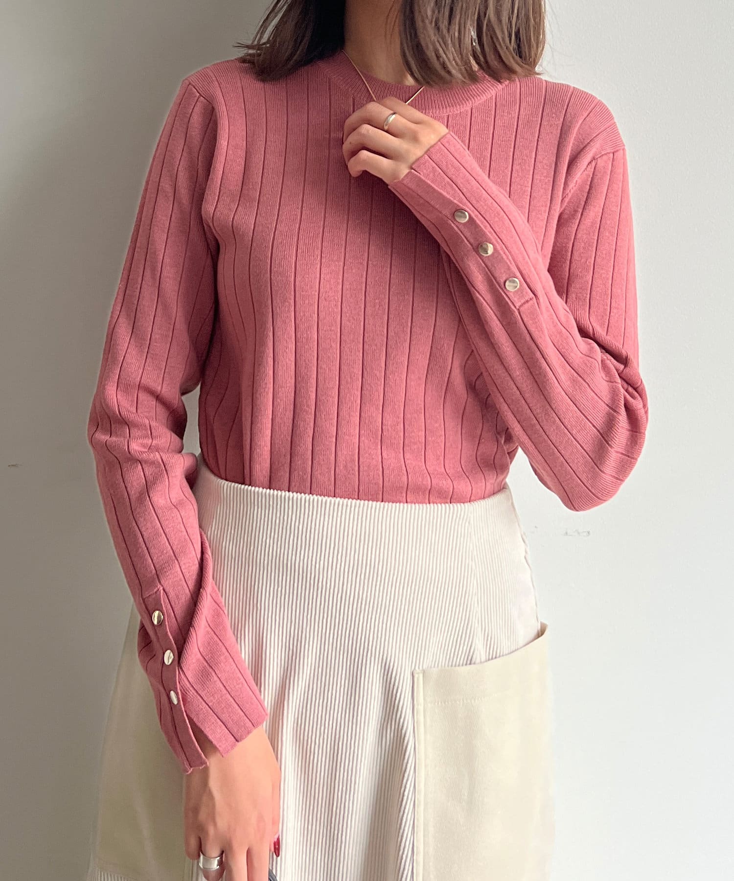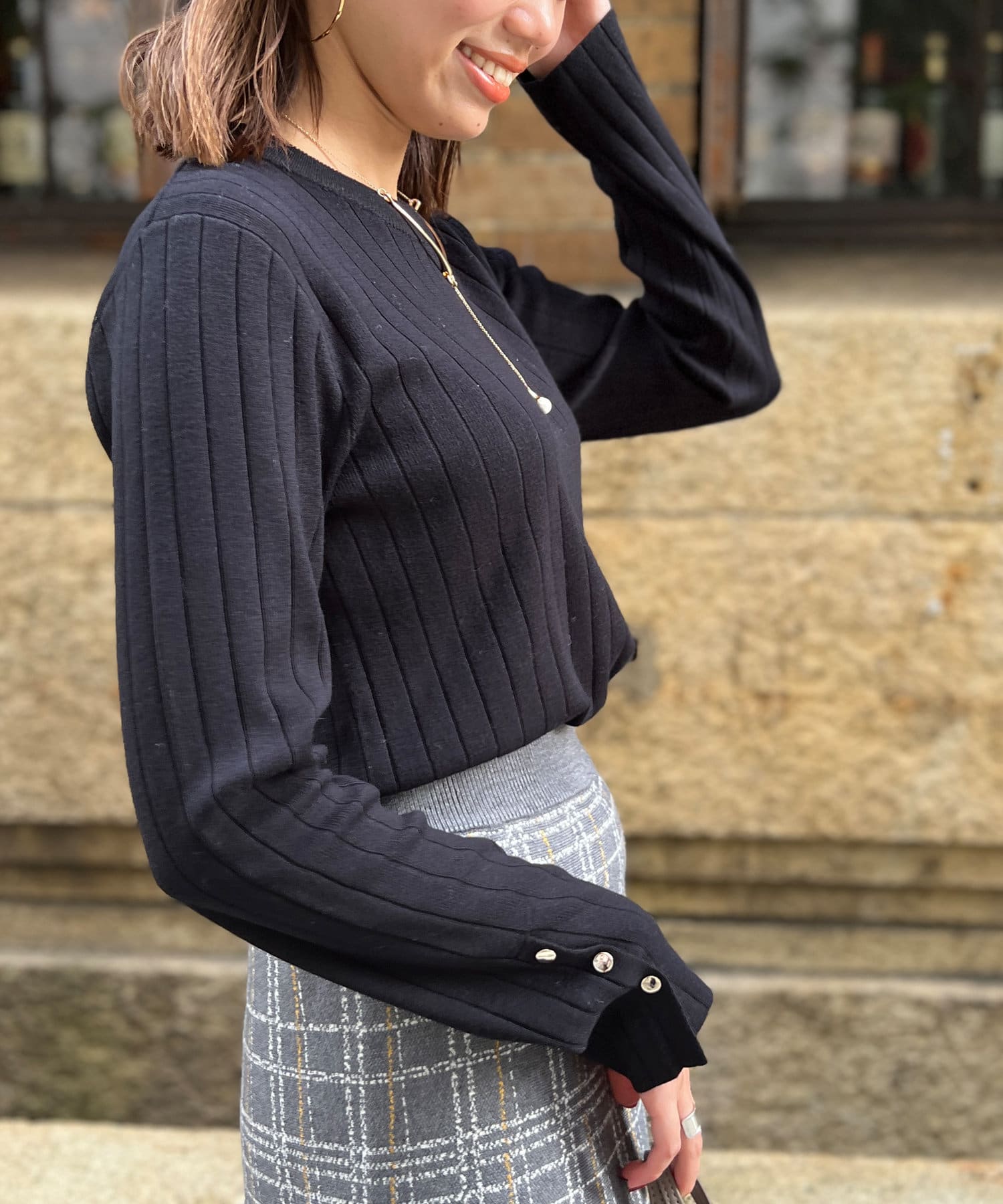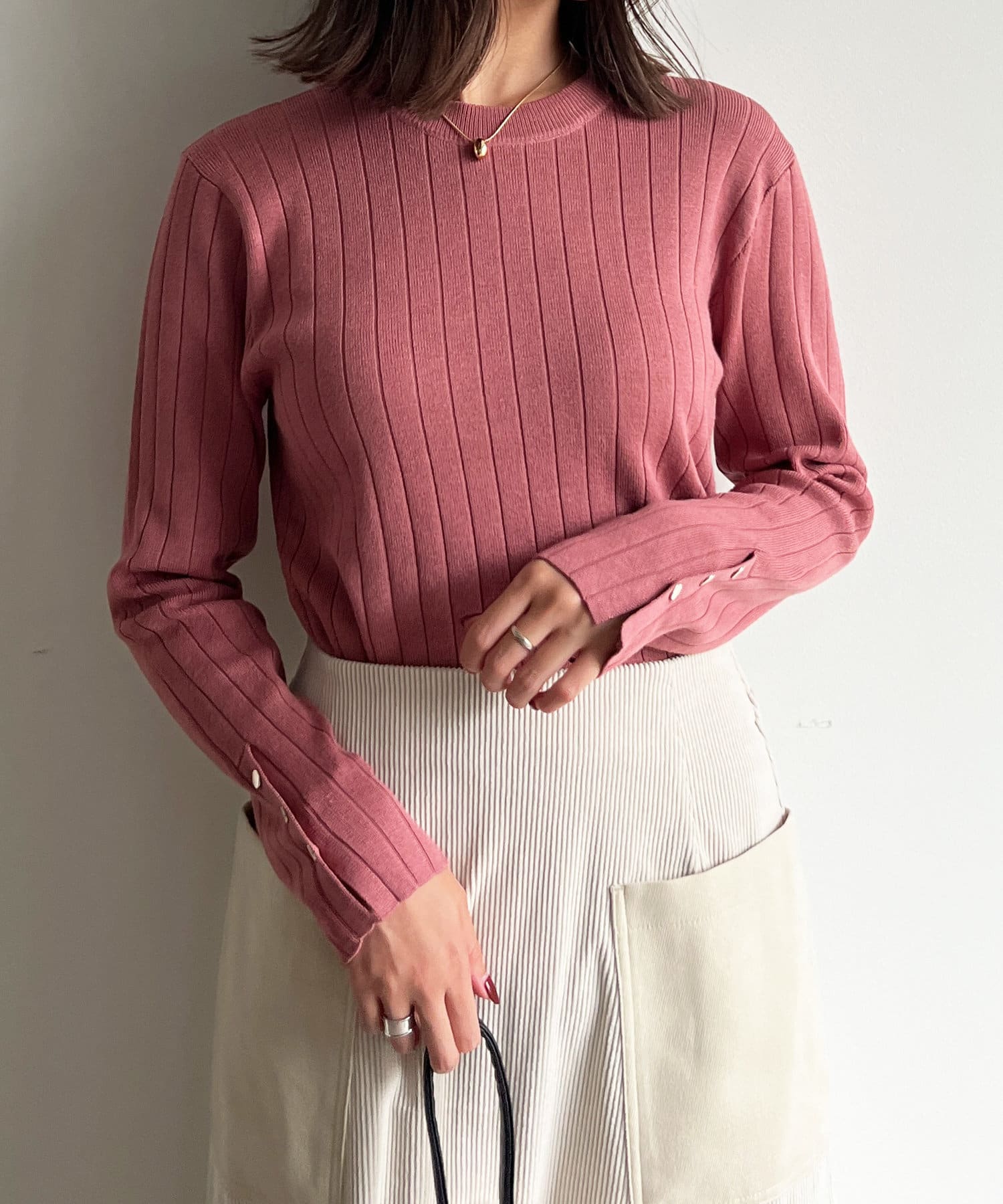 袖にはポイントとなるゴールヂボタンがついているので、インナーだけでなく1枚でシンプルな着こなしにもオススメのトップスです。