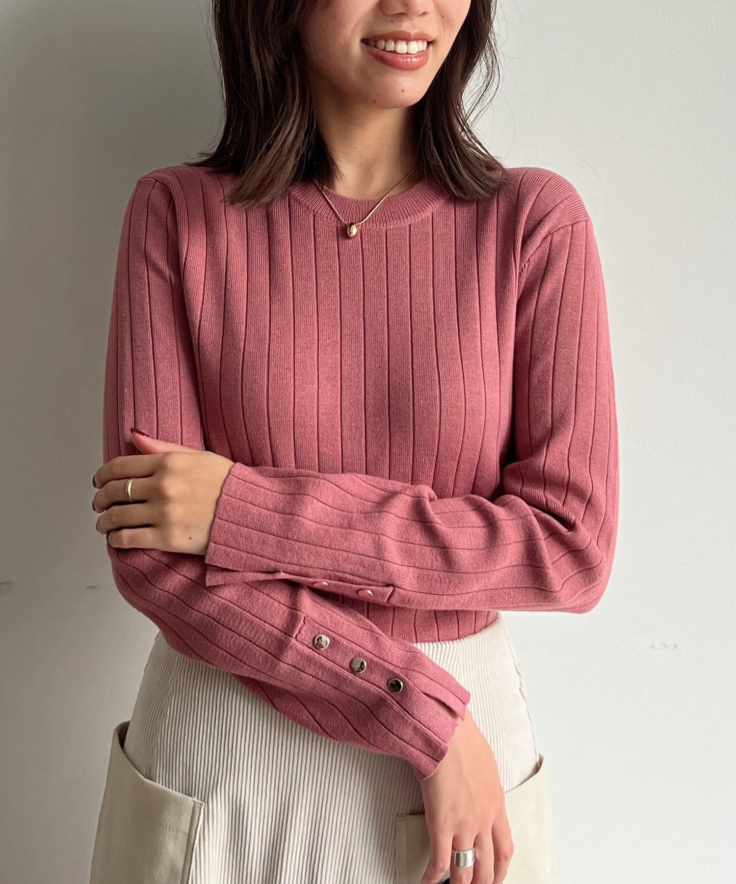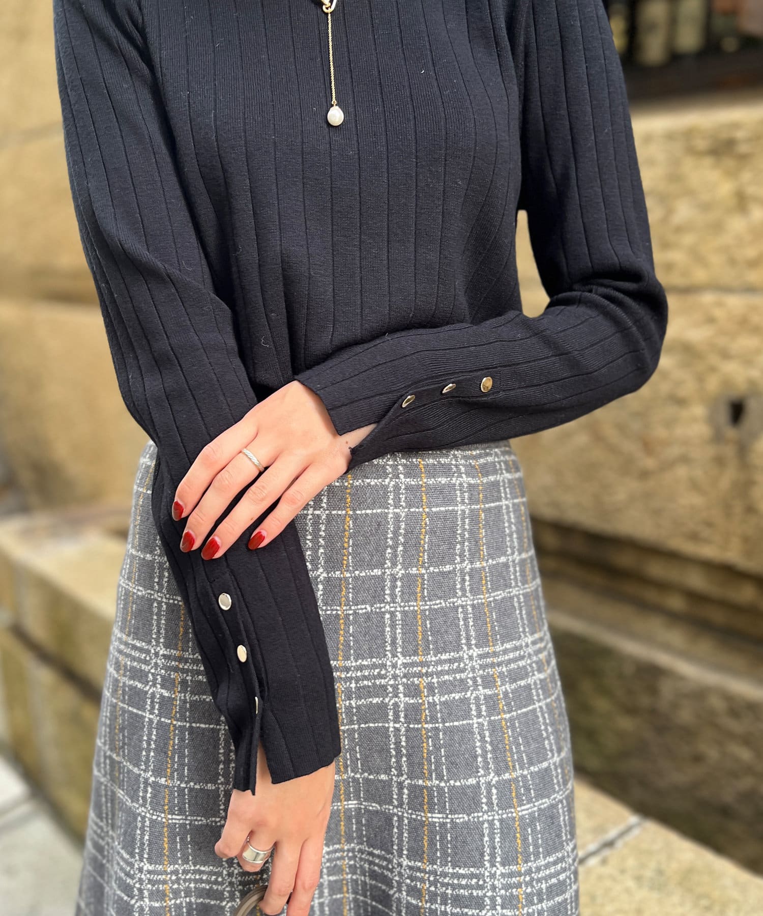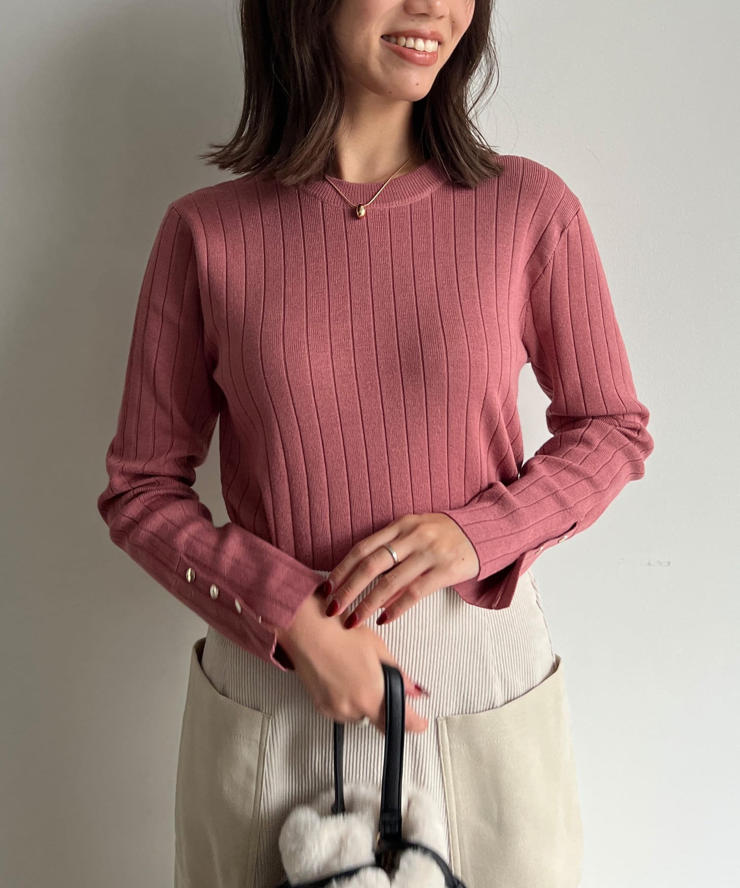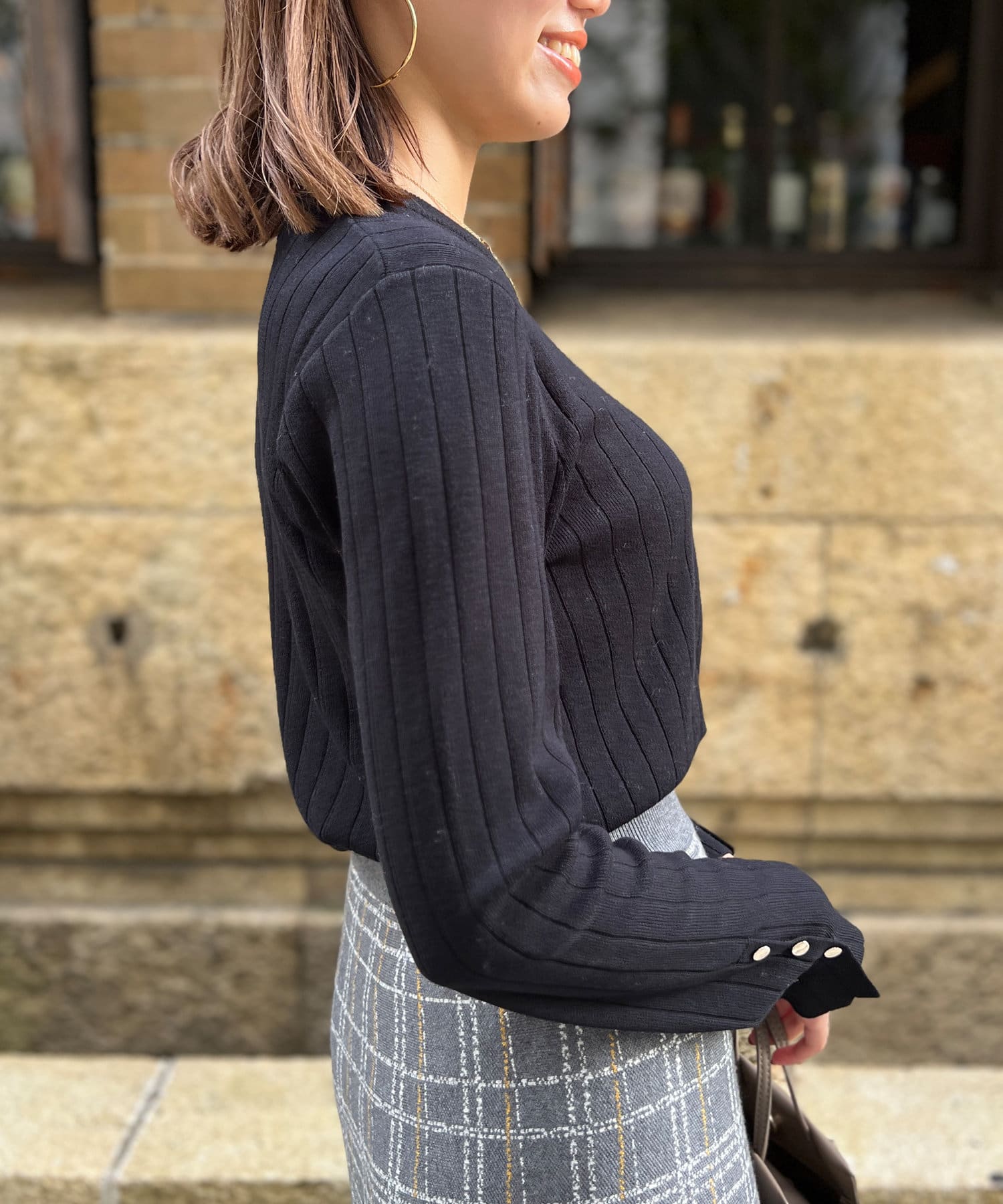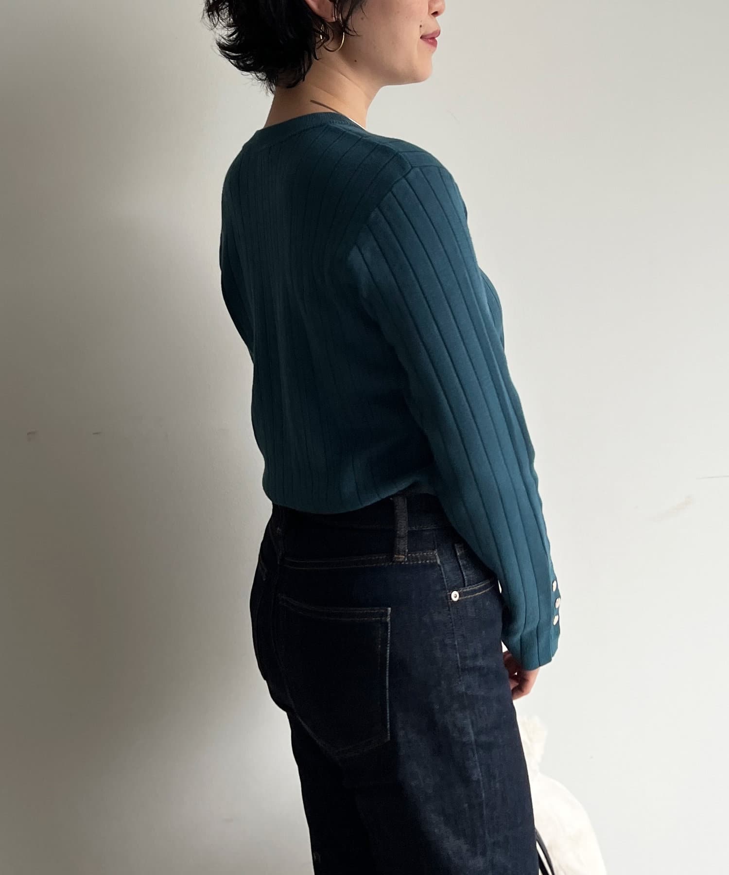 袖にはポイントとなるゴールヂボタンがついているので、インナーだけでなく1枚でシンプルな着こなしにもオススメのトップスです。