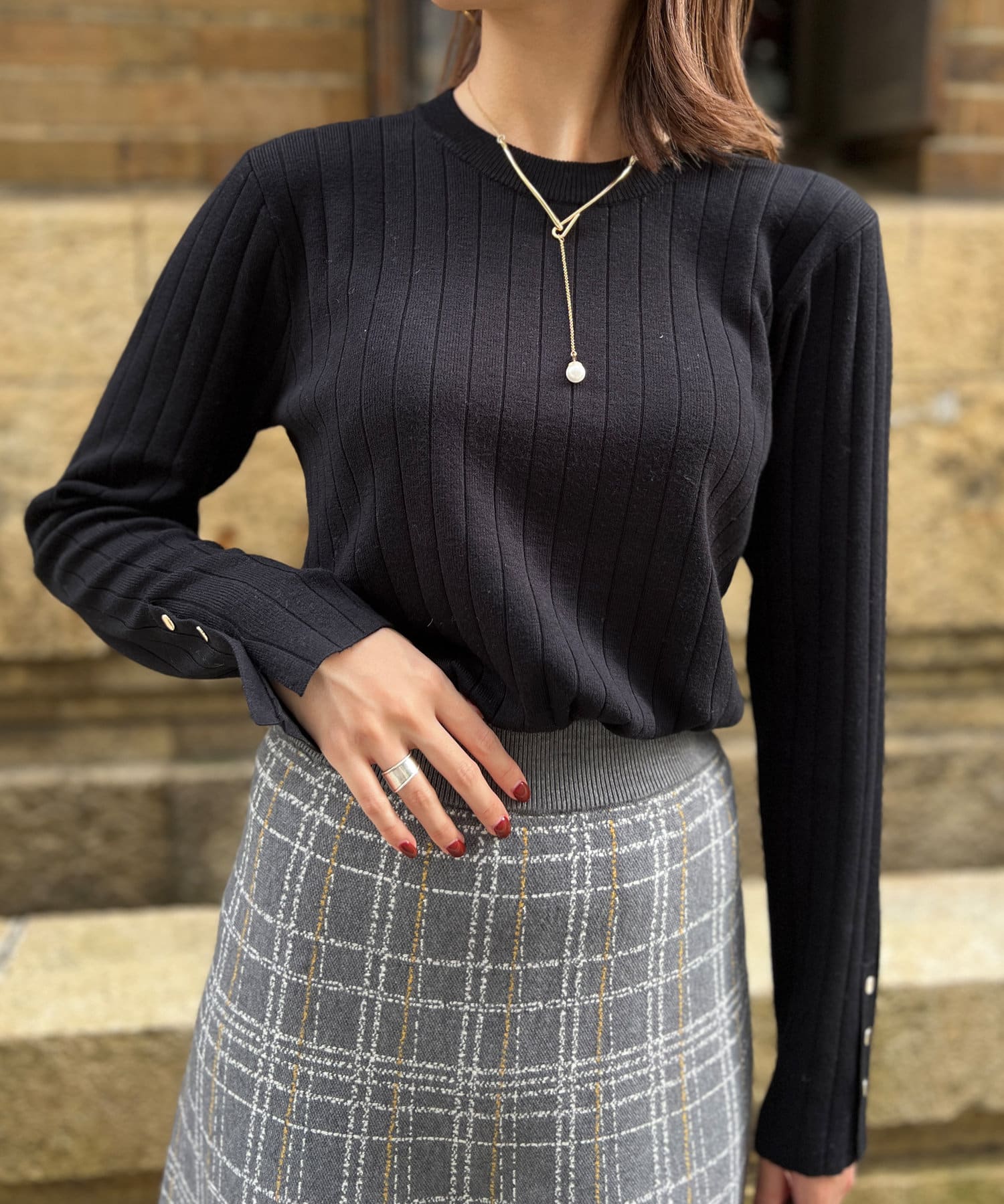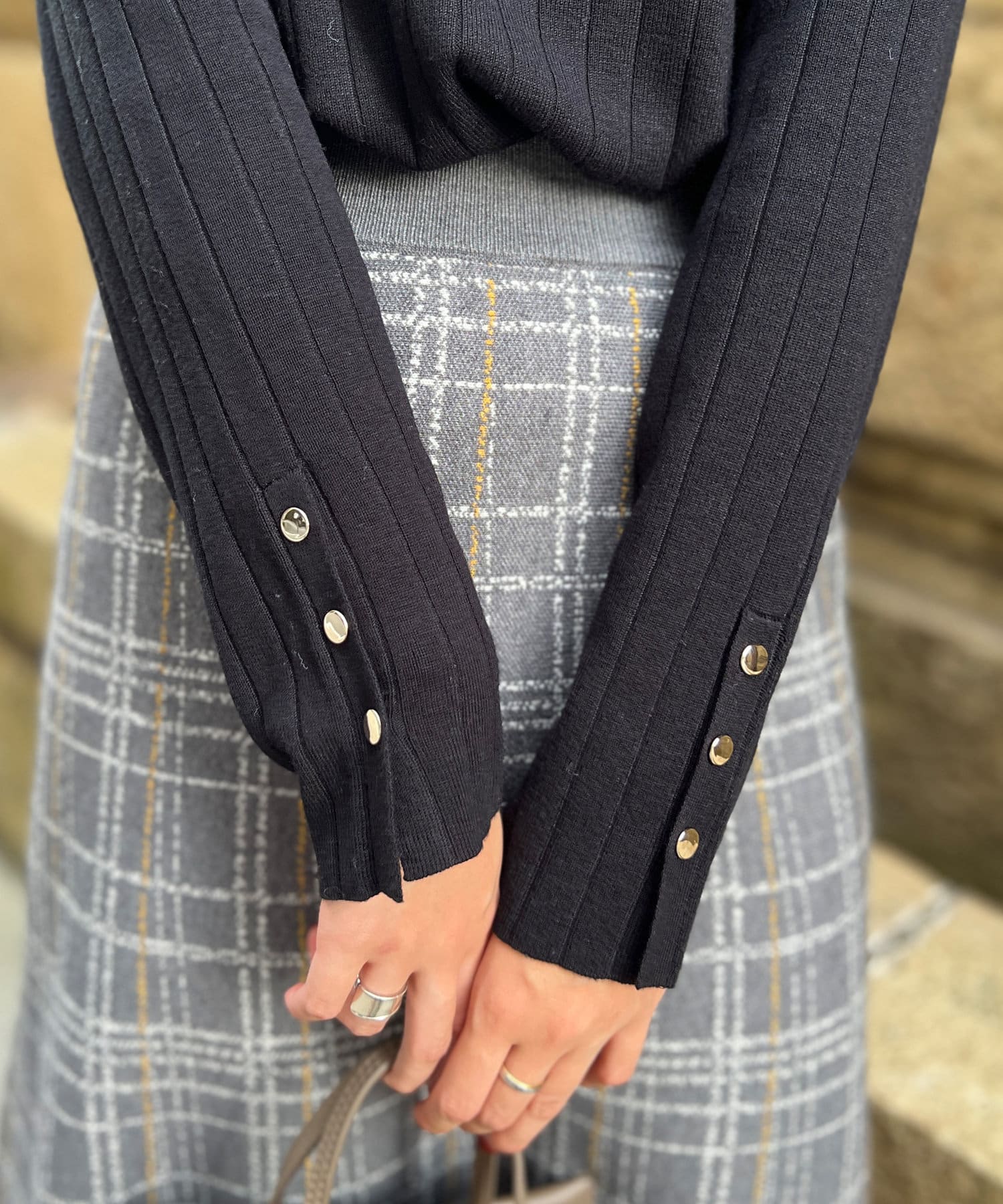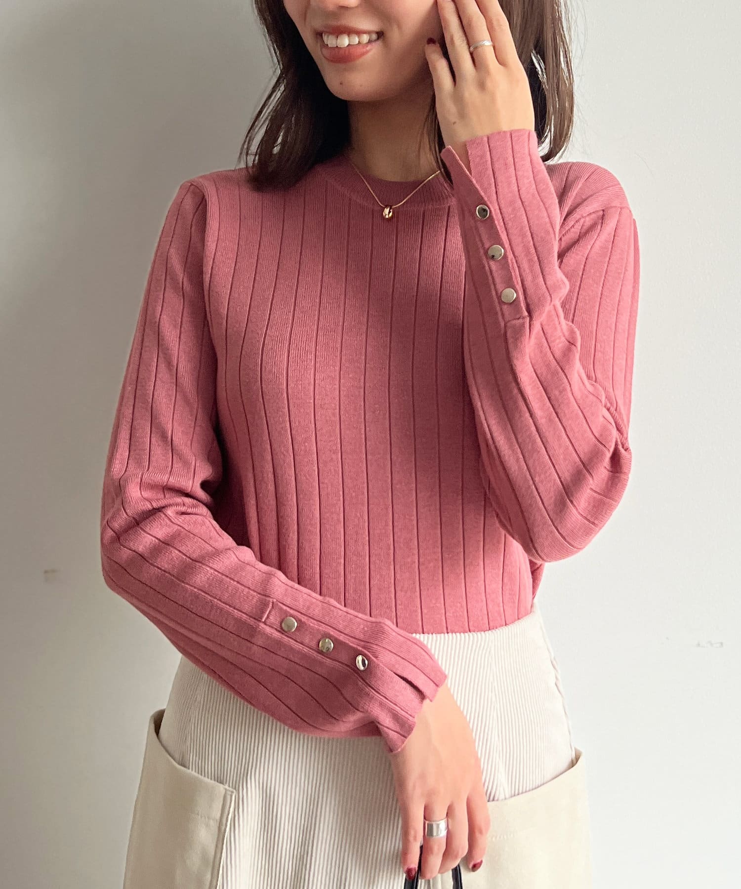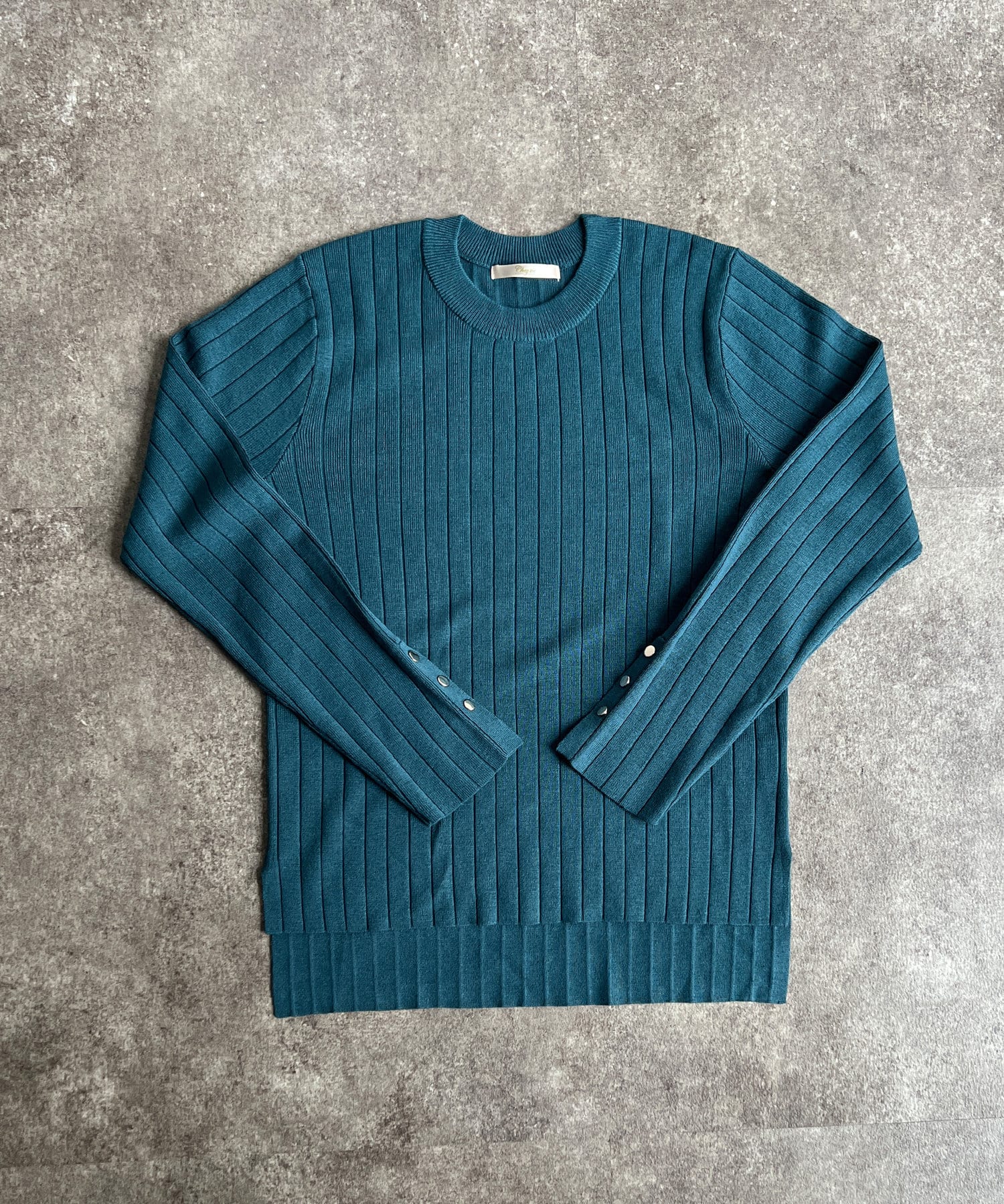 袖にはポイントとなるゴールヂボタンがついているので、インナーだけでなく1枚でシンプルな着こなしにもオススメのトップスです。