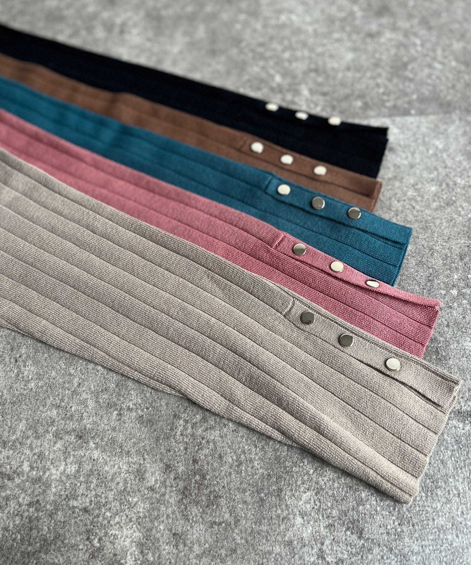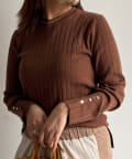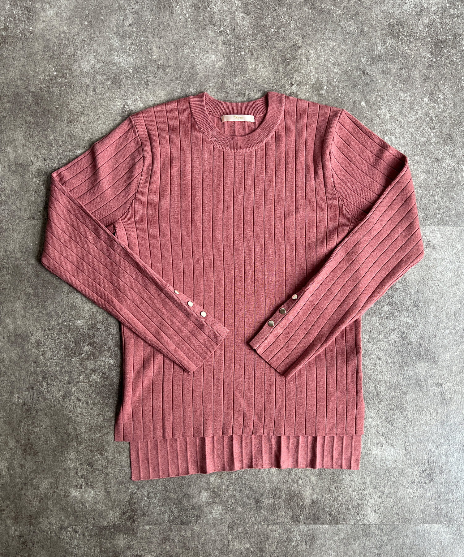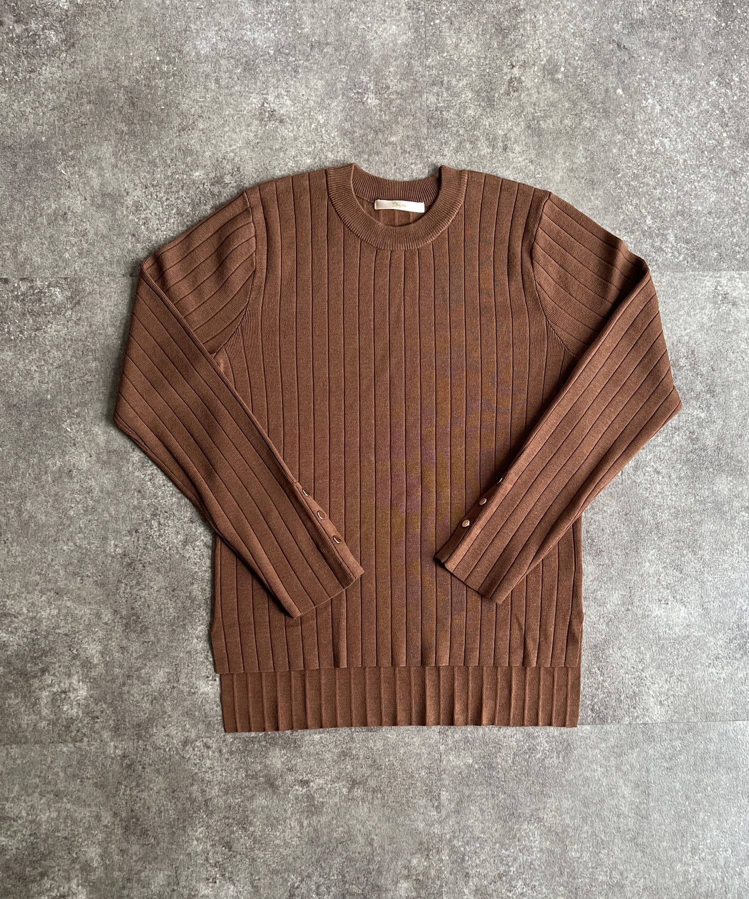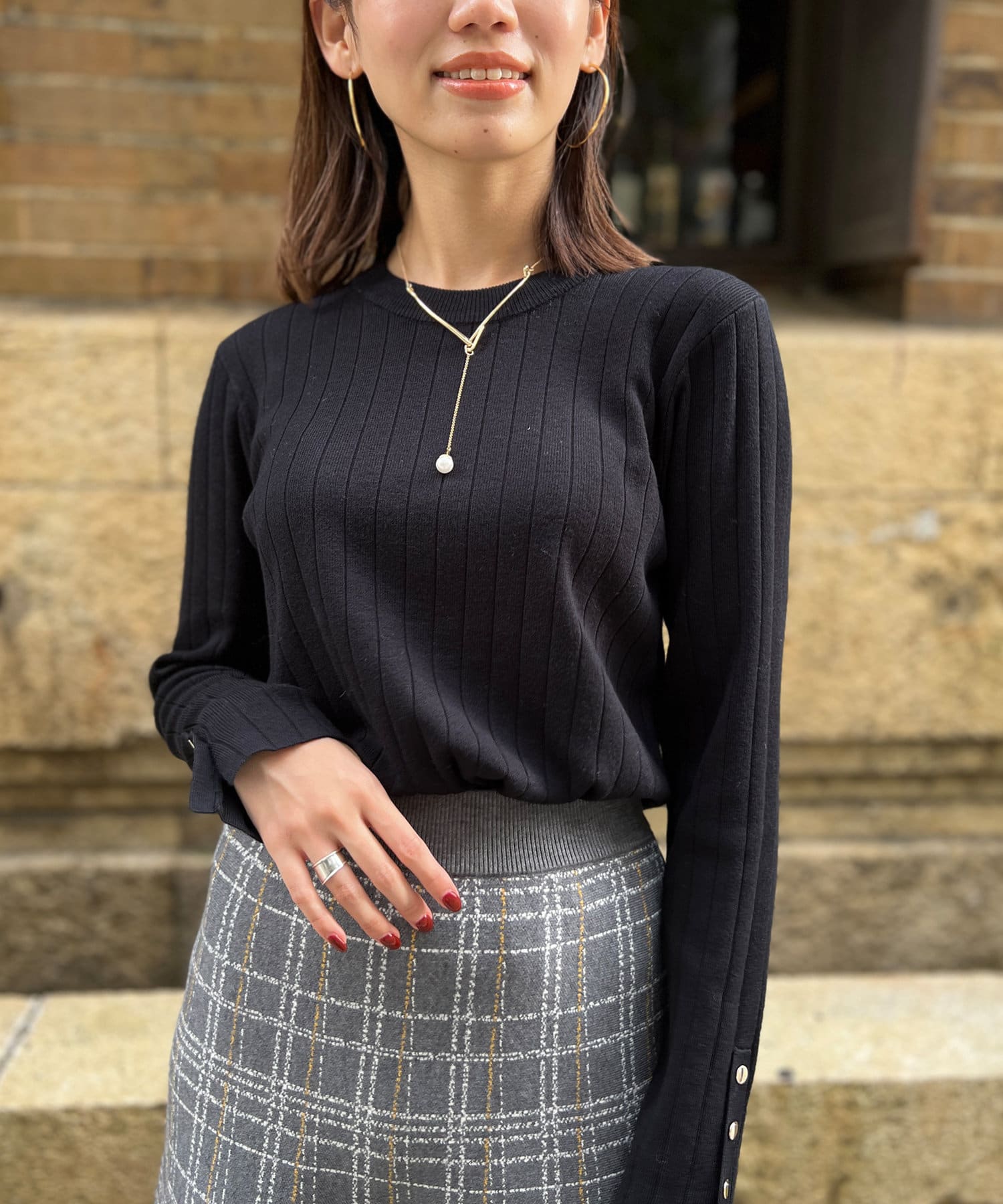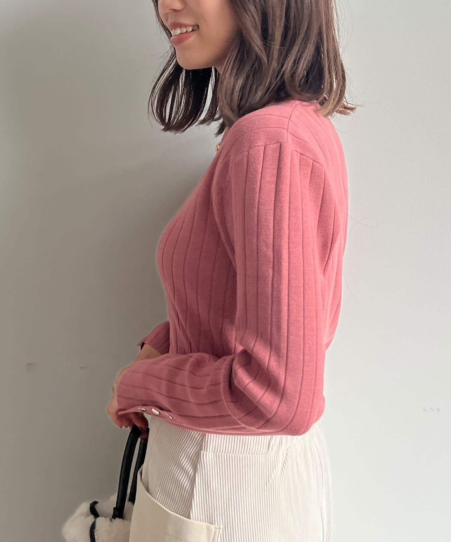 袖にはポイントとなるゴールヂボタンがついているので、インナーだけでなく1枚でシンプルな着こなしにもオススメのトップスです。