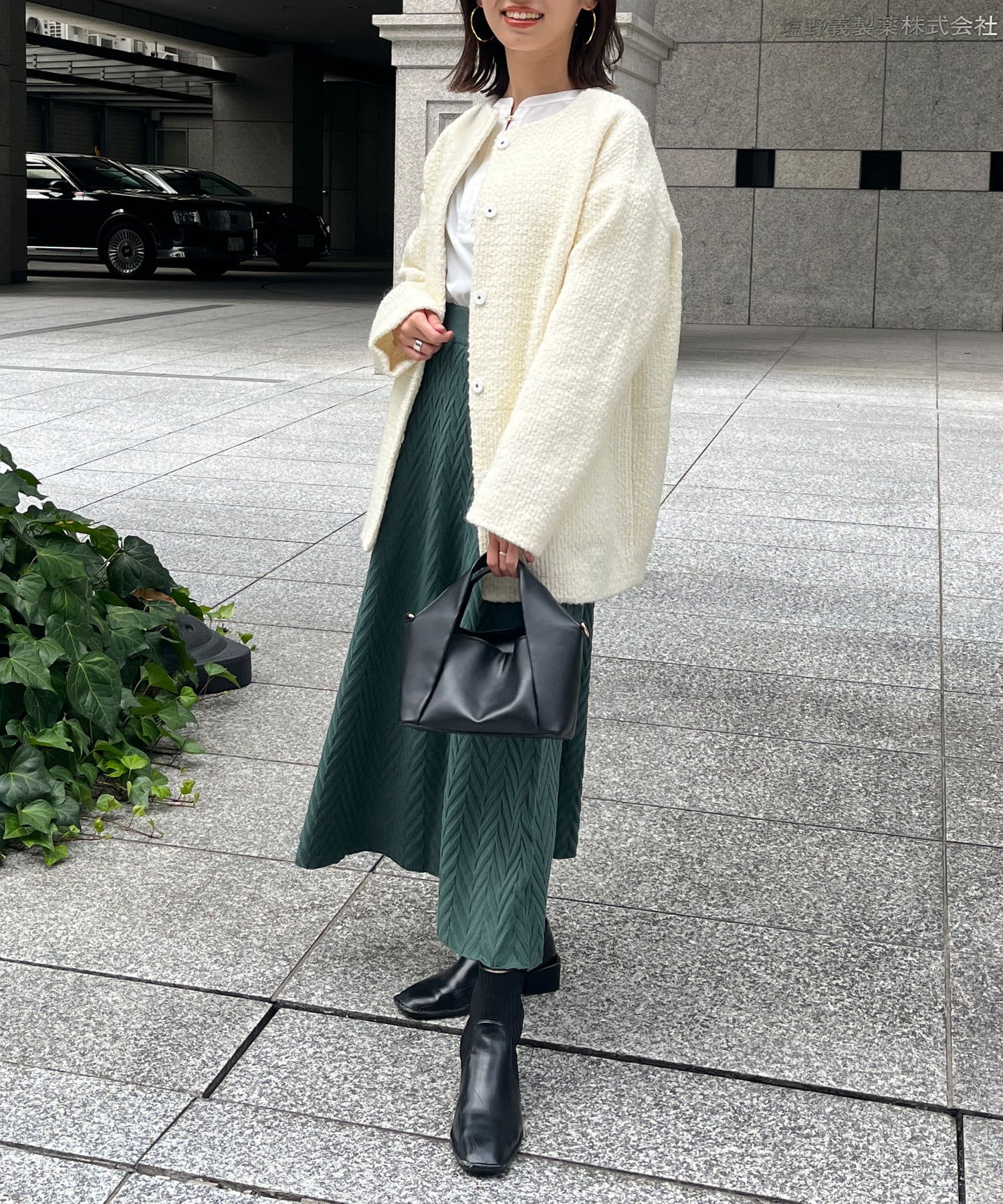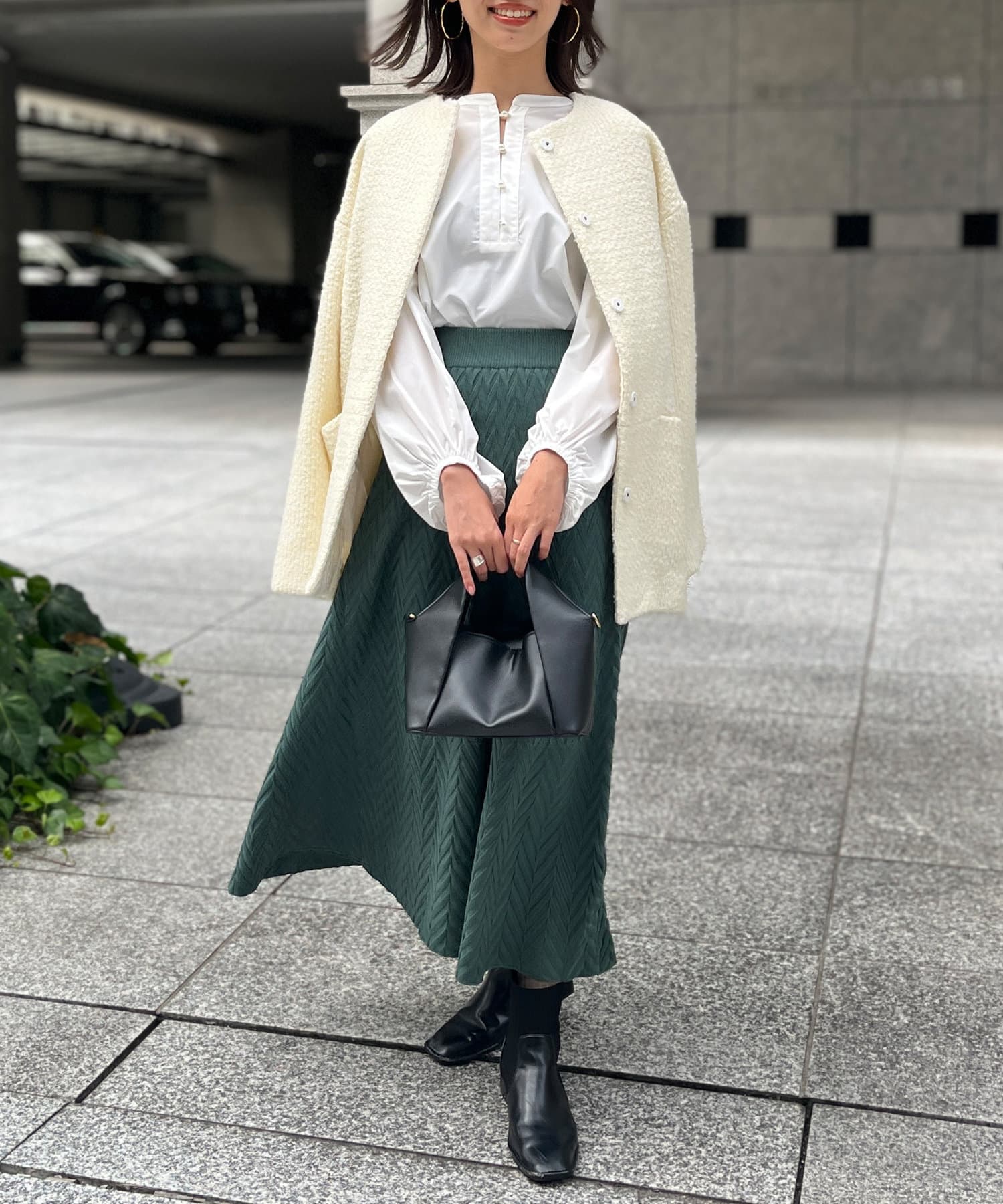 控えめな凹凸感のある生地できれいめな印象にしつつもどんなアイテムとも