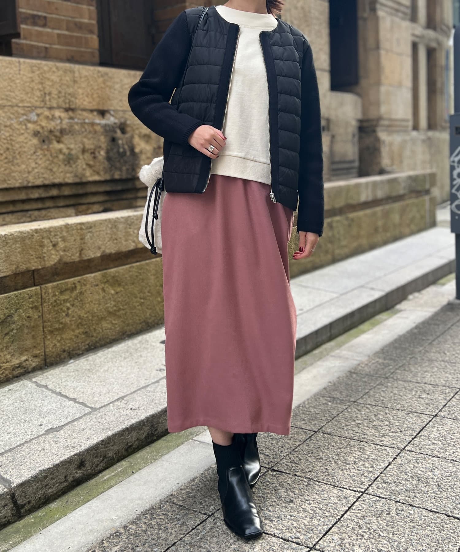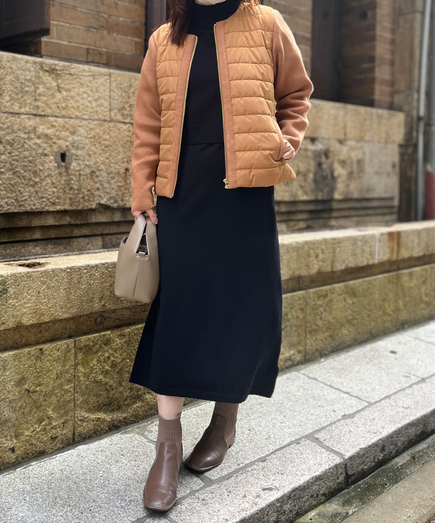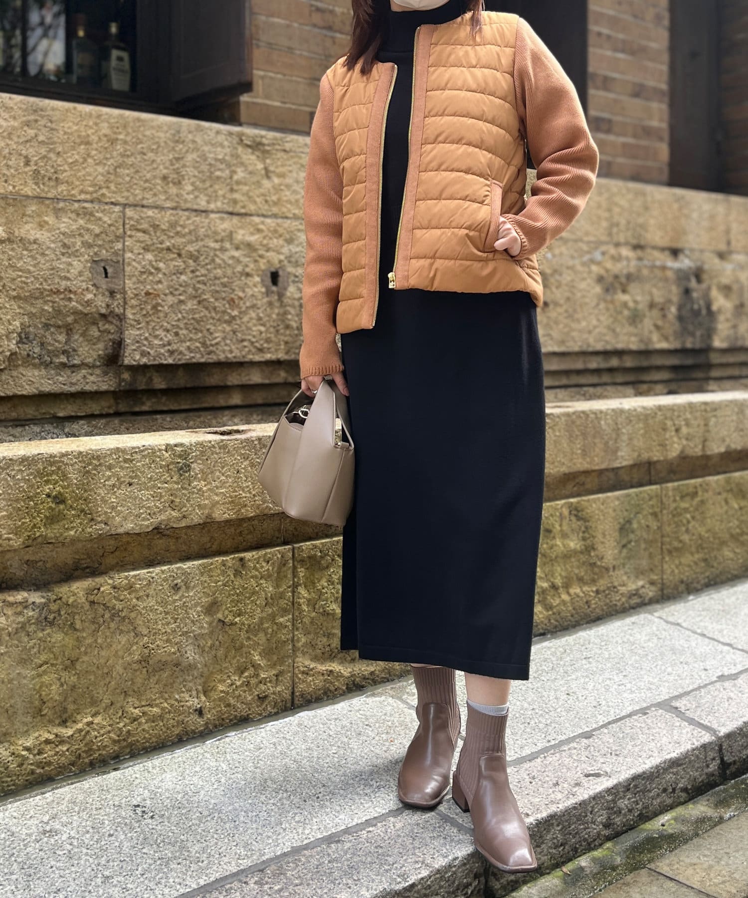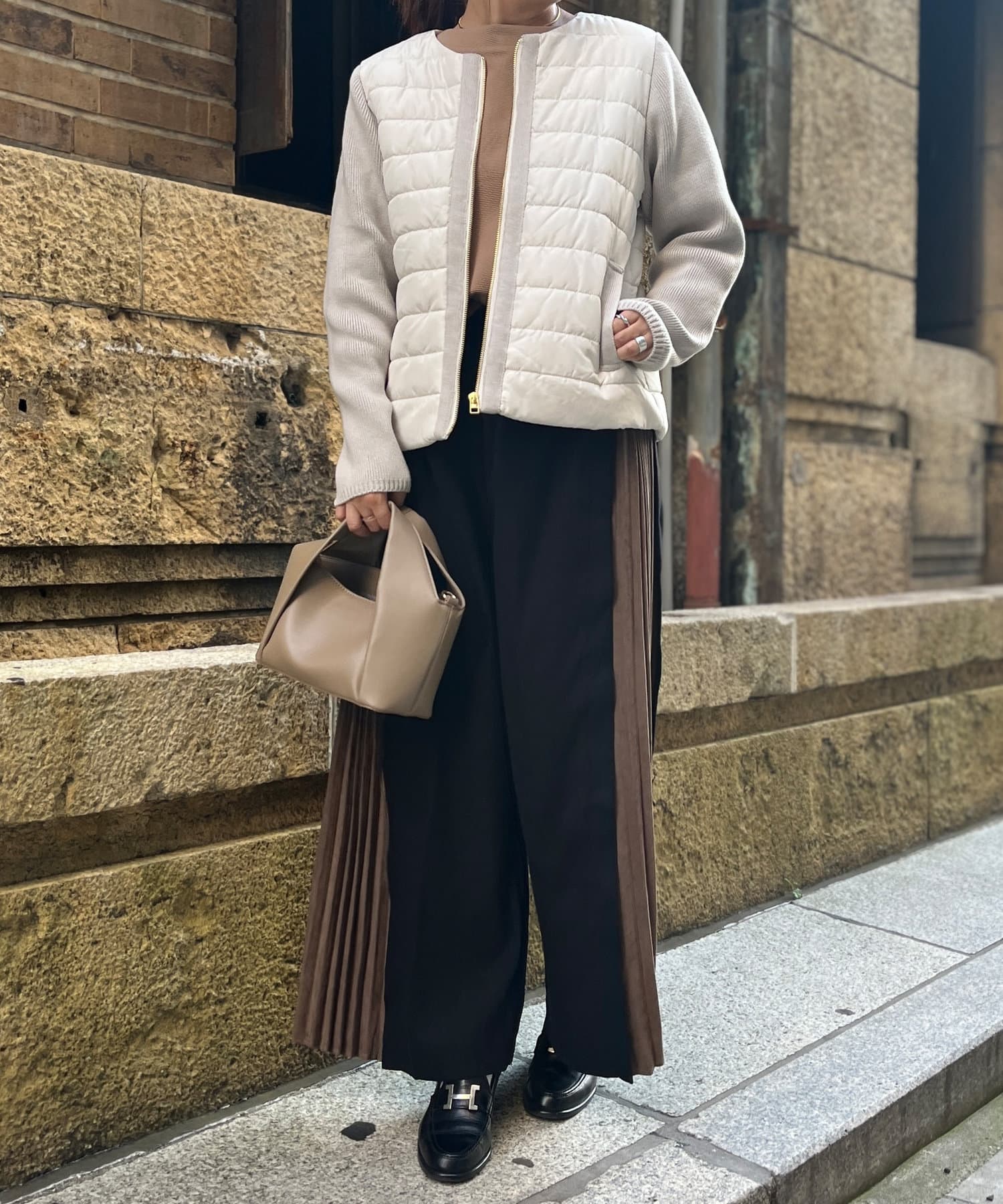 袖部分はハリのあるニットになっており、キルティングベストを重ねた様なデザインがポイント!