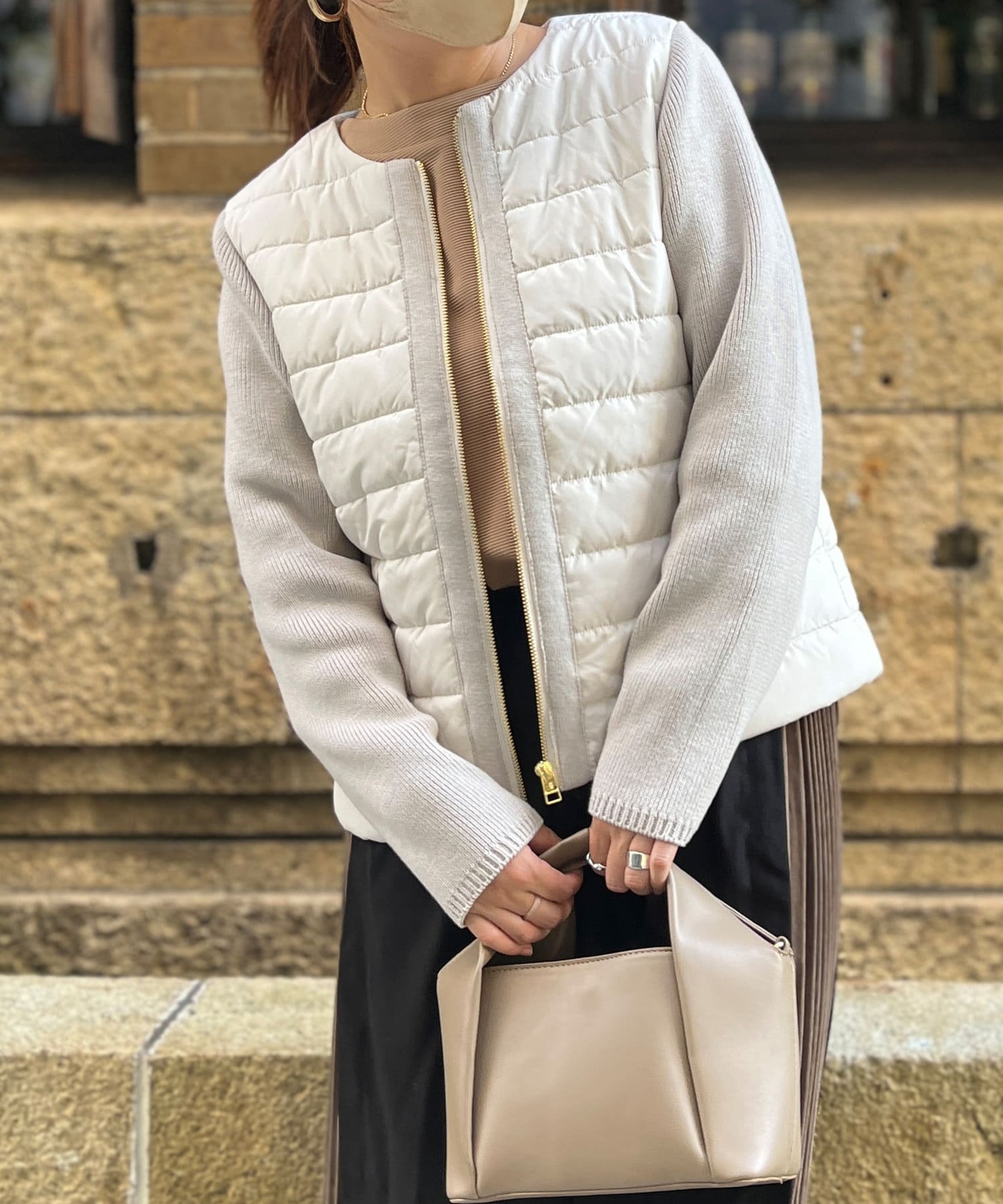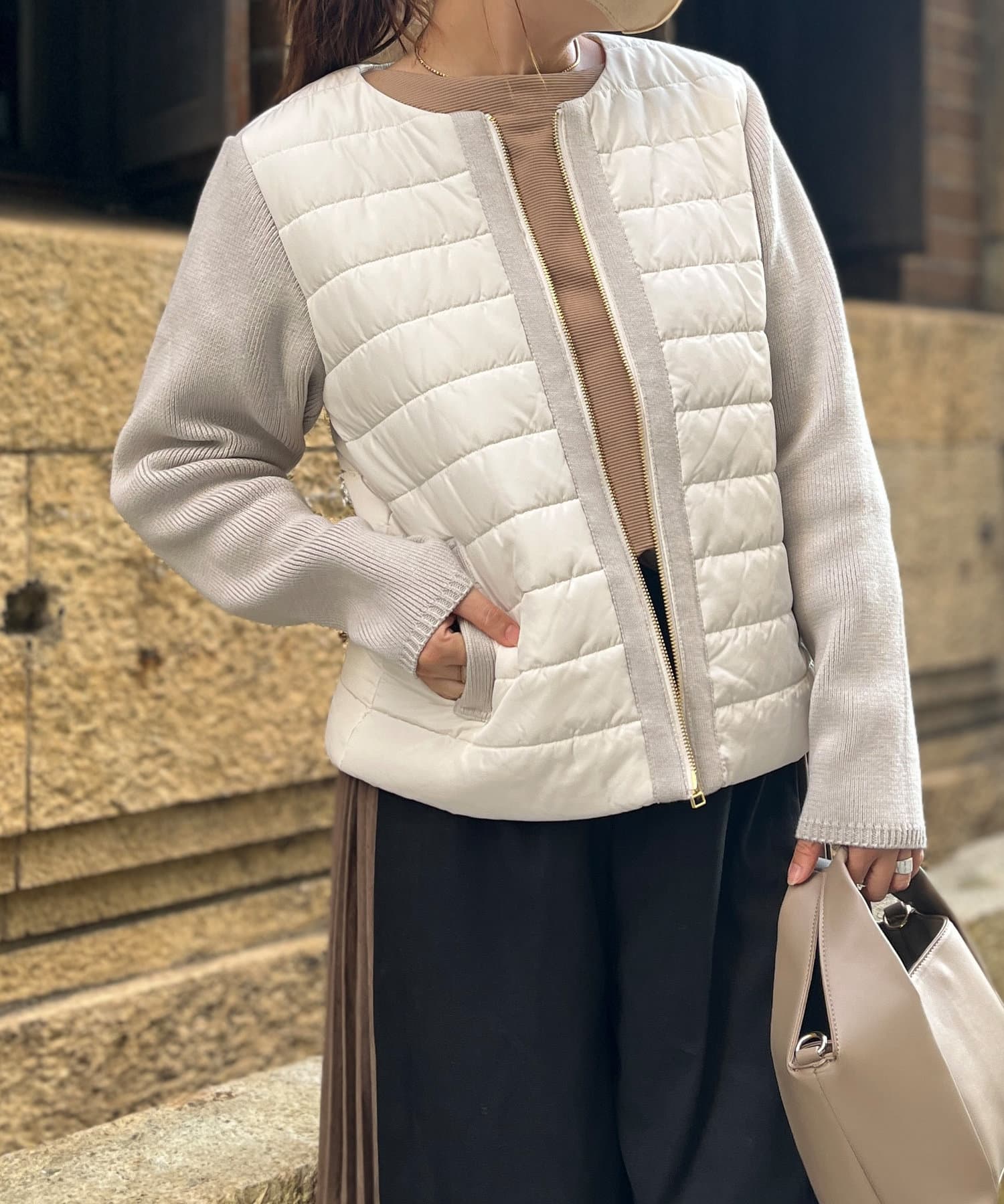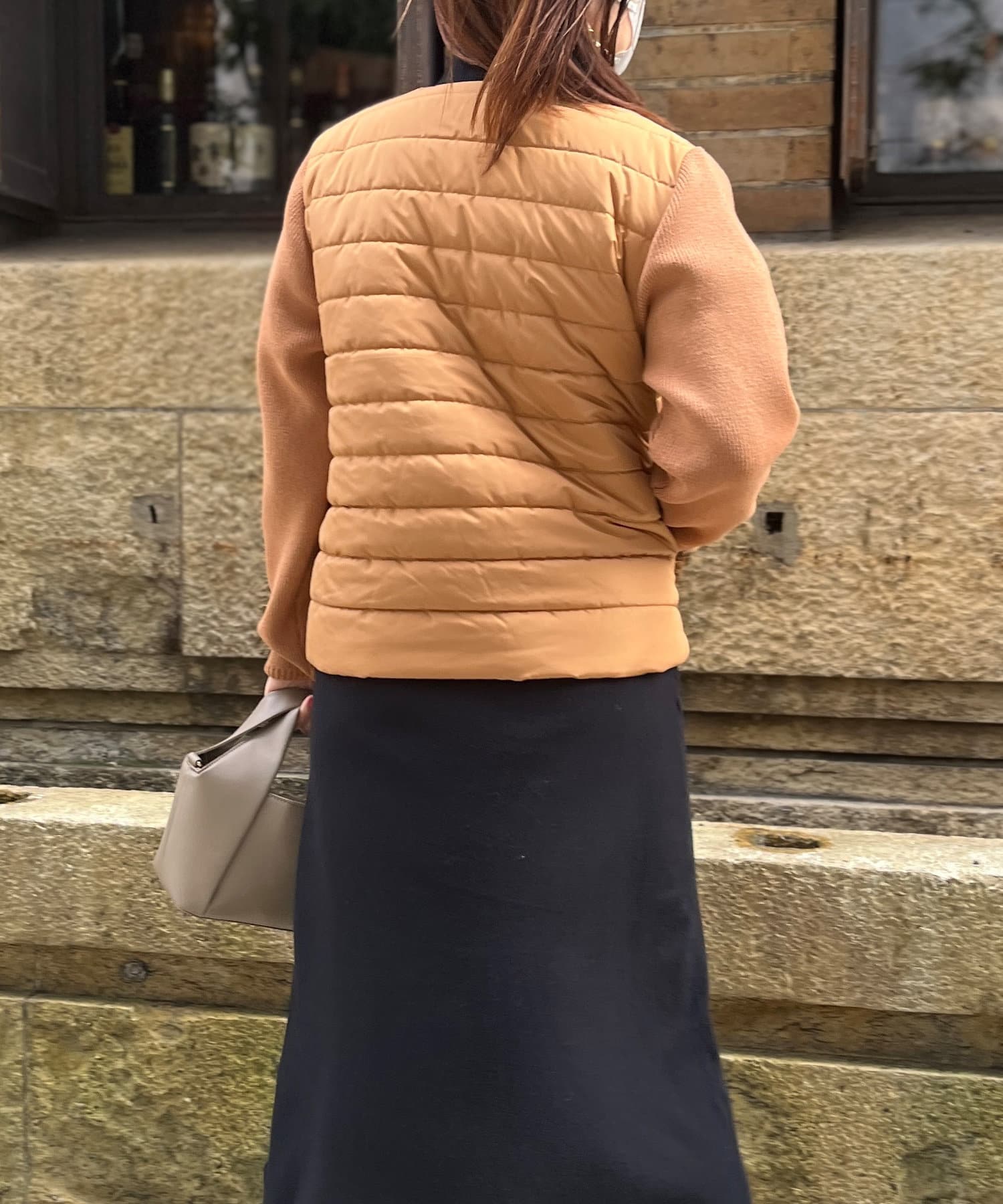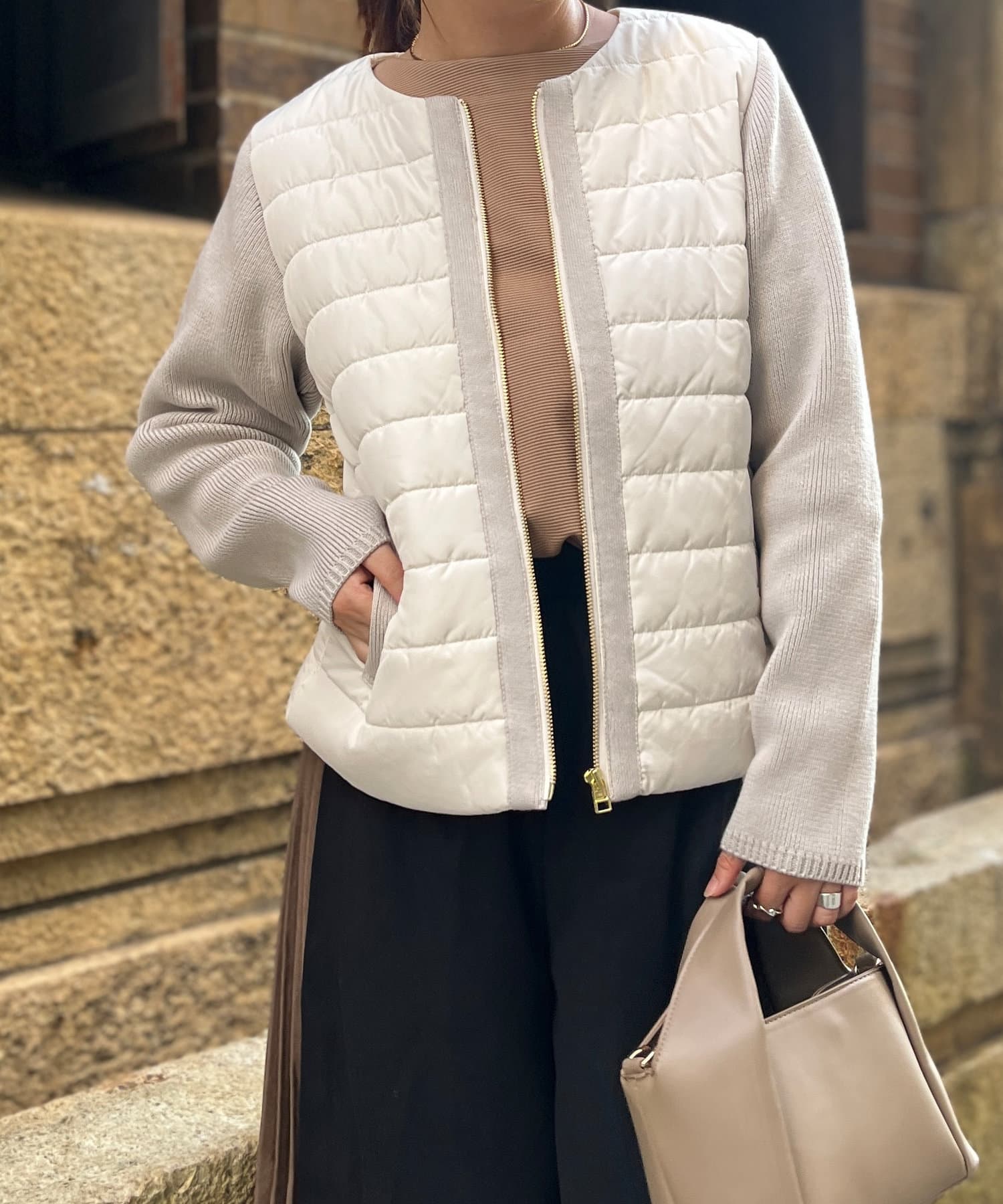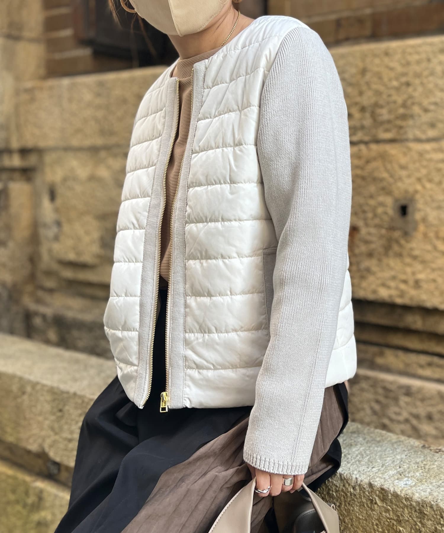 中わたのキルティングとニットの異素材ドッキングジャケットです。