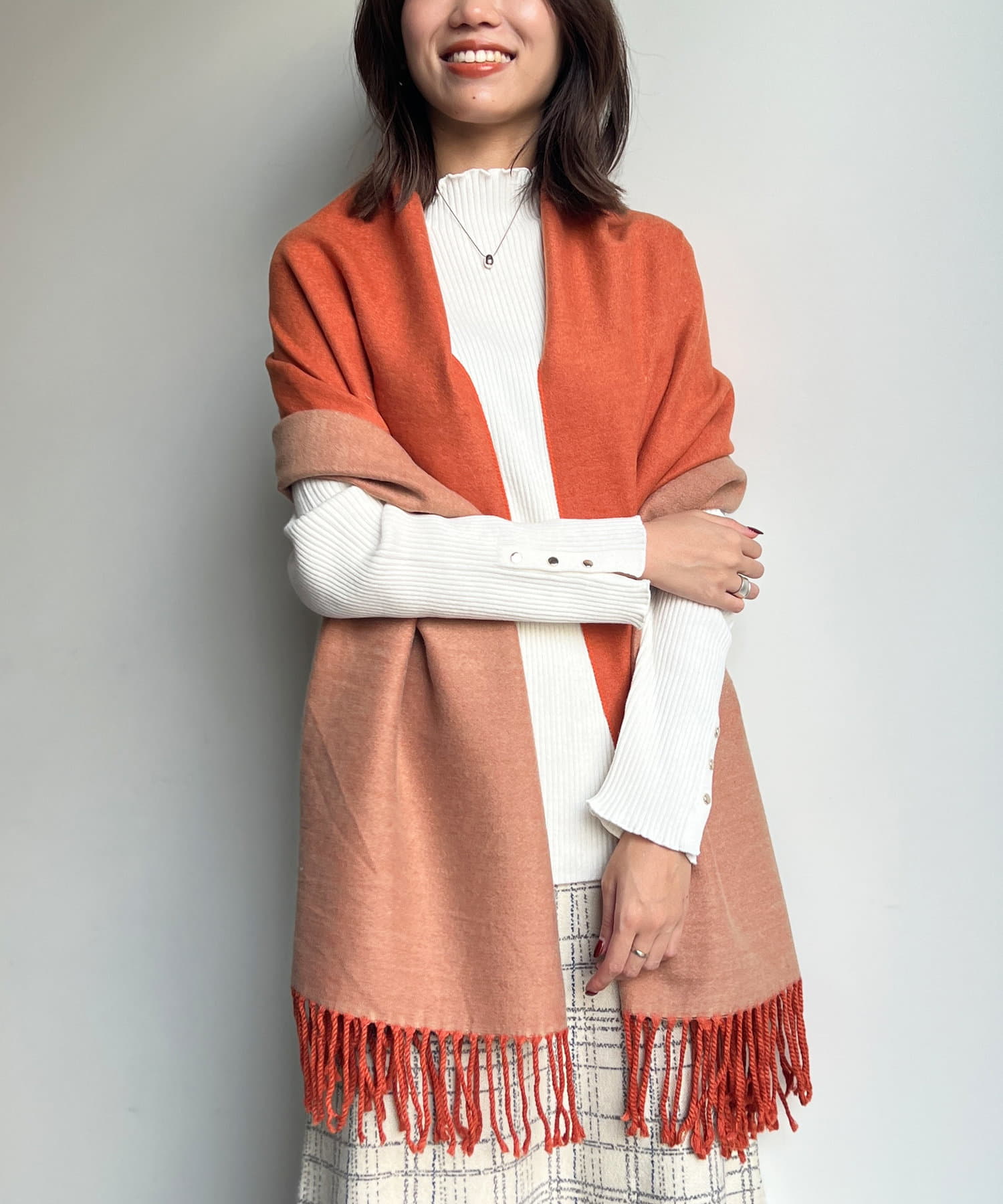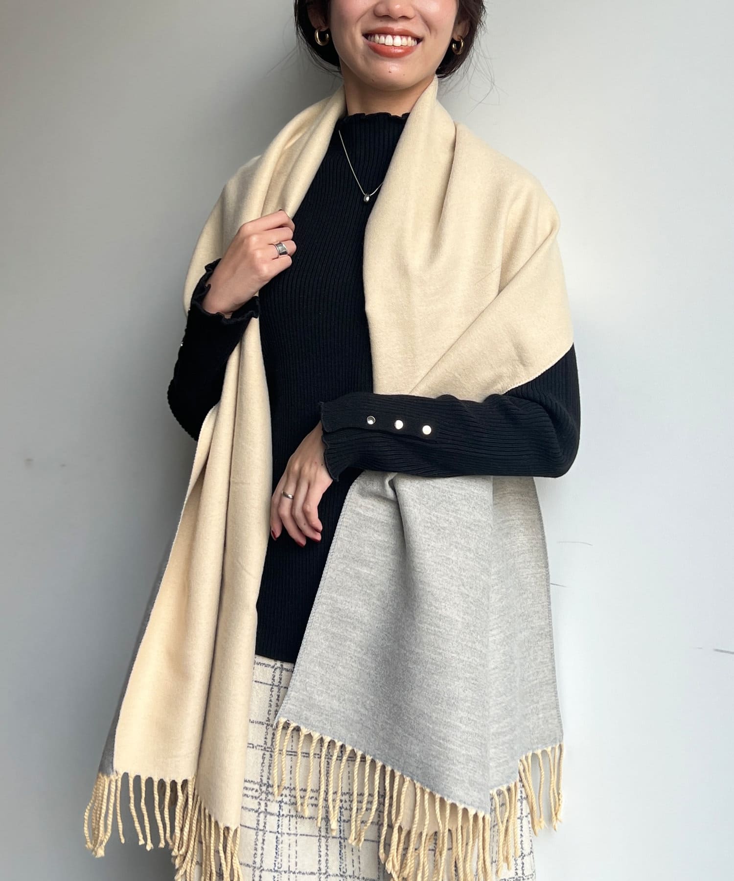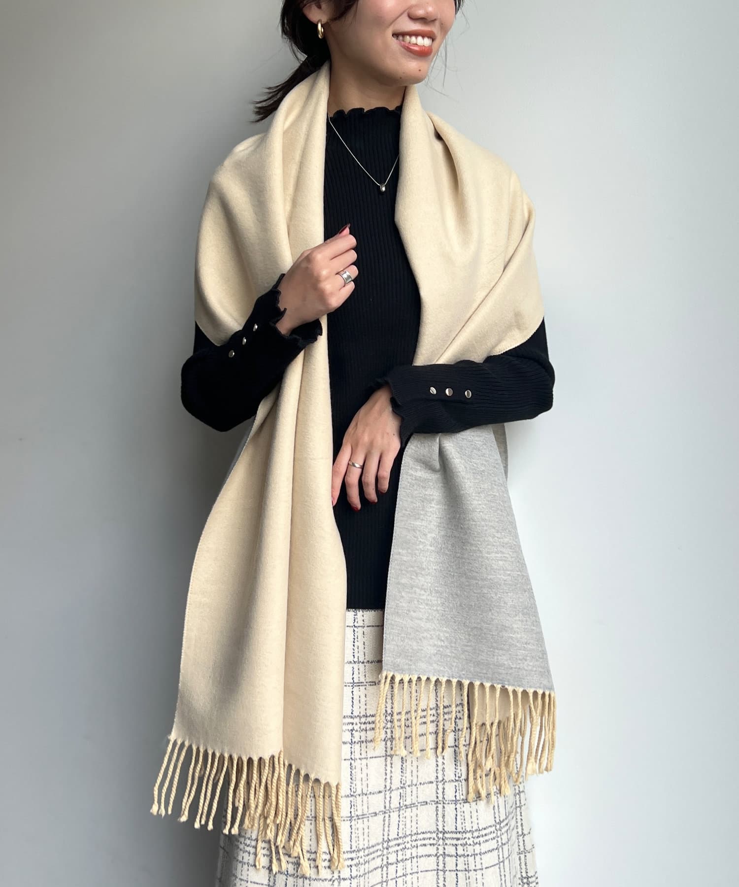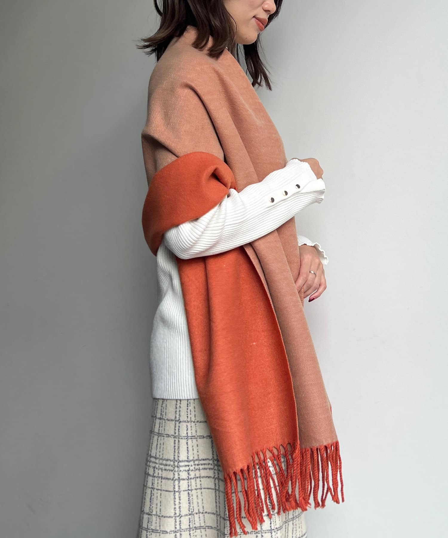 大きめサイズで程よくボリュームがありスタイリングのポイントにもひざ掛け代わりにもしやすい万能アイテムです。