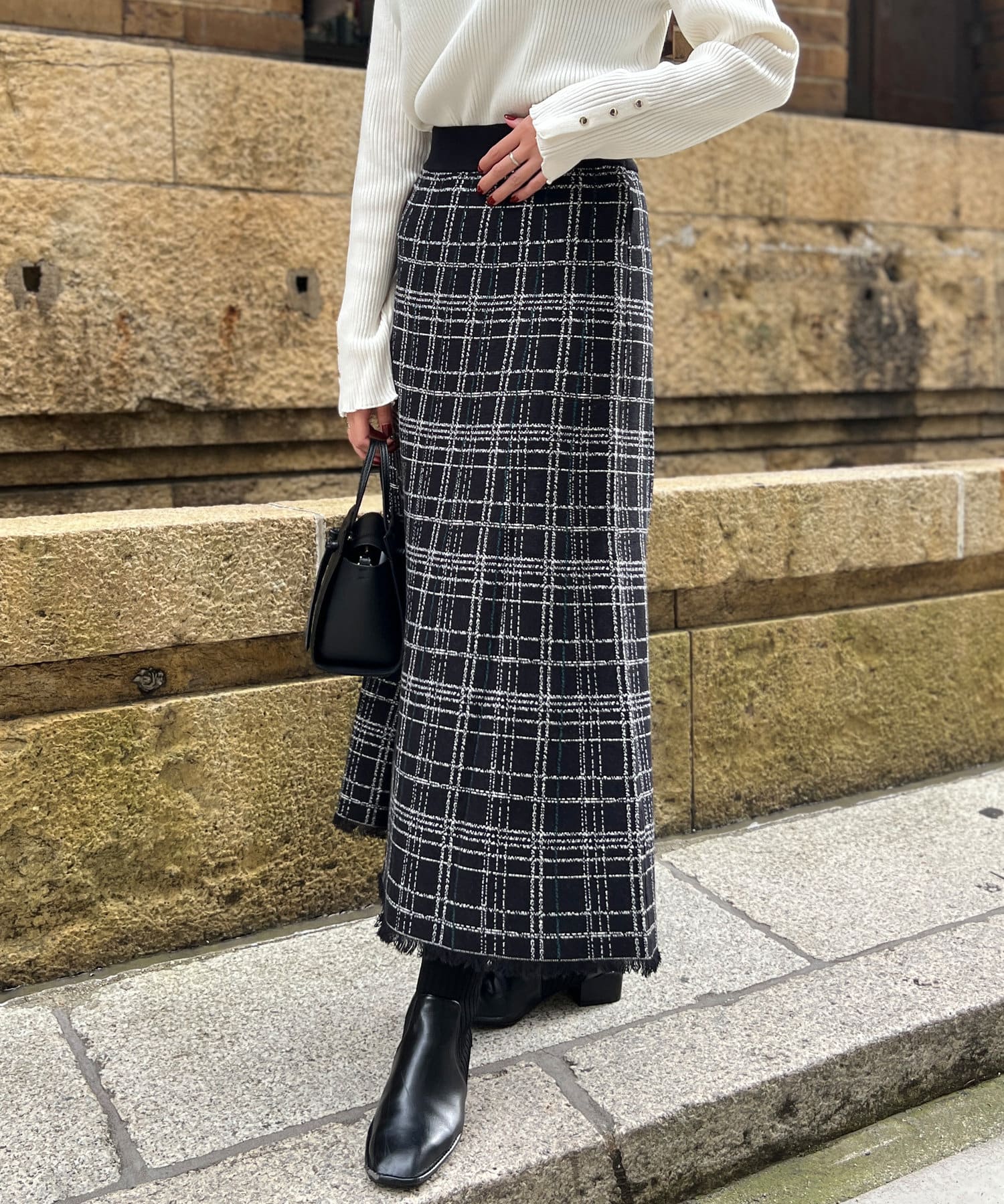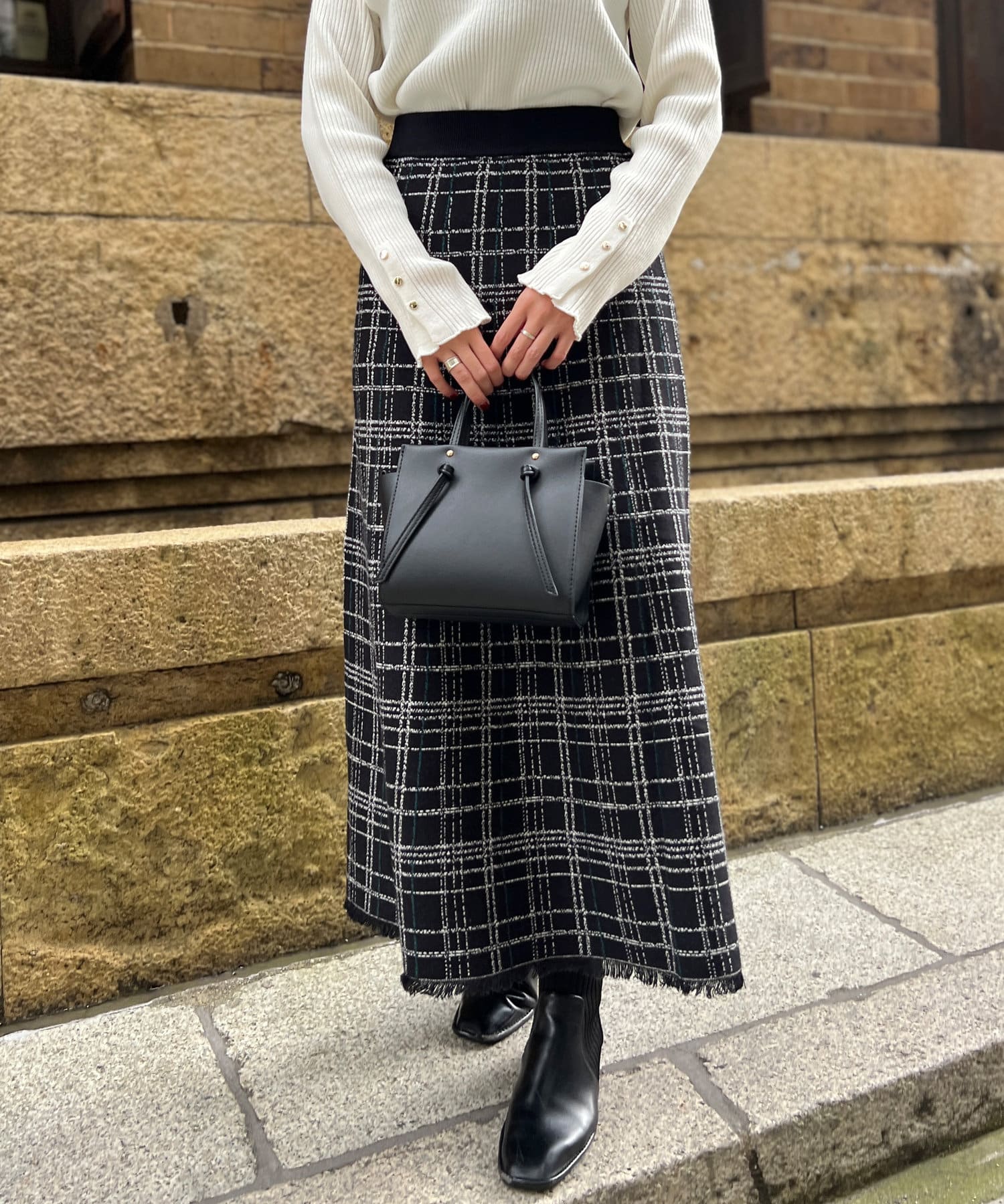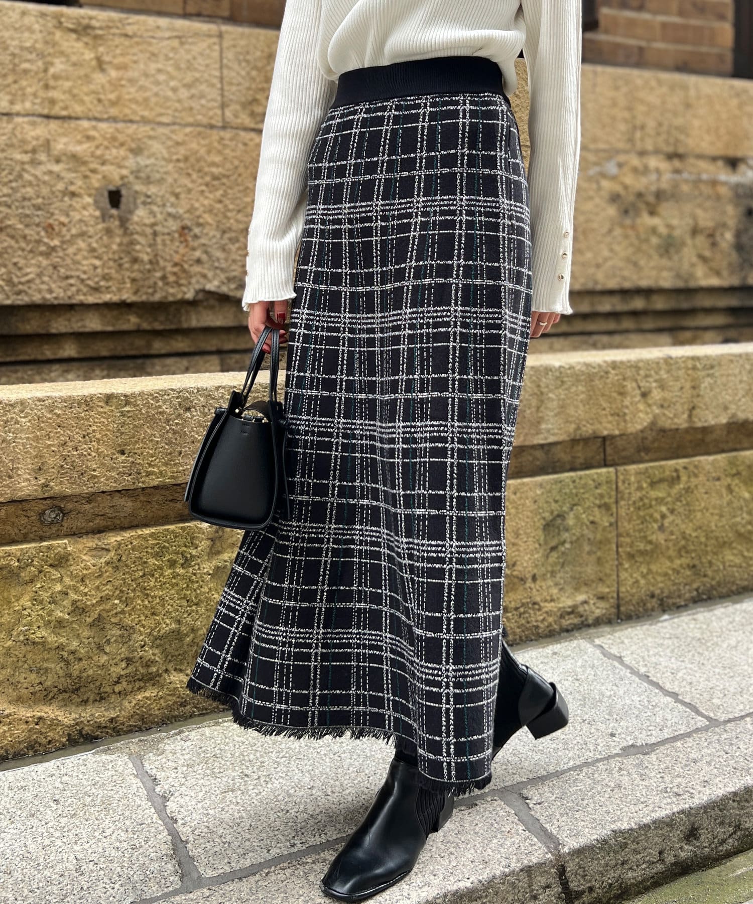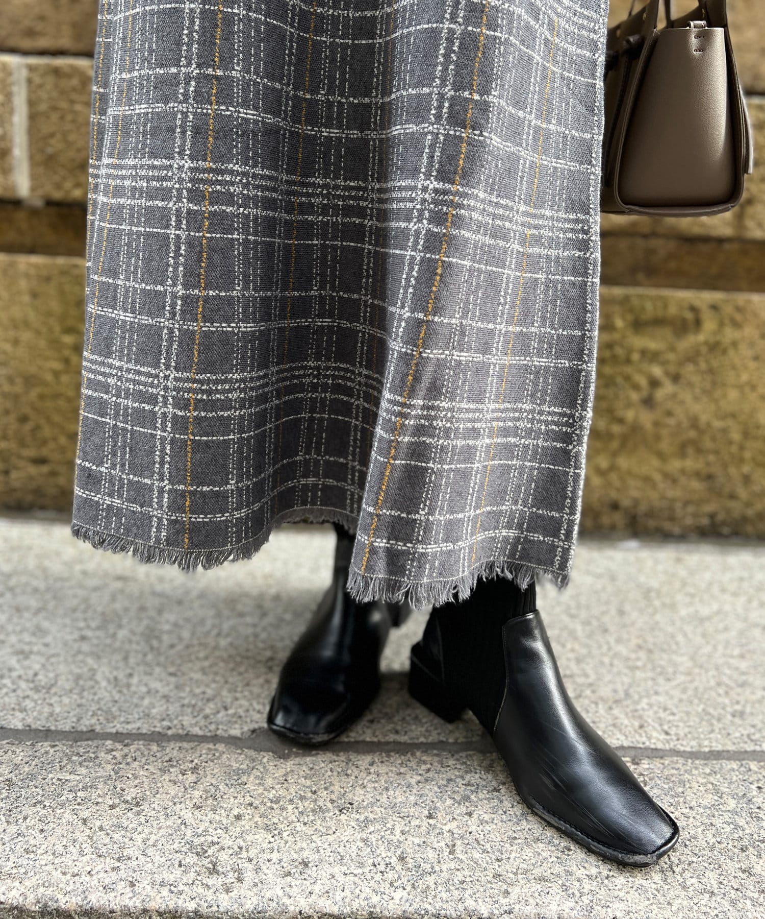 裾フリンジチェックニットスカート