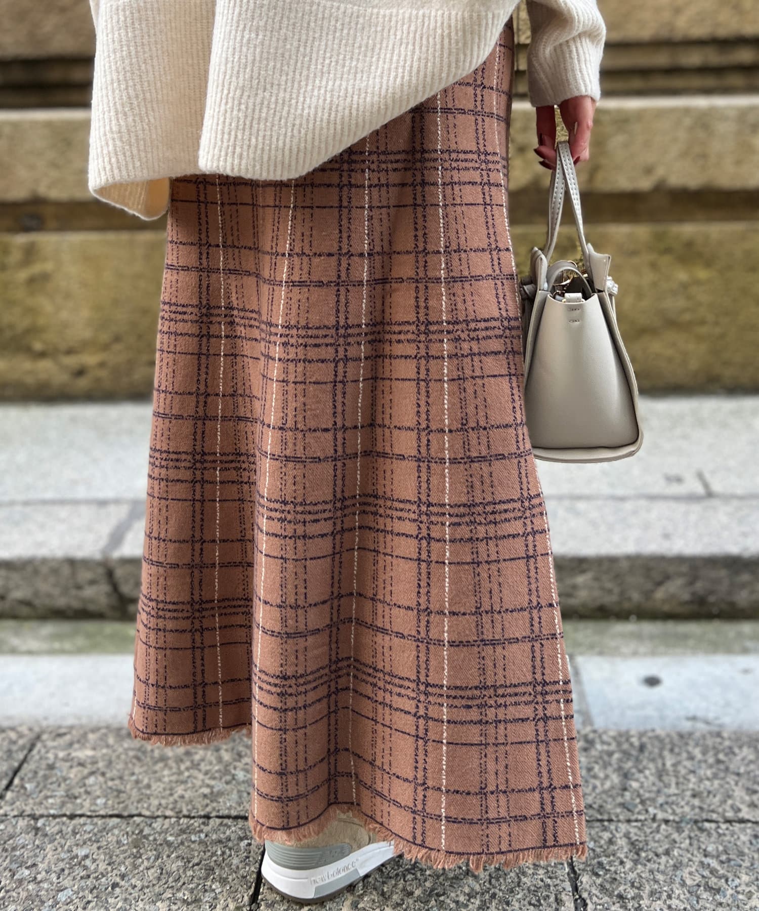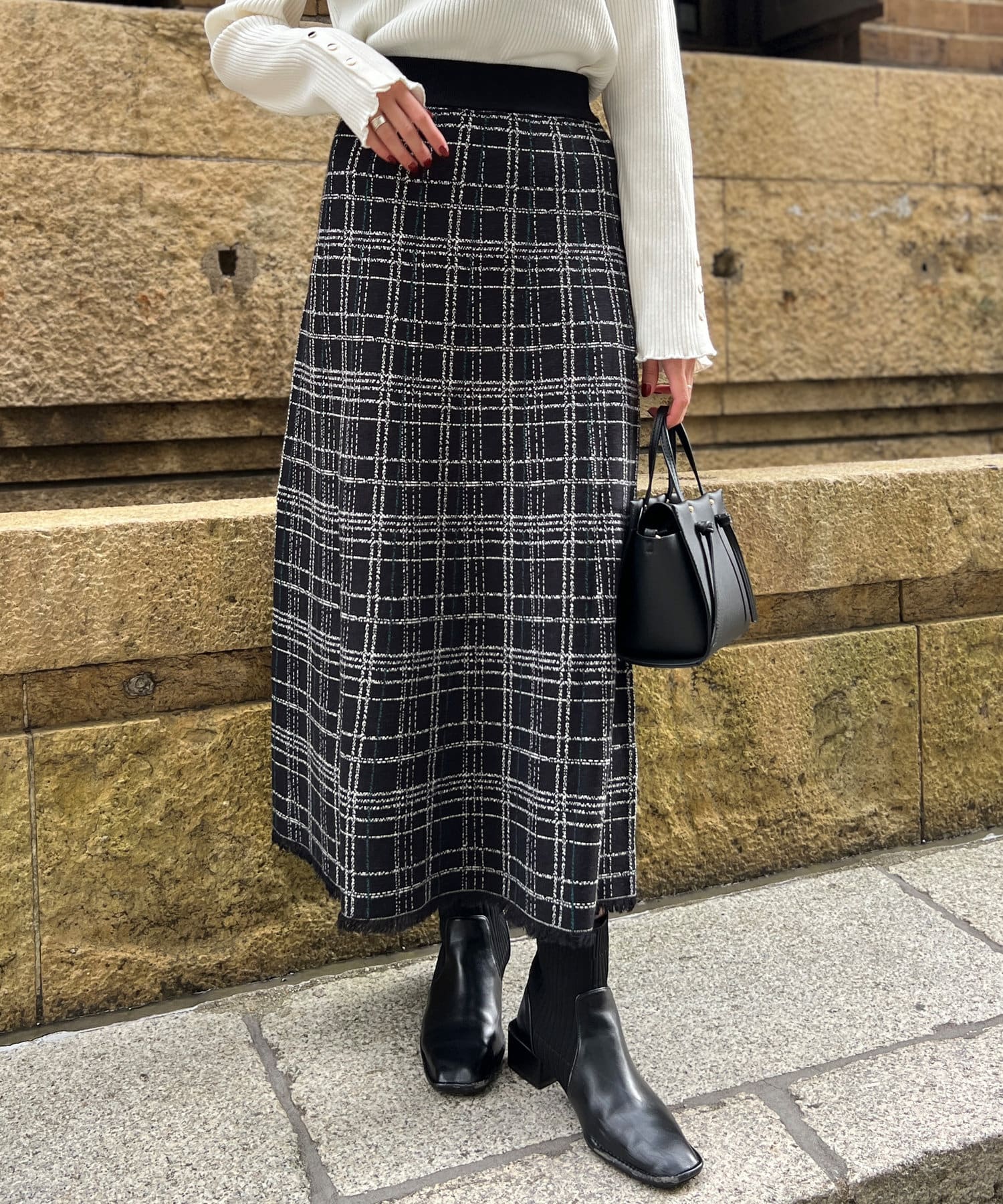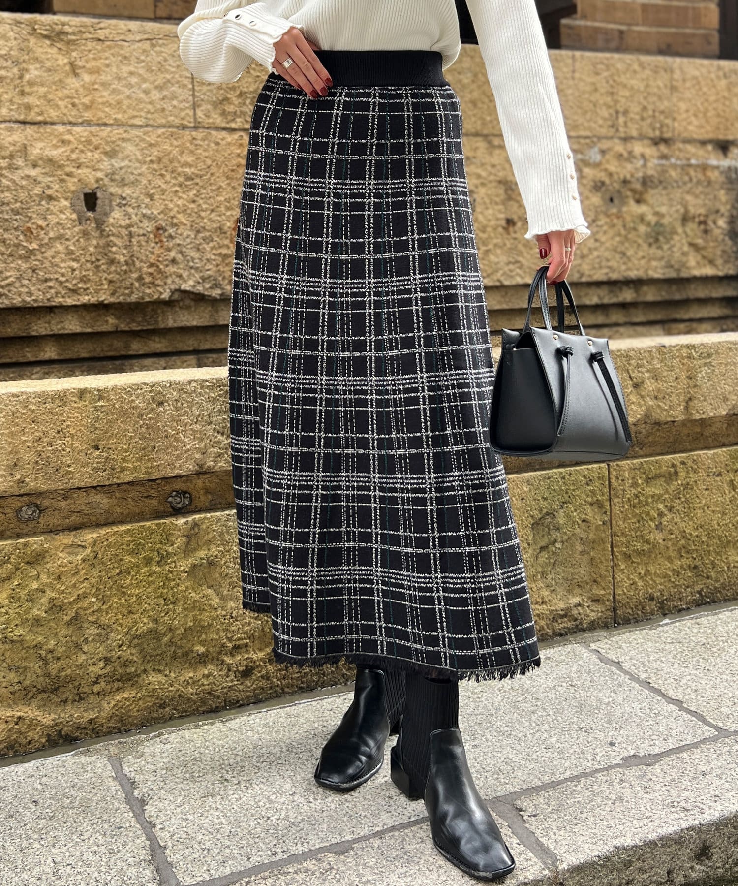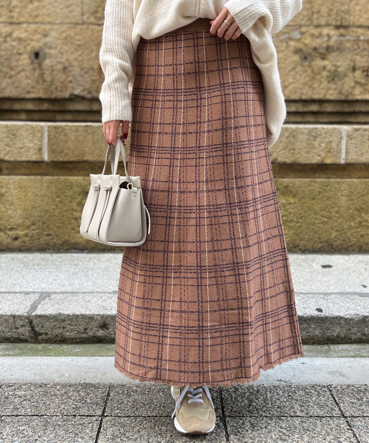 裾フリンジチェックニットスカート