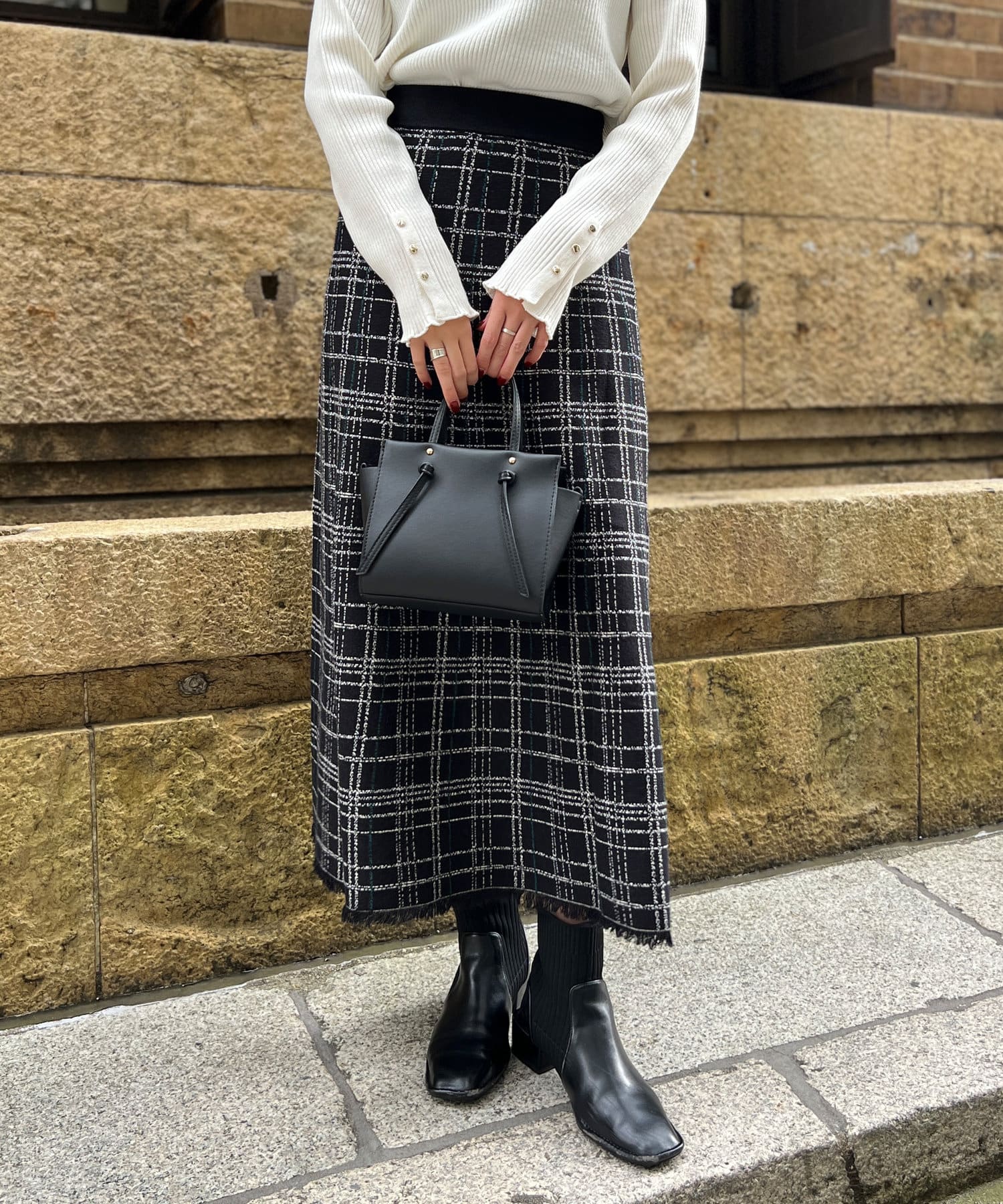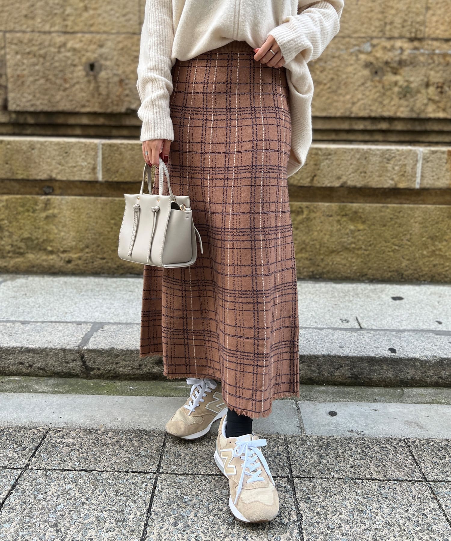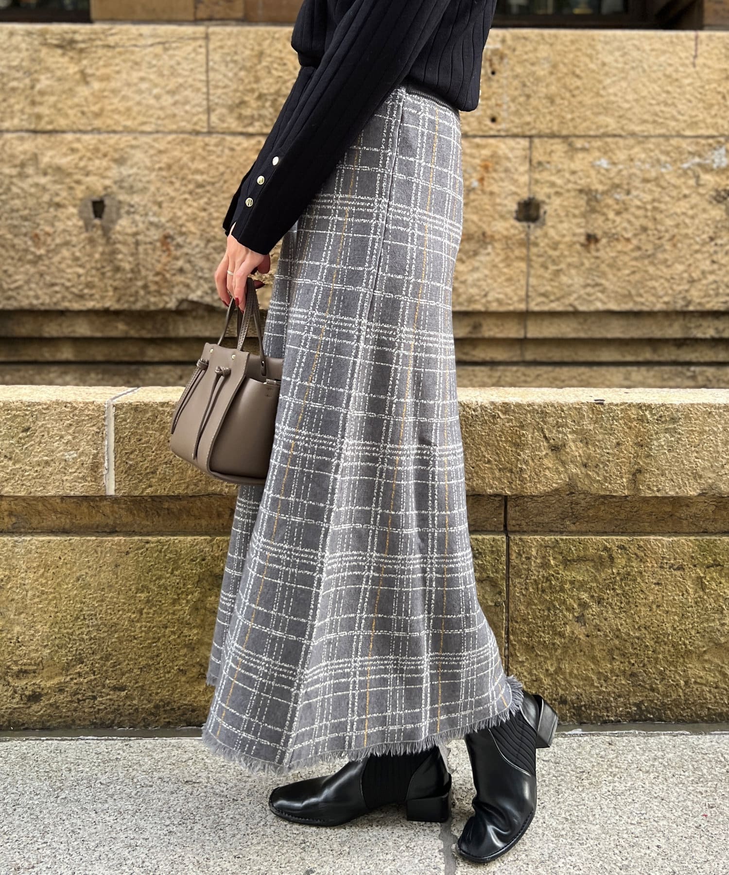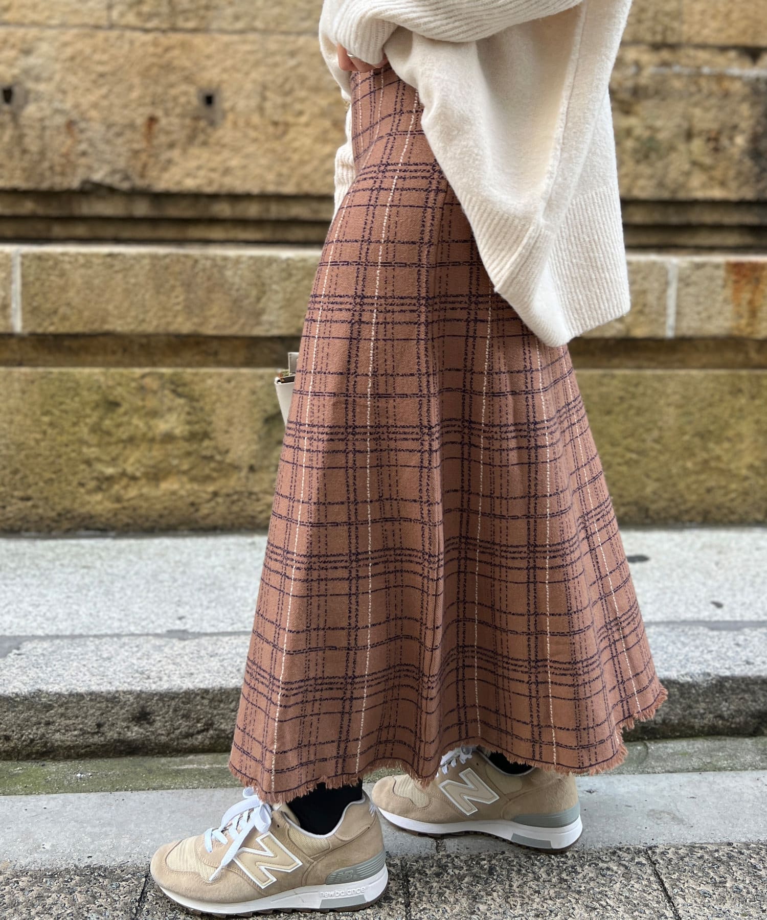 裾フリンジチェックニットスカート