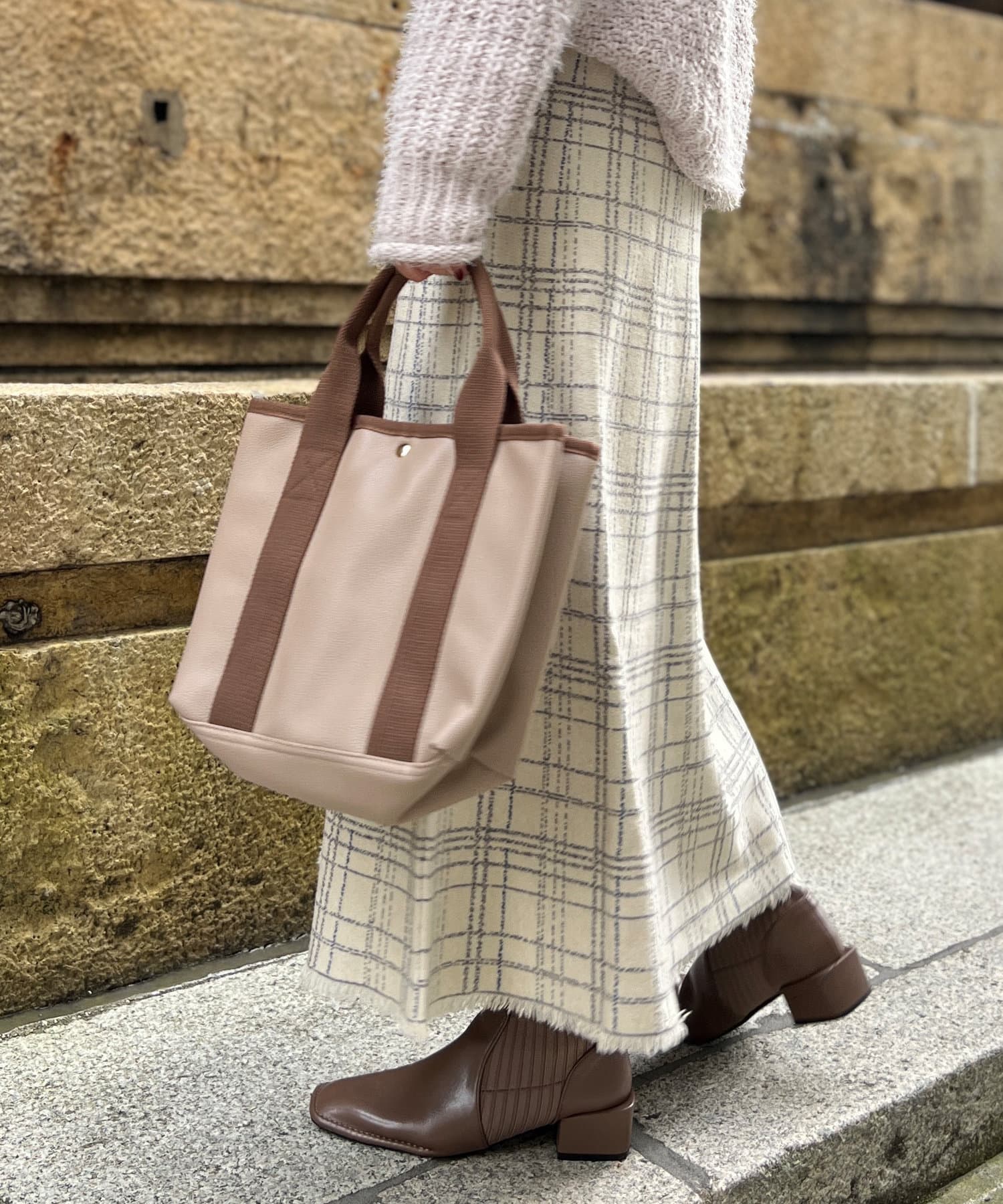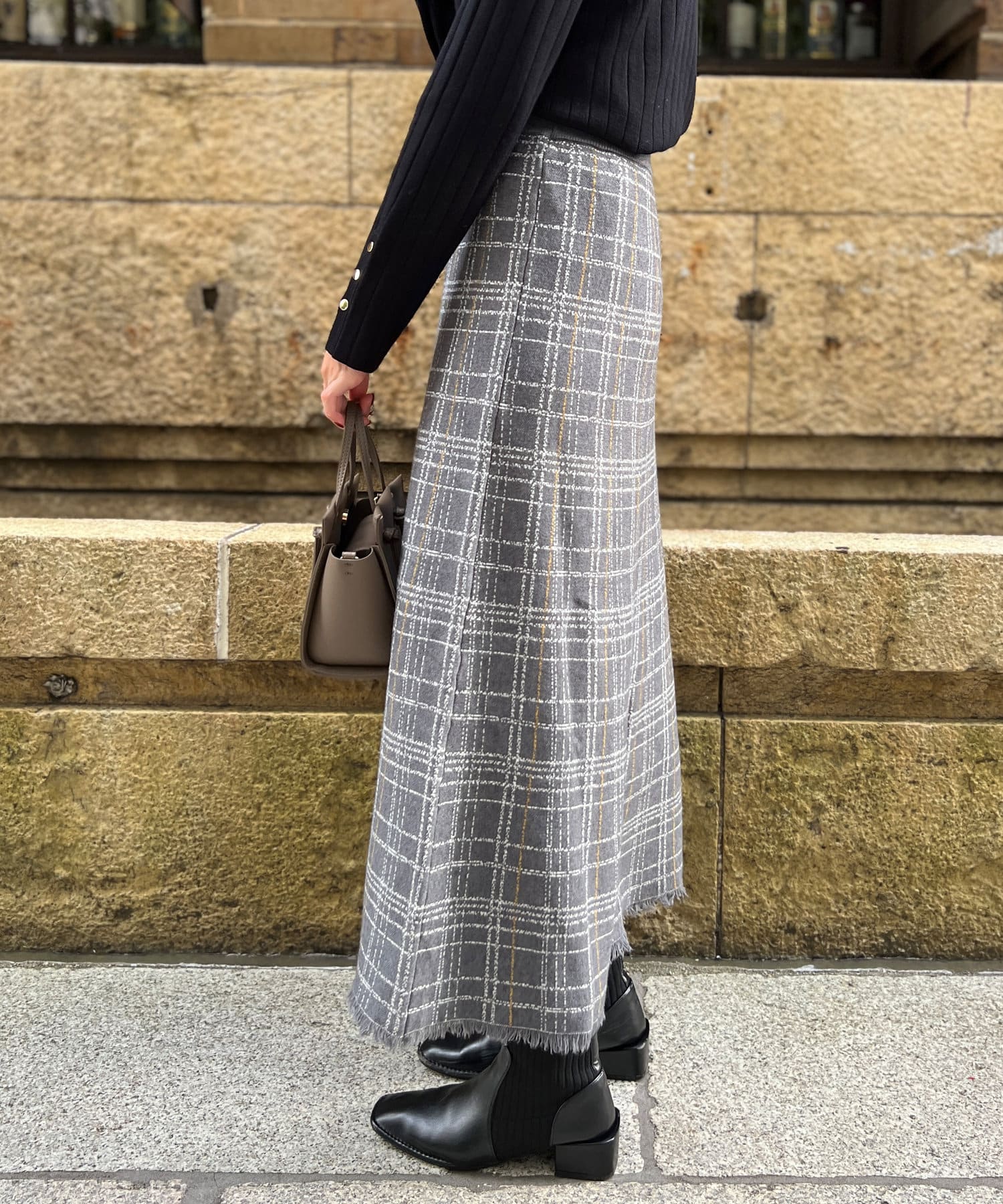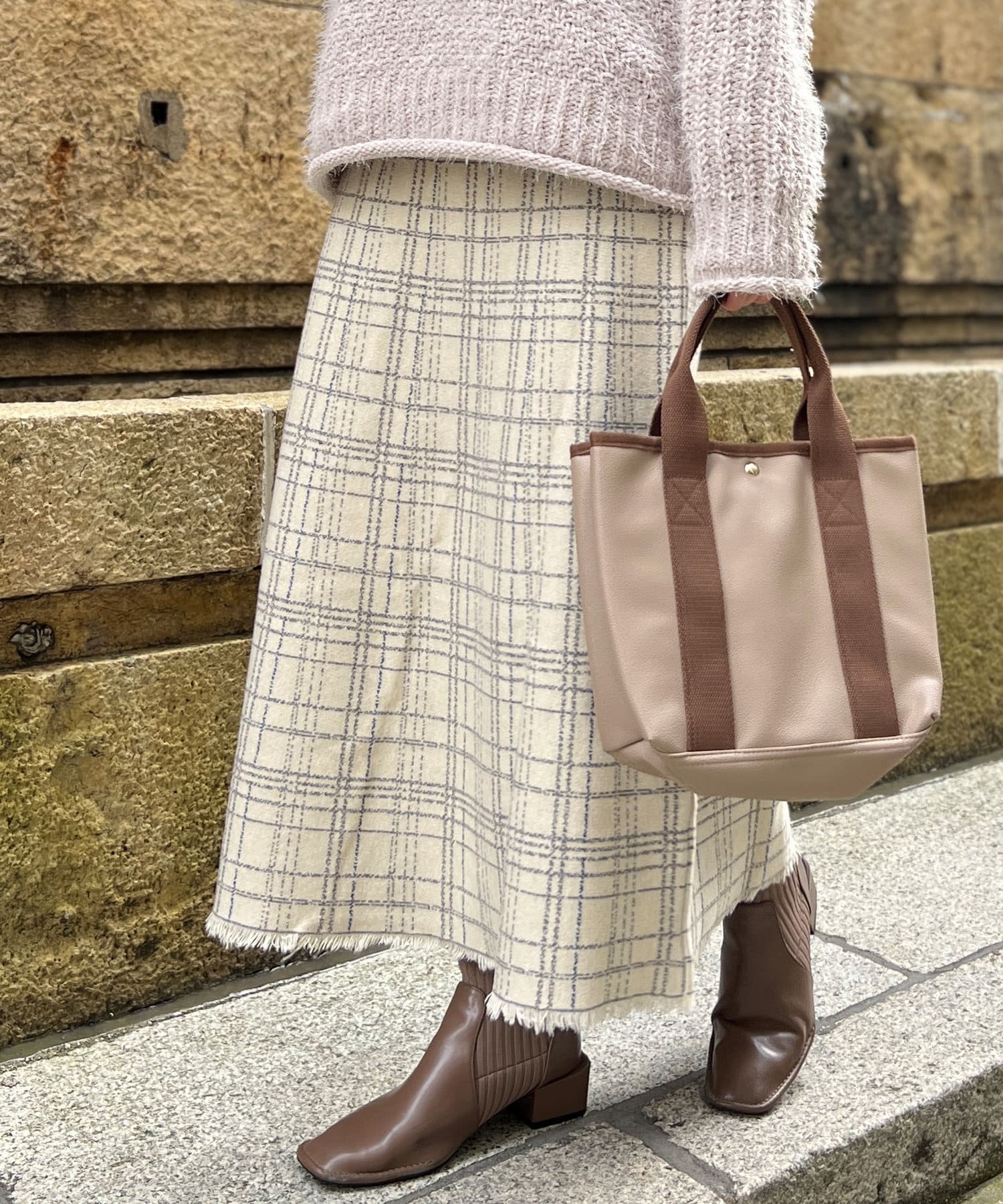 ・チェック柄に繊細なかすれ加工を施すことで、カジュアルになり過ぎない大人フェミニンな印象に。