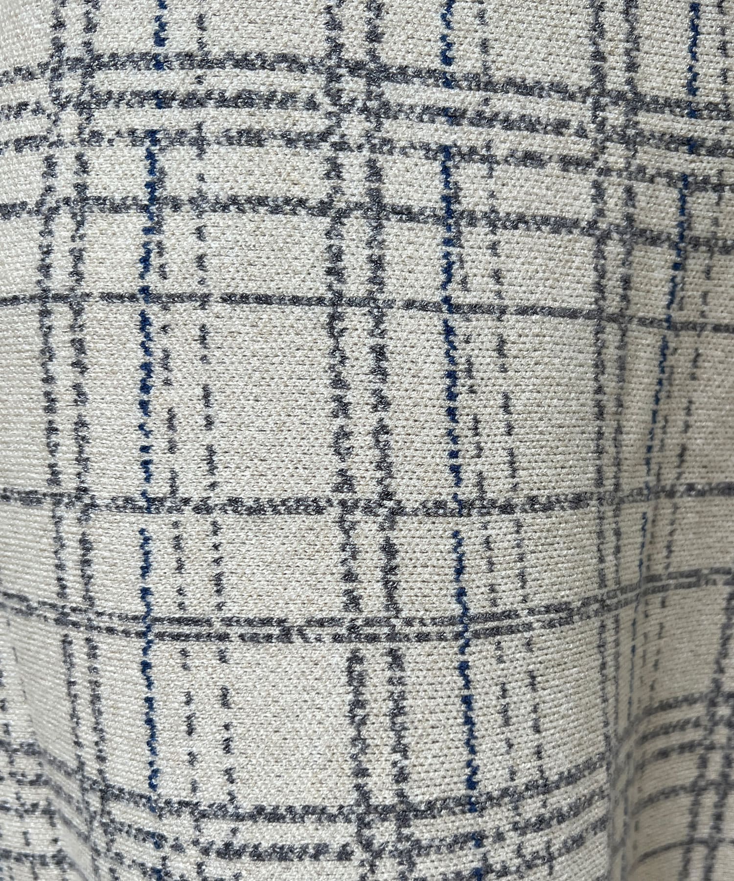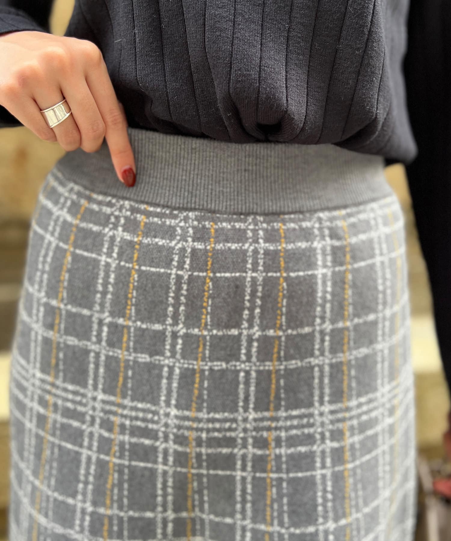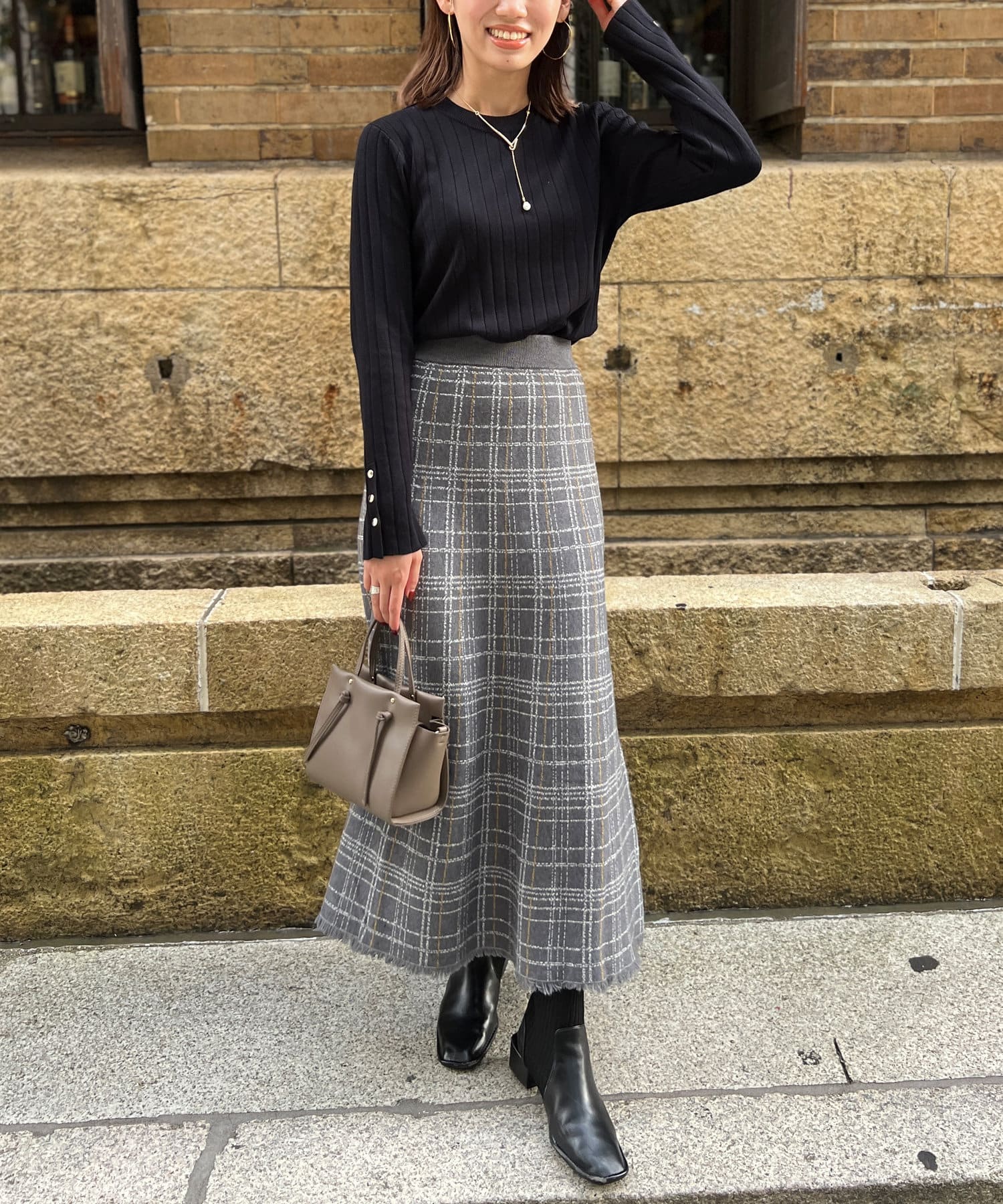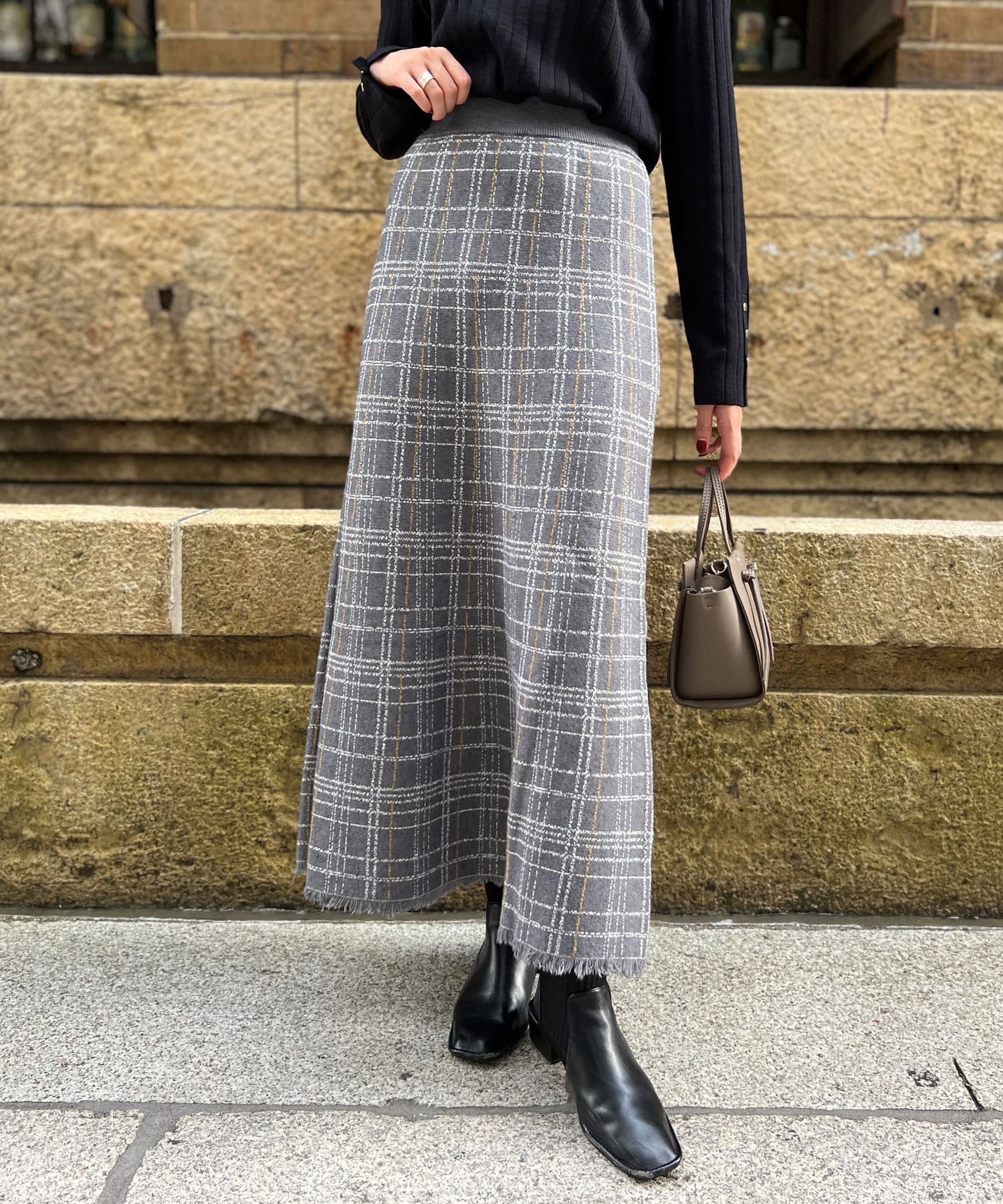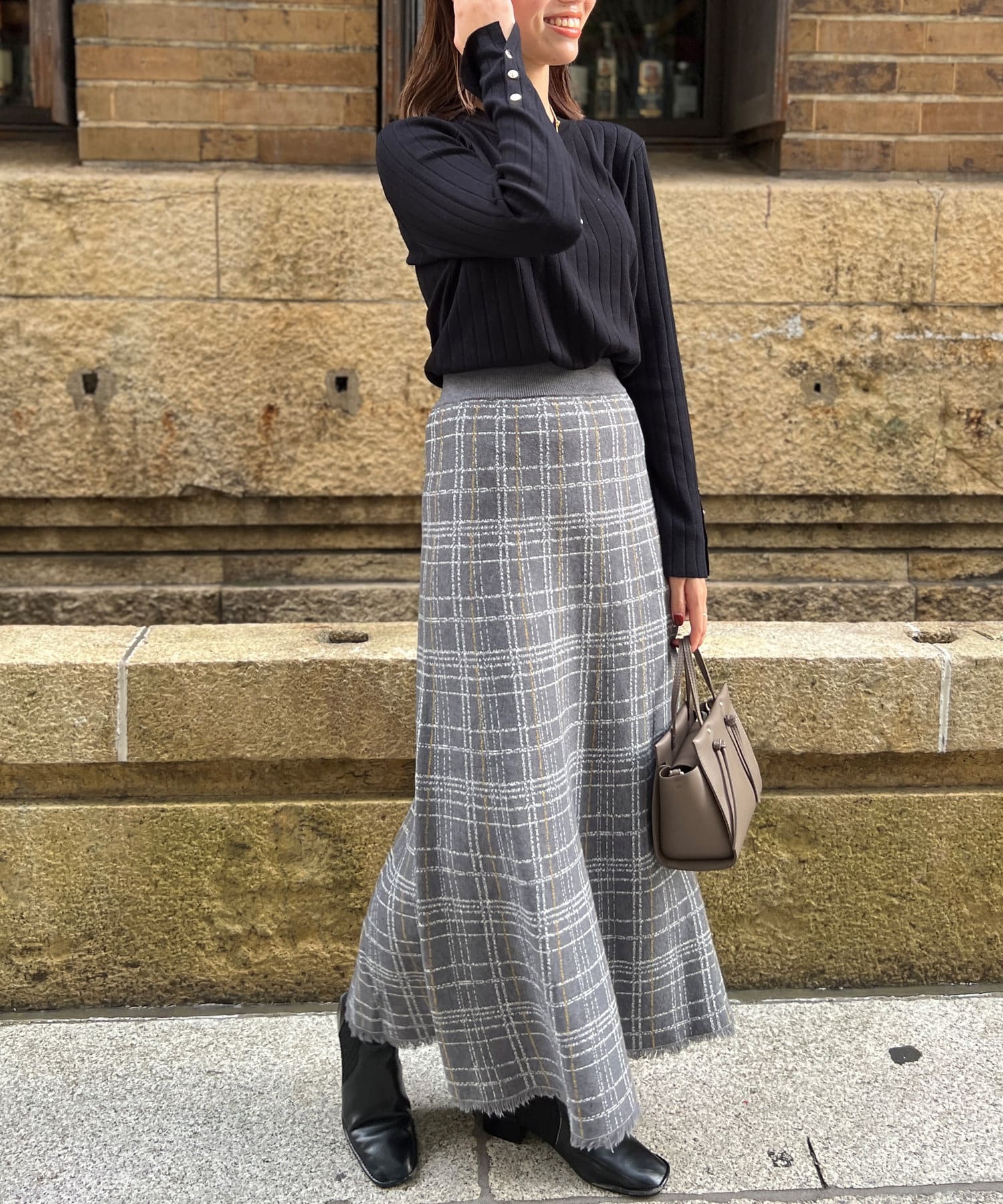 ・ニット生地に小さめフリンジ、細い格子柄のウィンドウペンチェックは
