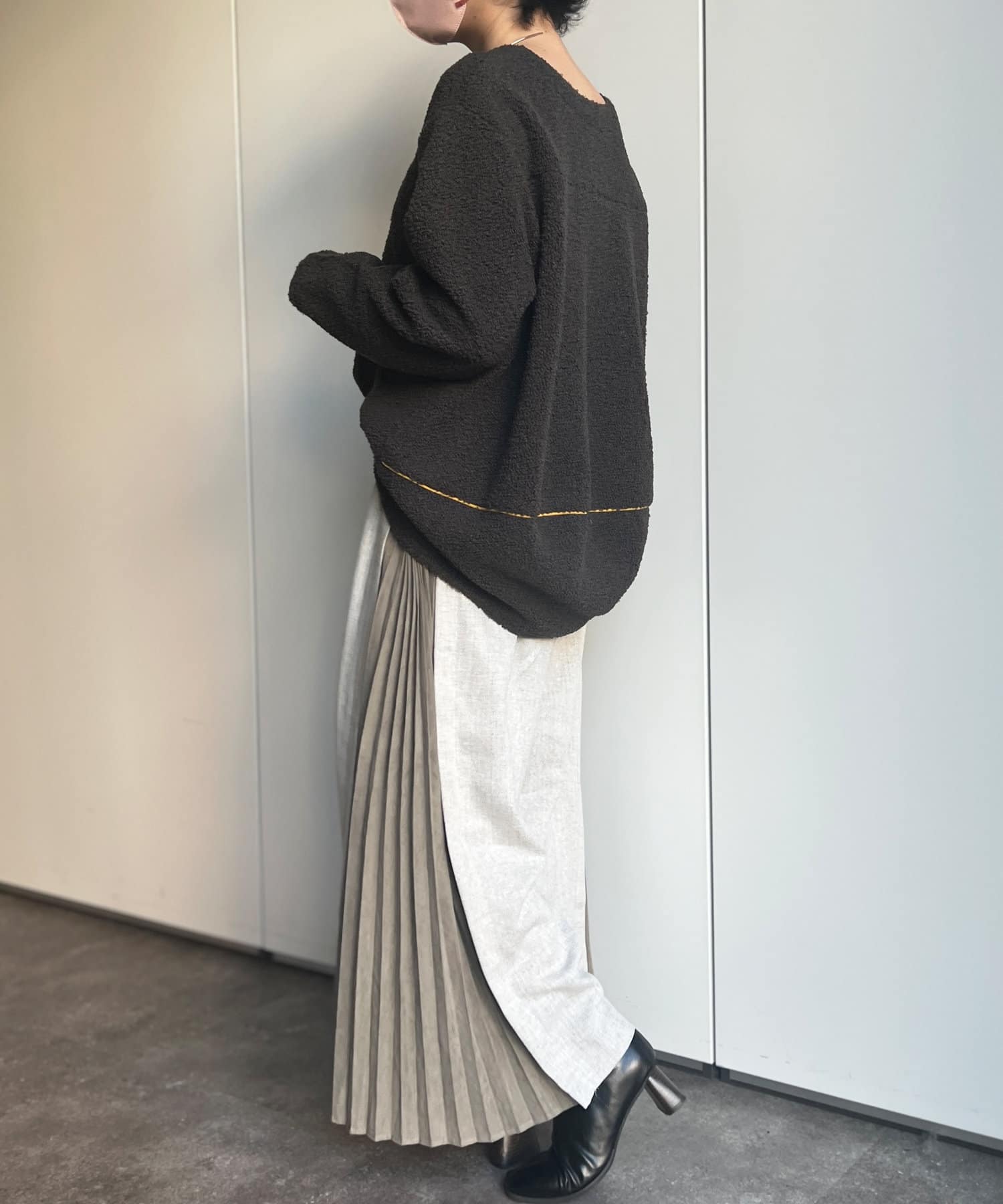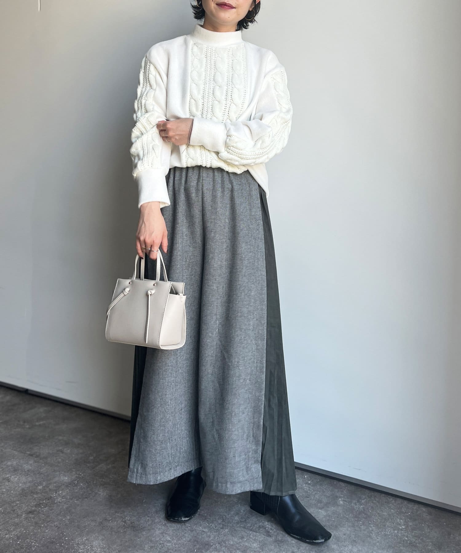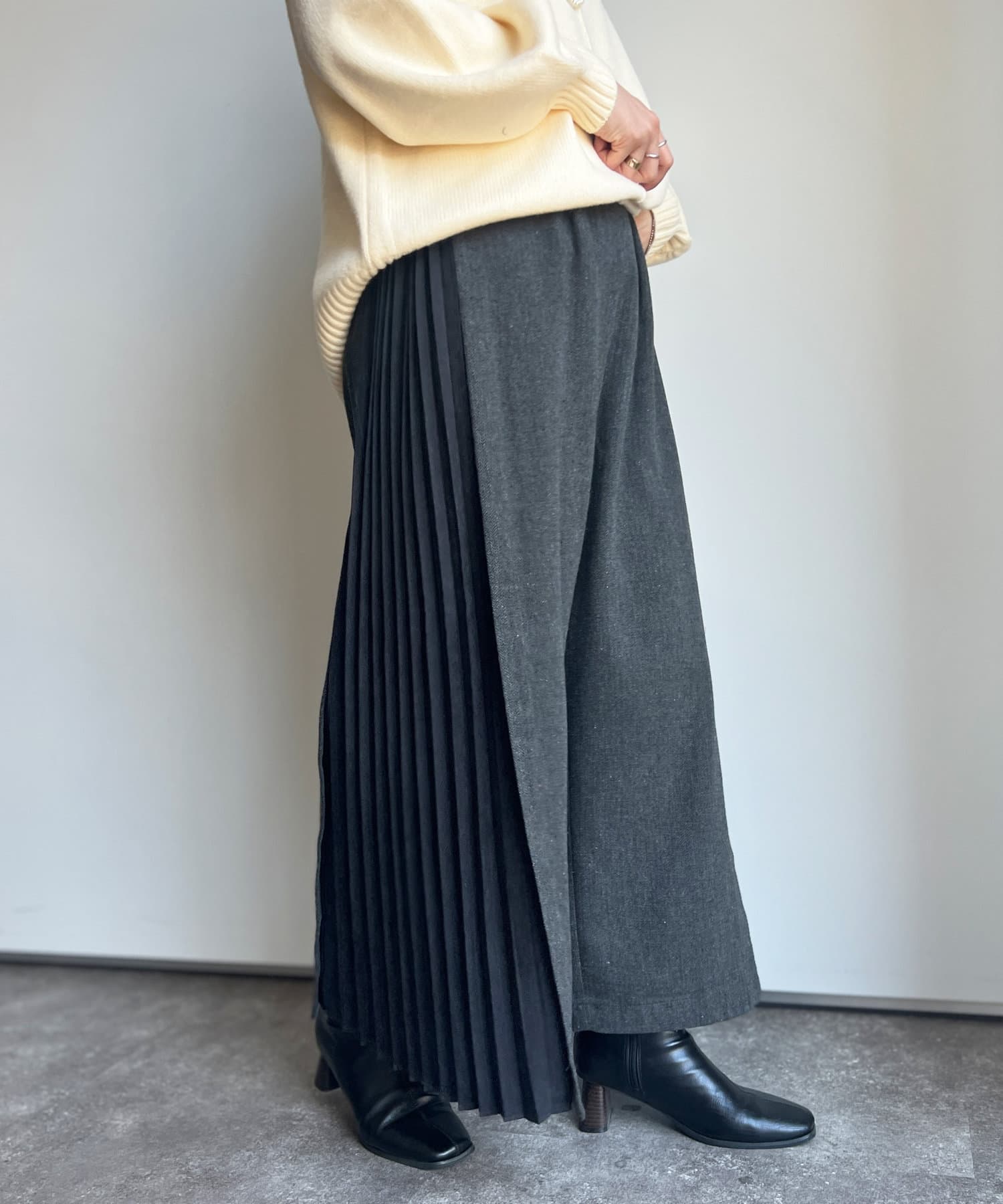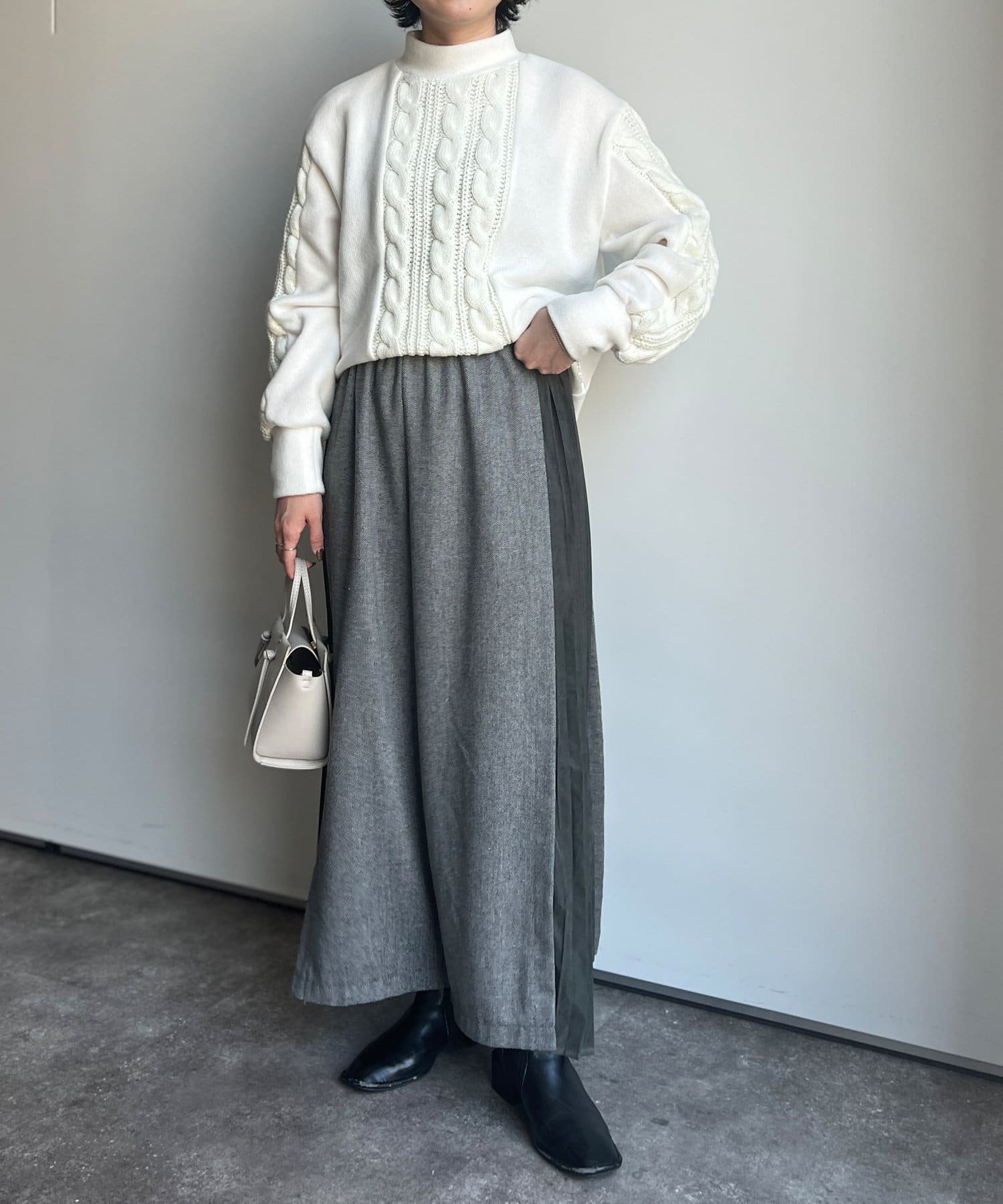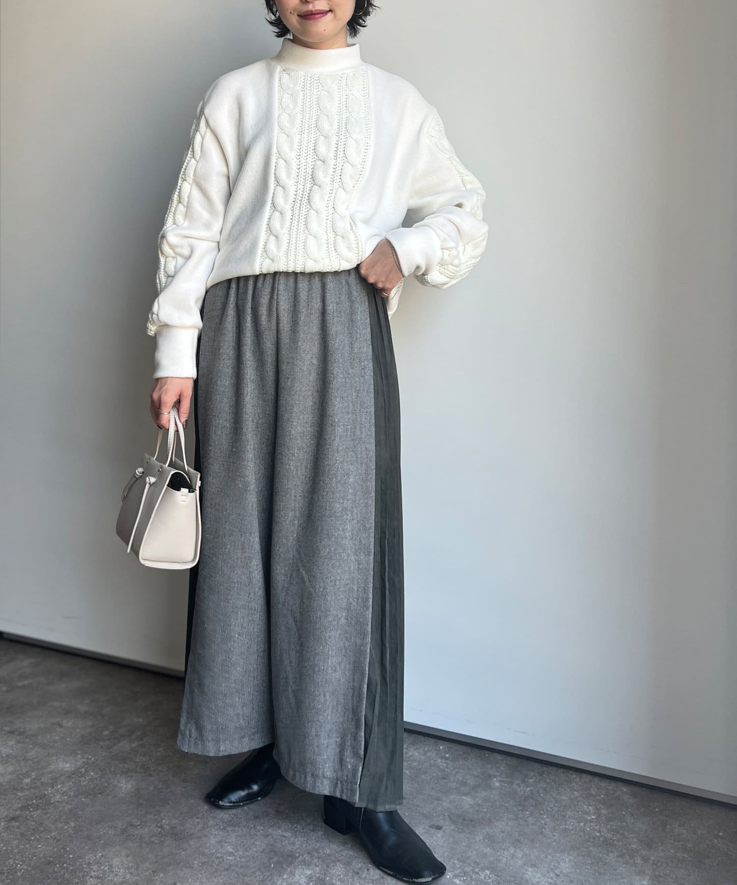 ゆったりしたワイド感なので、カジュアルなニットから甘めブラウスまで様々なアイテムとのミックスコーデを楽しんでいただけます。