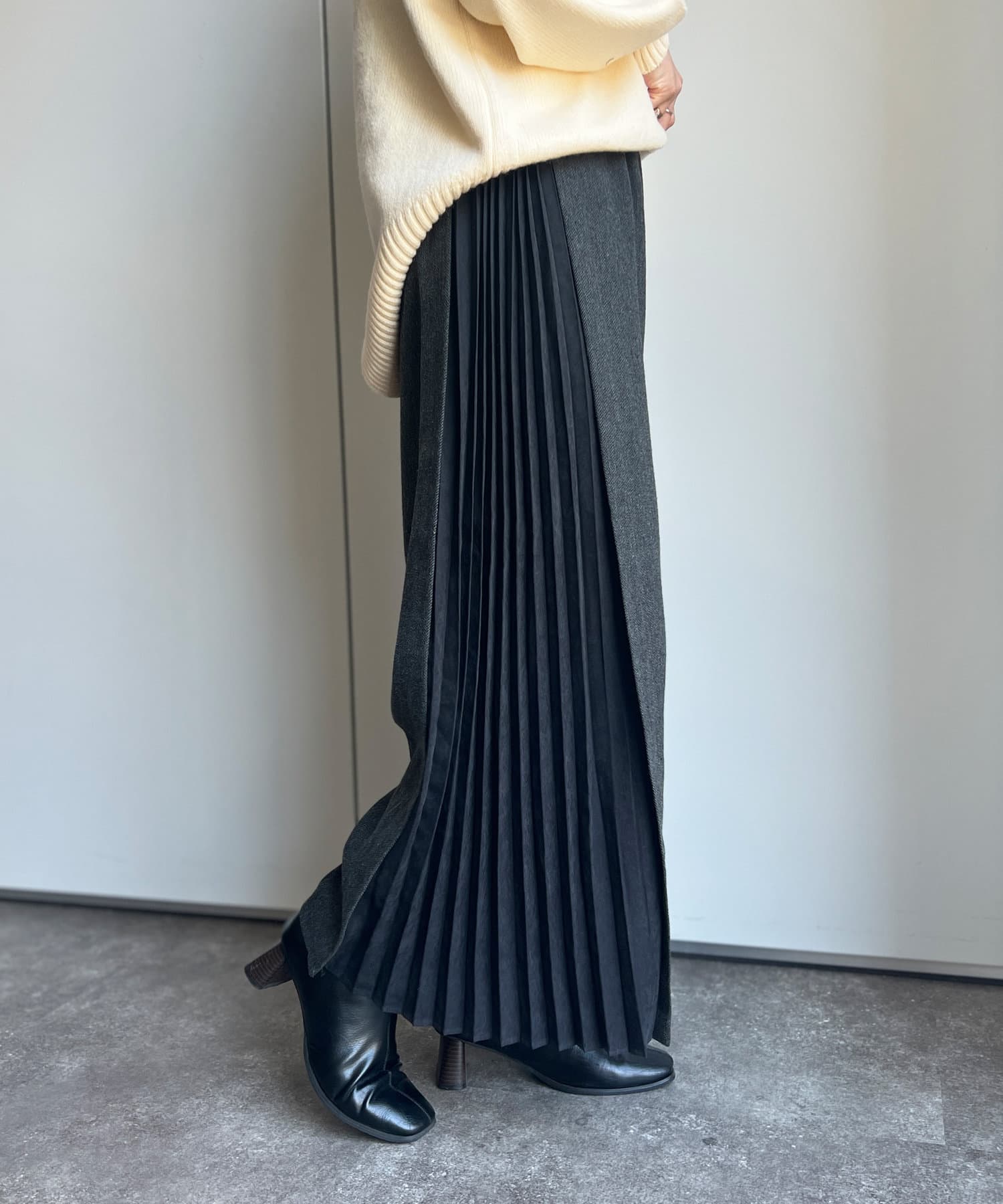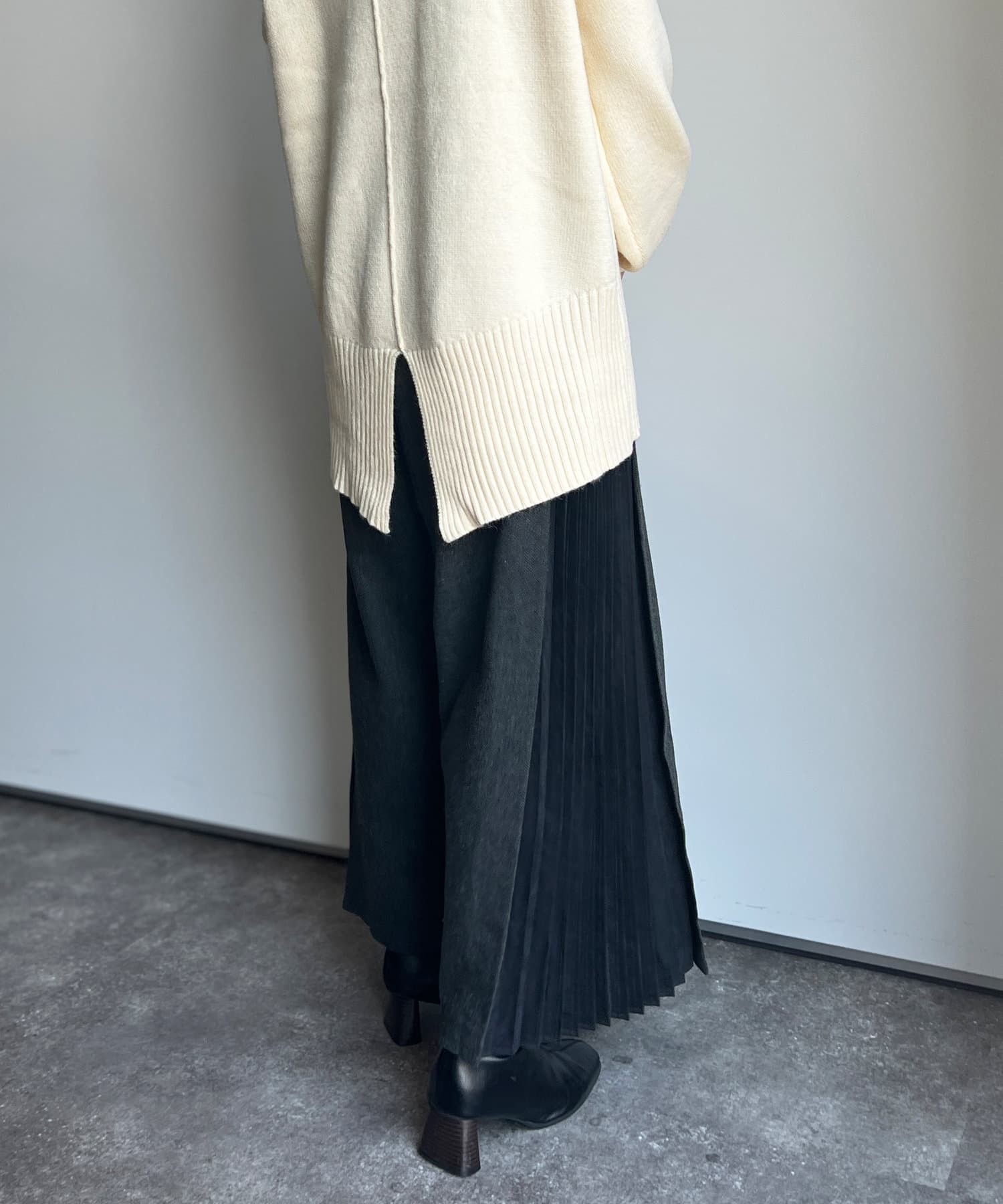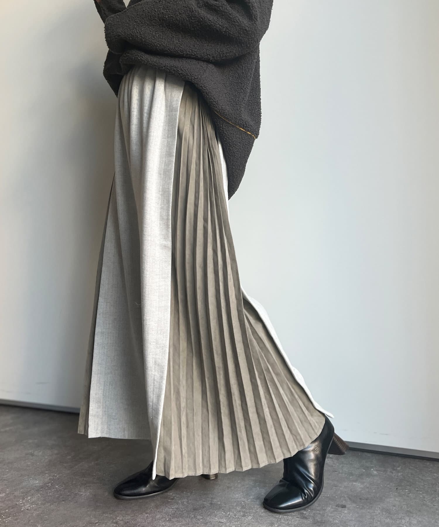 ピーチスキンの生地で仕上げたプリーツが歩くたびにヒラヒラ揺れて上品な雰囲気を演出します。