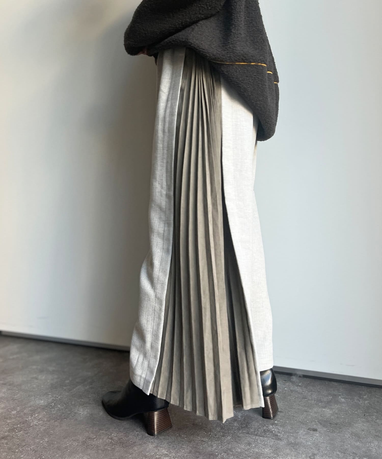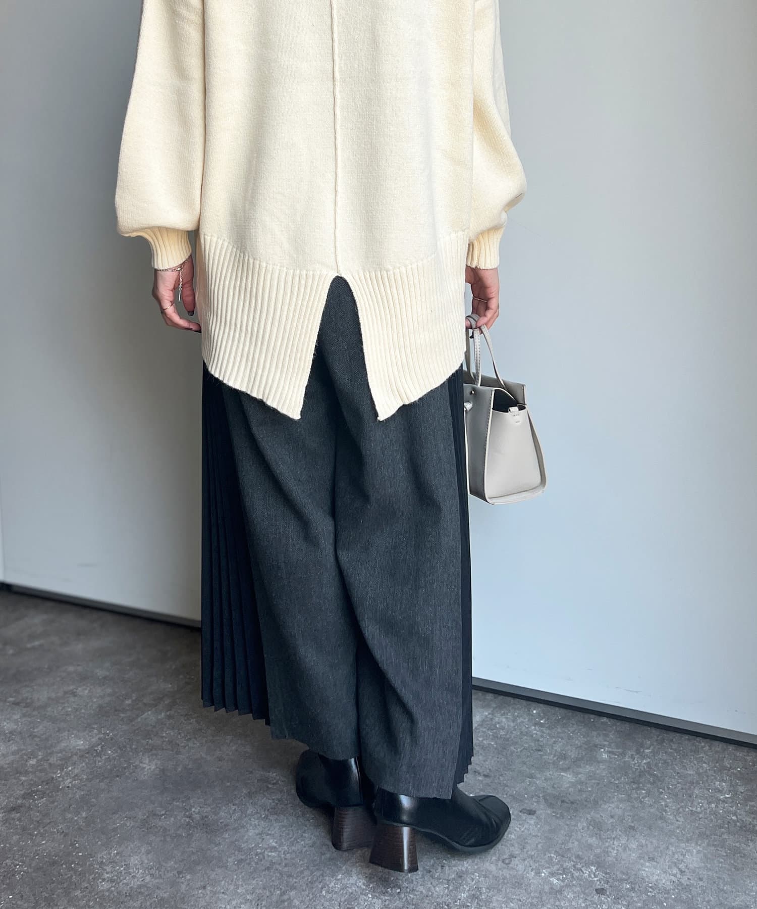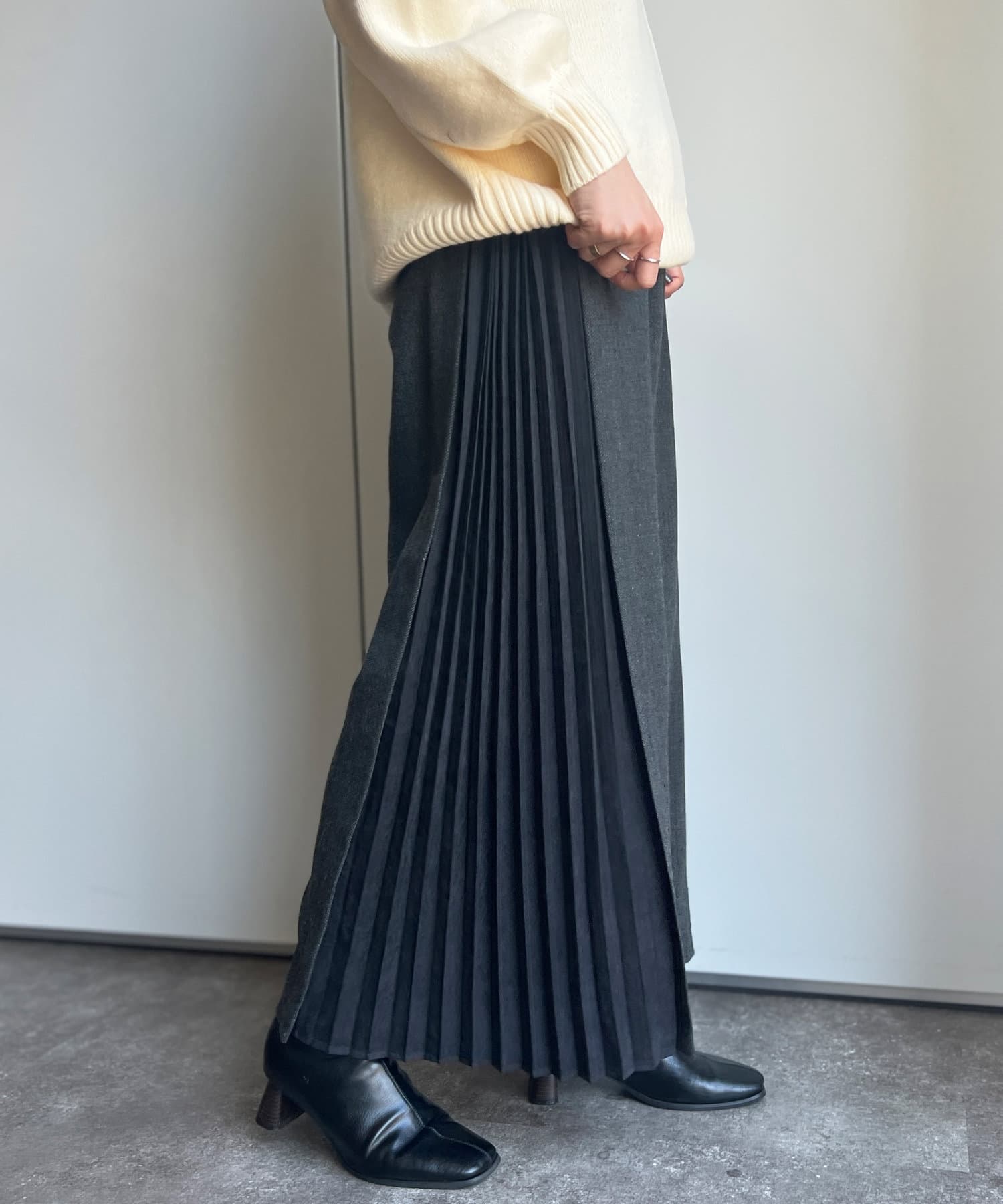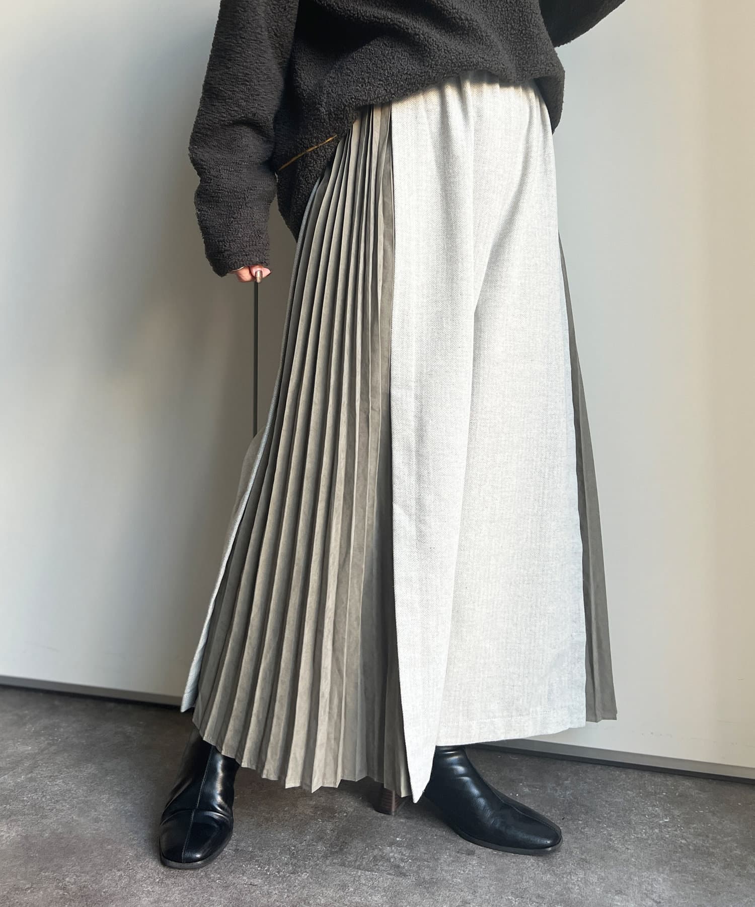 ピーチスキンの生地で仕上げたプリーツが歩くたびにヒラヒラ揺れて上品な雰囲気を演出します。