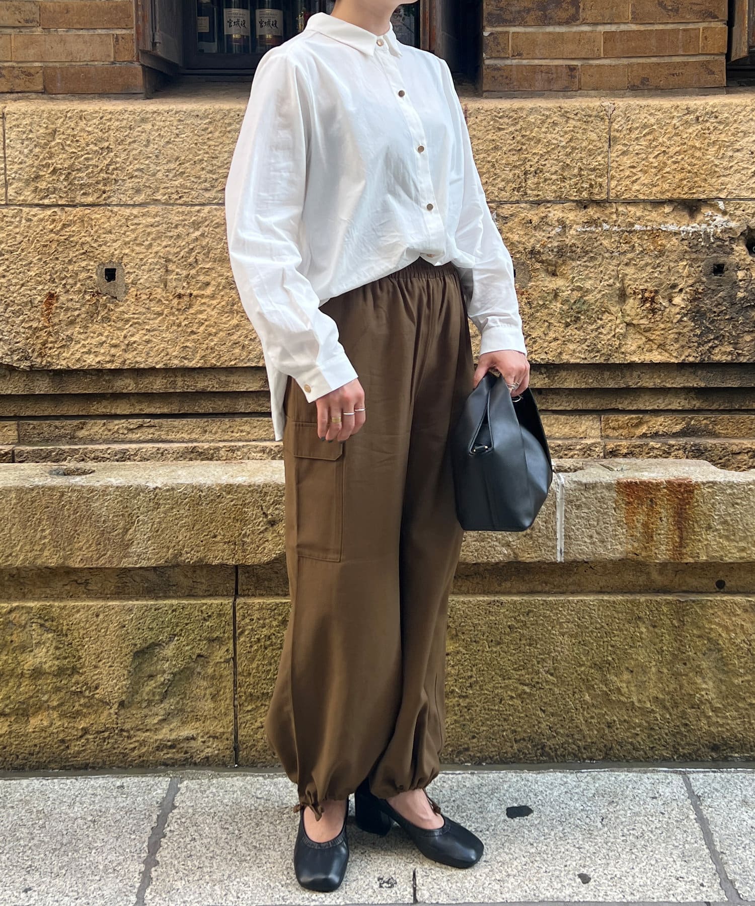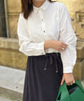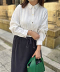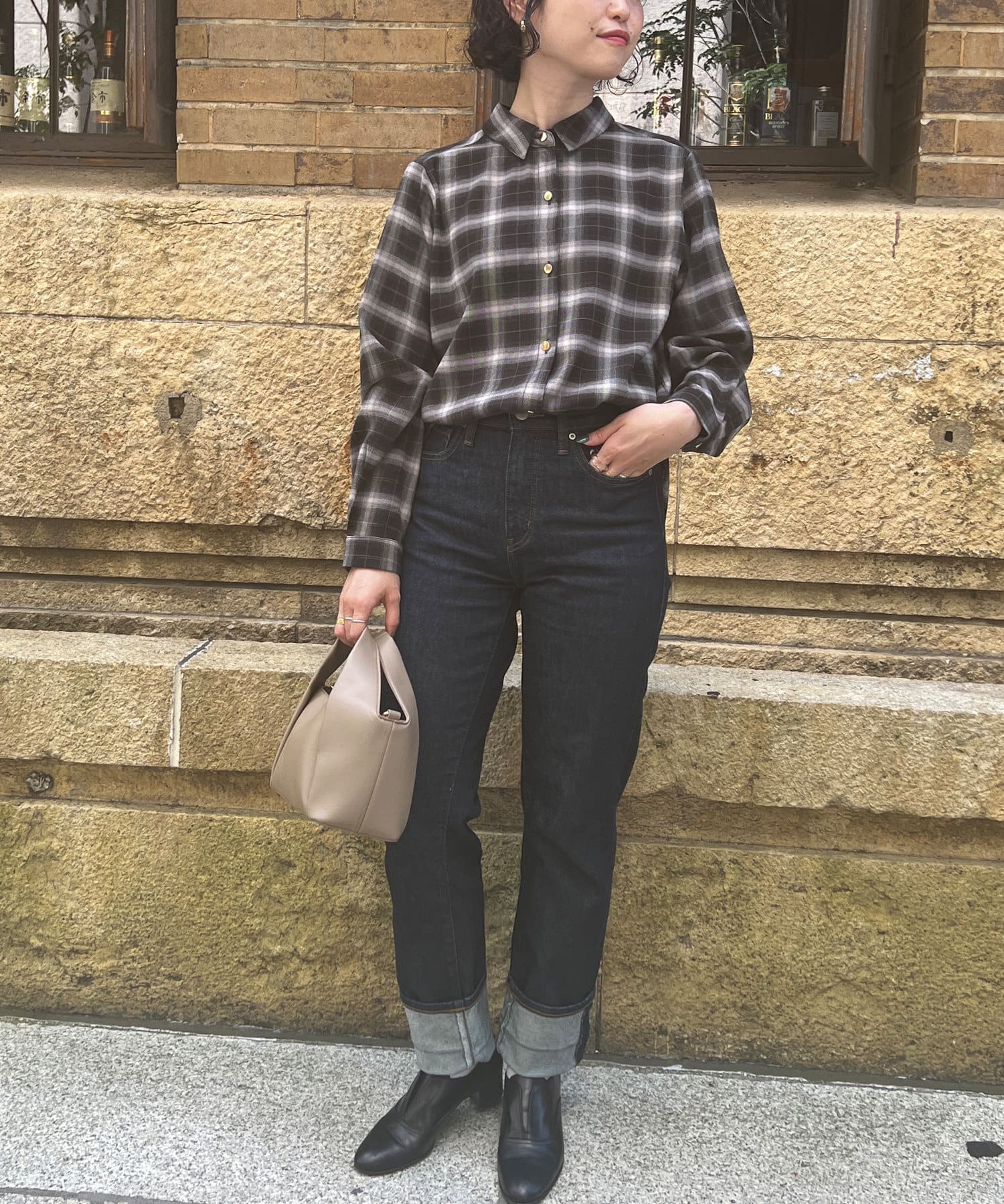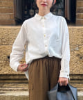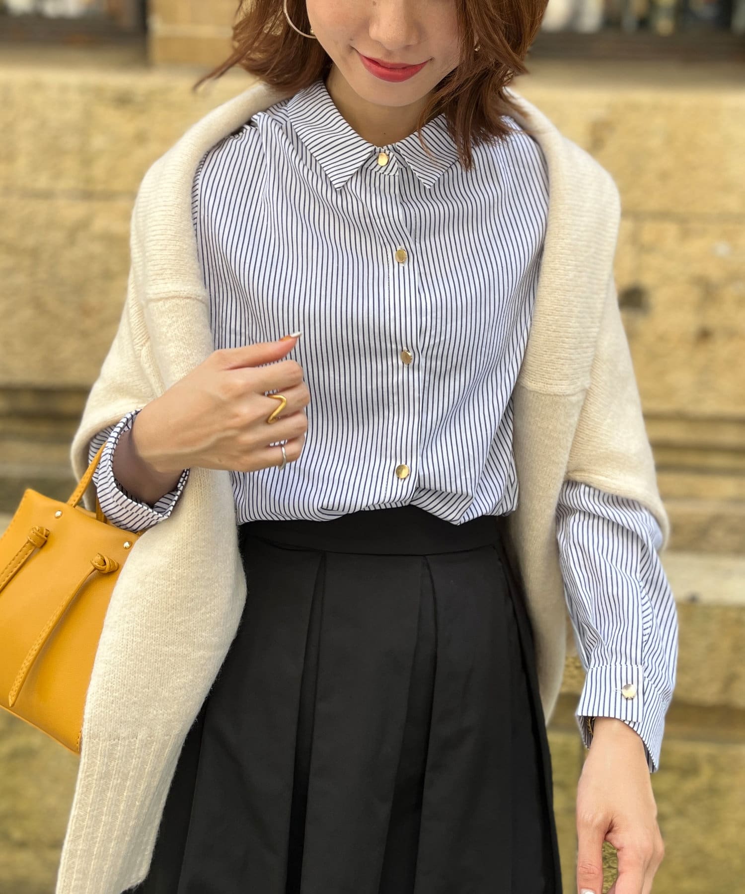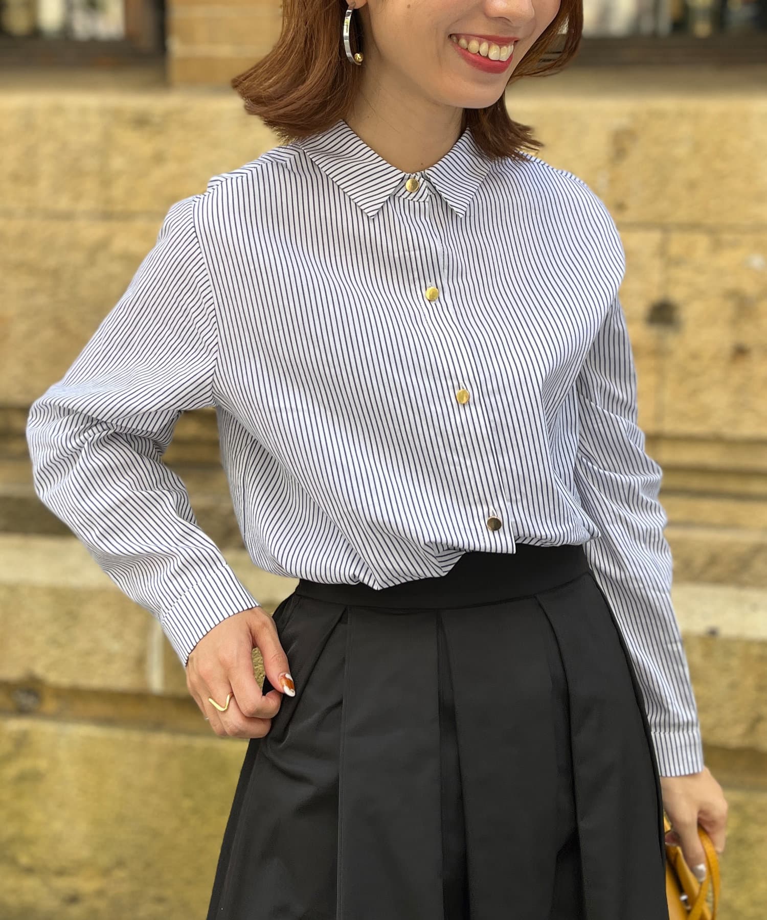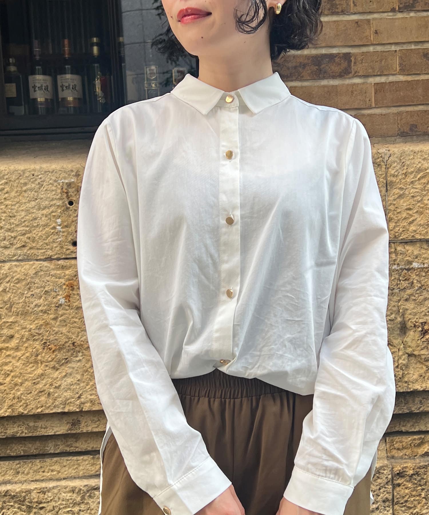 小さめの襟とゴールドボタンが品のある雰囲気に見せてくれるので、シャツ+パンツのコーディネートでもメンズライクになり過ぎず女性らしく見せてくれます。