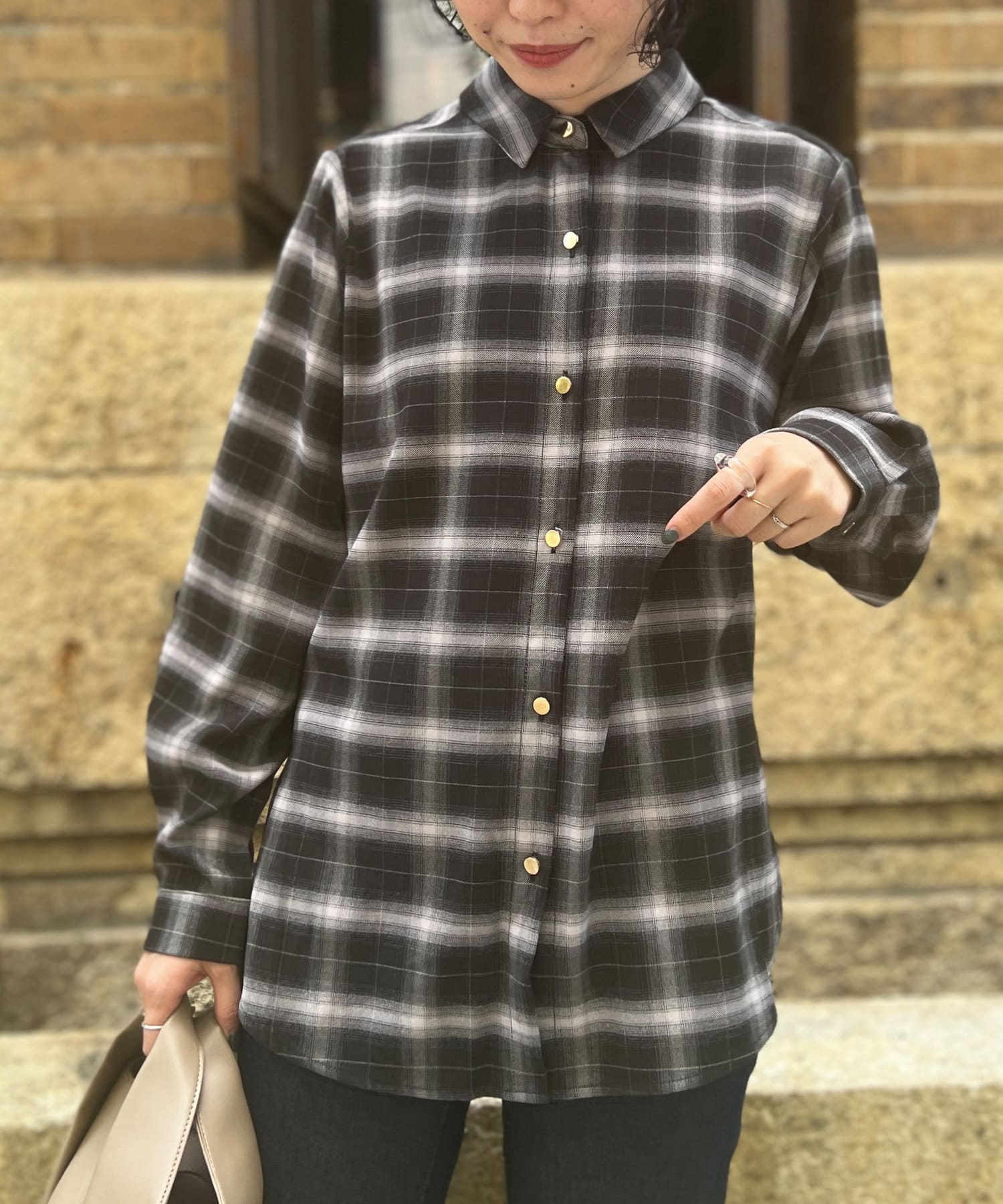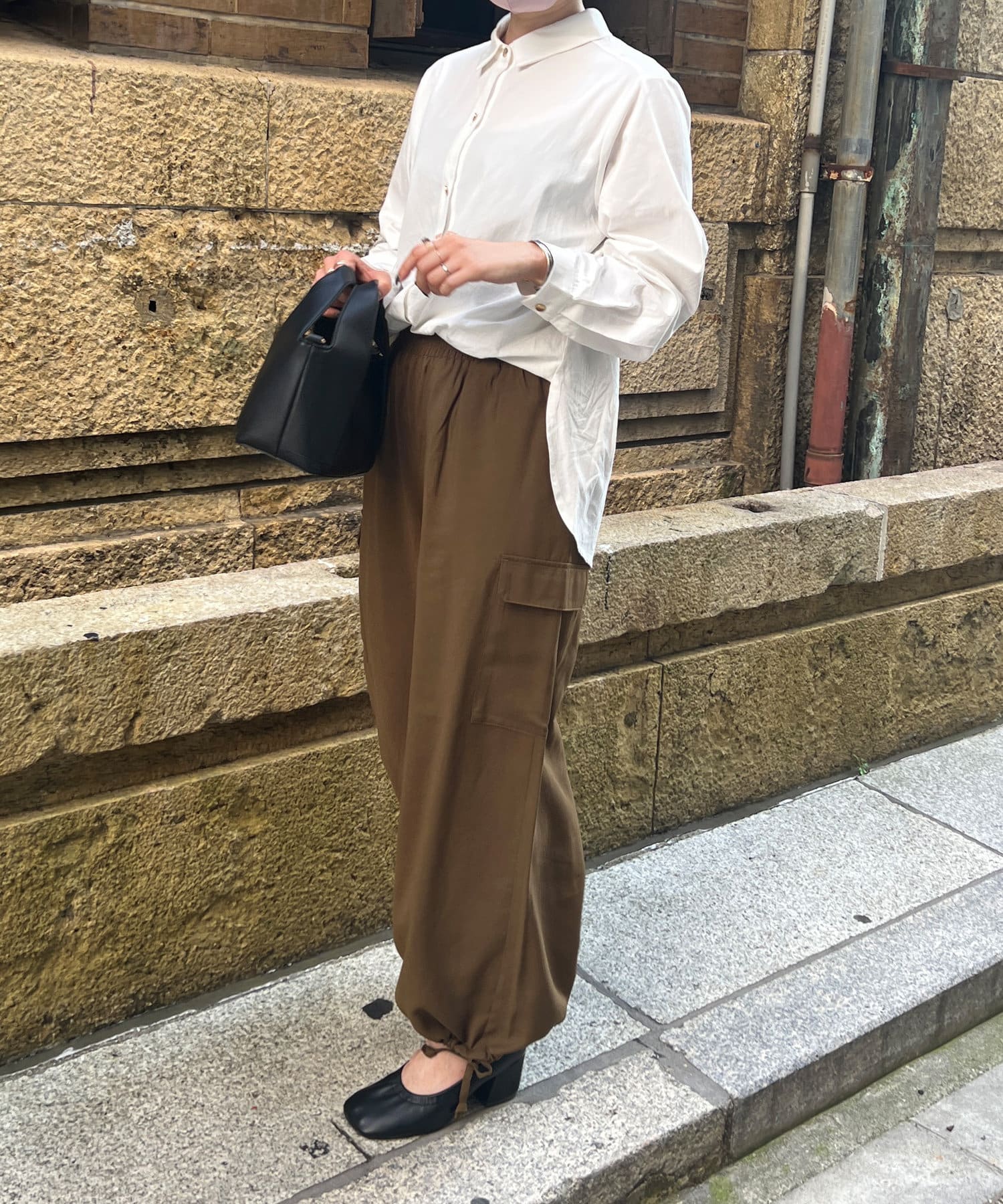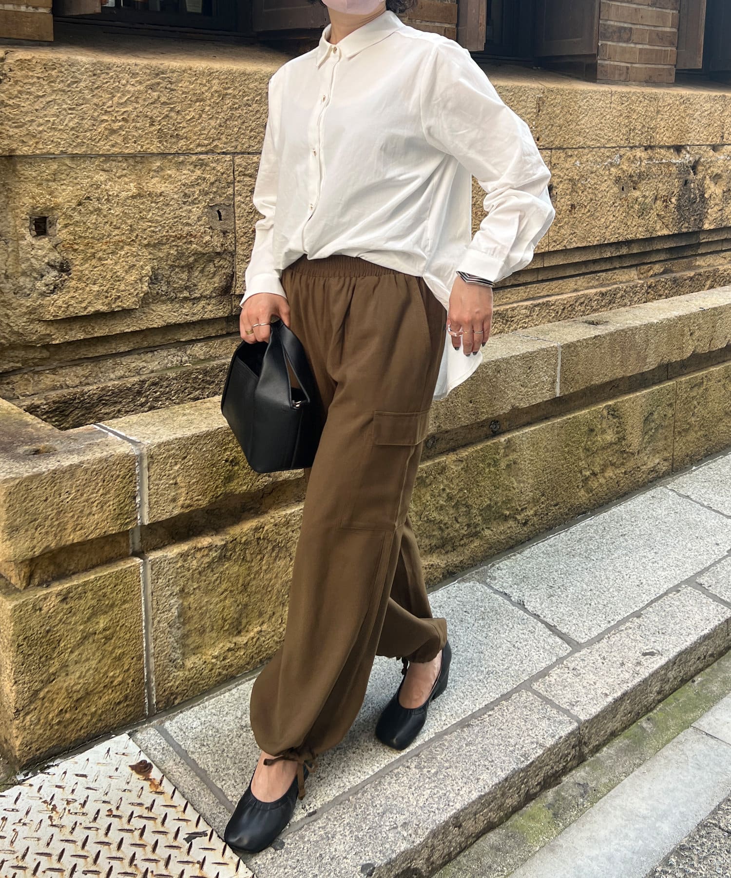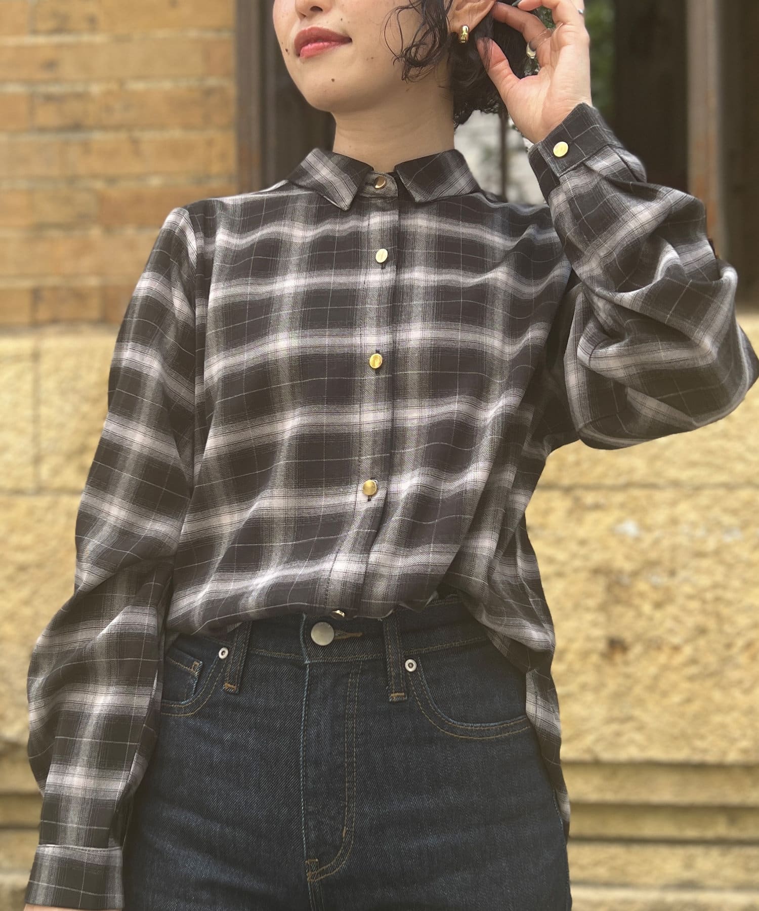 小さめの襟とゴールドボタンが品のある雰囲気に見せてくれるので、シャツ+パンツのコーディネートでもメンズライクになり過ぎず女性らしく見せてくれます。
