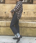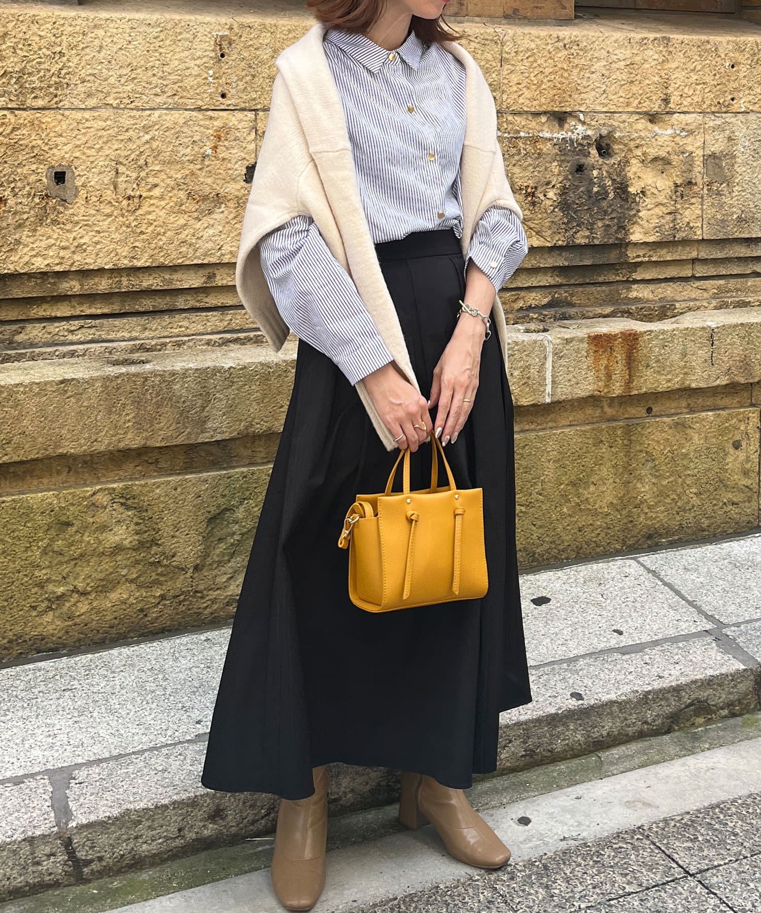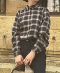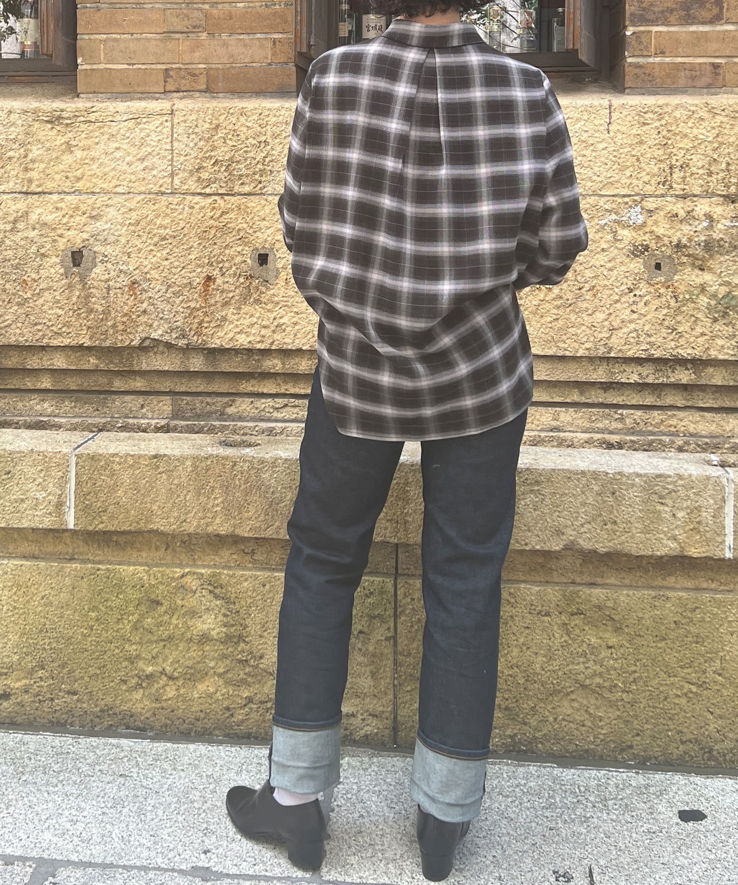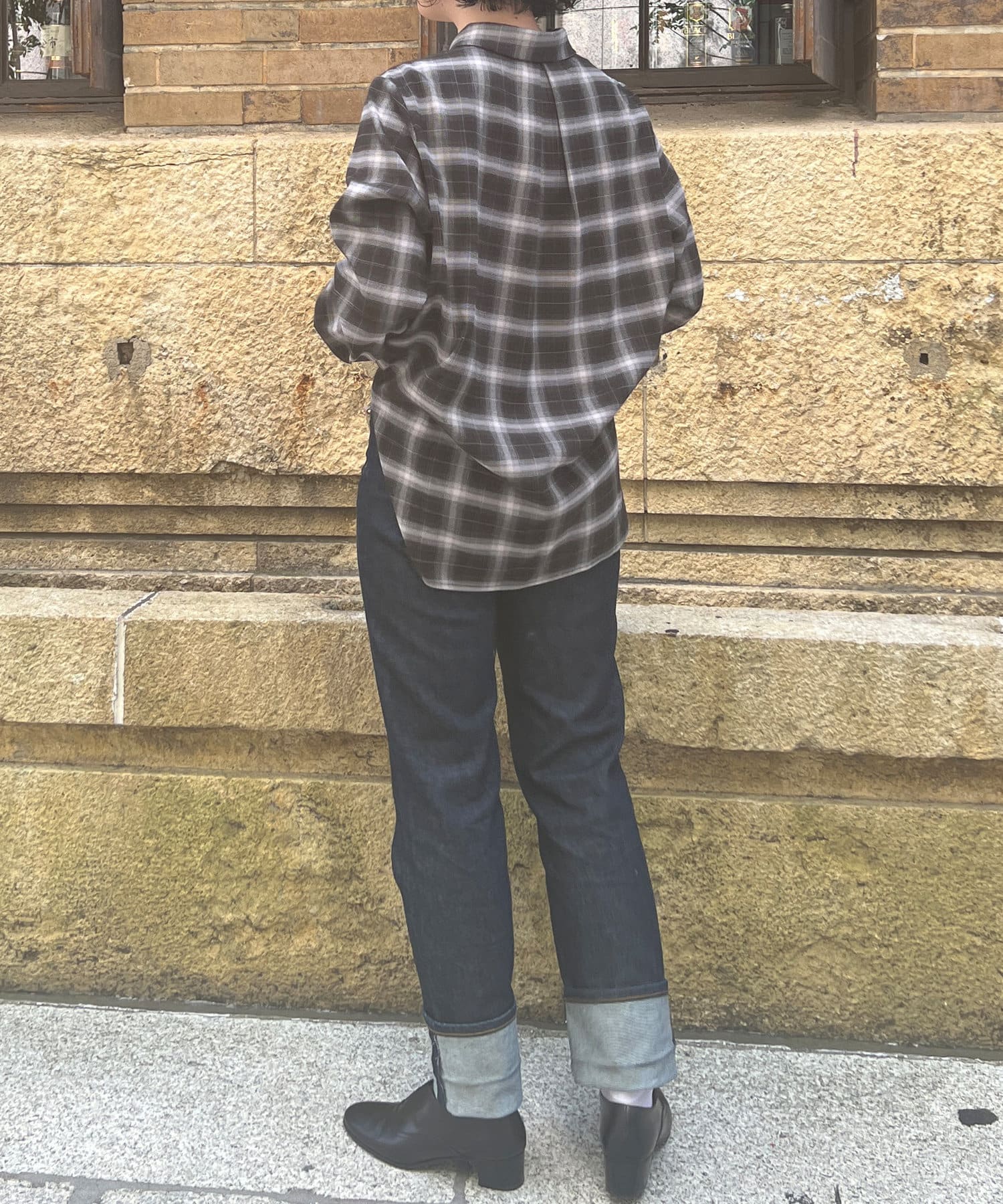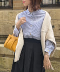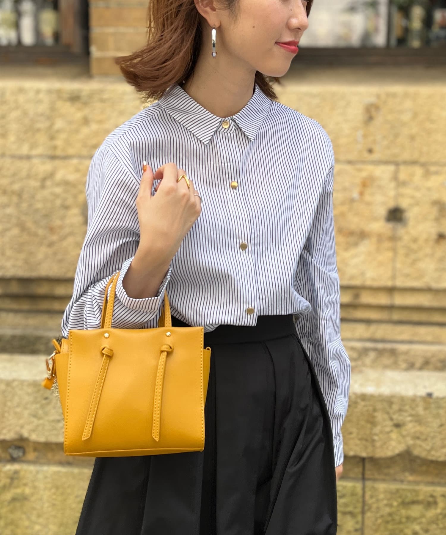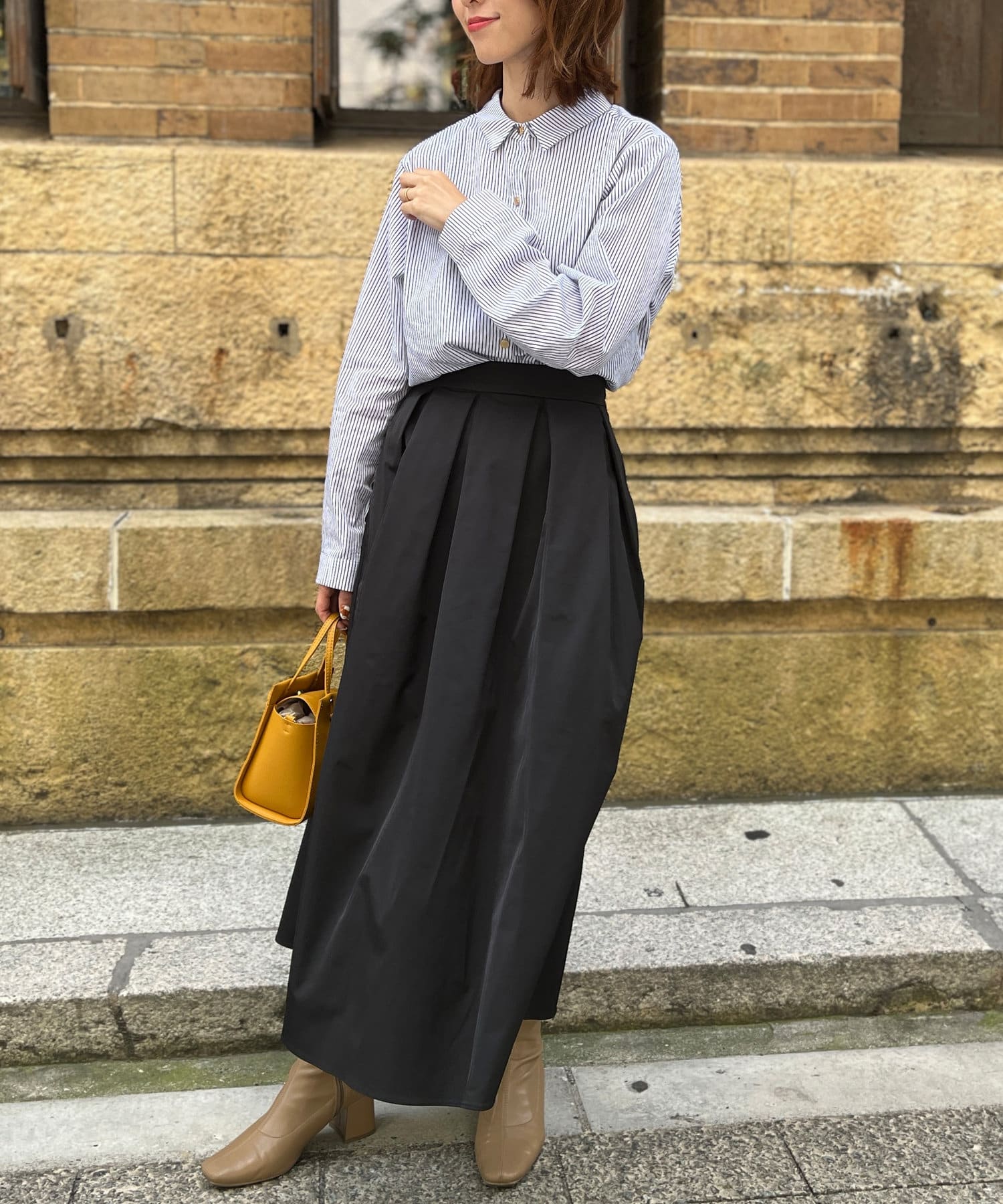 小さめの襟とゴールドボタンが品のある雰囲気に見せてくれるので、シャツ+パンツのコーディネートでもメンズライクになり過ぎず女性らしく見せてくれます。