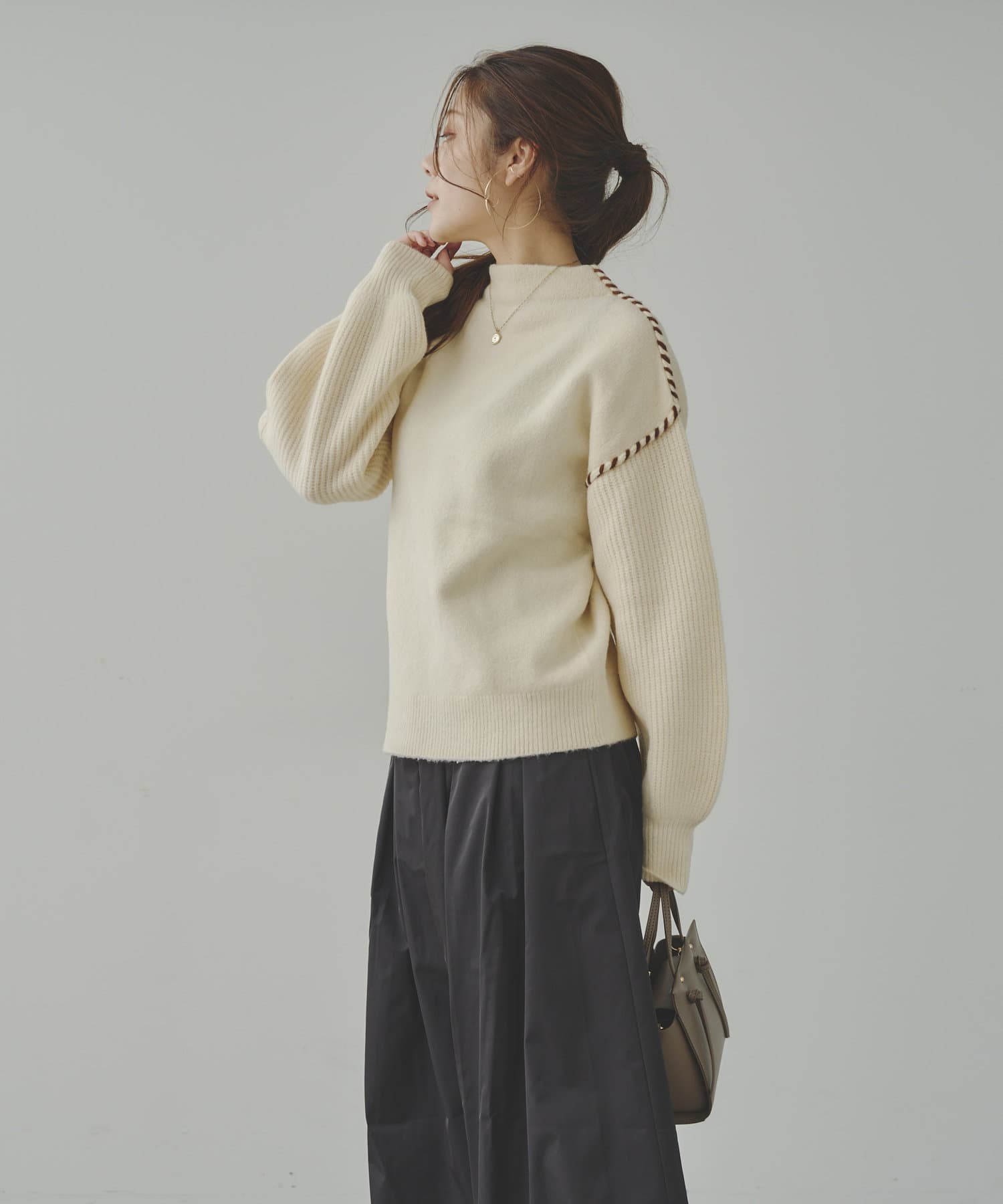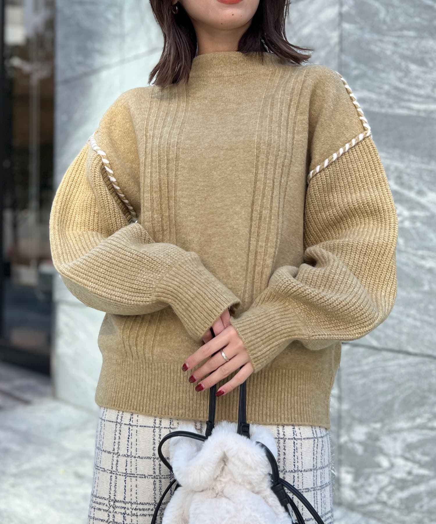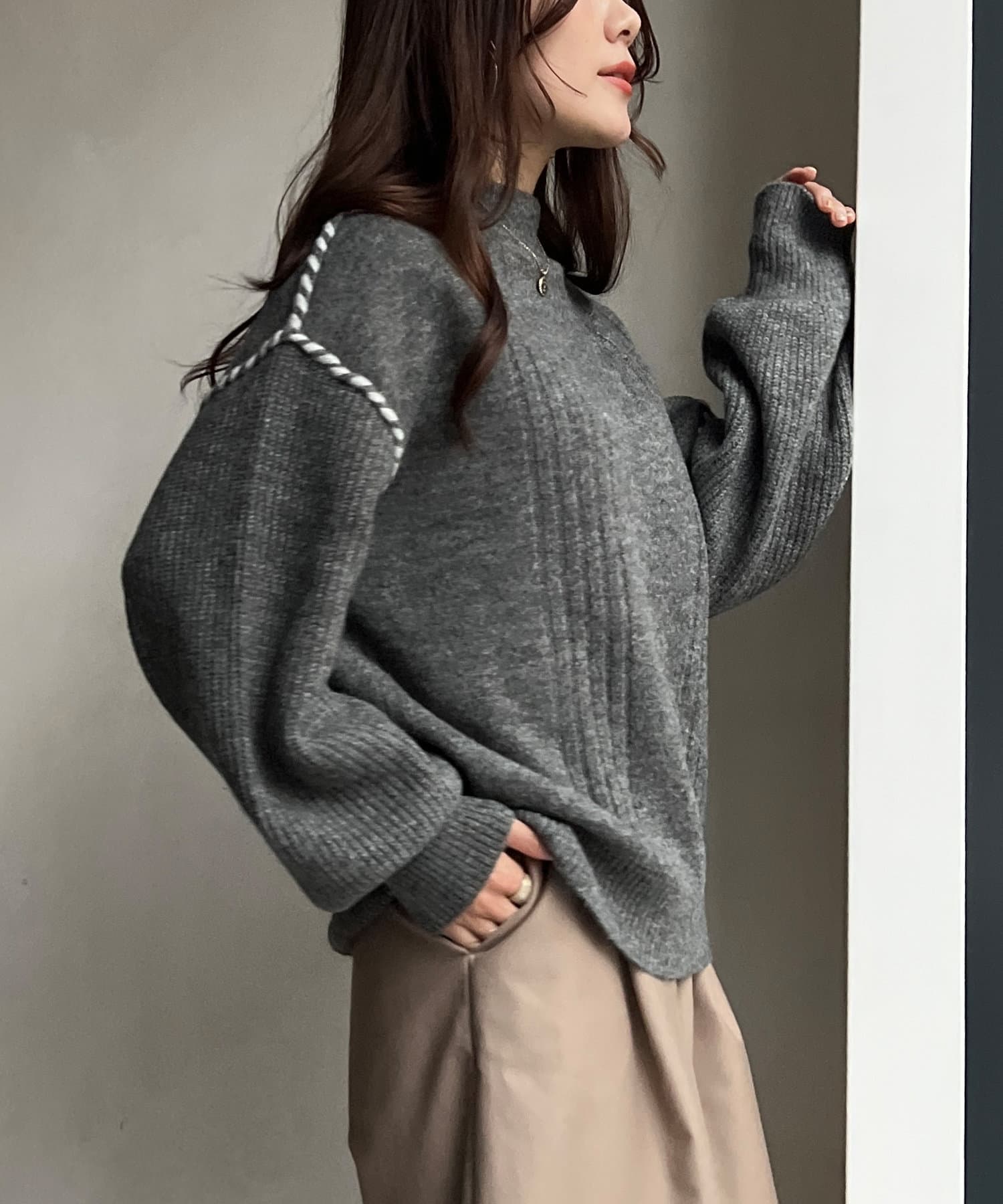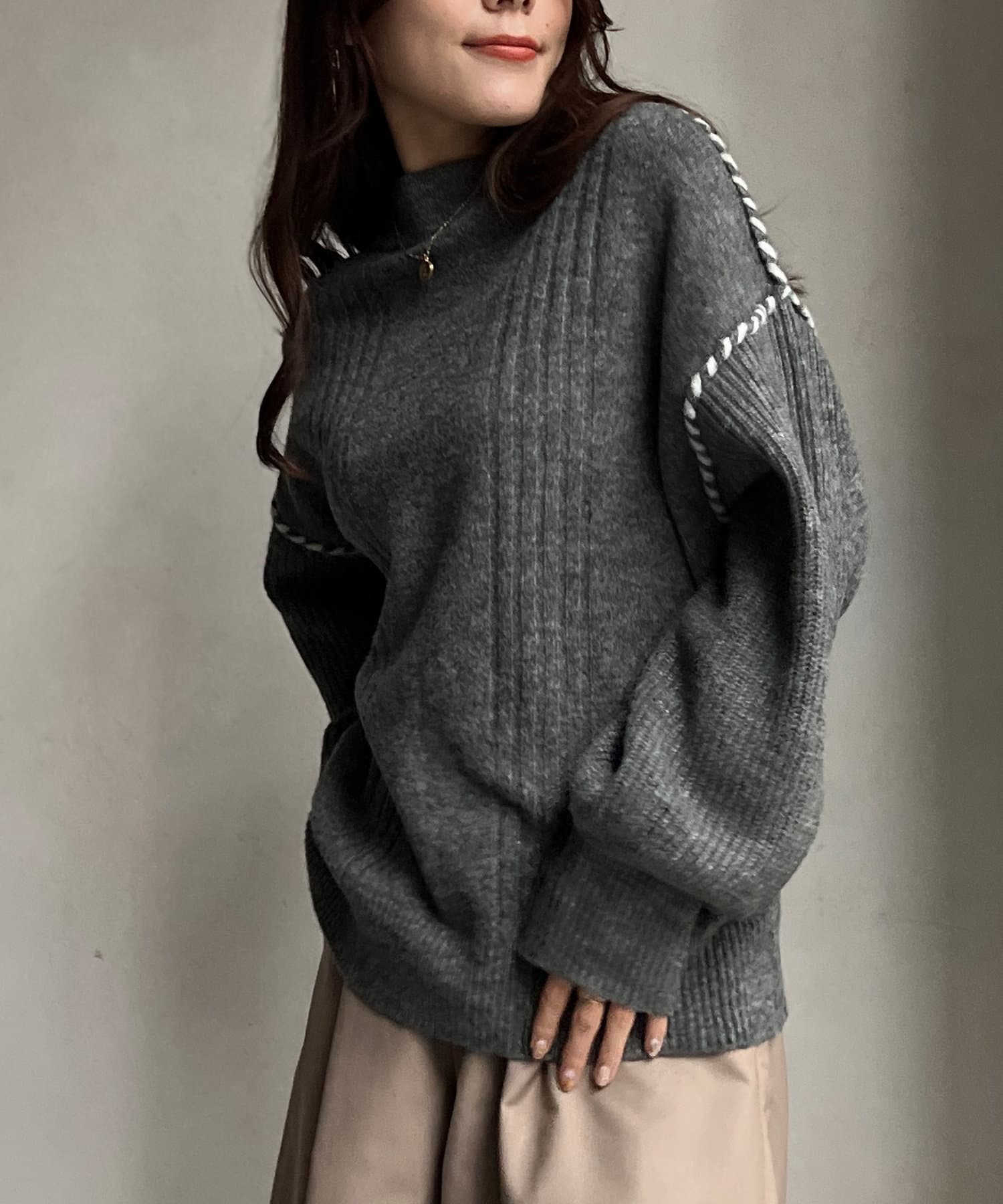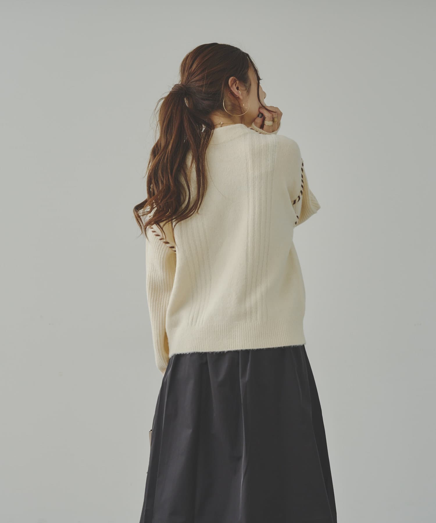 ・トレンドの配色ステッチが施されたざっくりシルエットのニット。