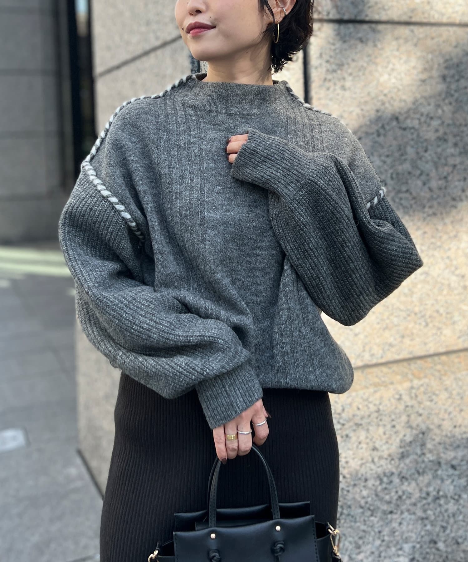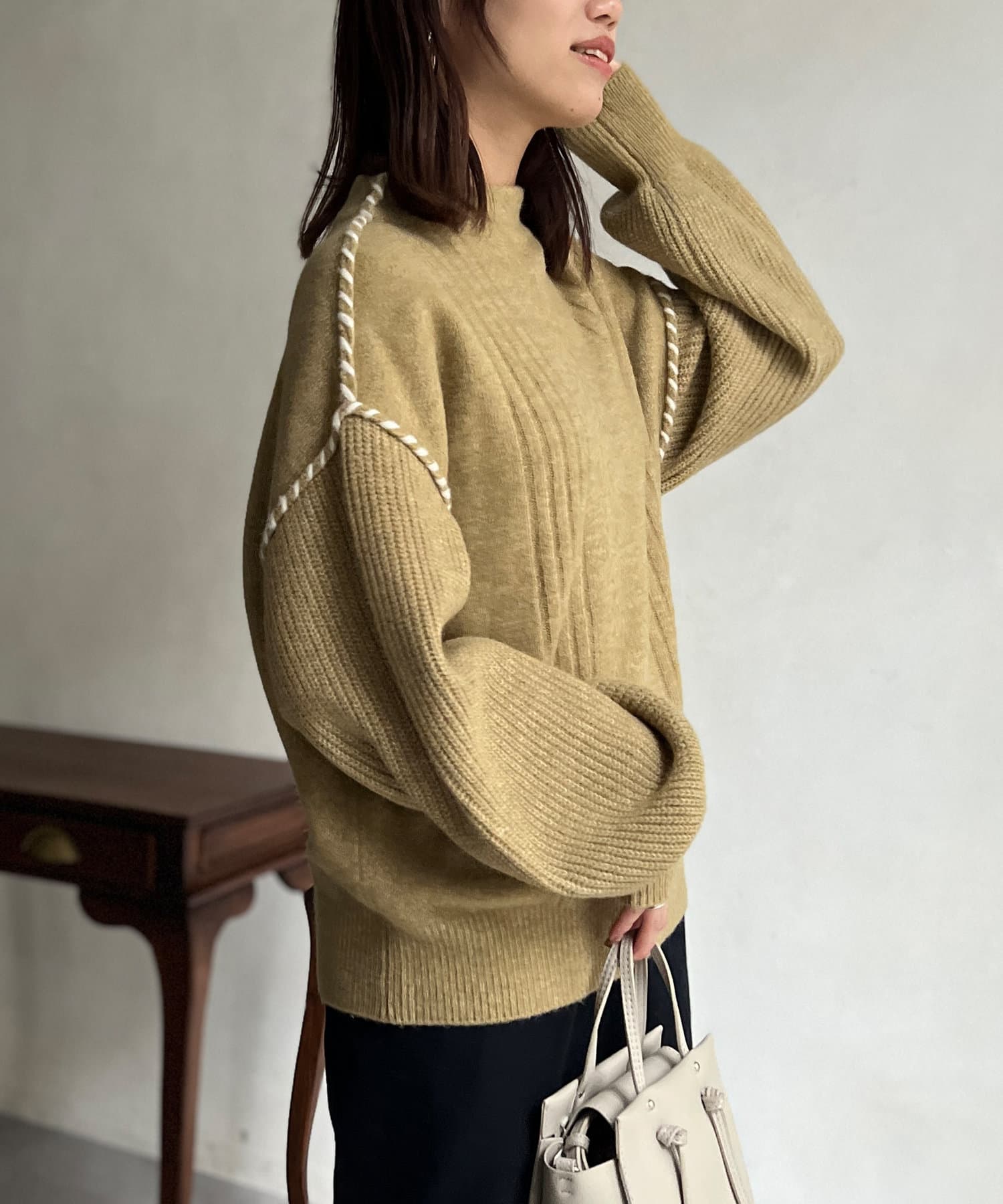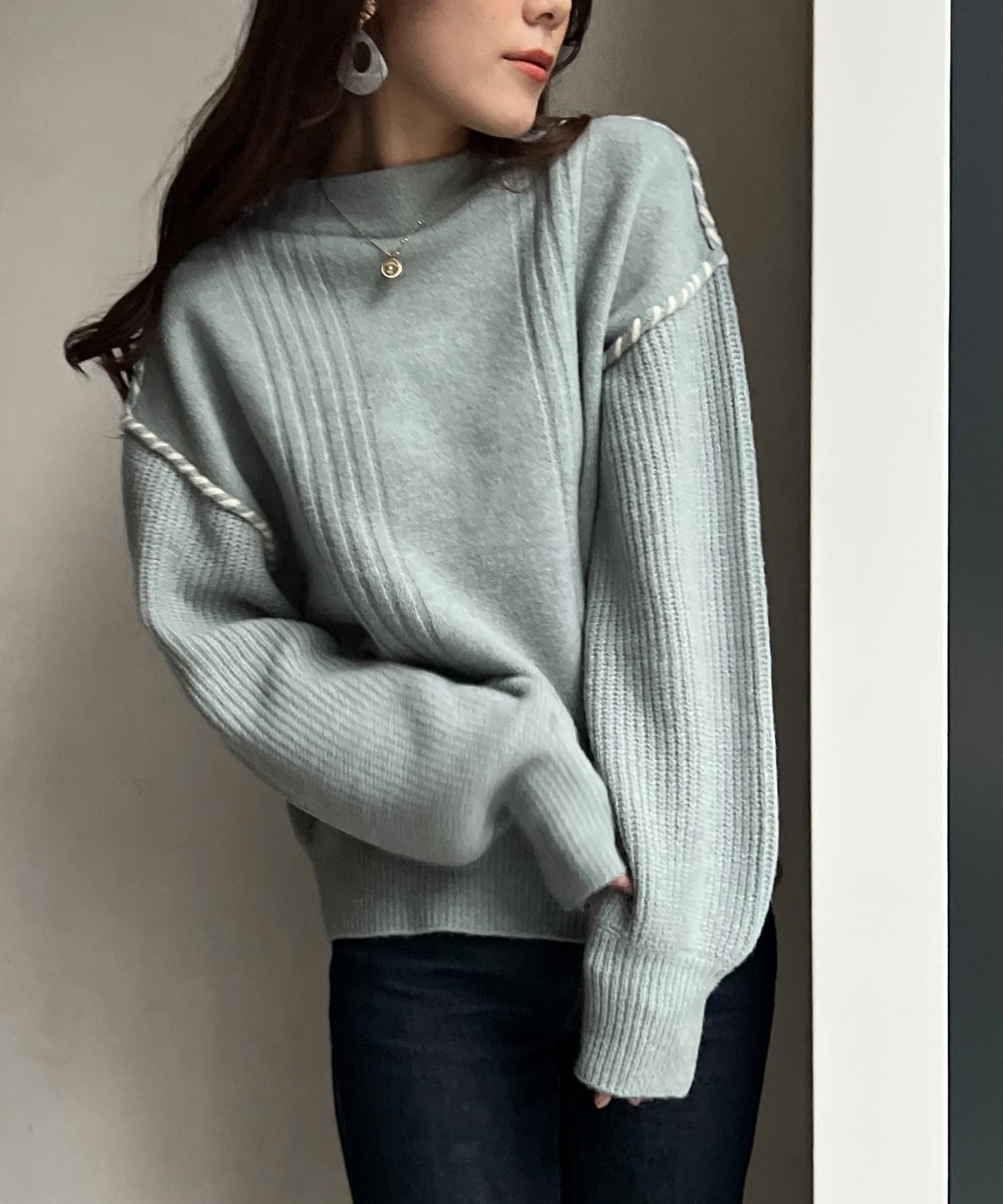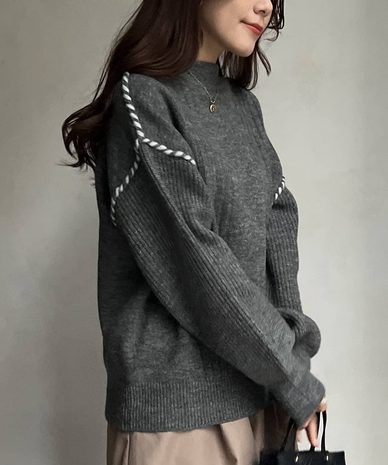 ・トレンドの配色ステッチが施されたざっくりシルエットのニット。