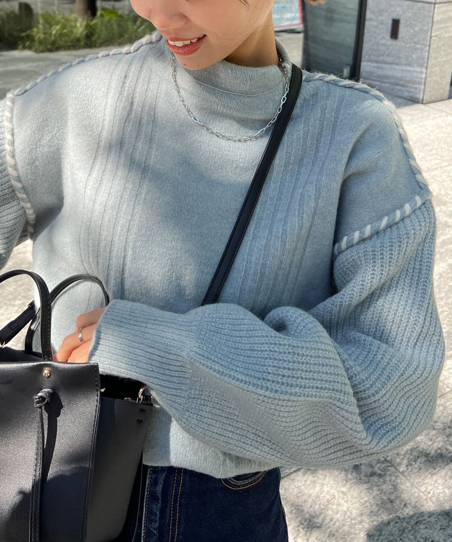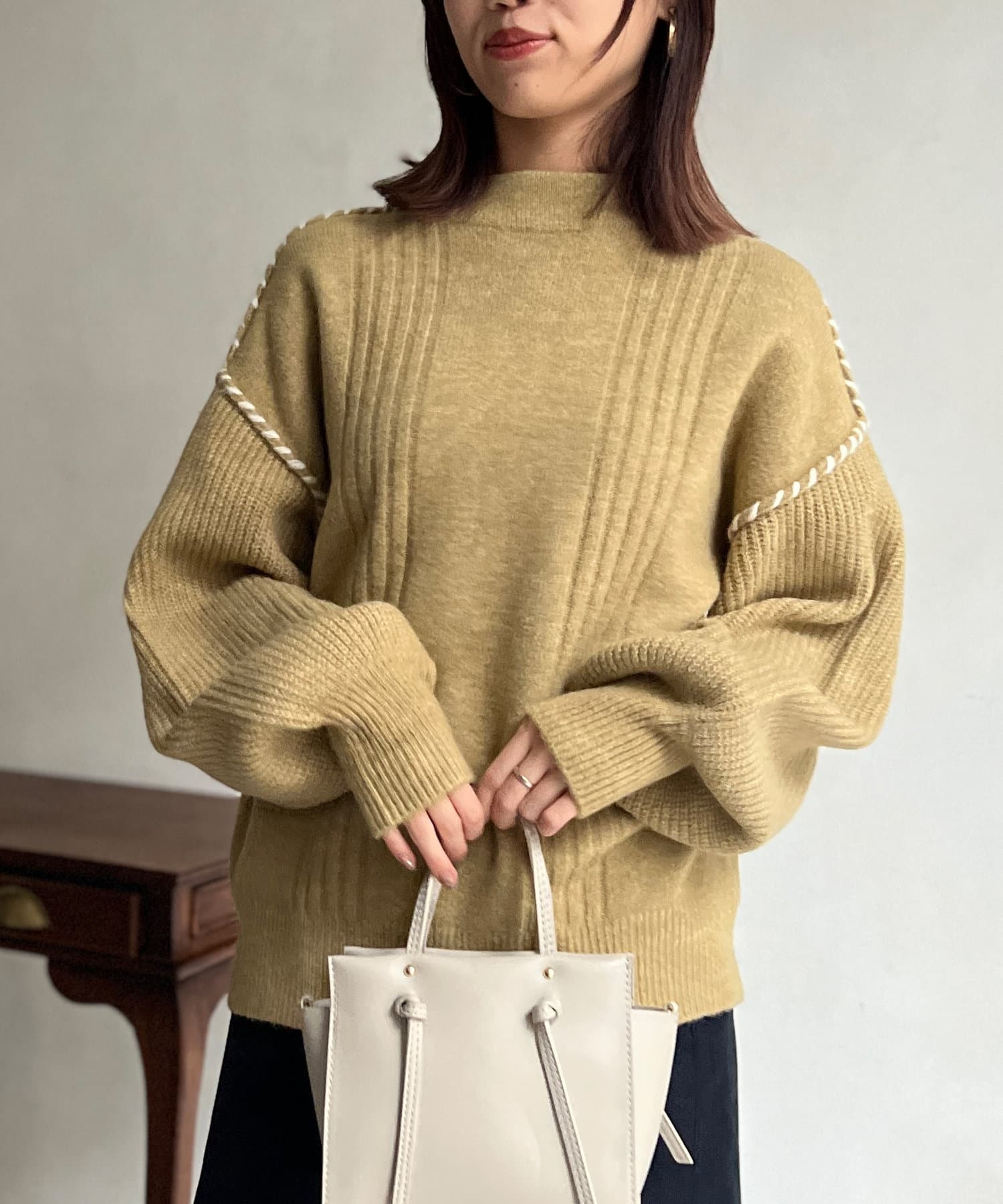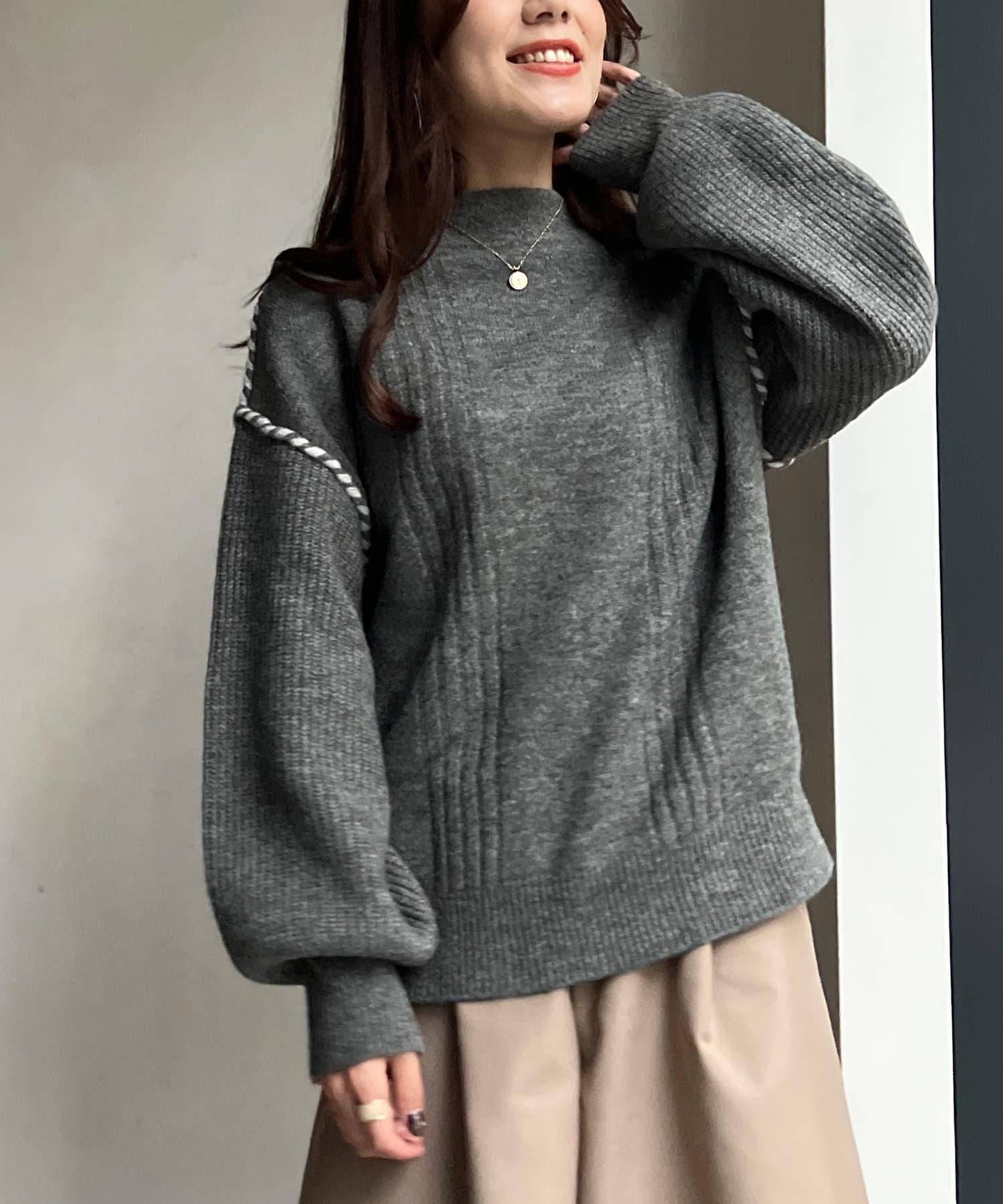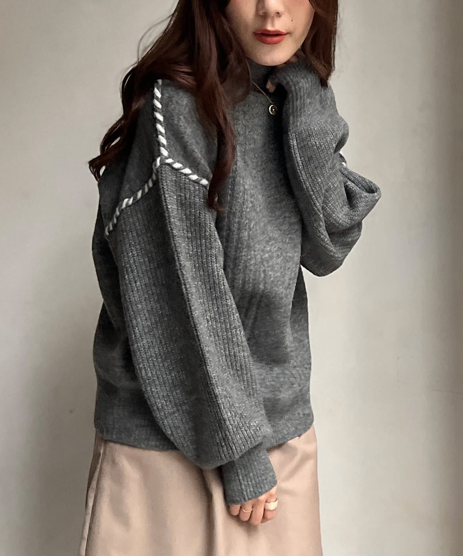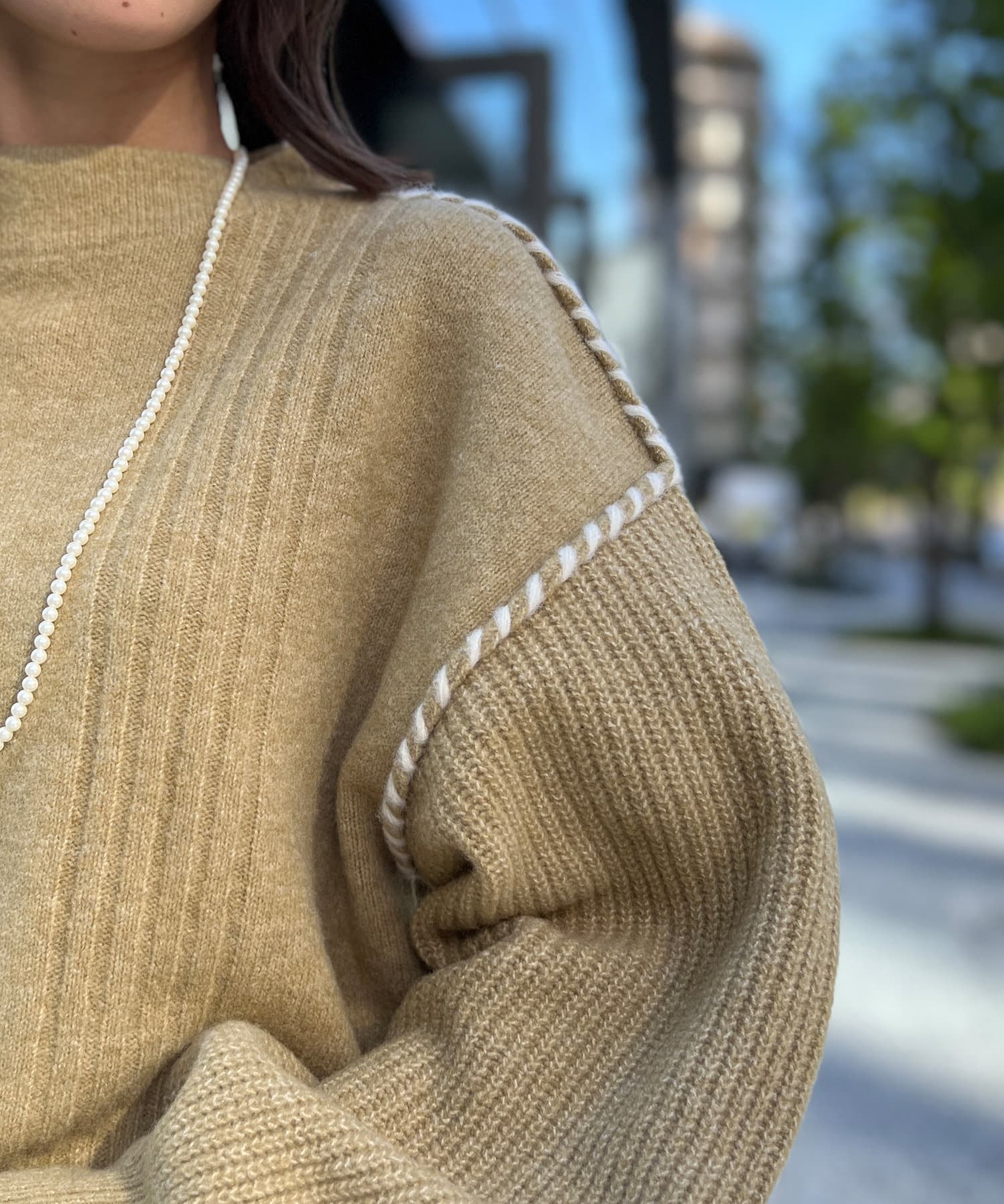 ・トレンドの配色ステッチが施されたざっくりシルエットのニット。