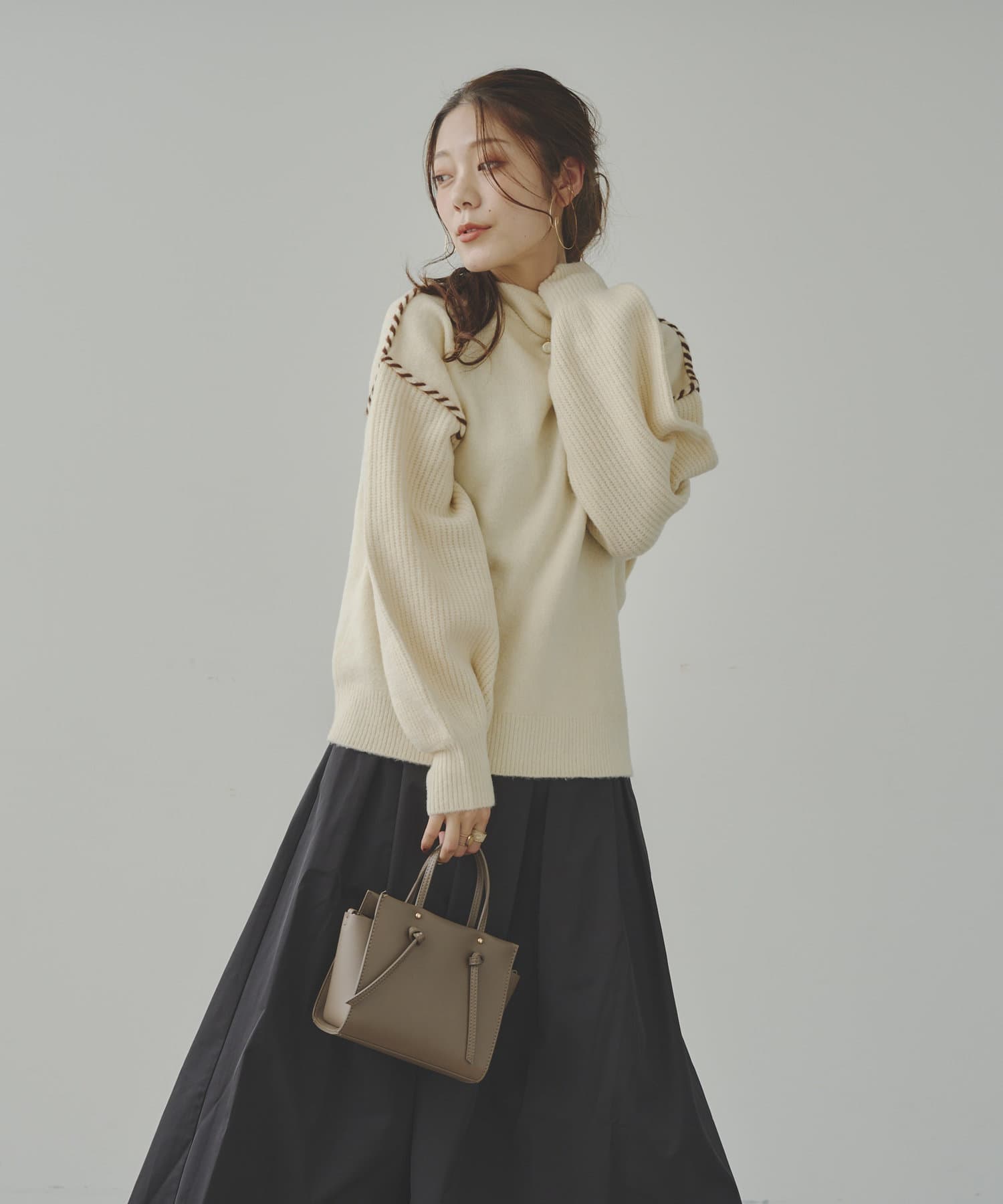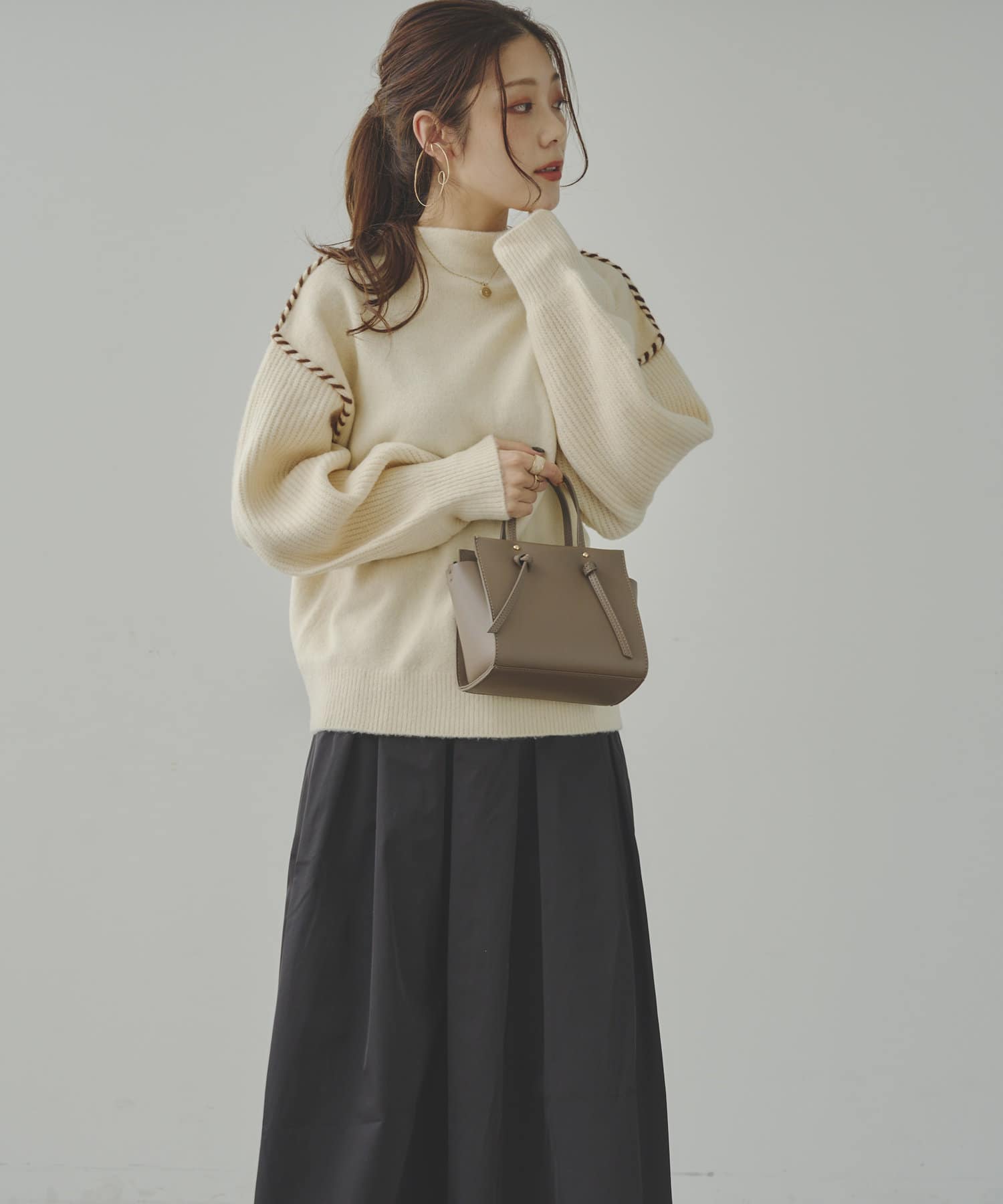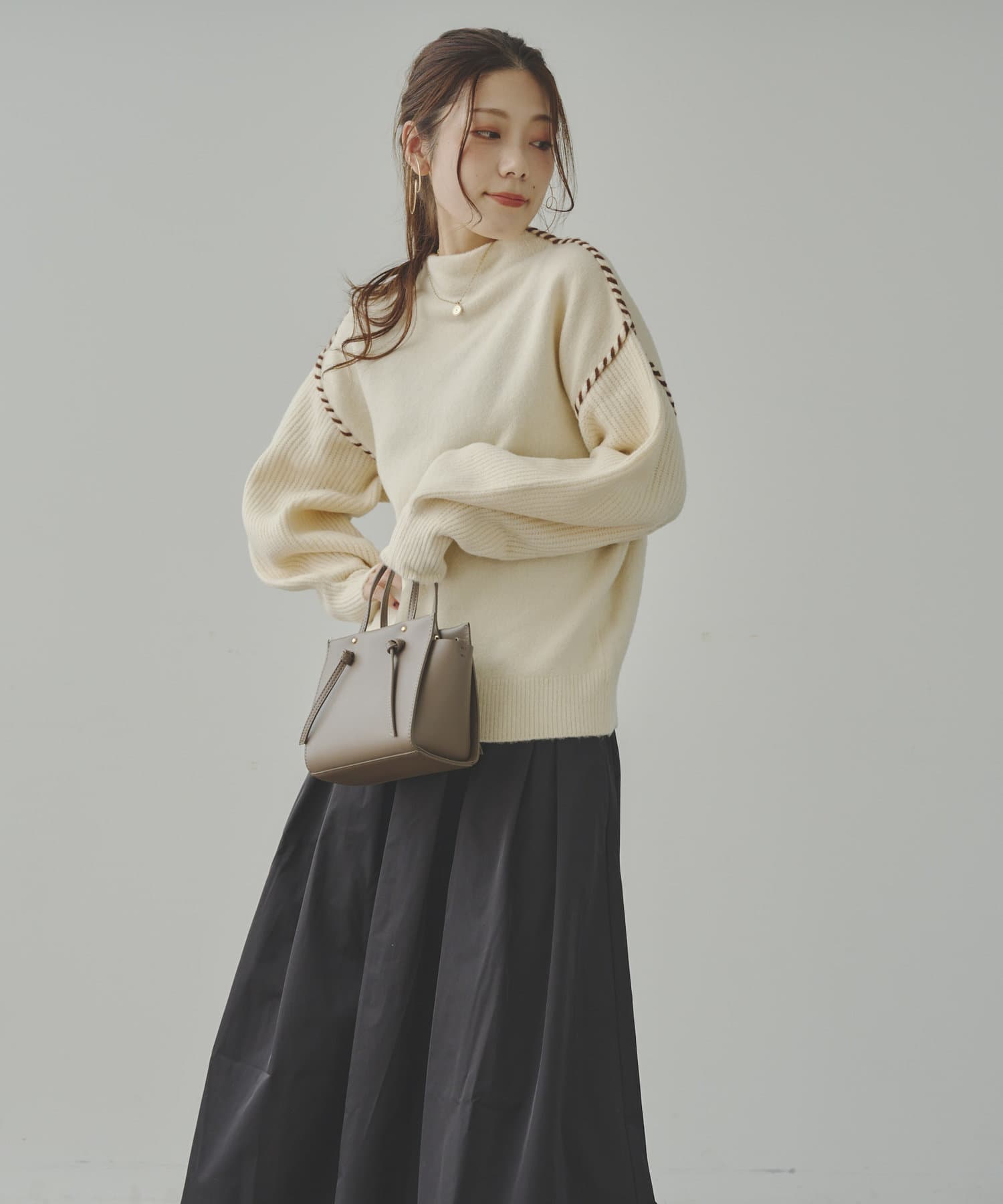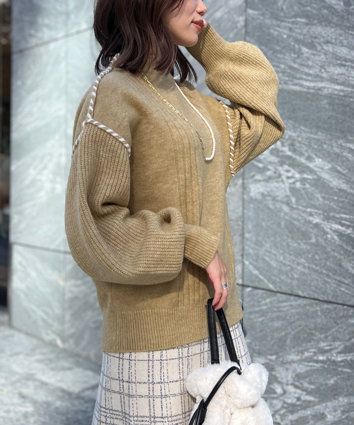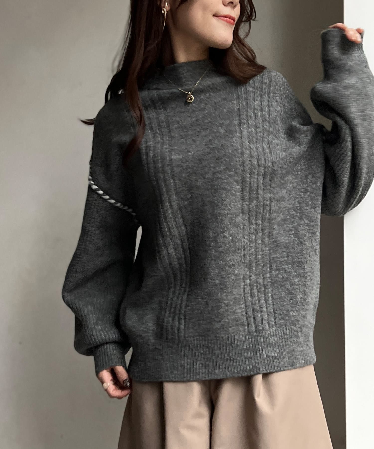 ・トレンドの配色ステッチが施されたざっくりシルエットのニット。