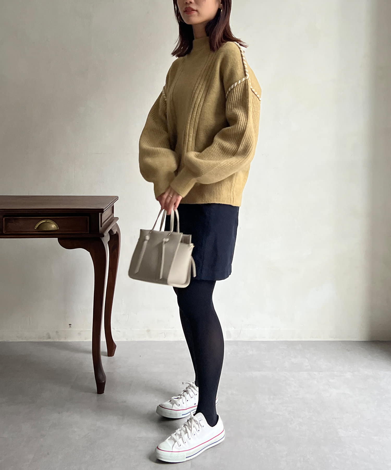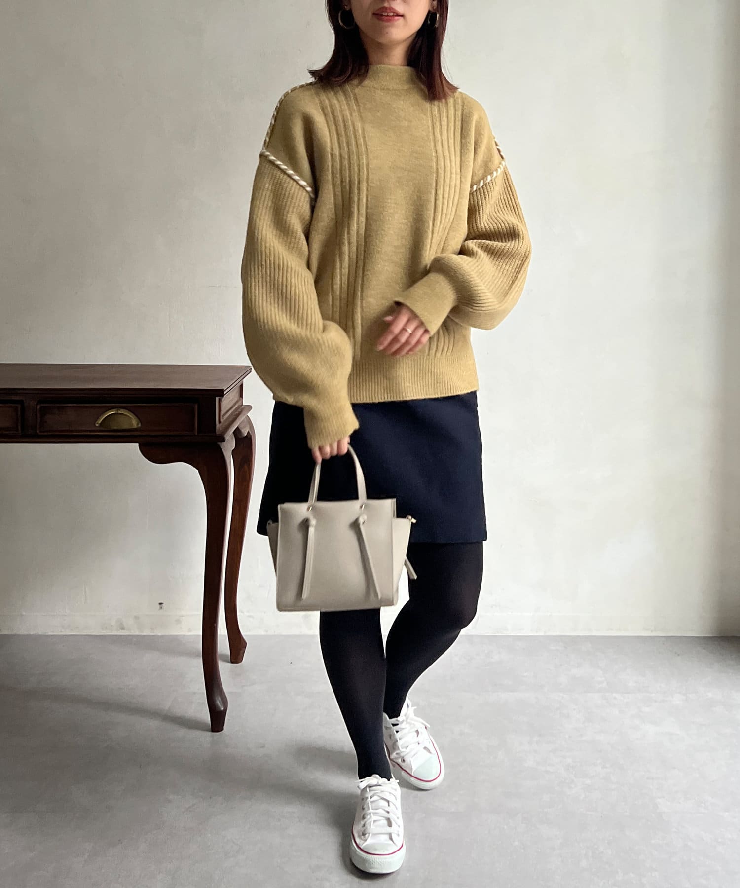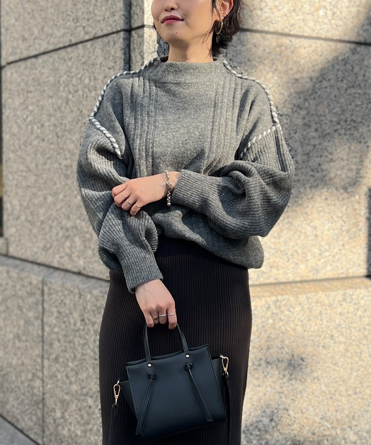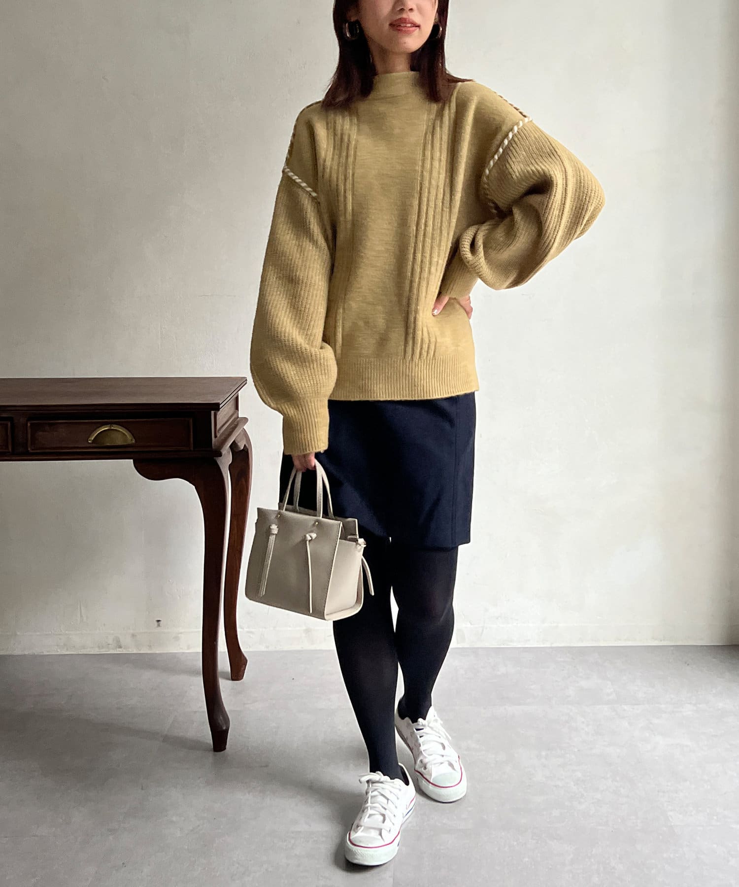 ・トレンドの配色ステッチが施されたざっくりシルエットのニット。