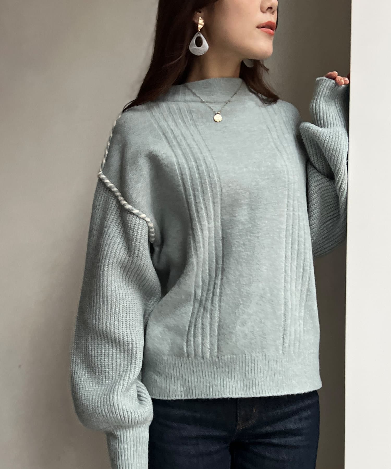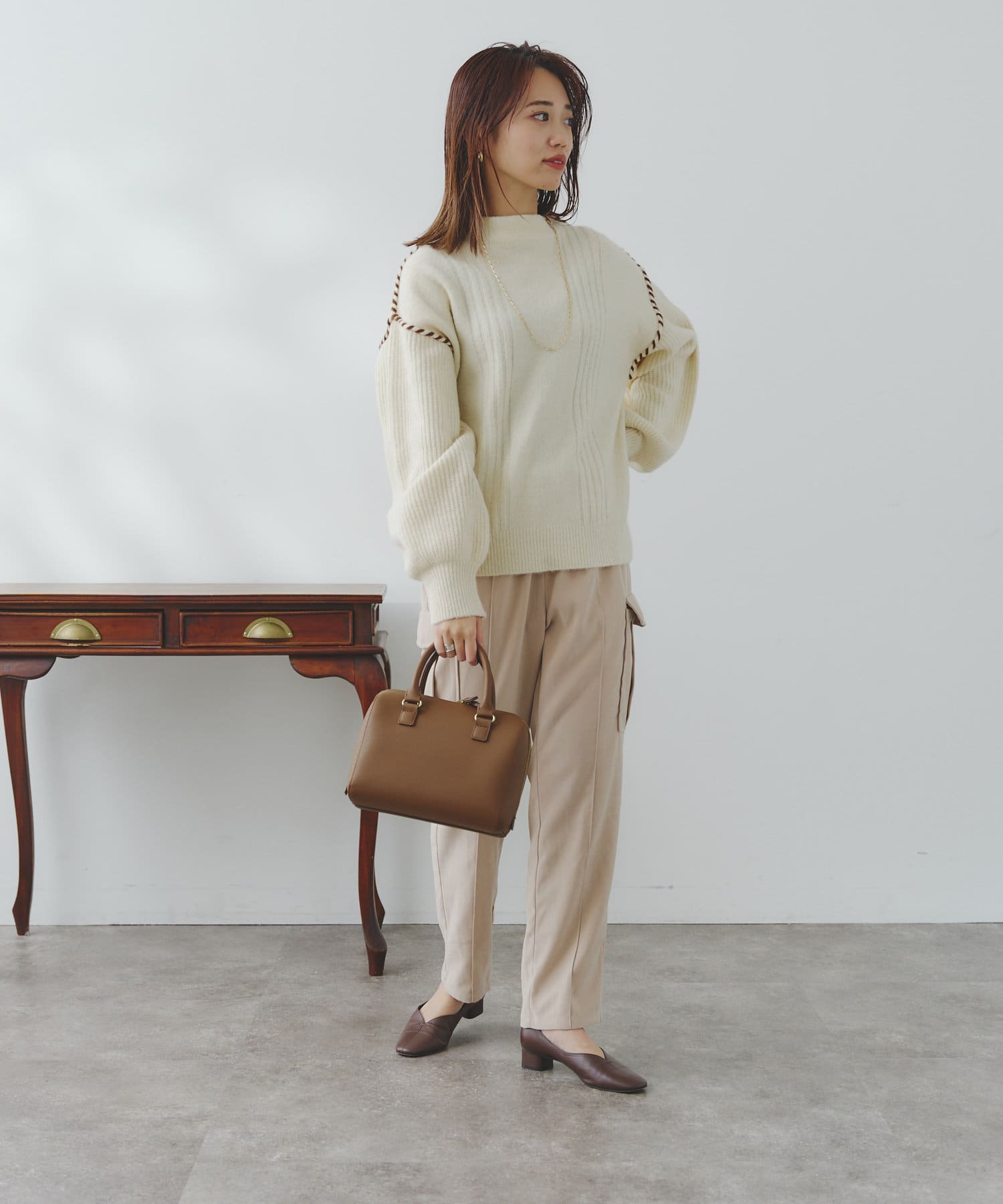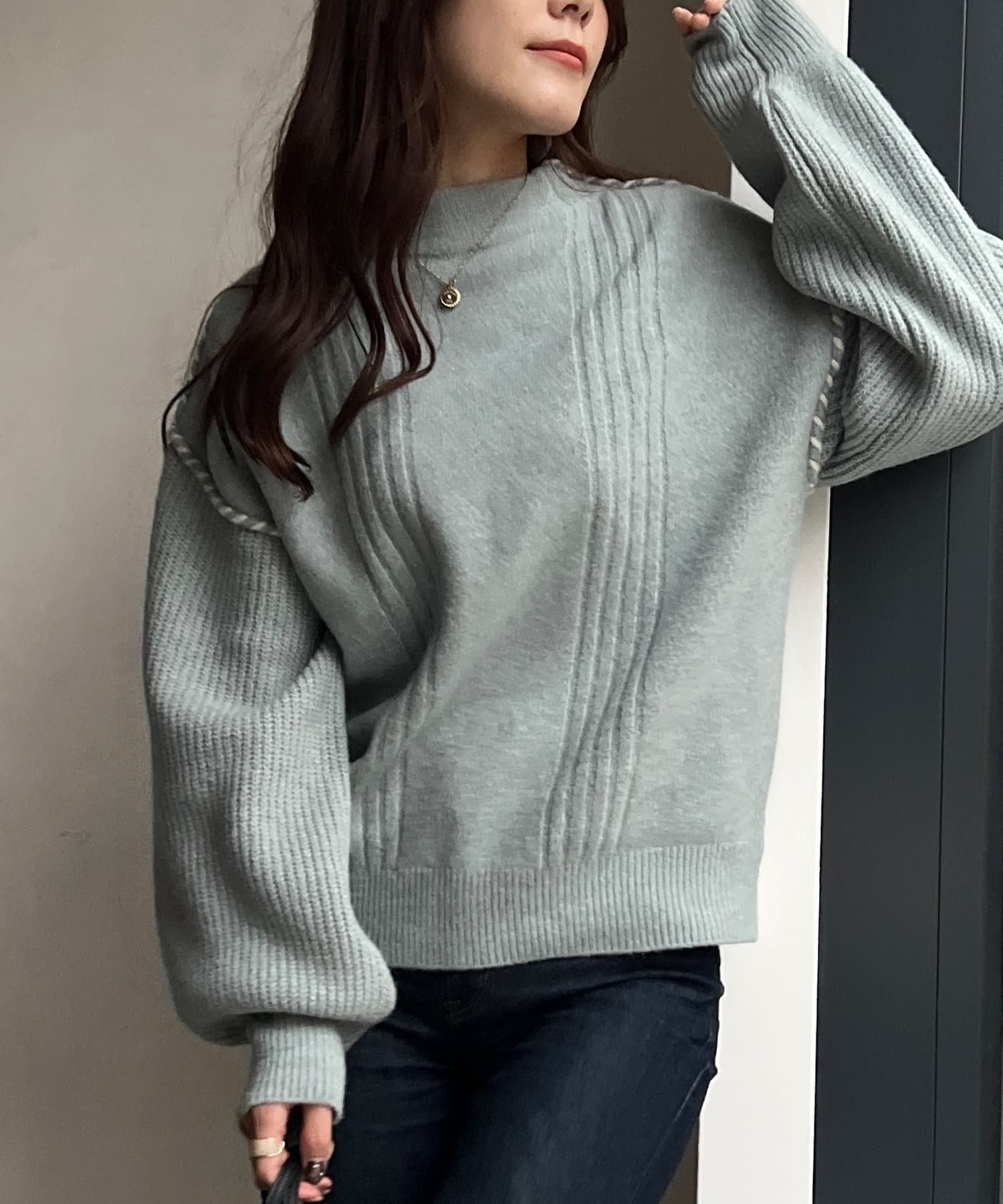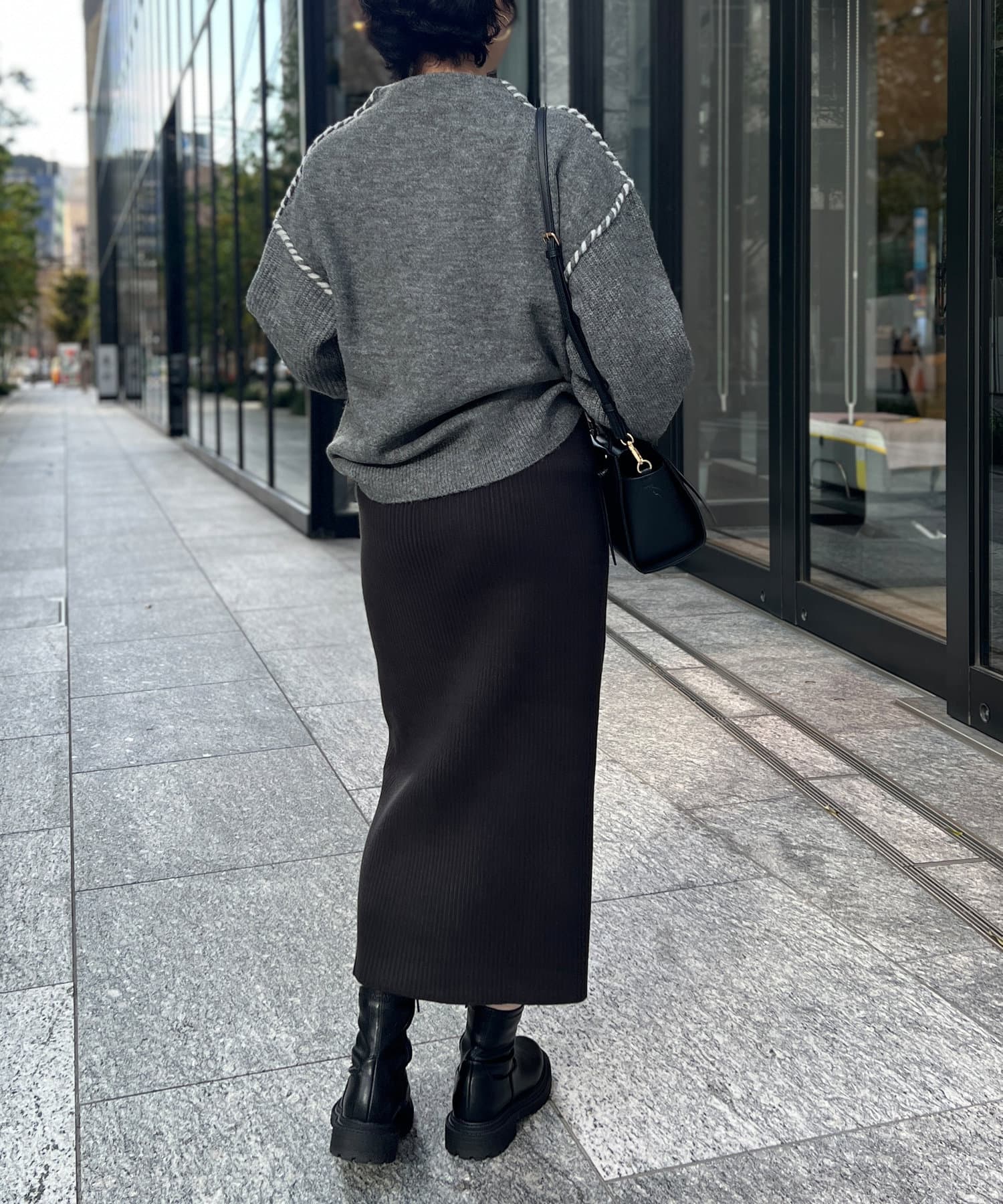 ・トレンドの配色ステッチが施されたざっくりシルエットのニット。
