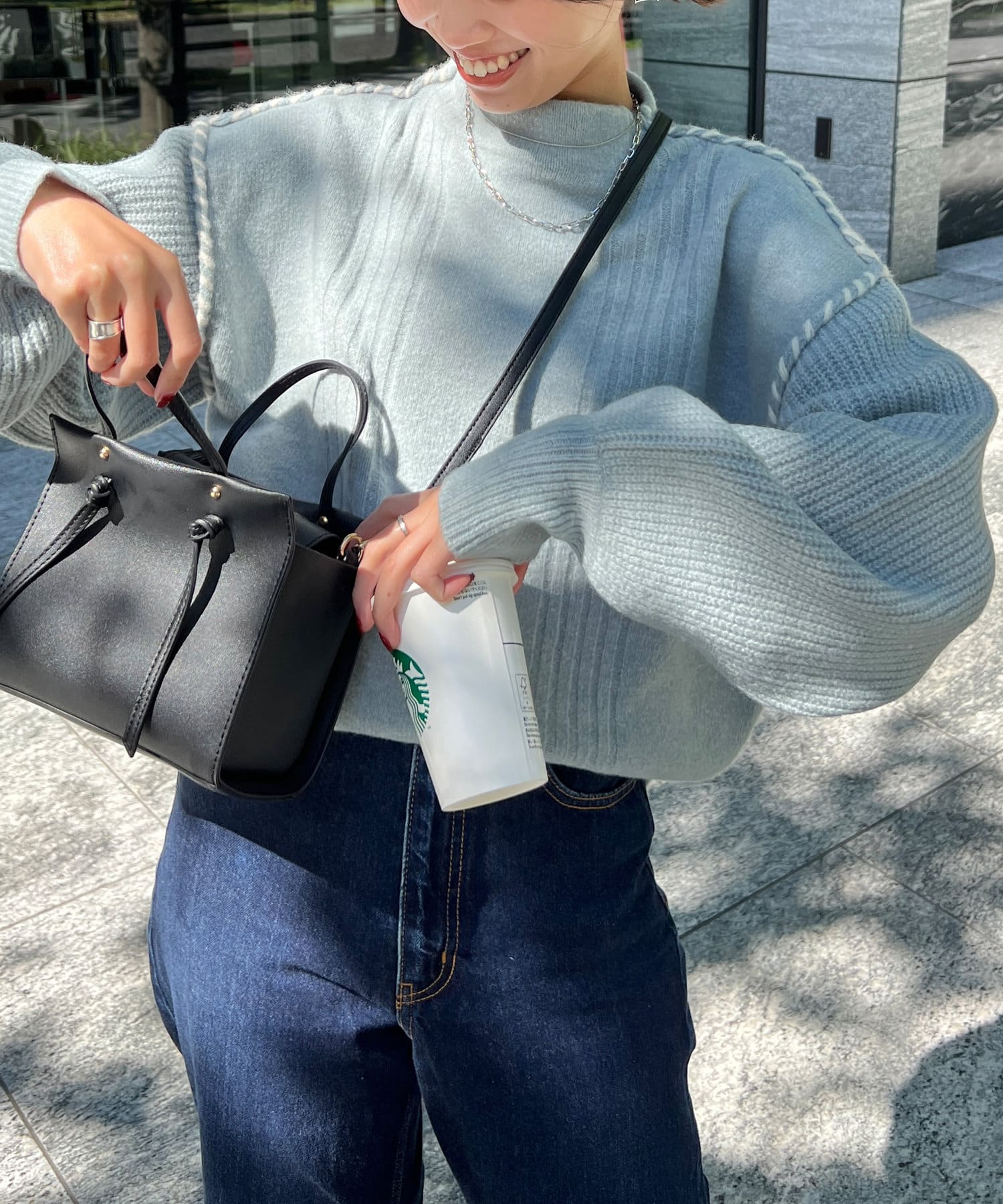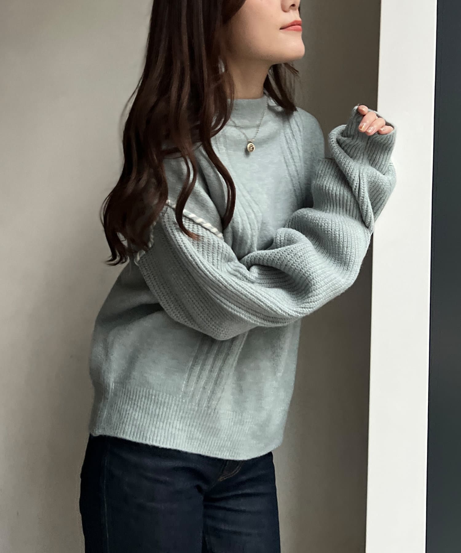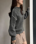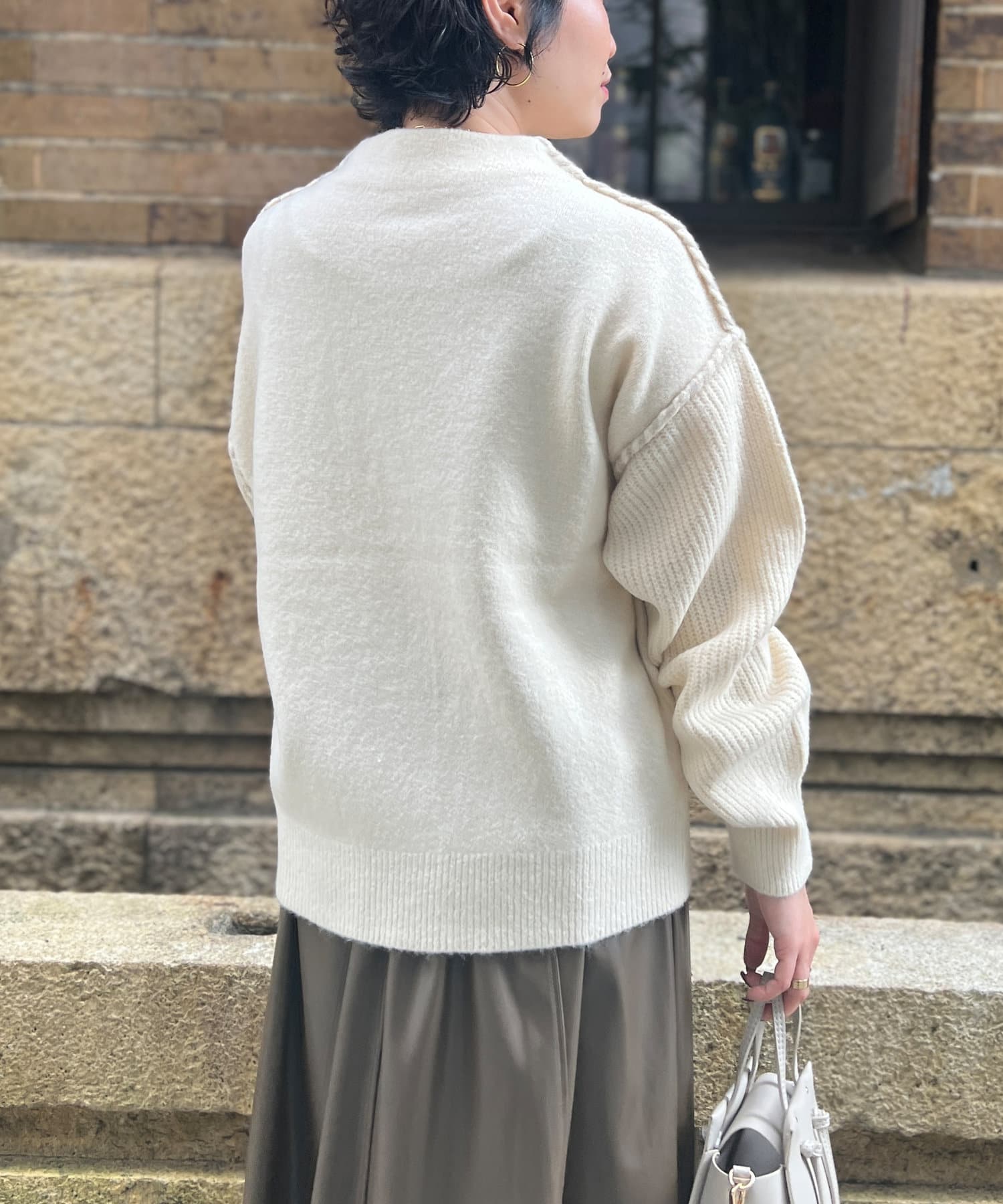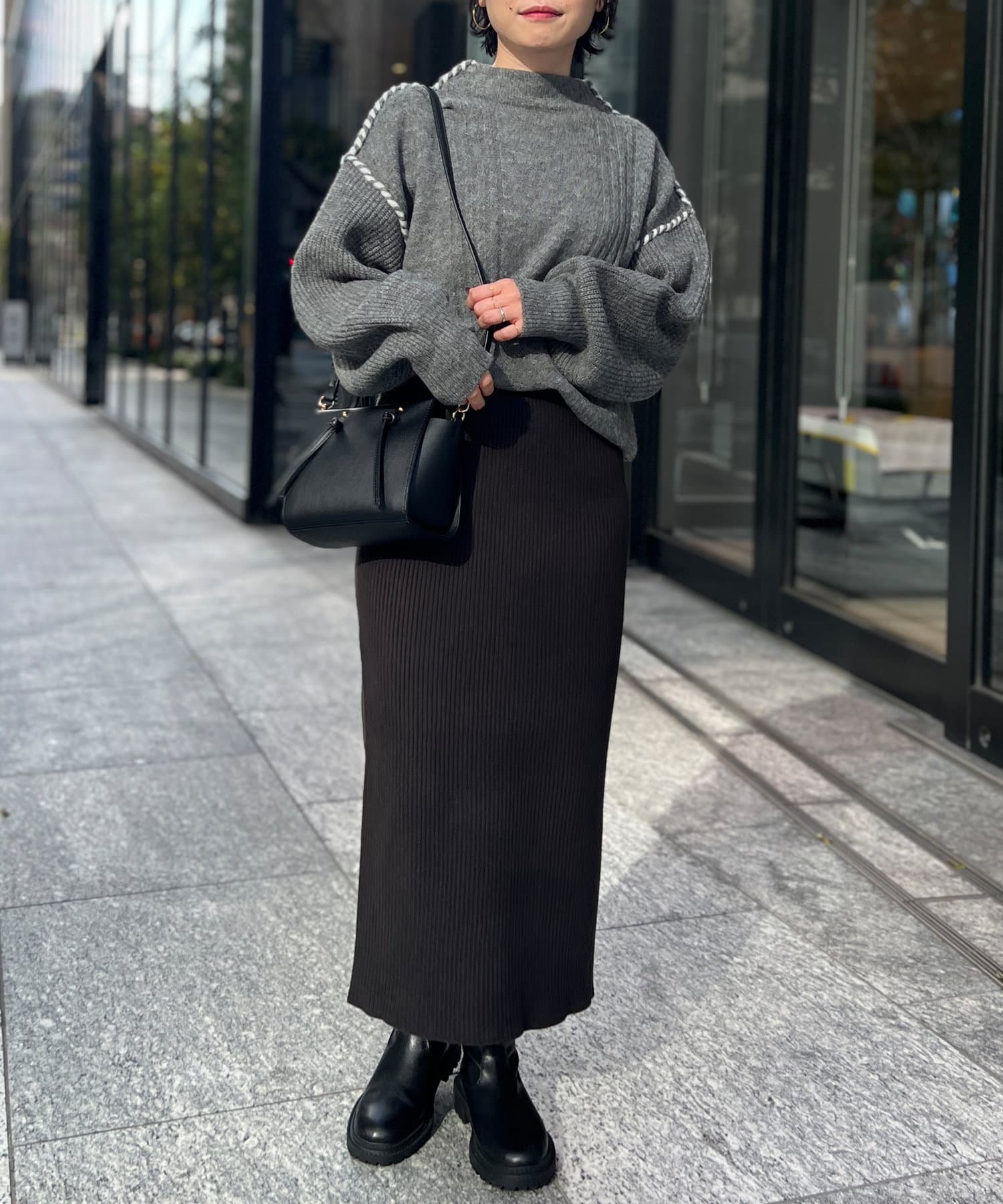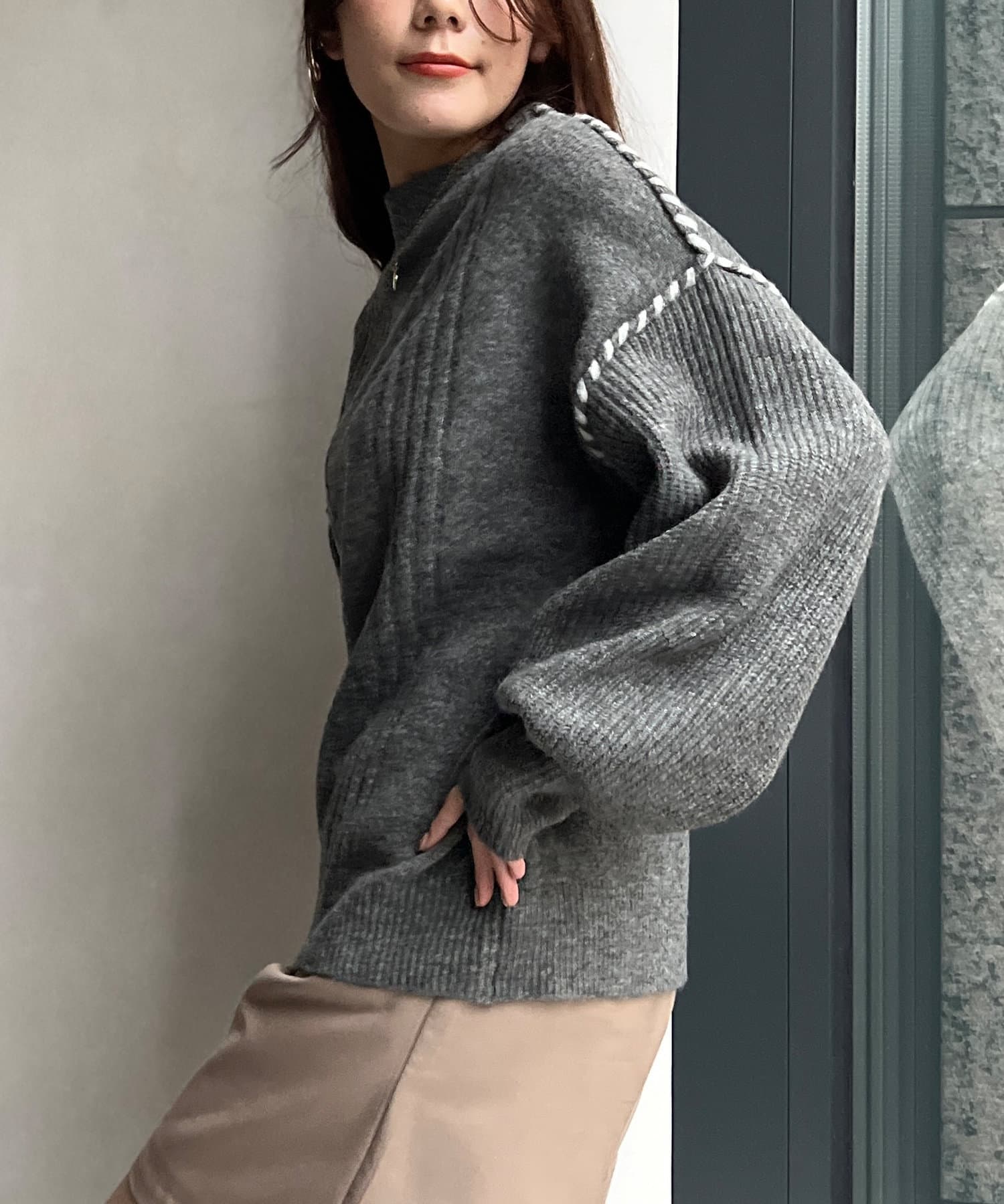 ・トレンドの配色ステッチが施されたざっくりシルエットのニット。
