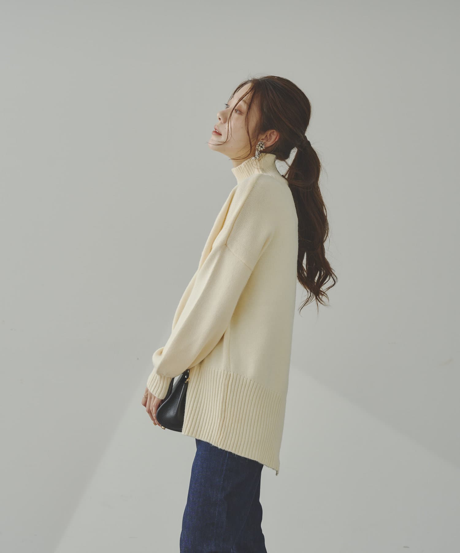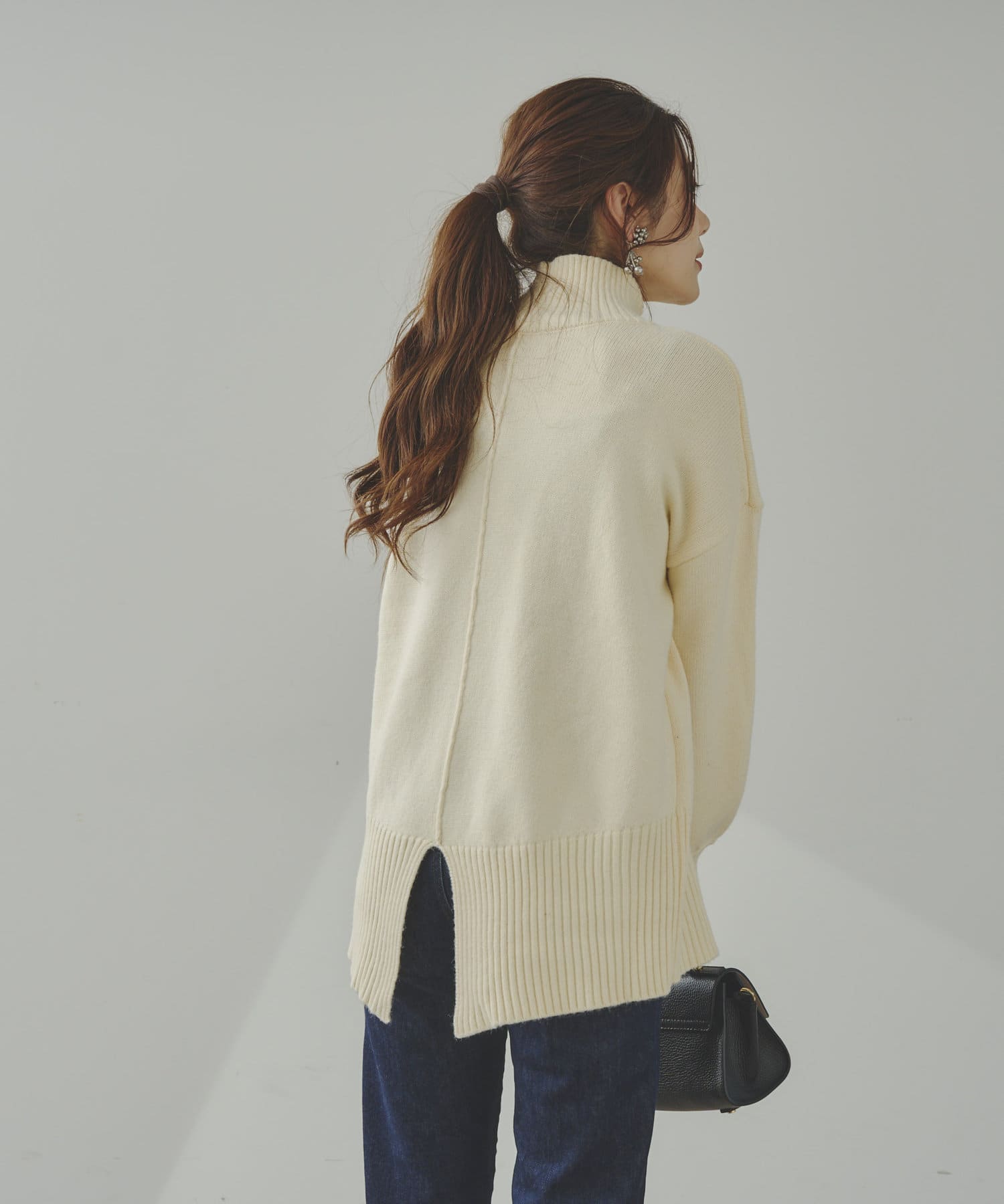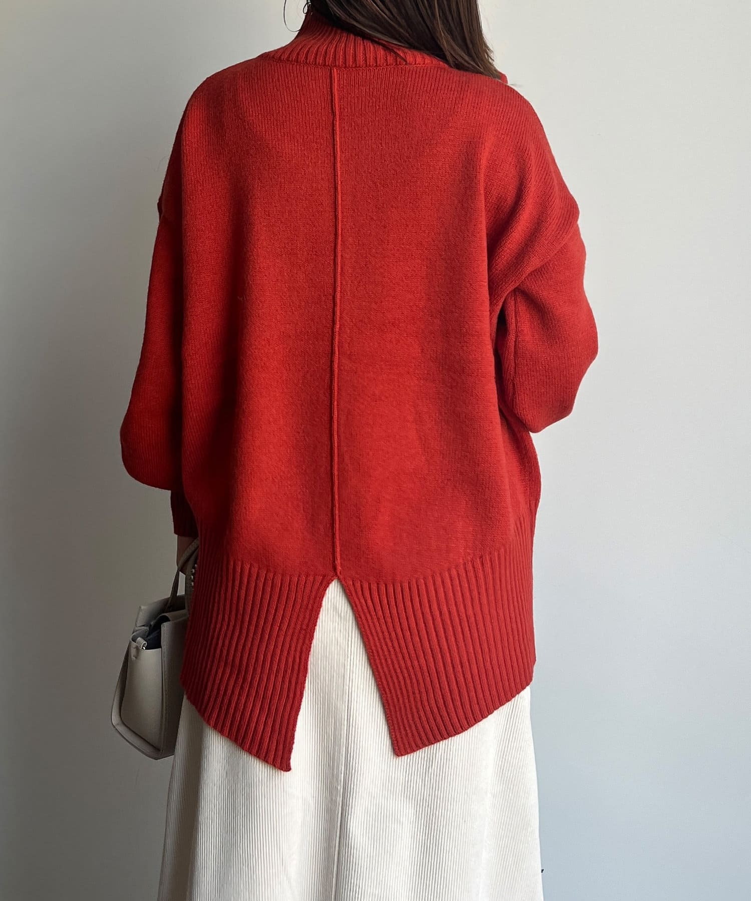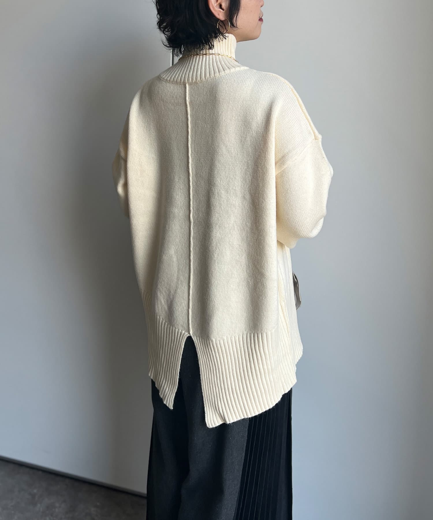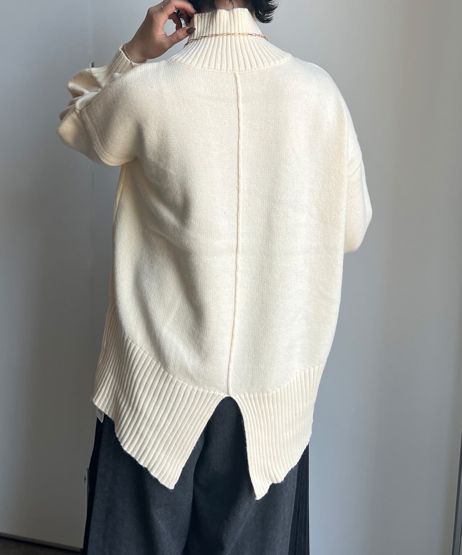 高さのあるタートルネックにバックスリットがざっくりと入ったカラーニットです。