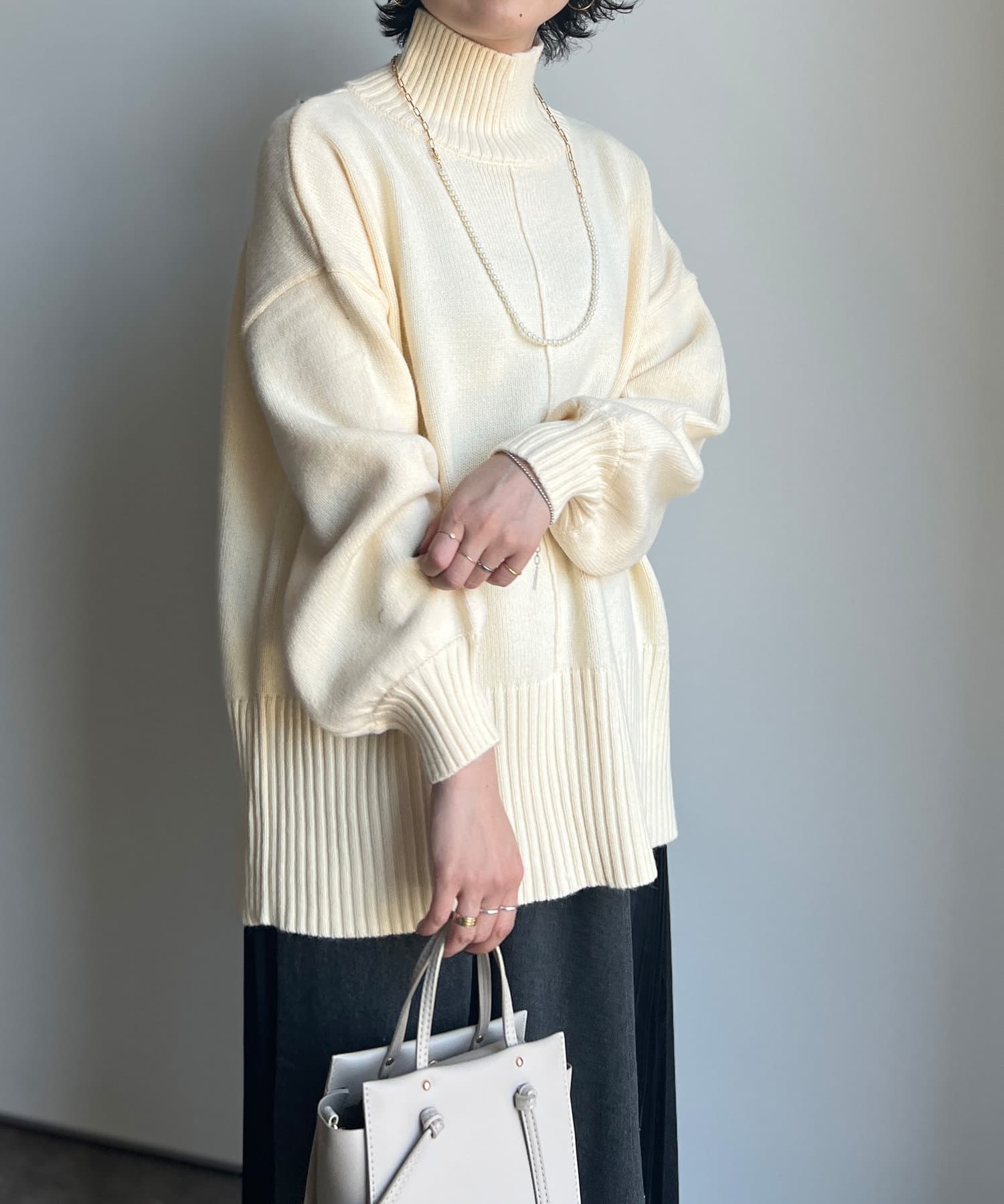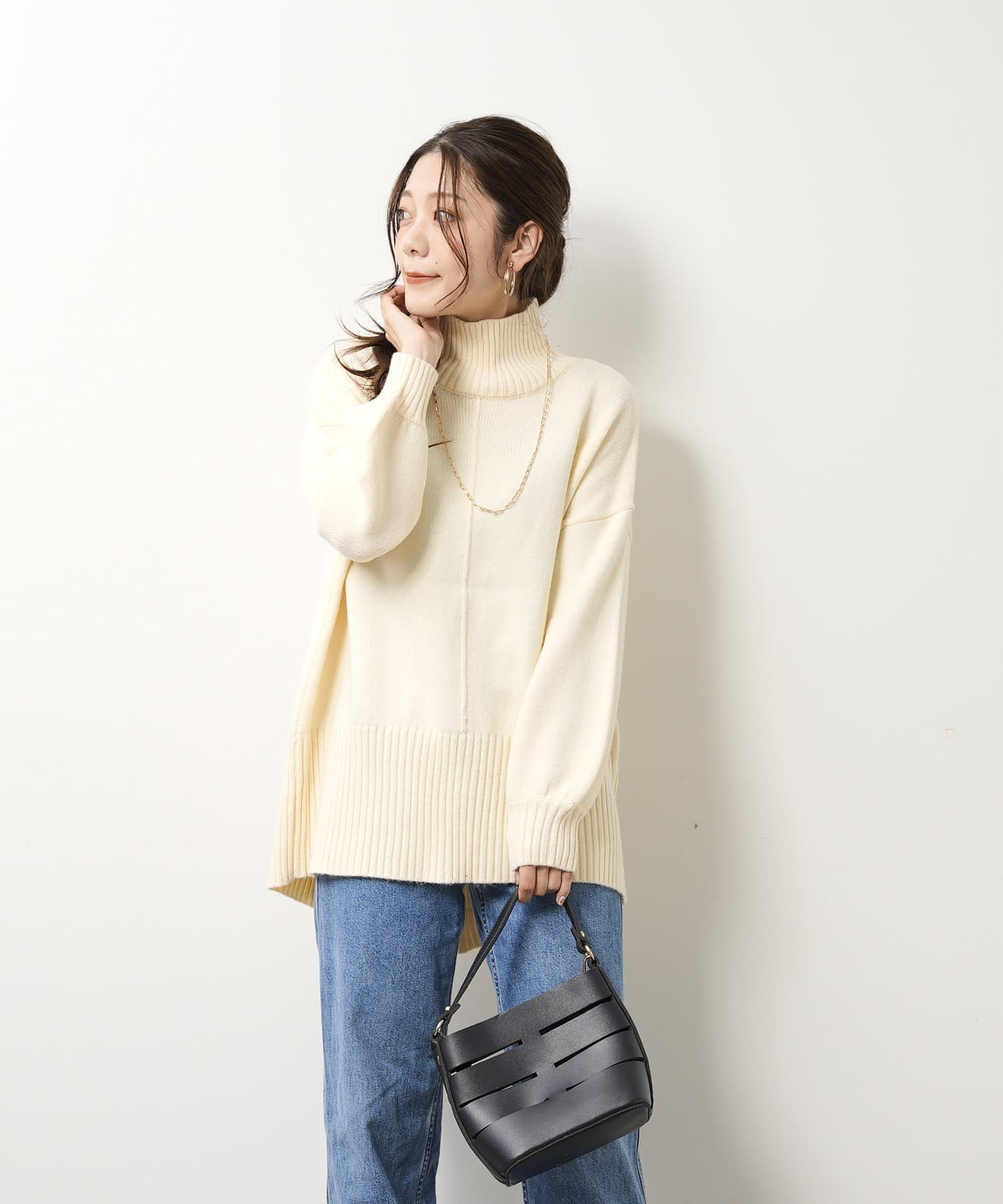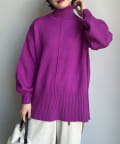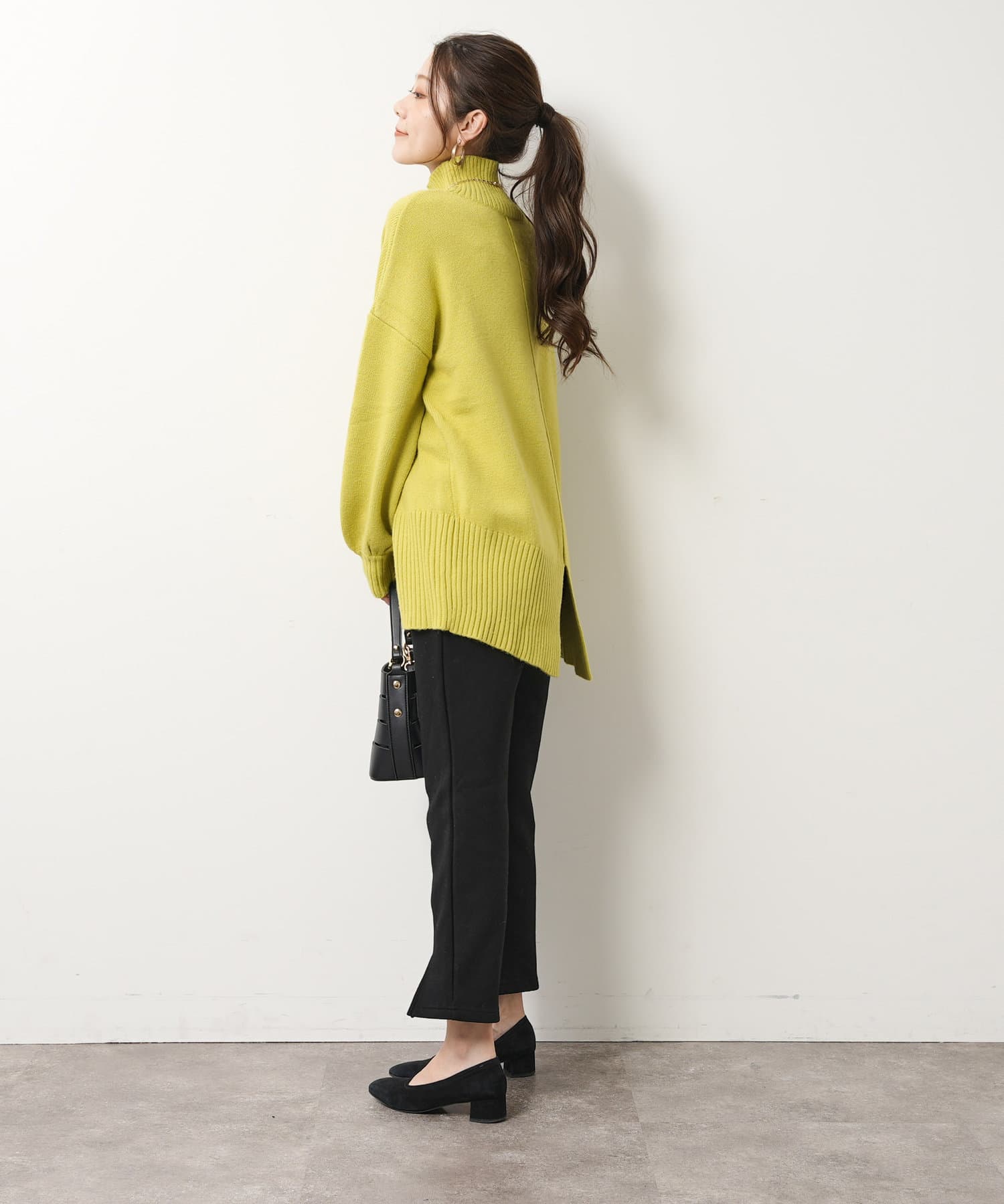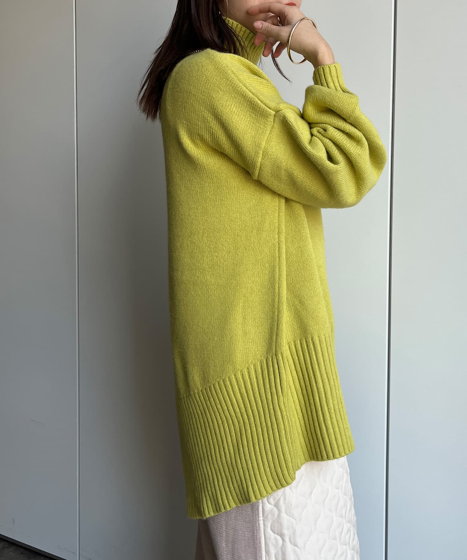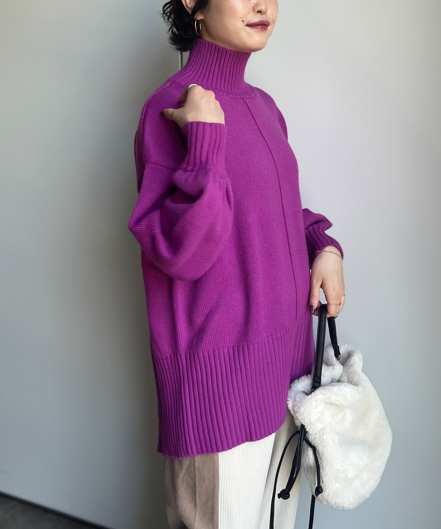 高さのあるタートルネックにバックスリットがざっくりと入ったカラーニットです。