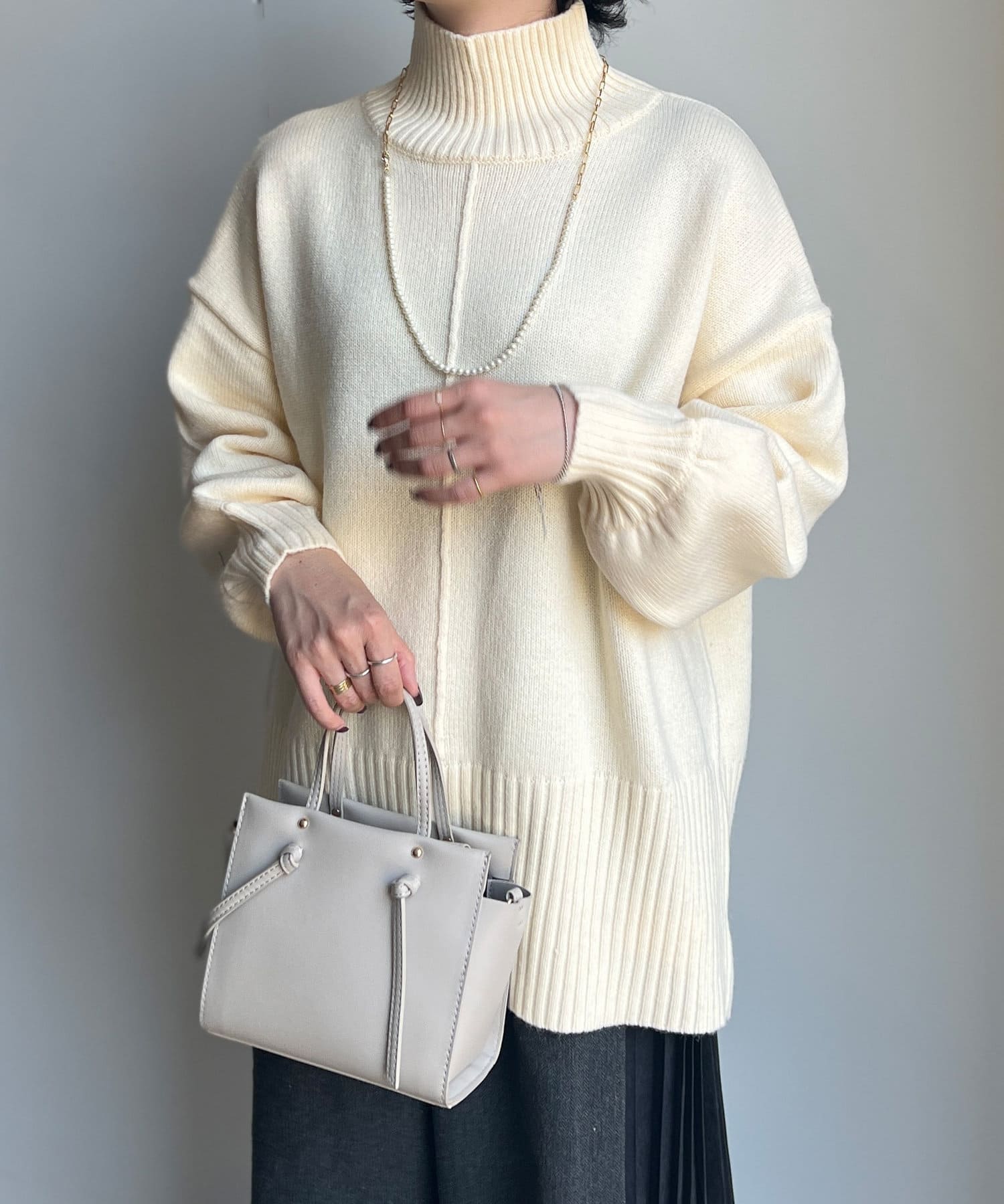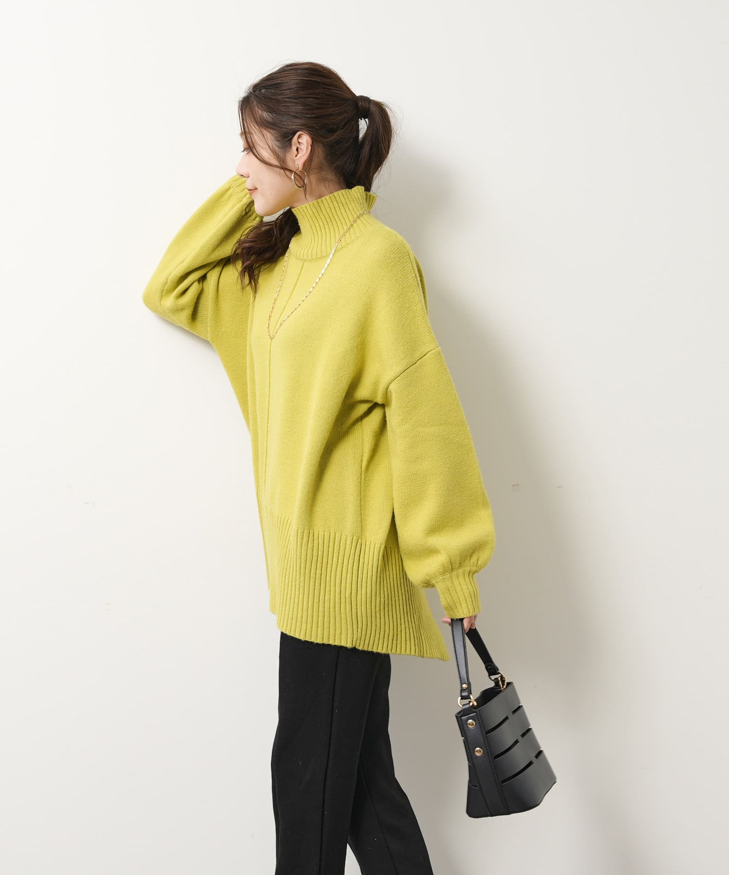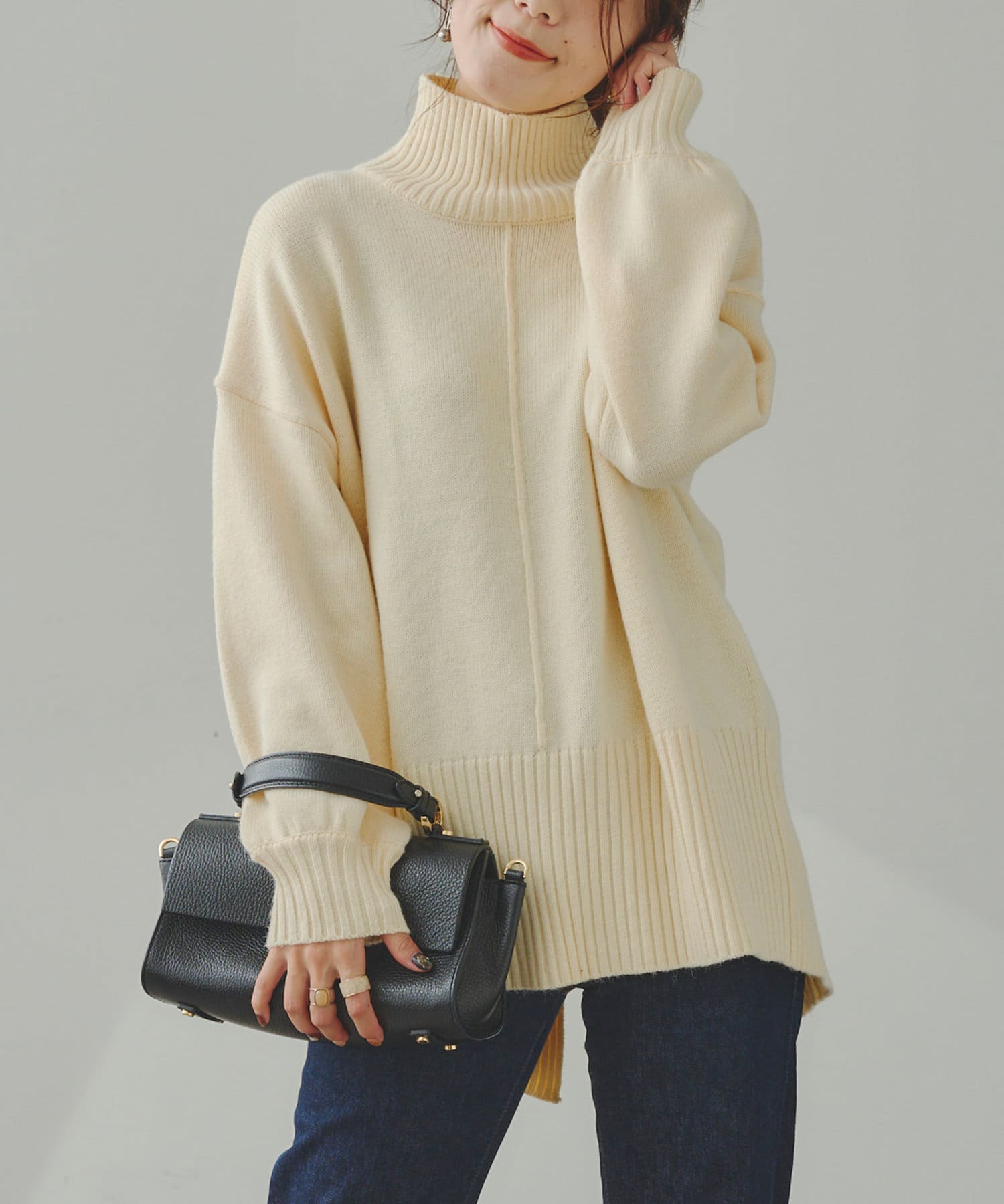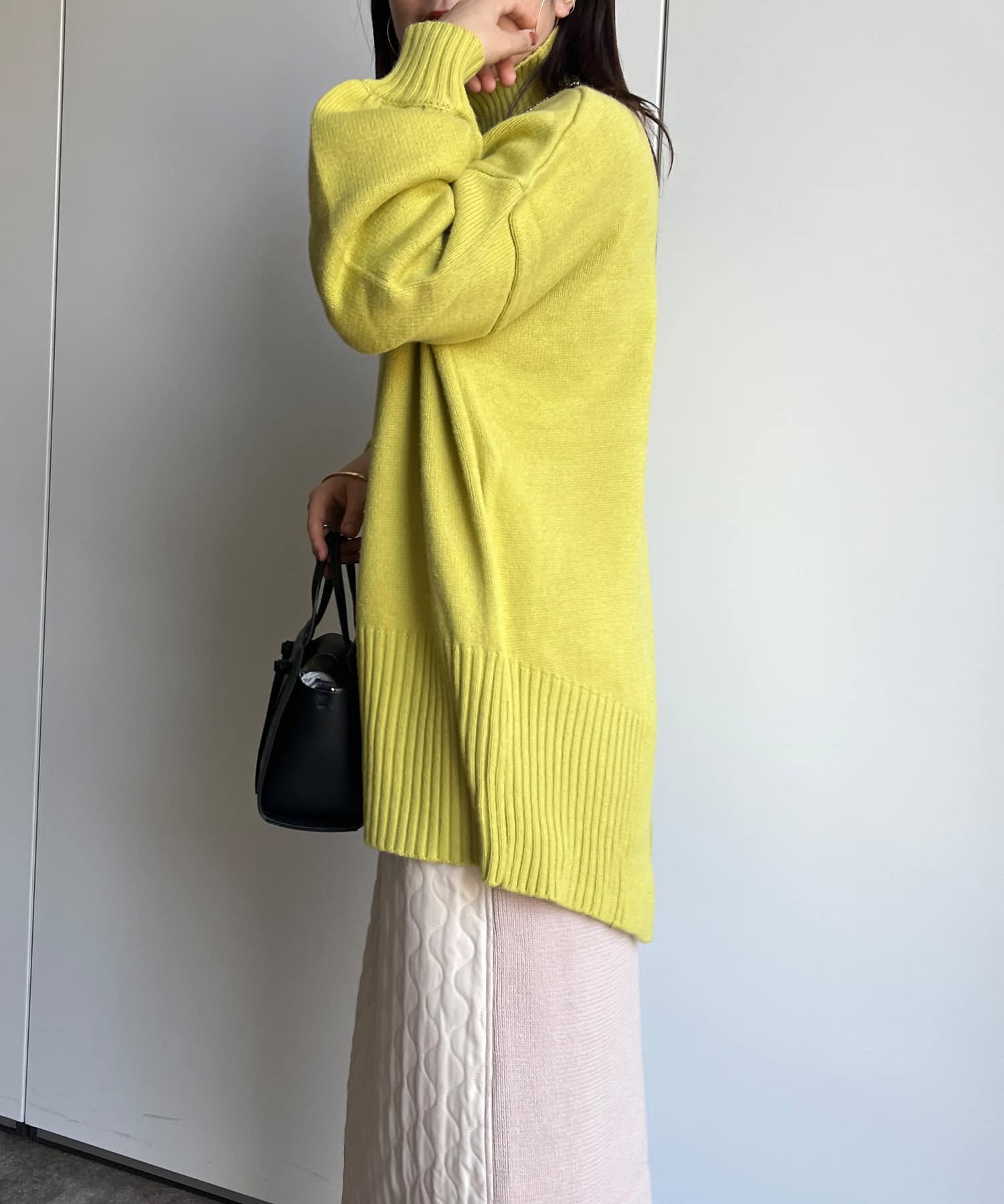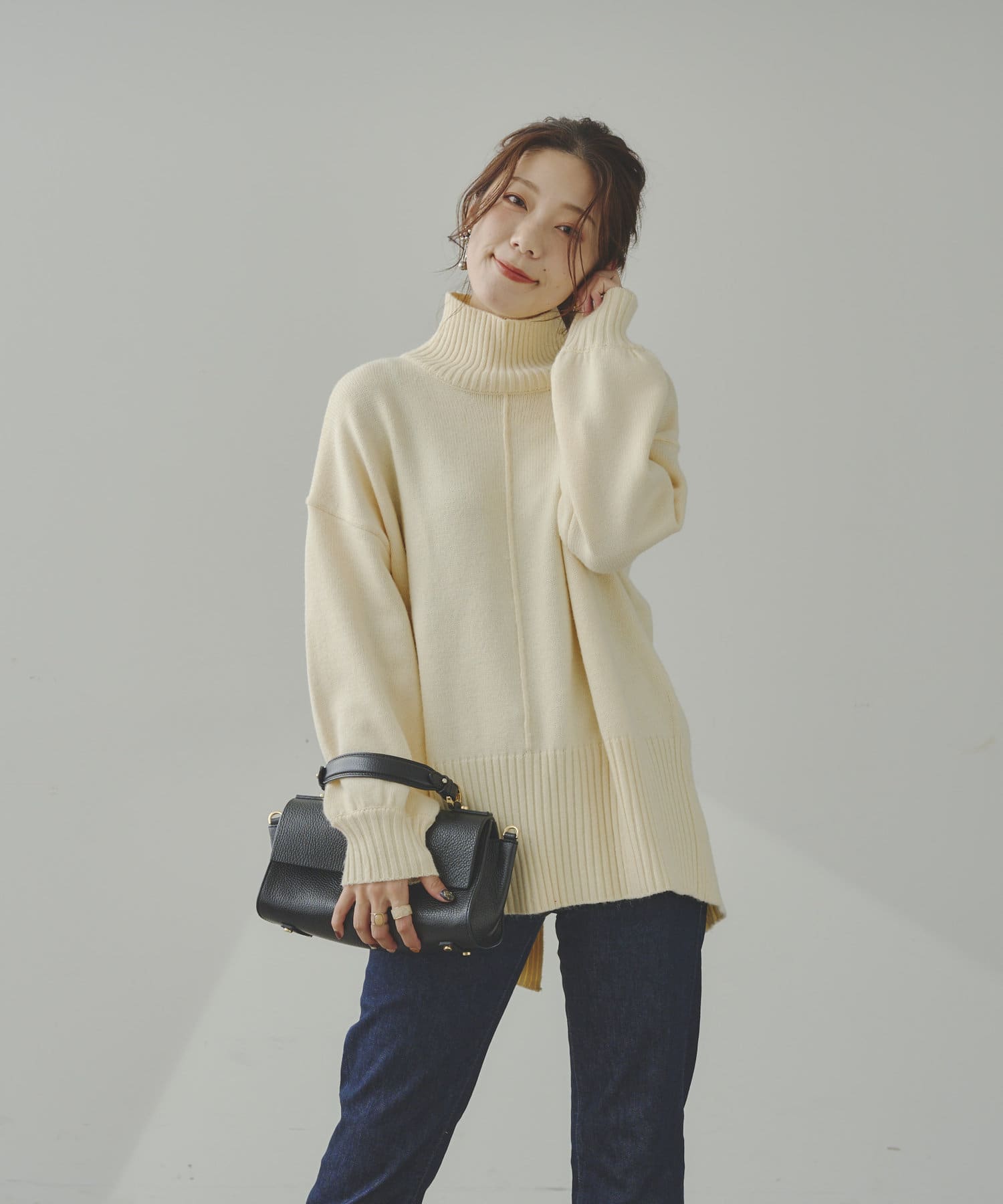 高さのあるタートルネックにバックスリットがざっくりと入ったカラーニットです。