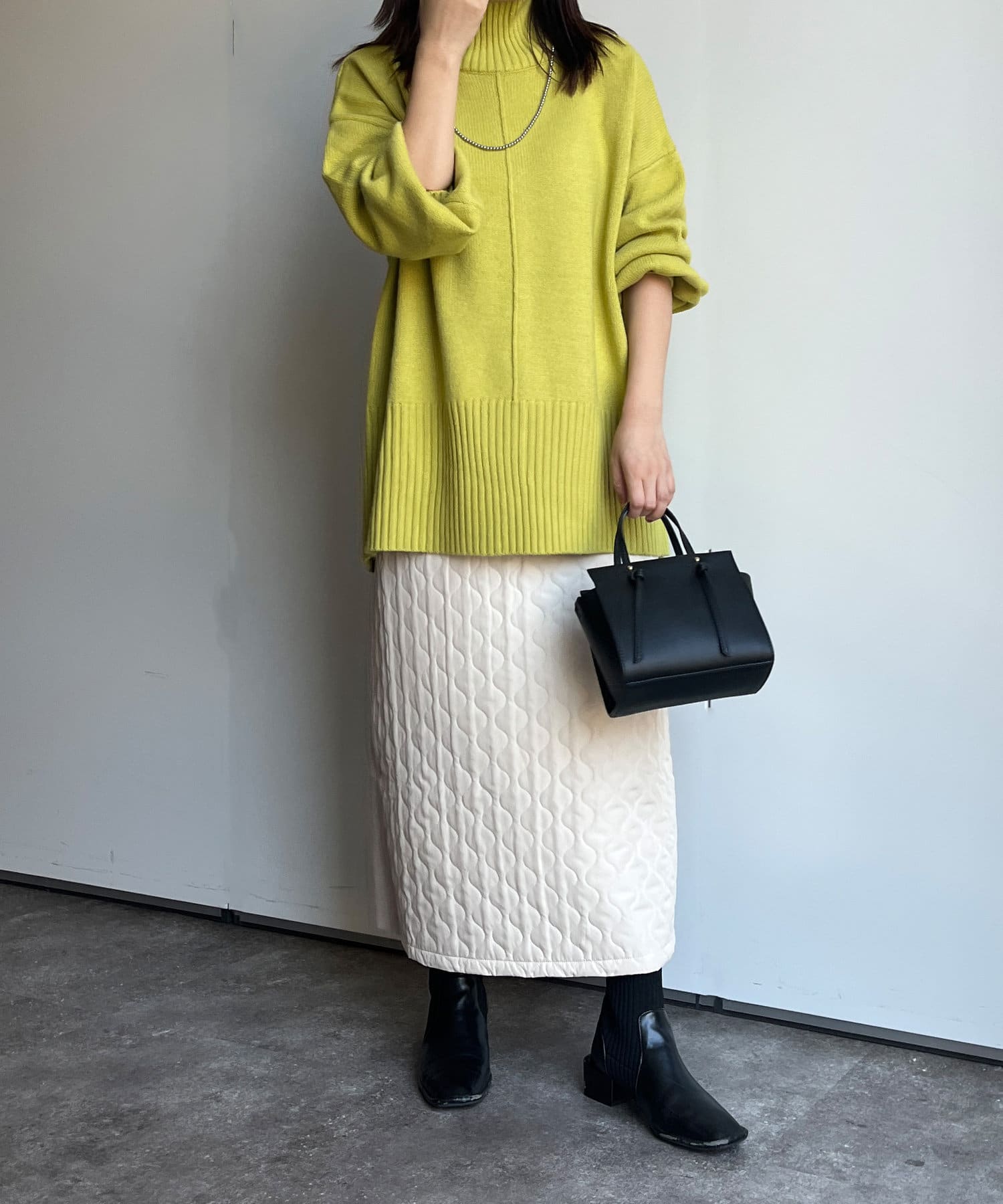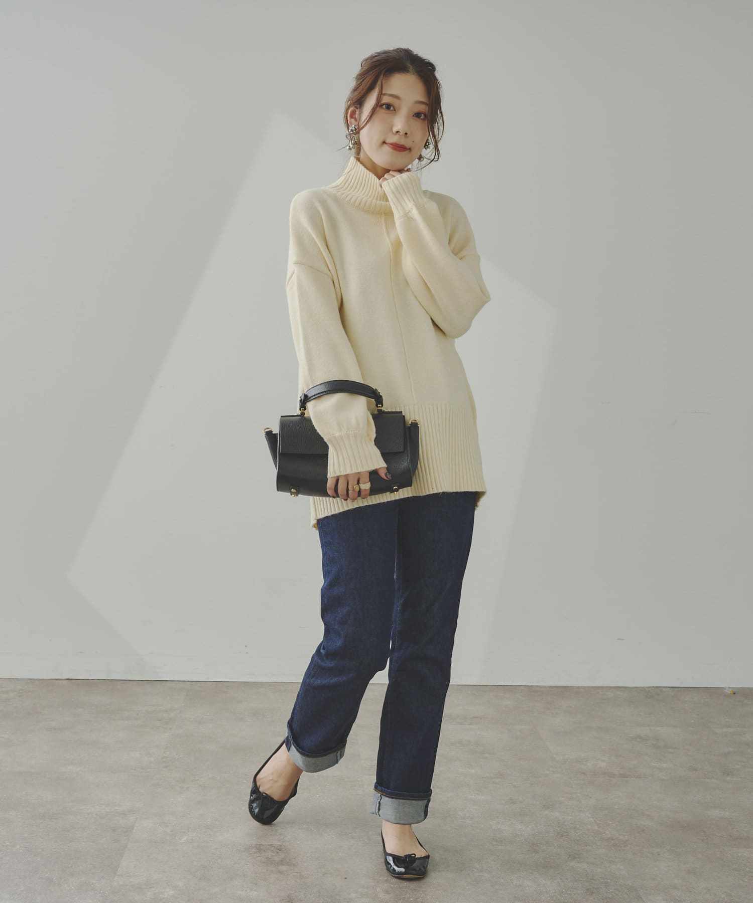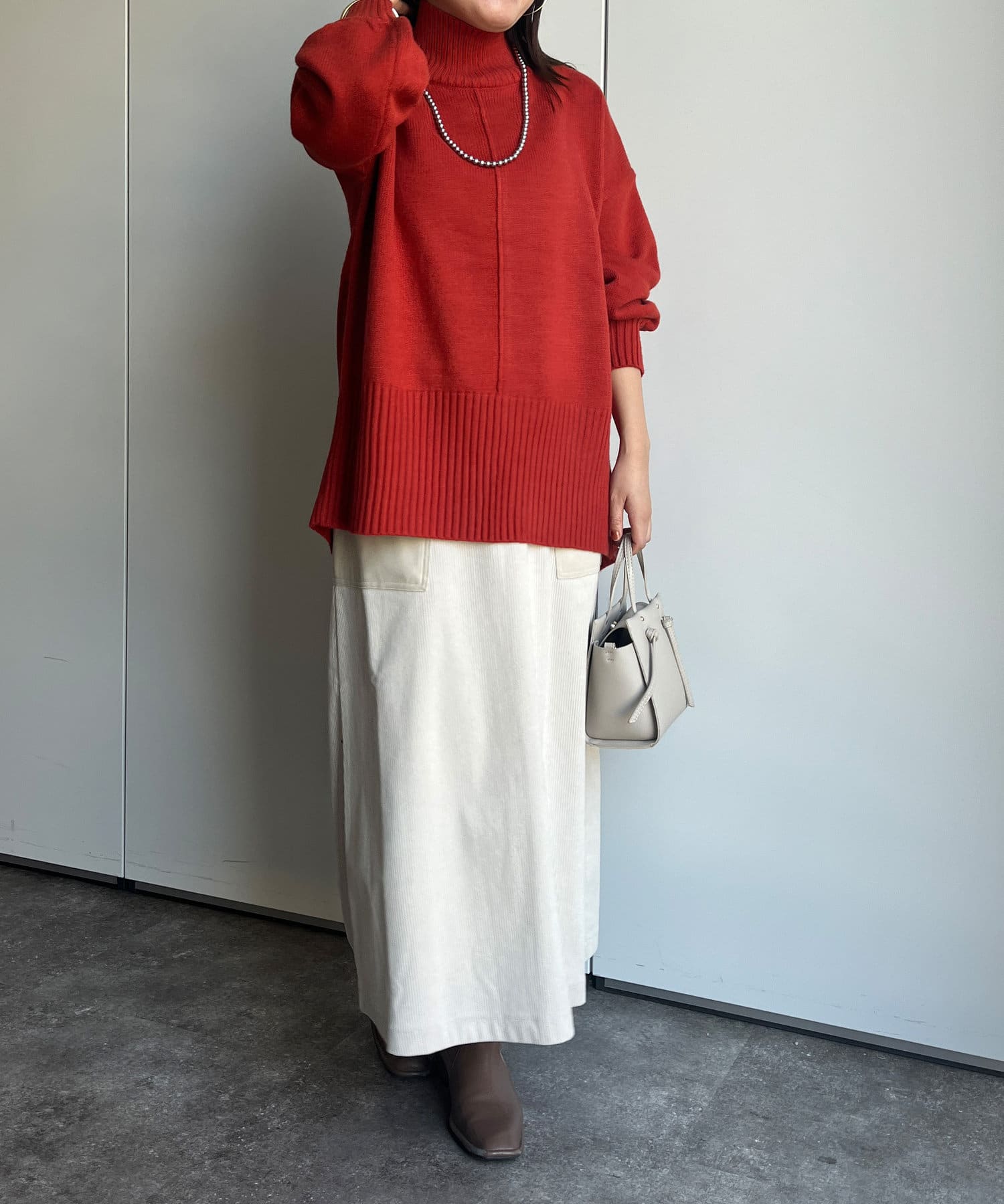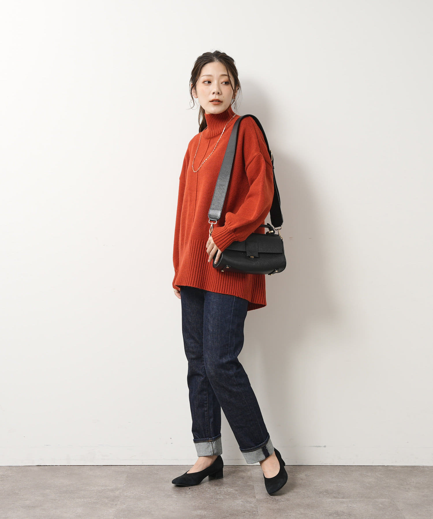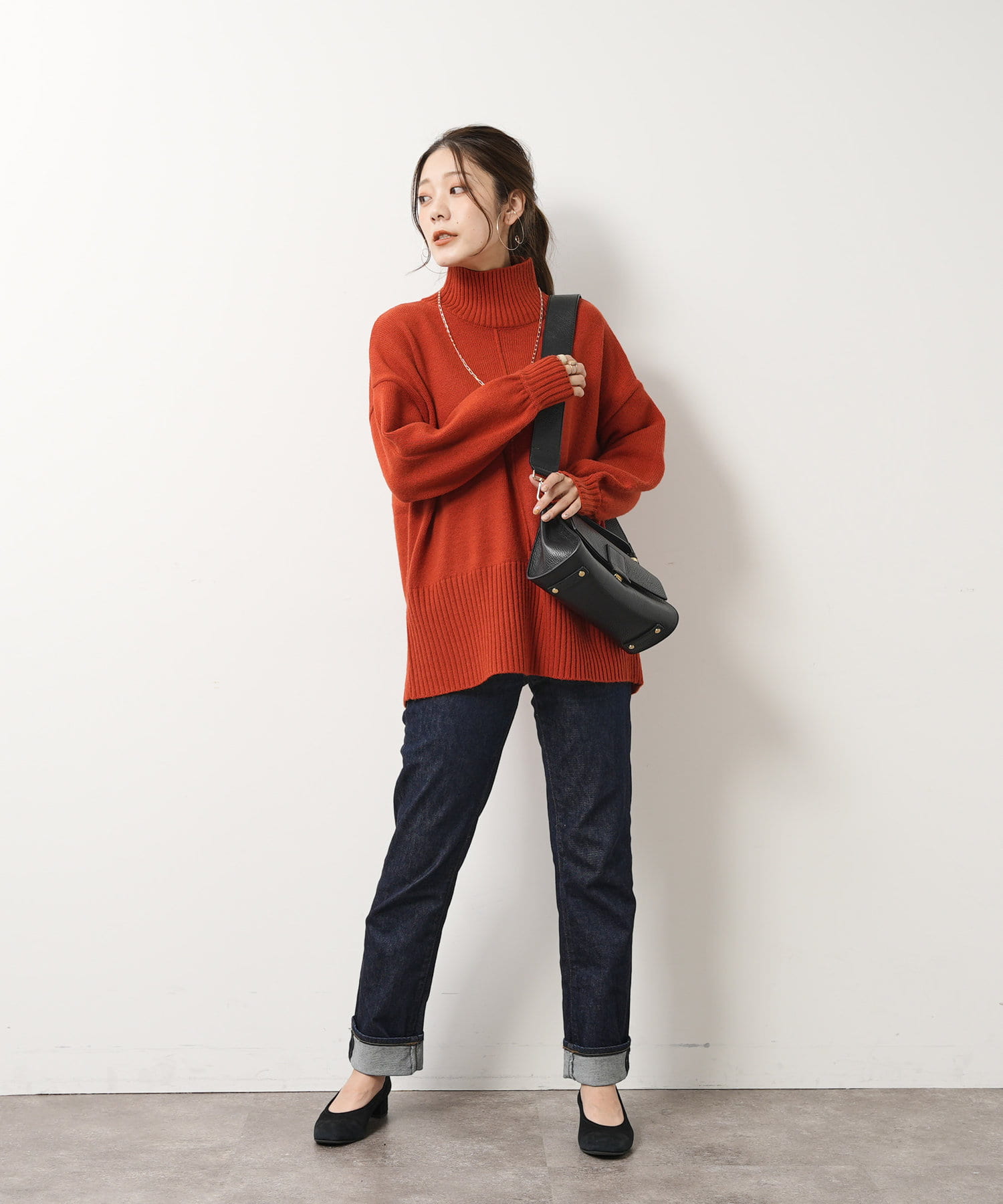 高さのあるタートルネックにバックスリットがざっくりと入ったカラーニットです。
