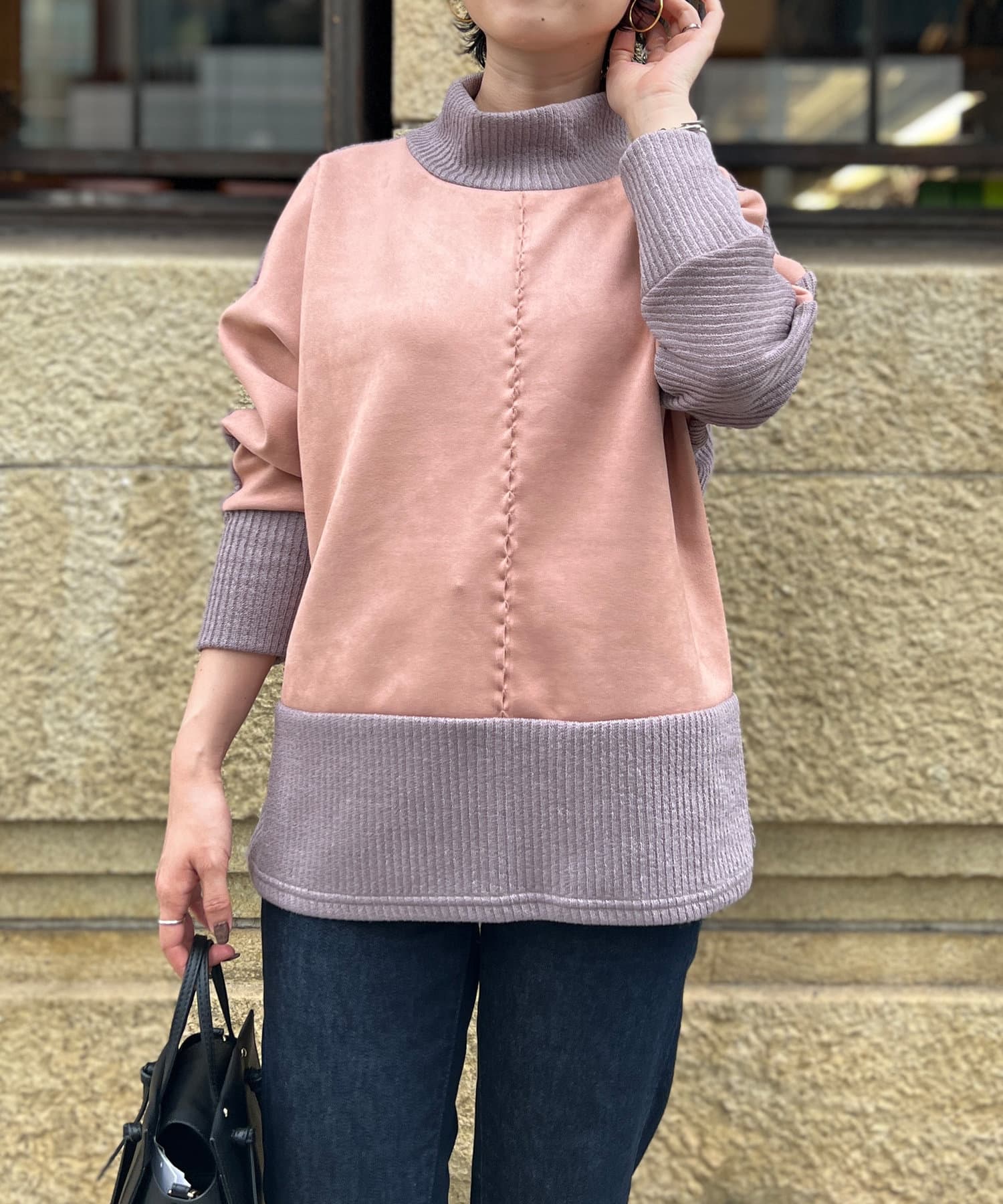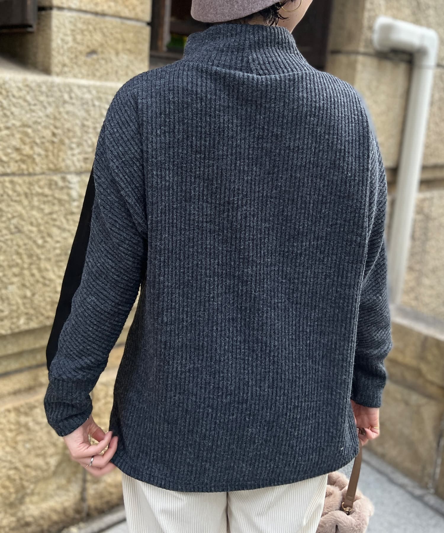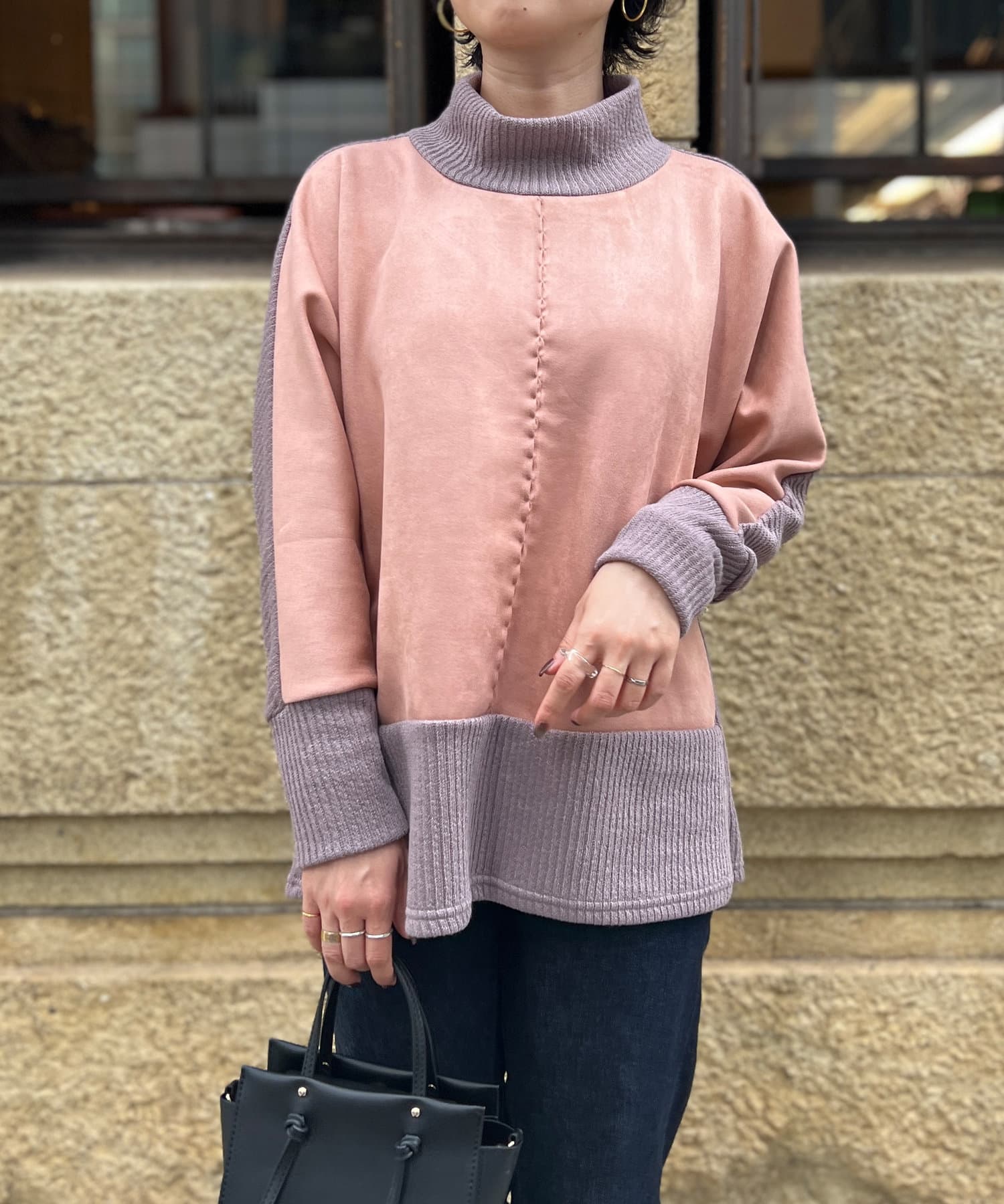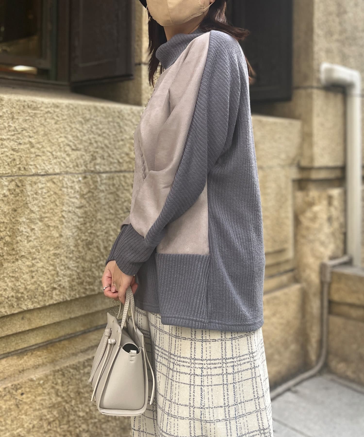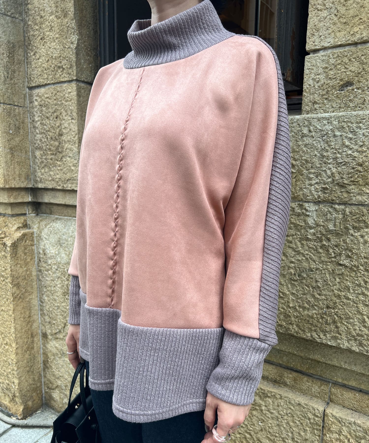 スエード×リブ切替タートルネックプルオーバー