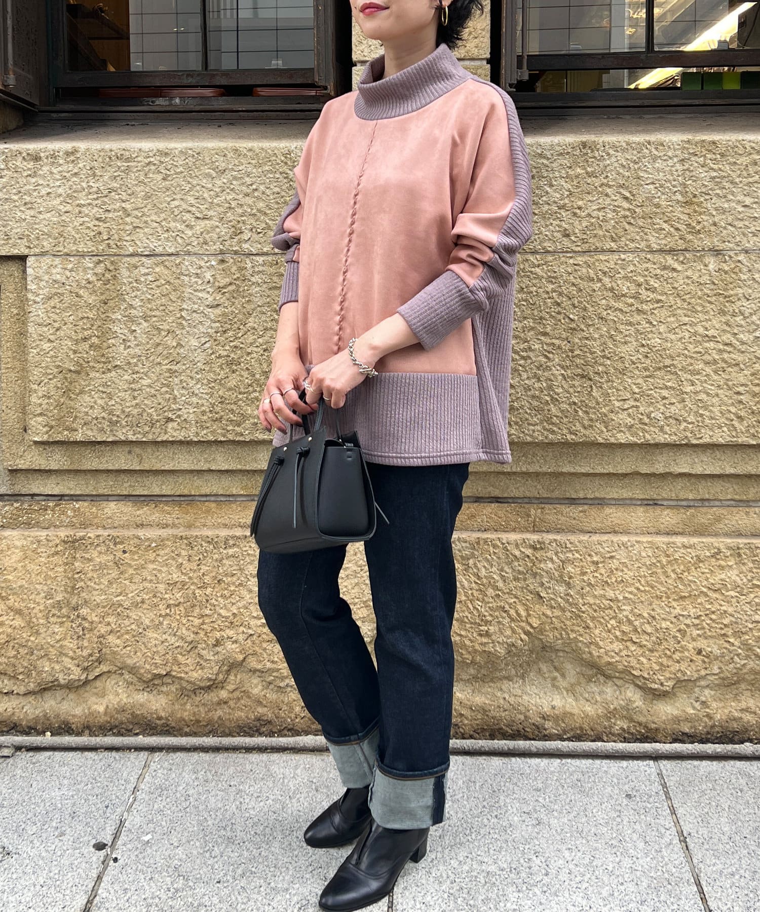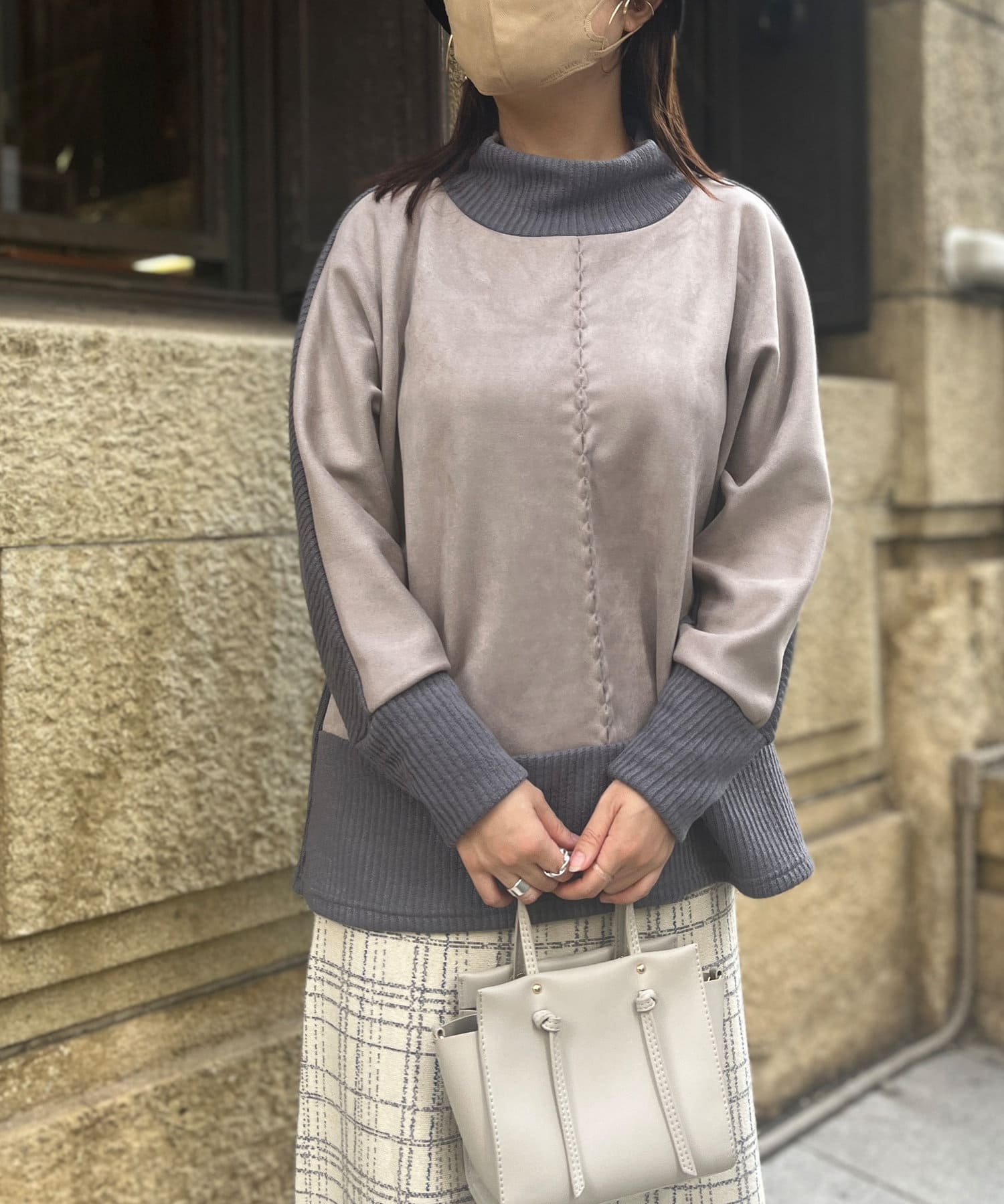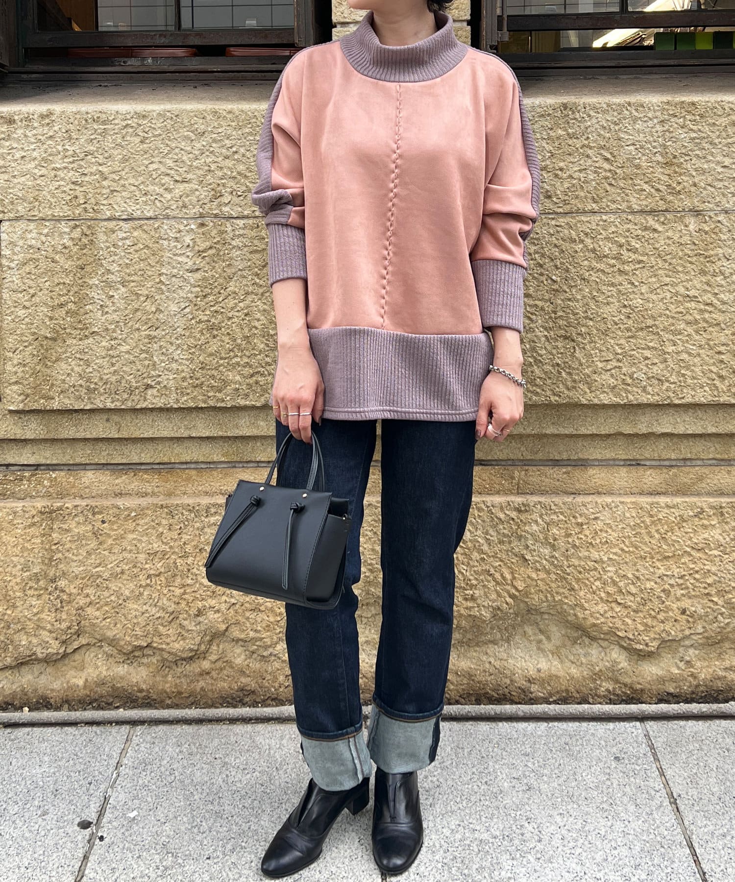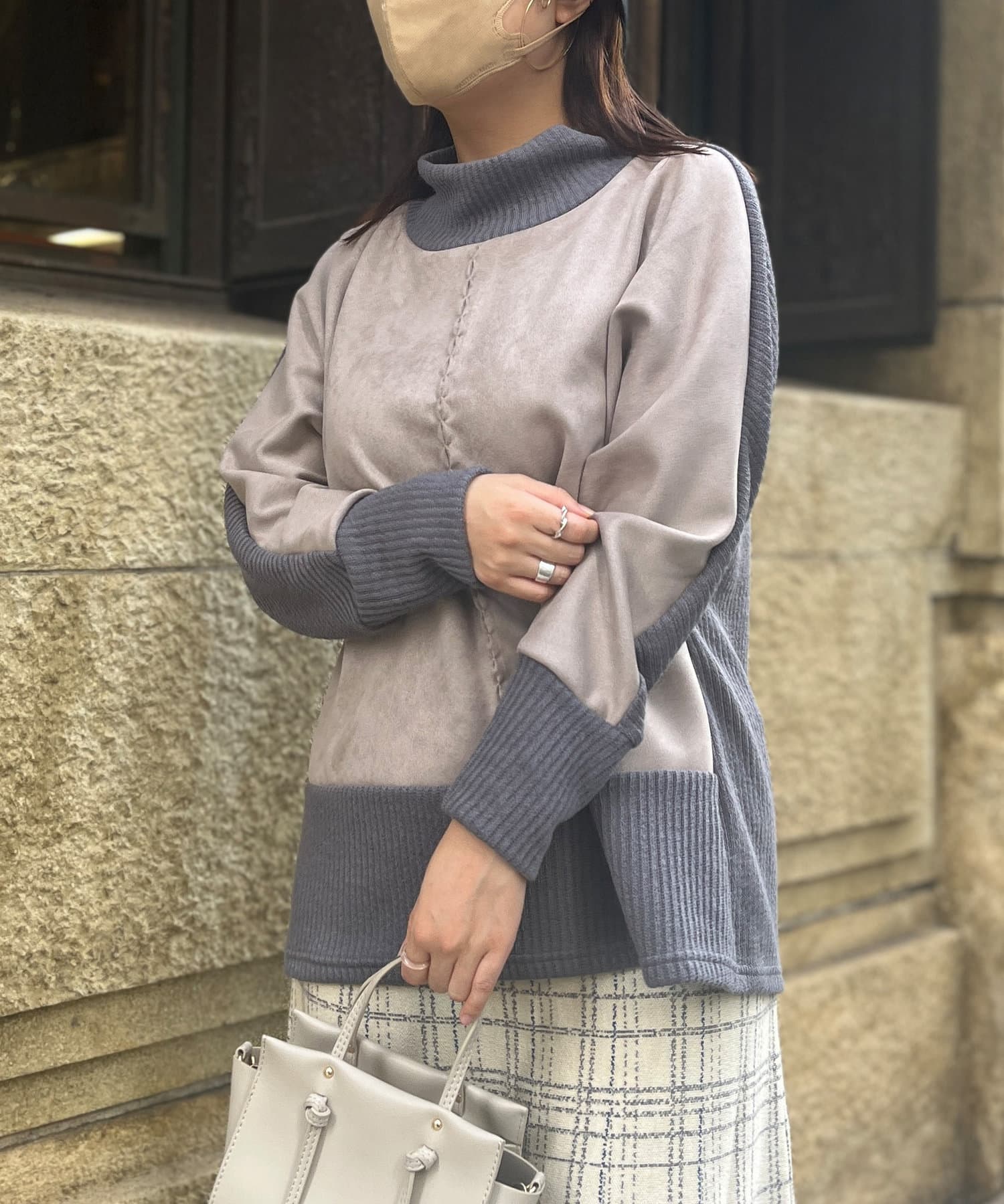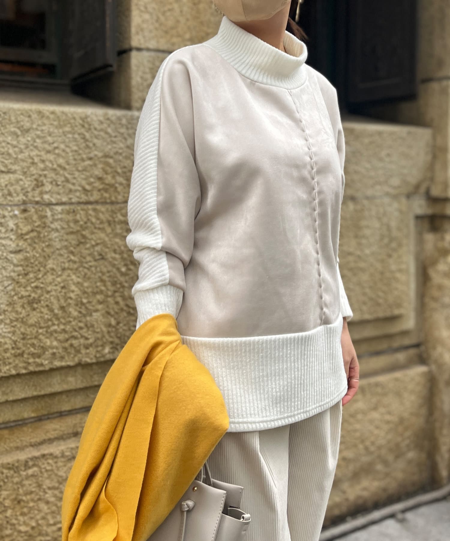 スエード×リブ切替タートルネックプルオーバー