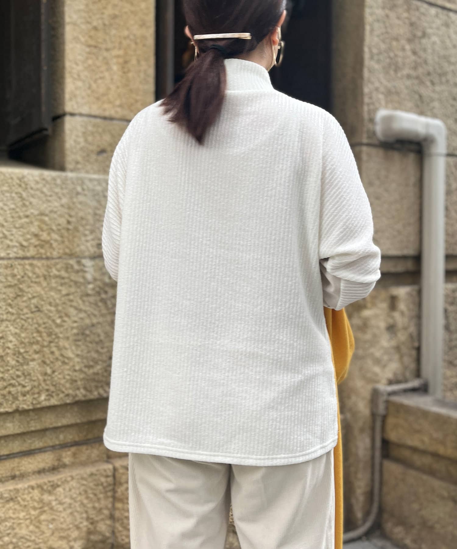 ・ハイネックが首回りを華やかに見せてくれるので、アクセサリー要らずの優秀トップス!