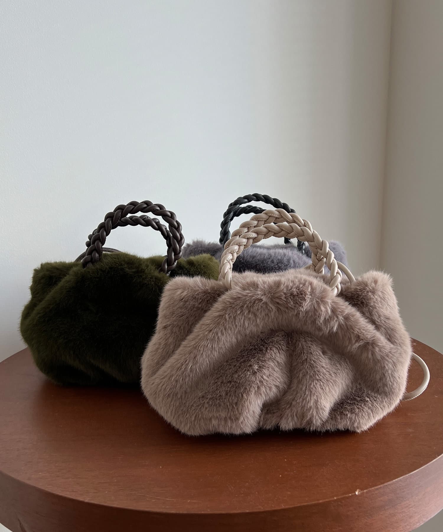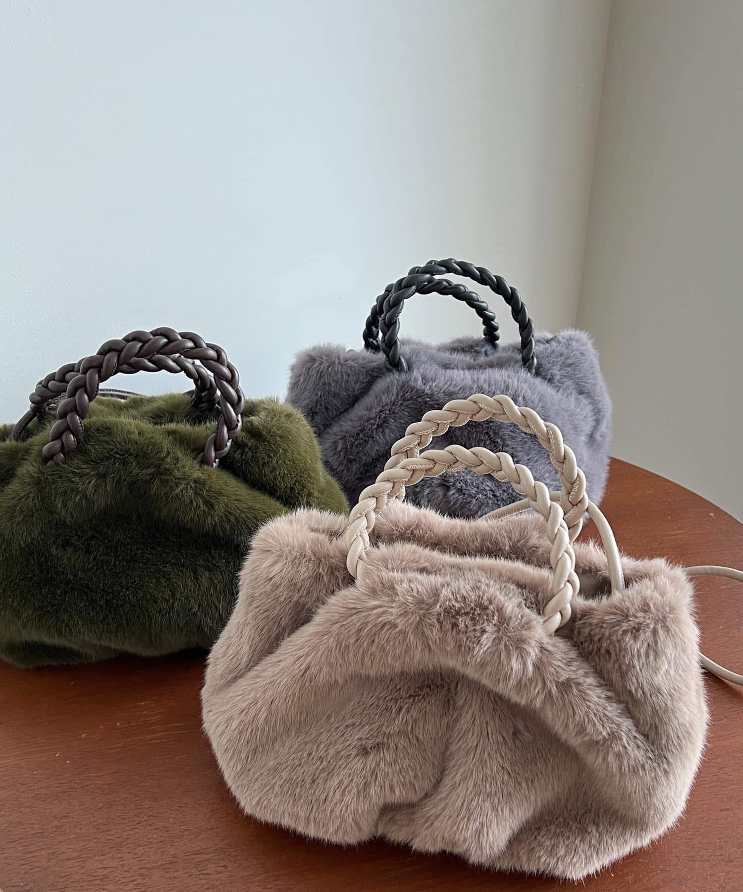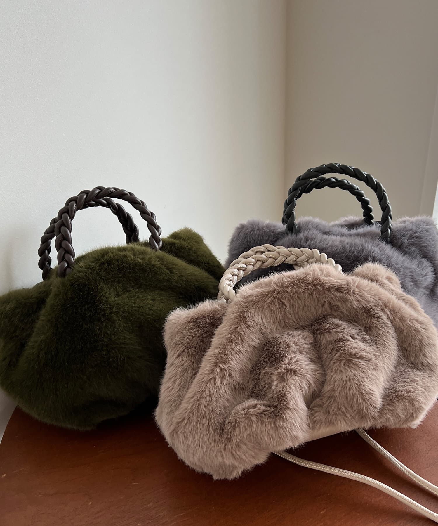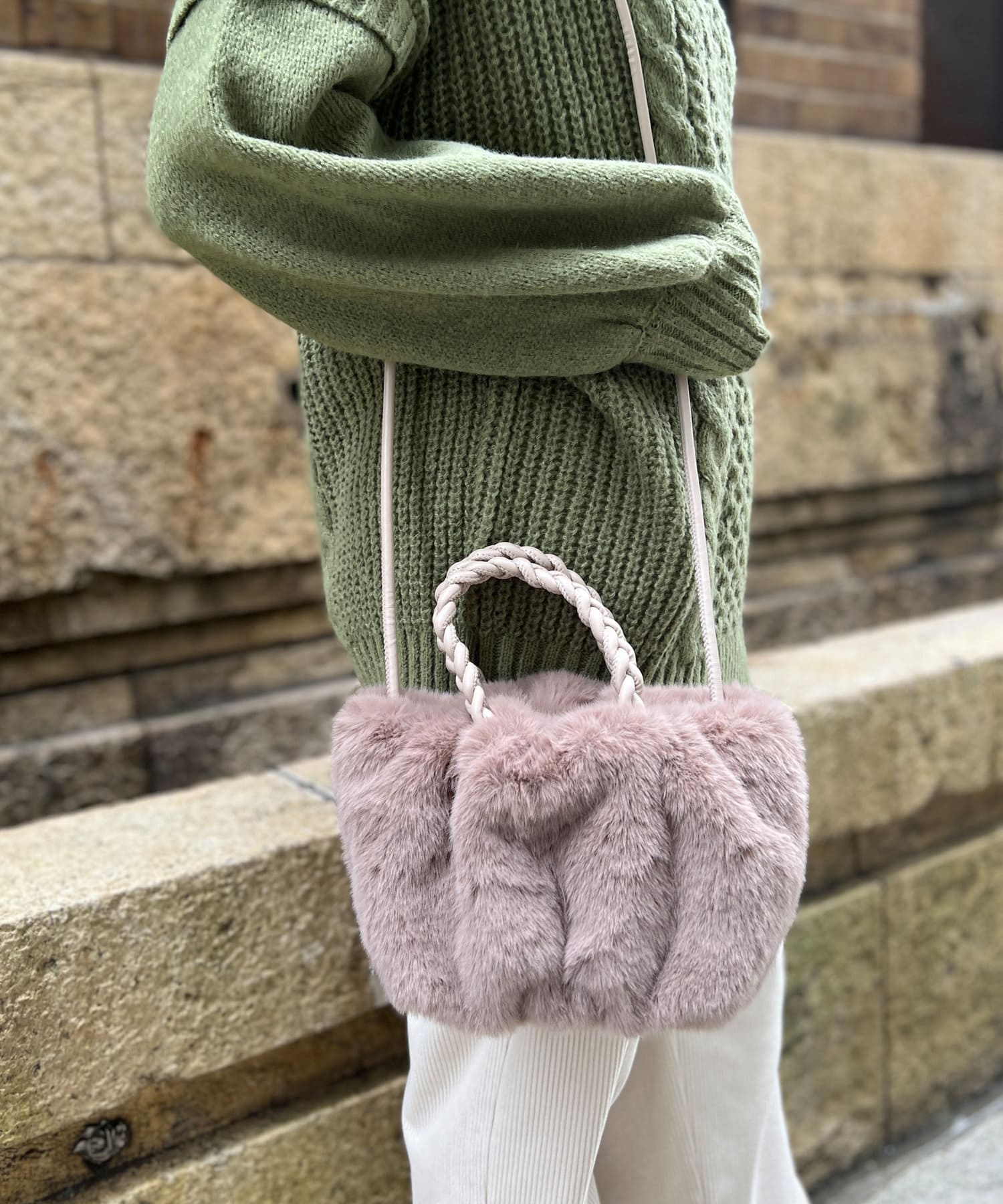 もこもこのエコファーと持ち手の編みがポイントのファーショルダーバッグ。