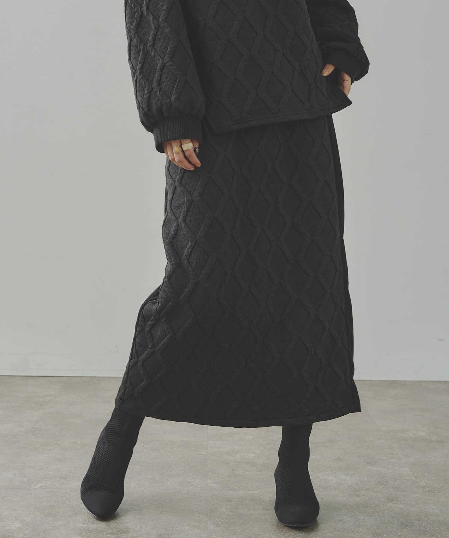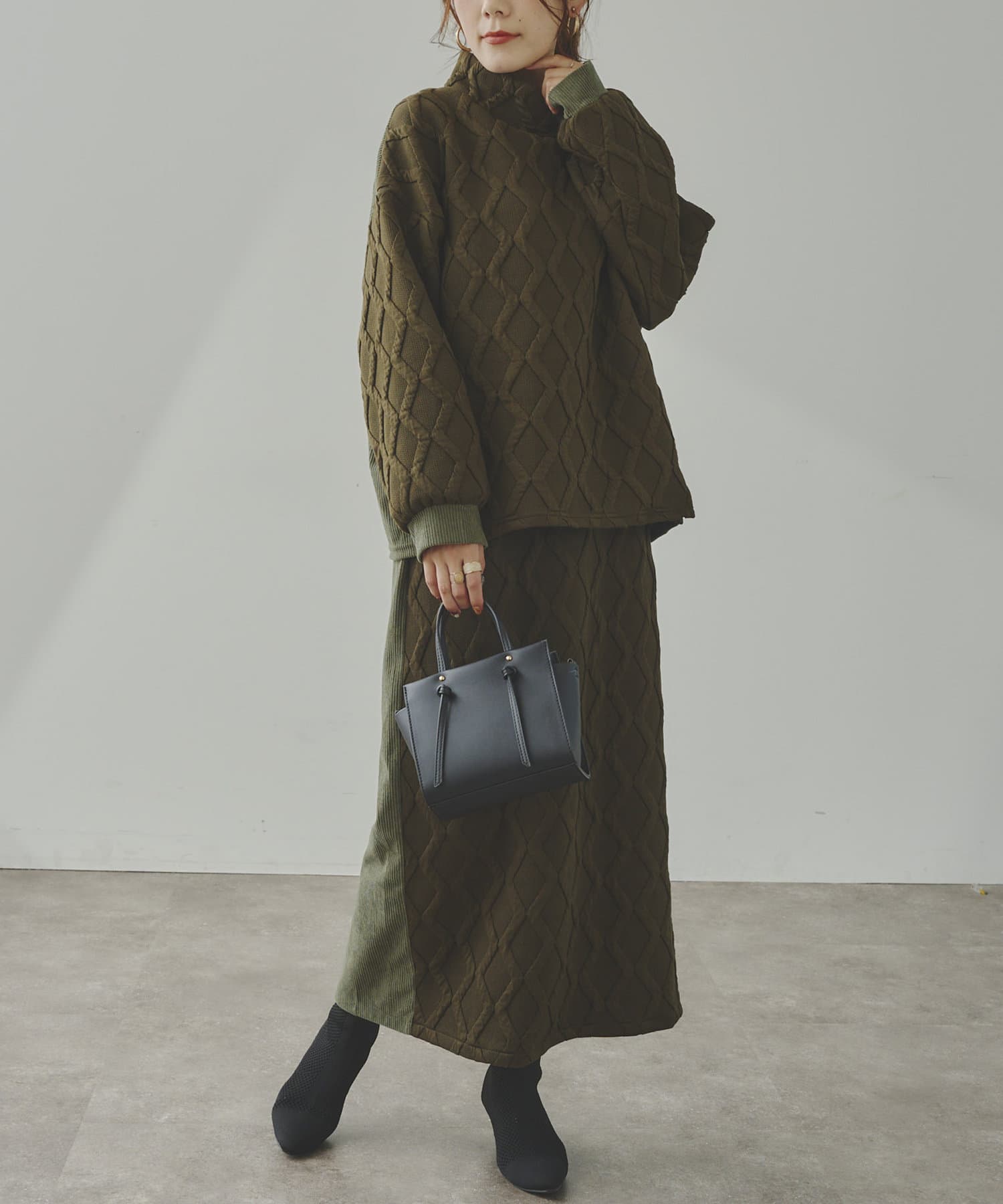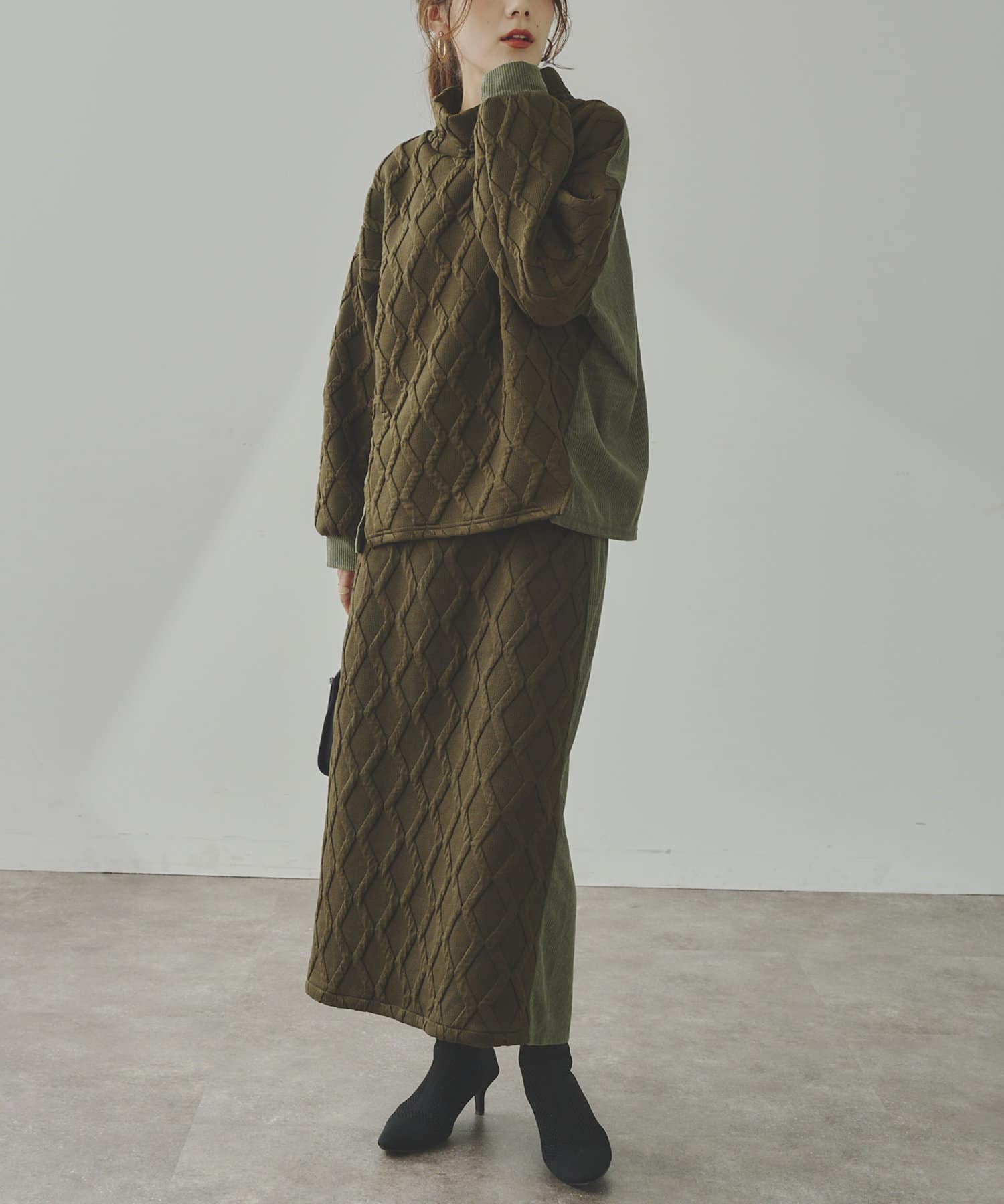 ダイヤ柄キルティングとニットスカートの切替デザイン