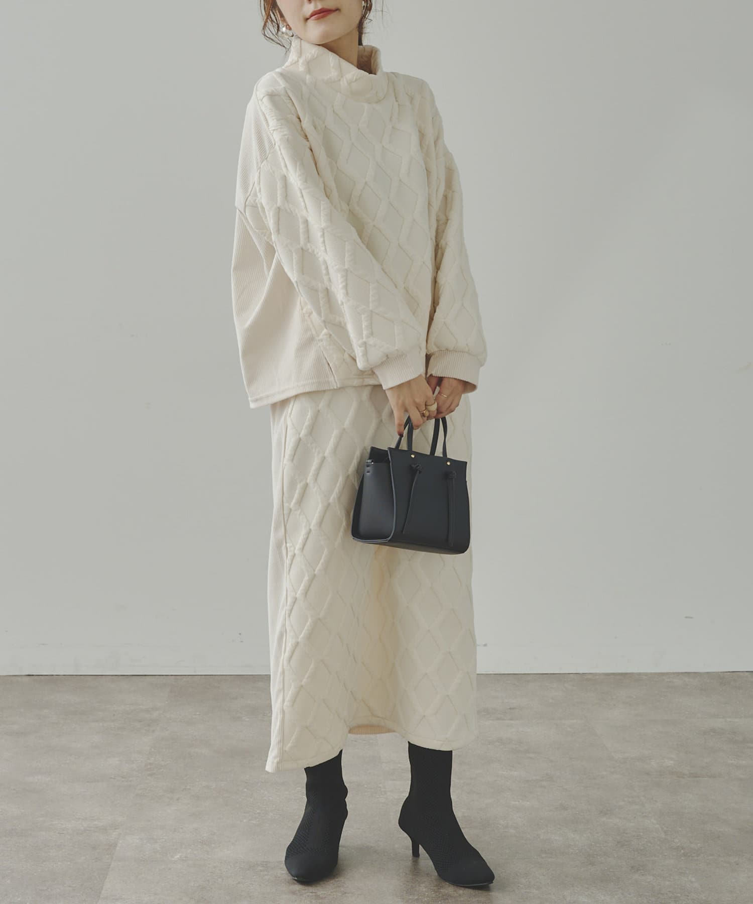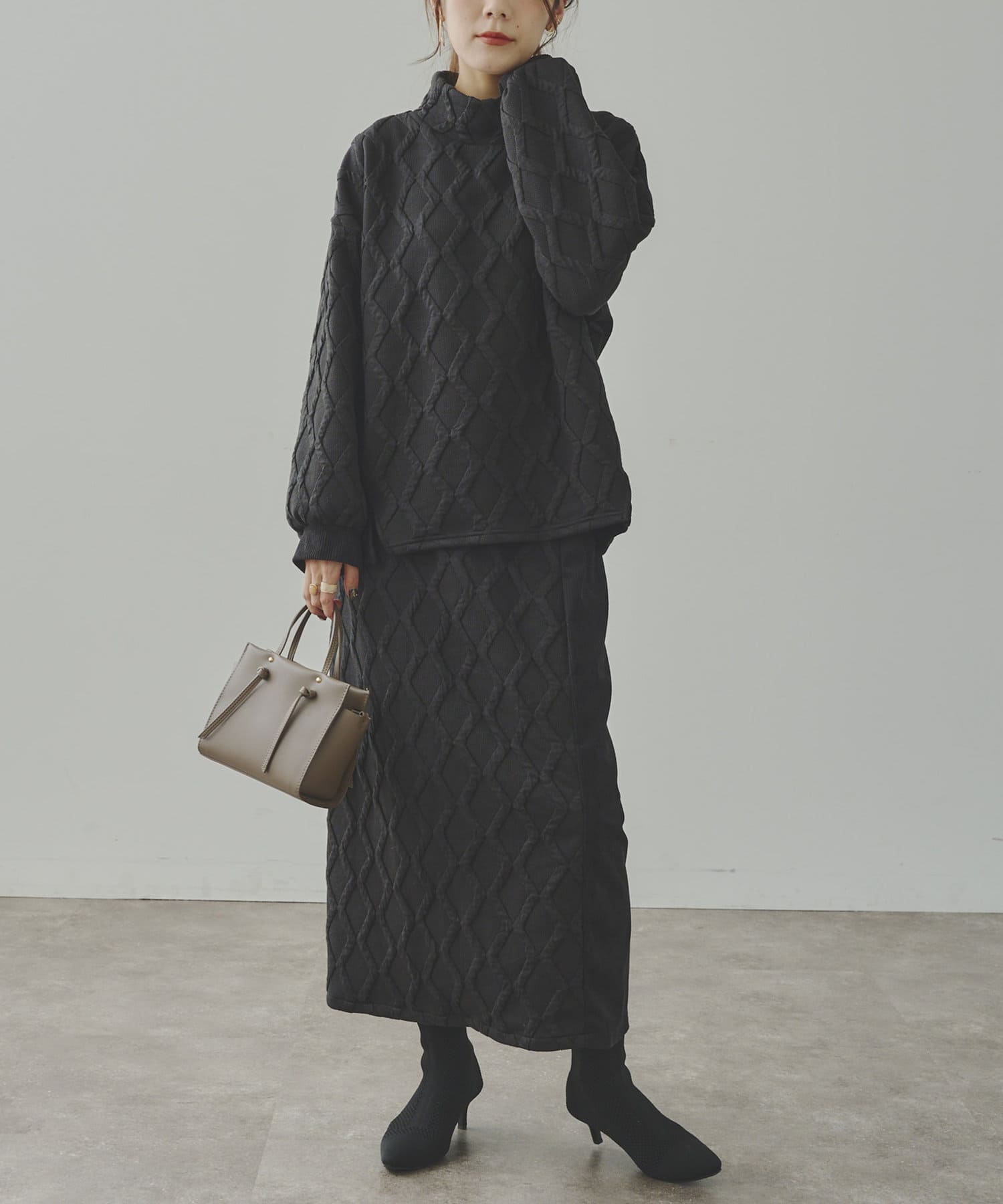 同素材のトップス(PGC1022406A0007 ダイヤ柄切替プルオーバー)と合わせたセットアップコーデもオススメです。