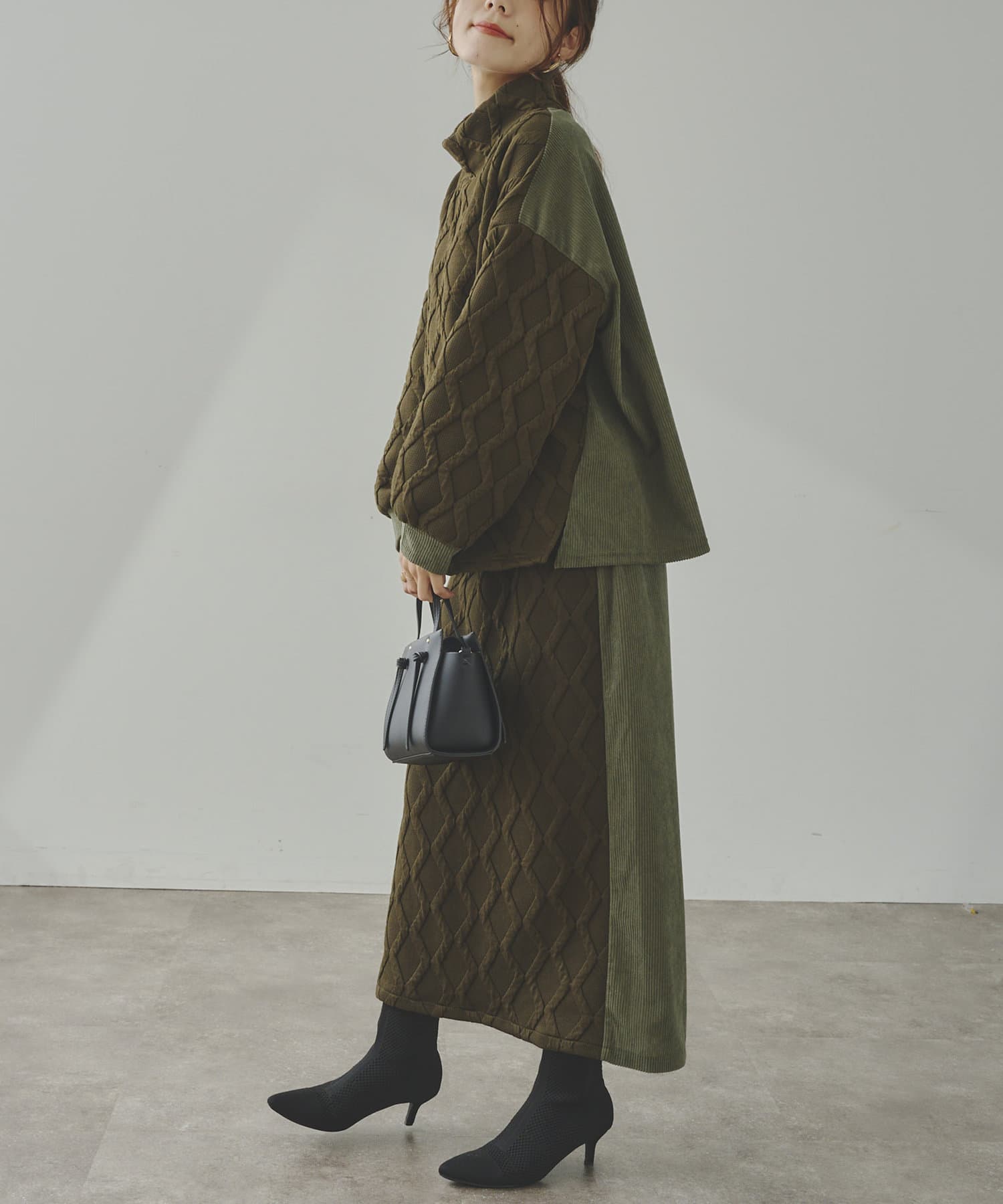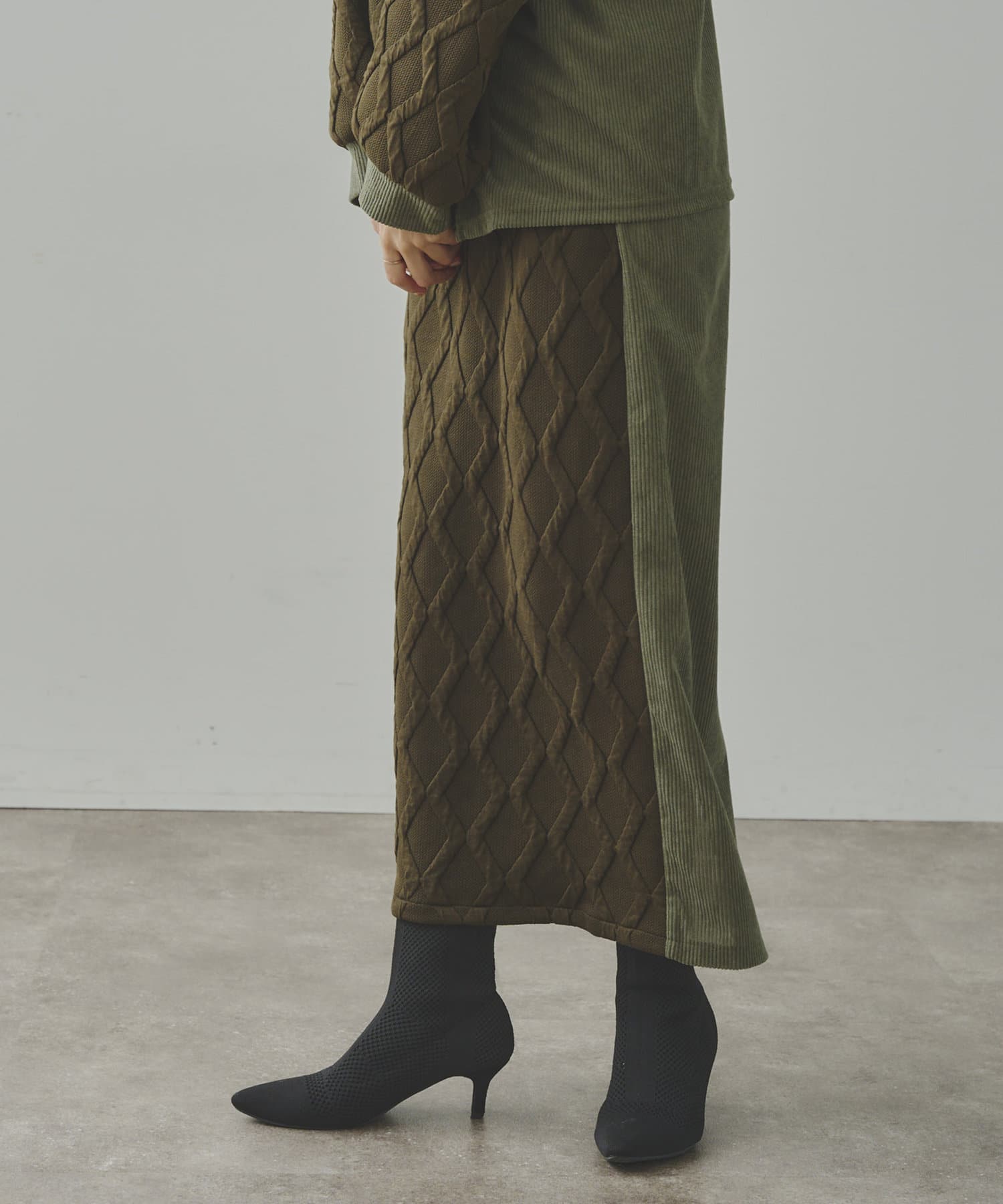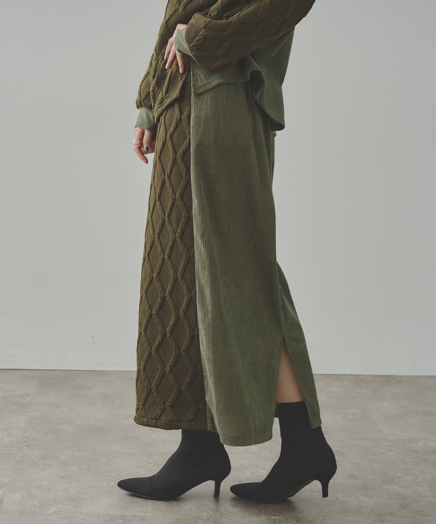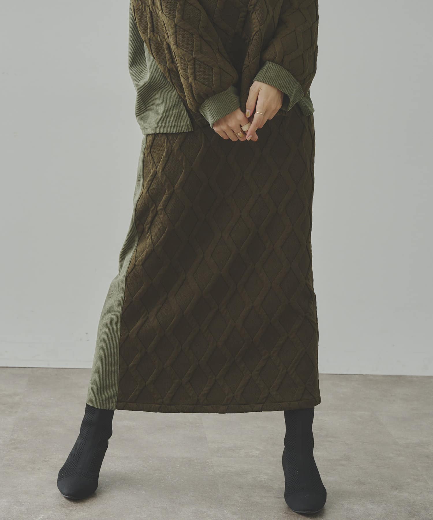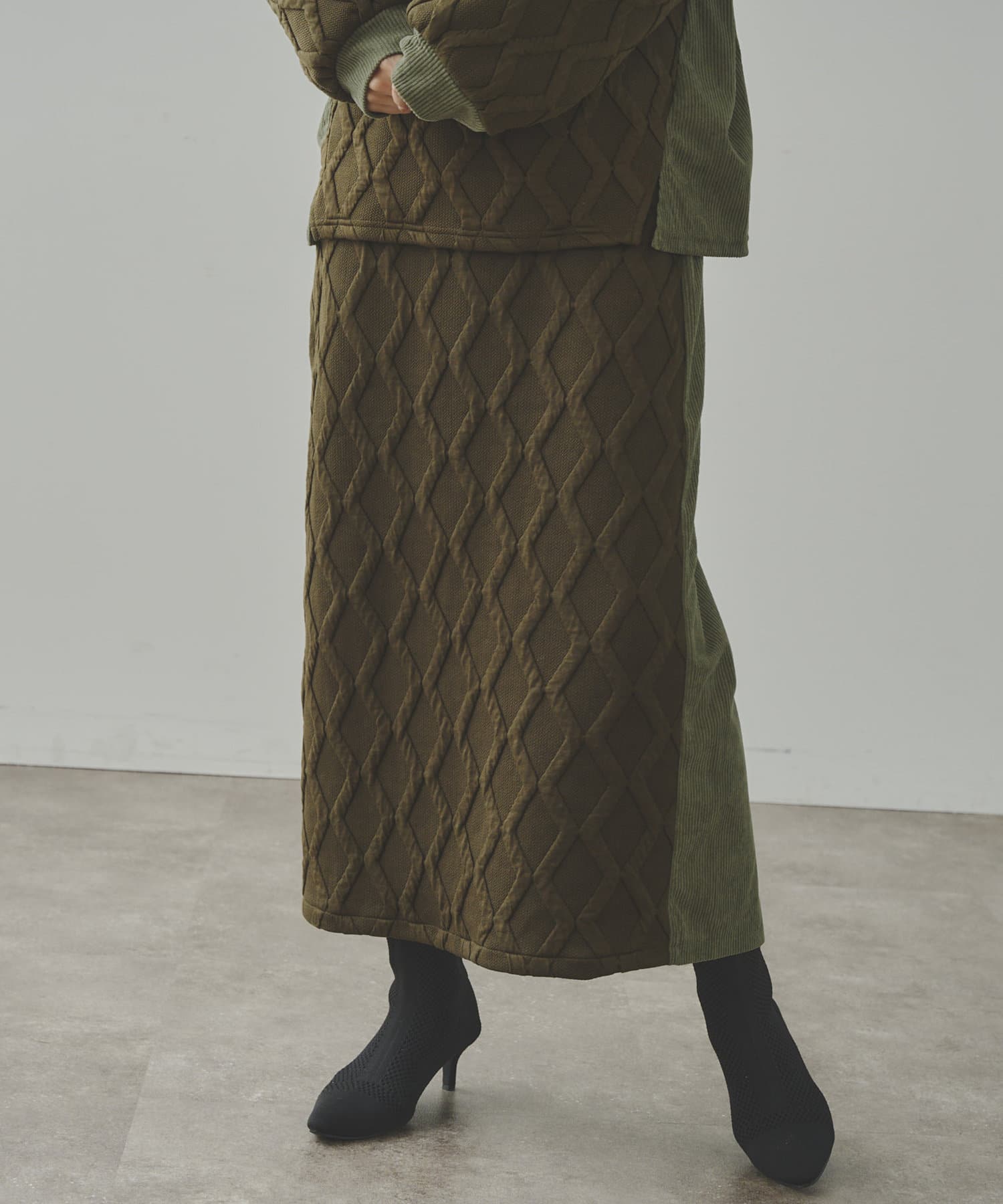 前面は凹凸感のあるダイヤ柄キルティング、後ろは細畝コーデュロイの切替デザインが新鮮なナロースカート。