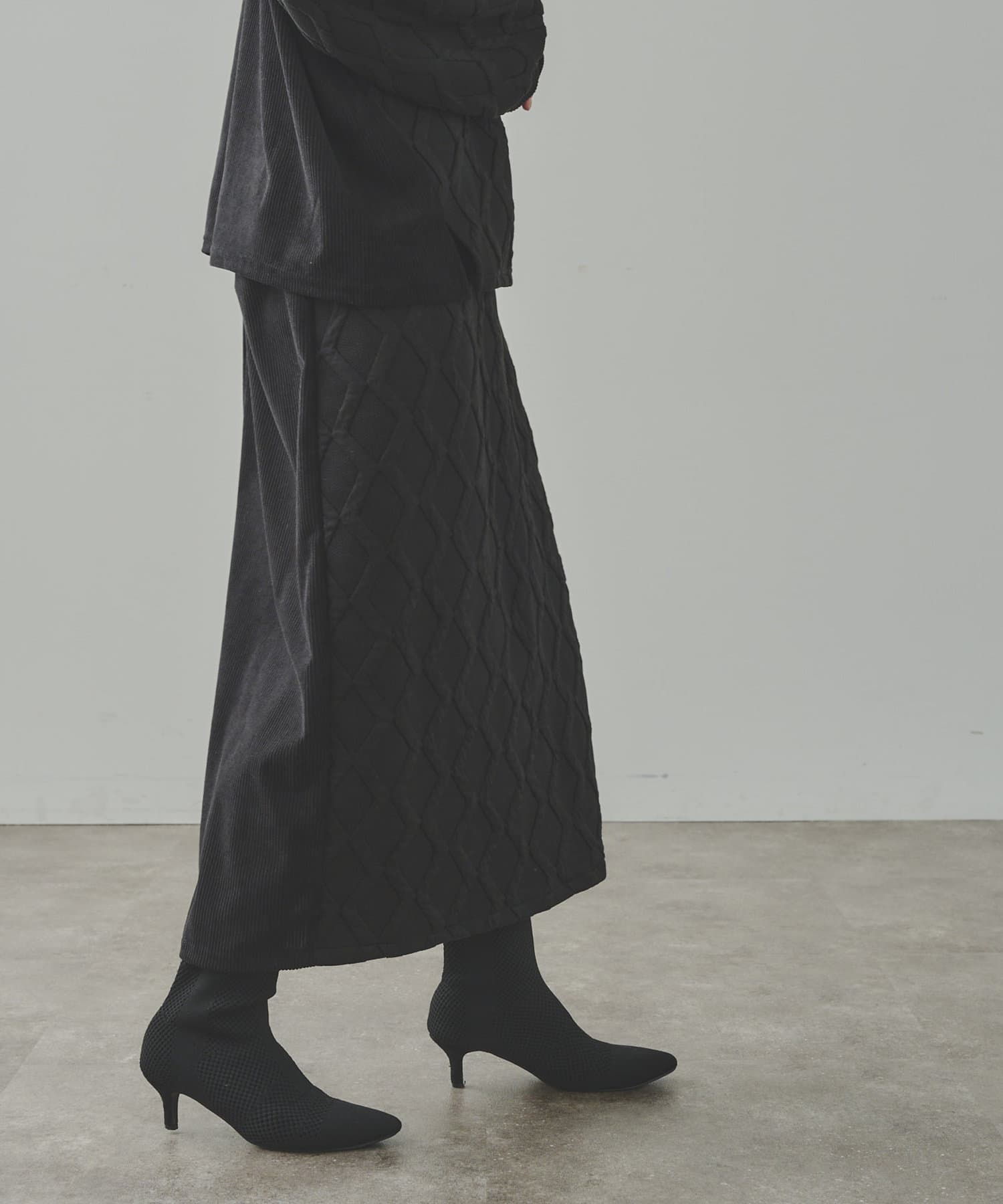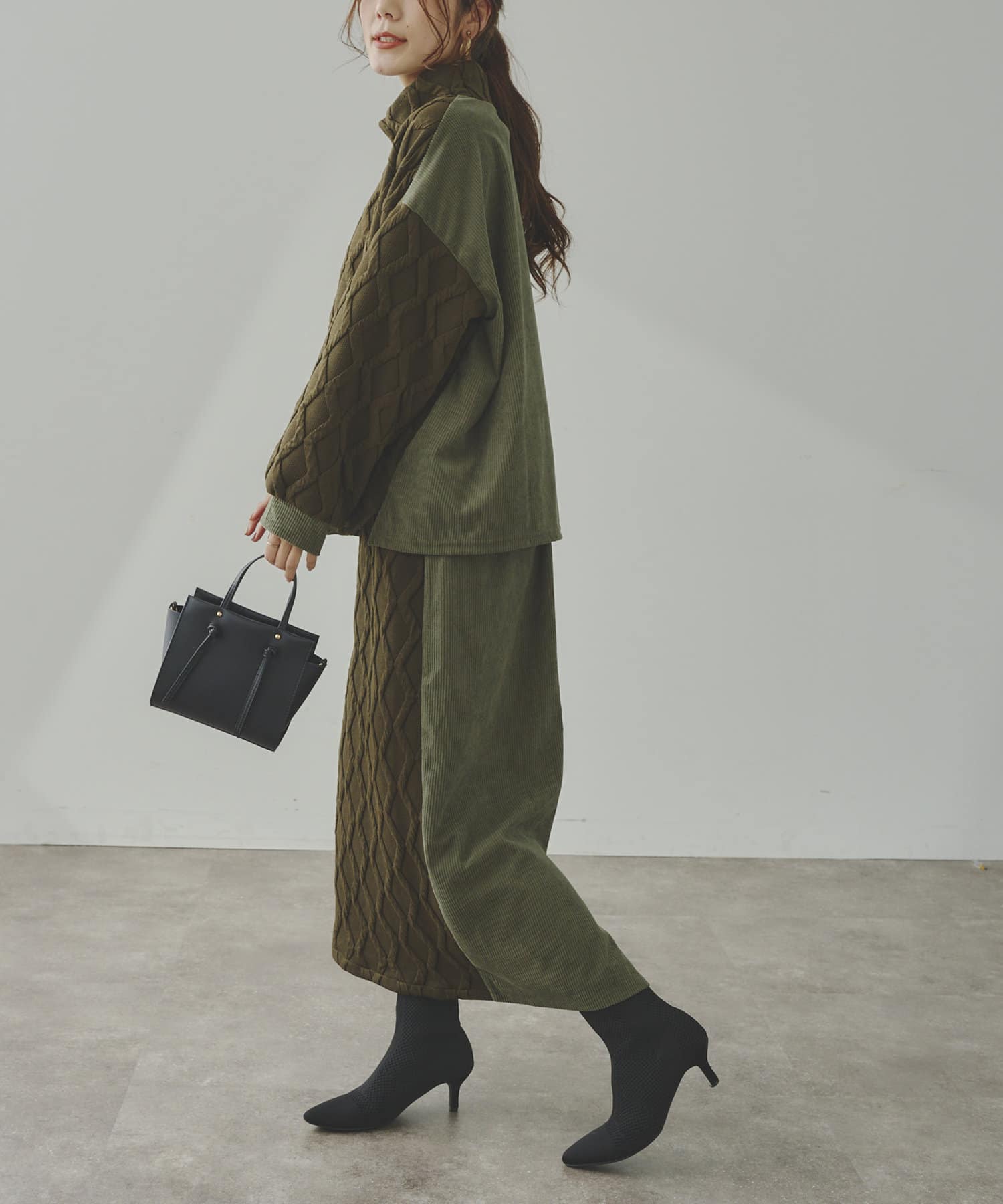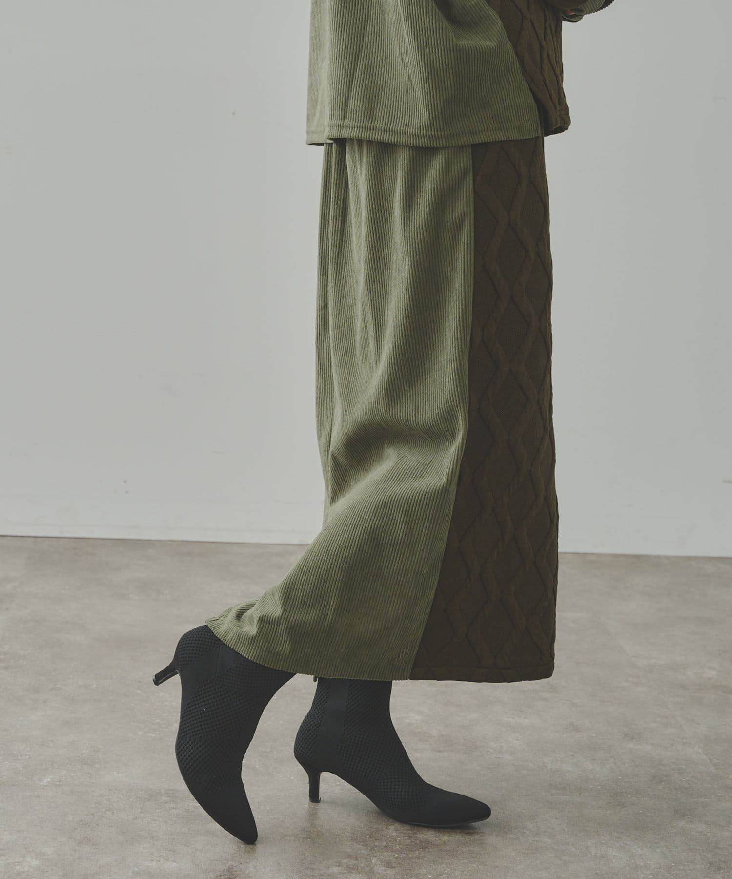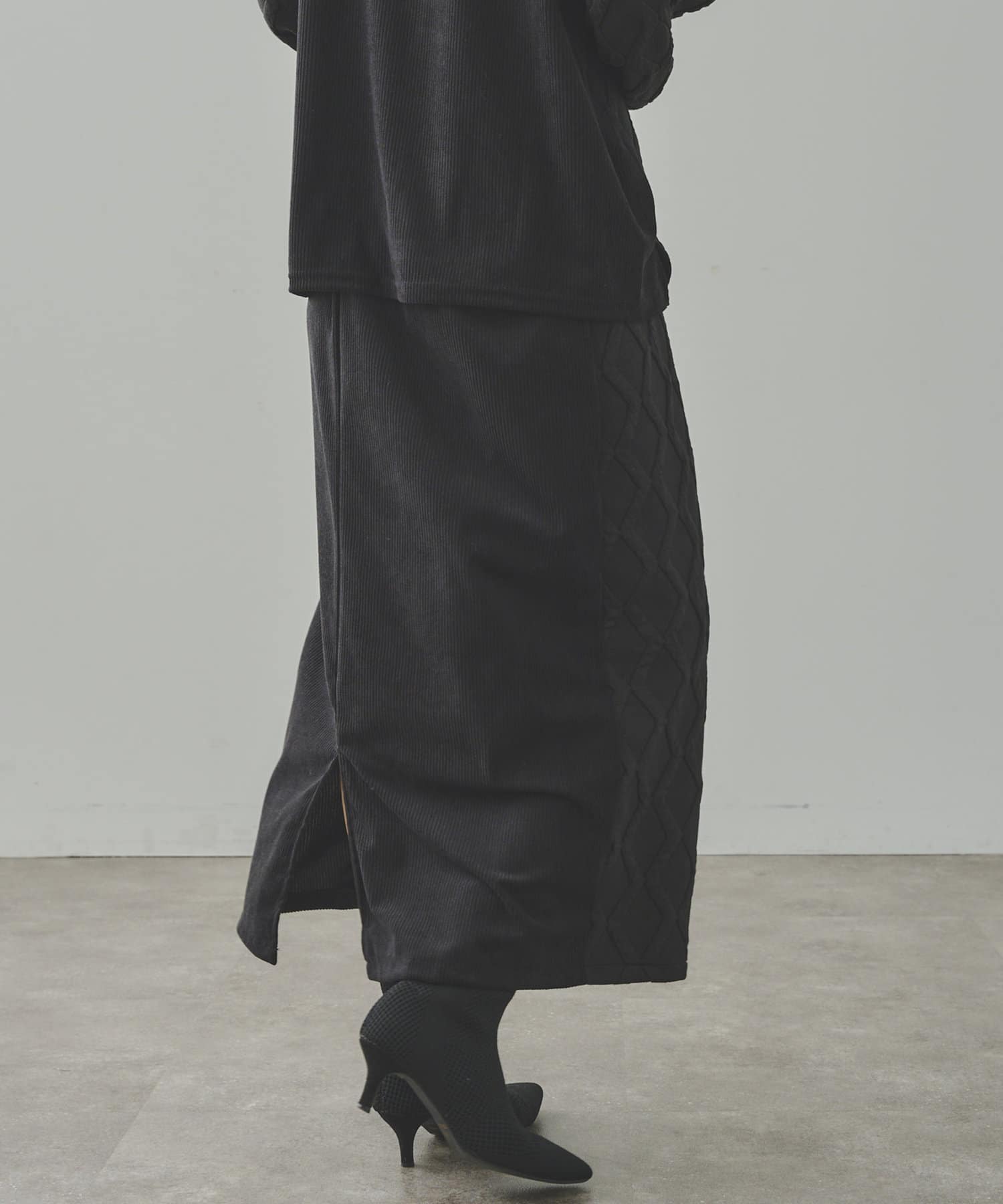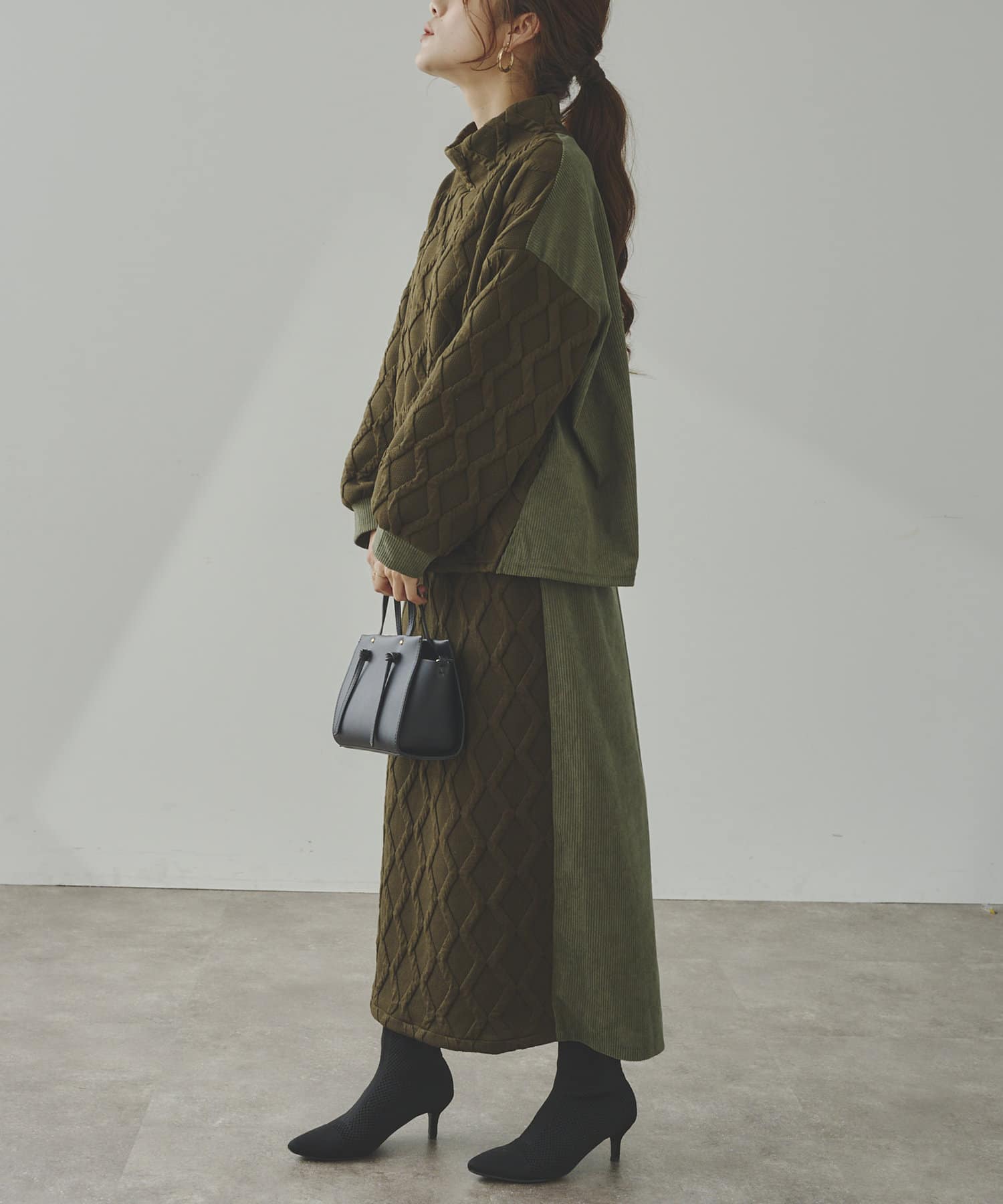前面は凹凸感のあるダイヤ柄キルティング、後ろは細畝コーデュロイの切替デザインが新鮮なナロースカート。