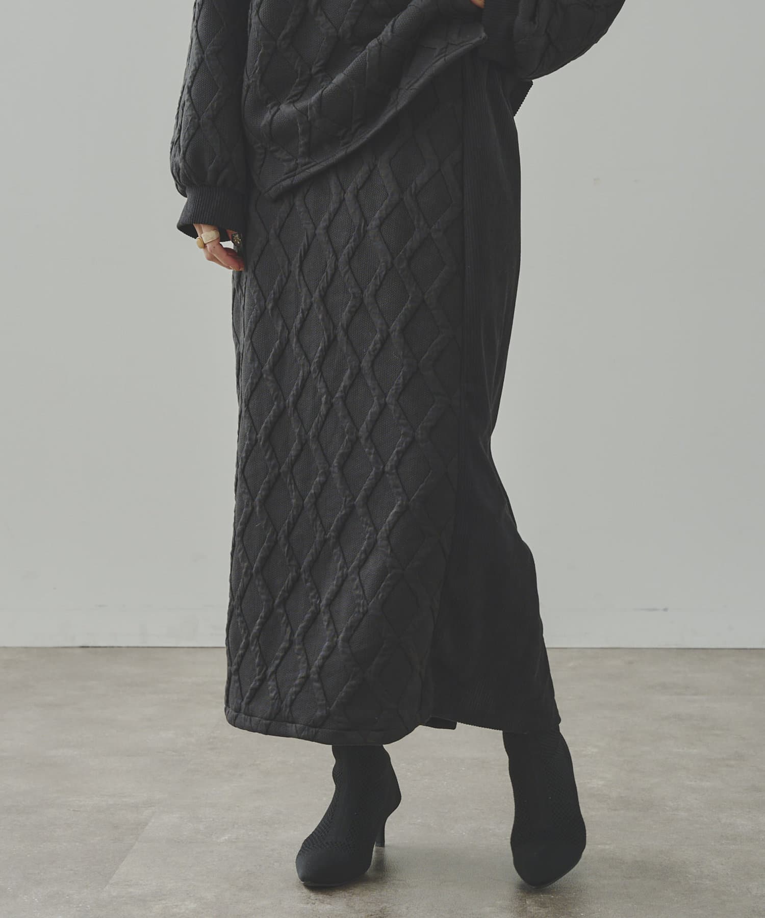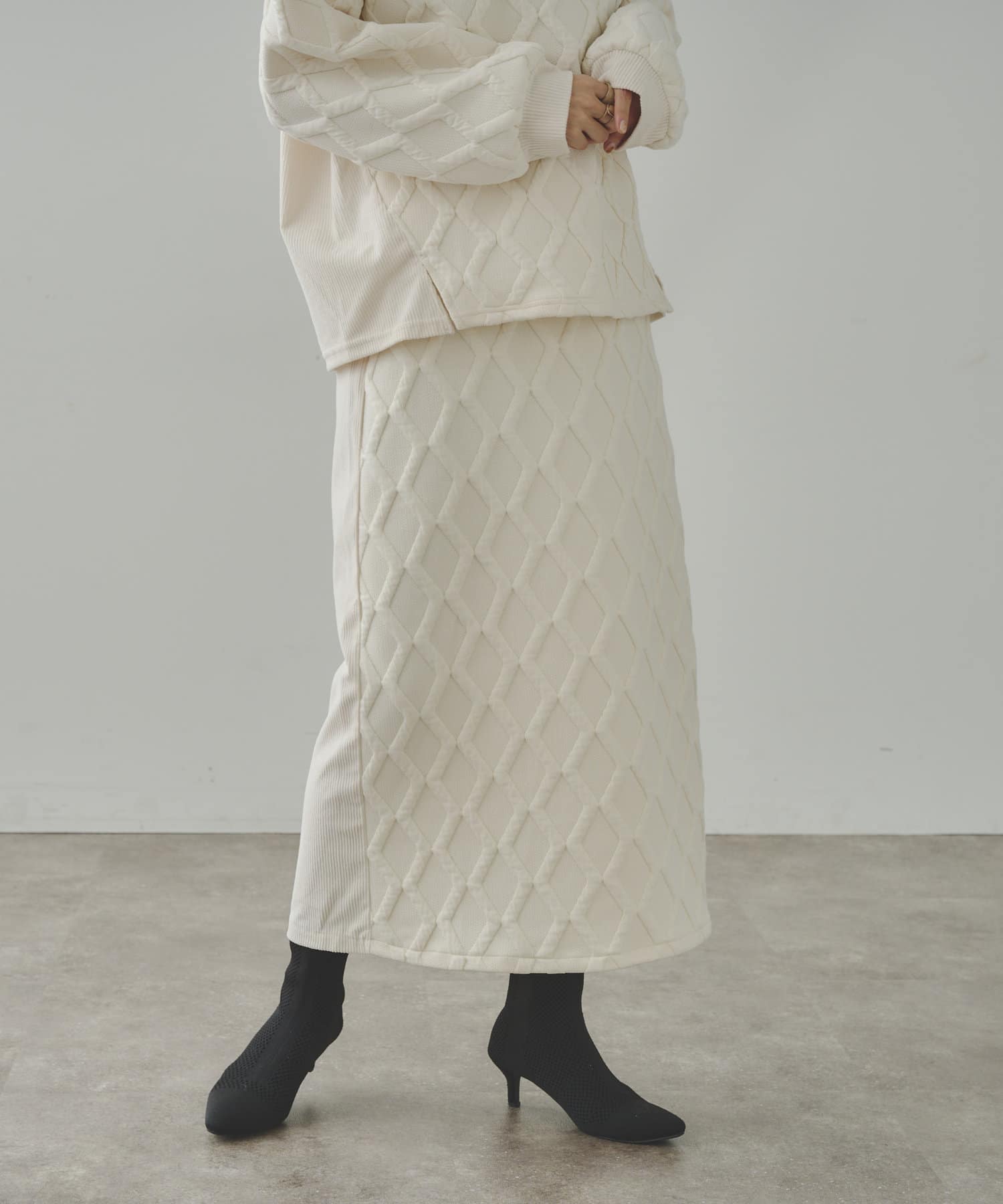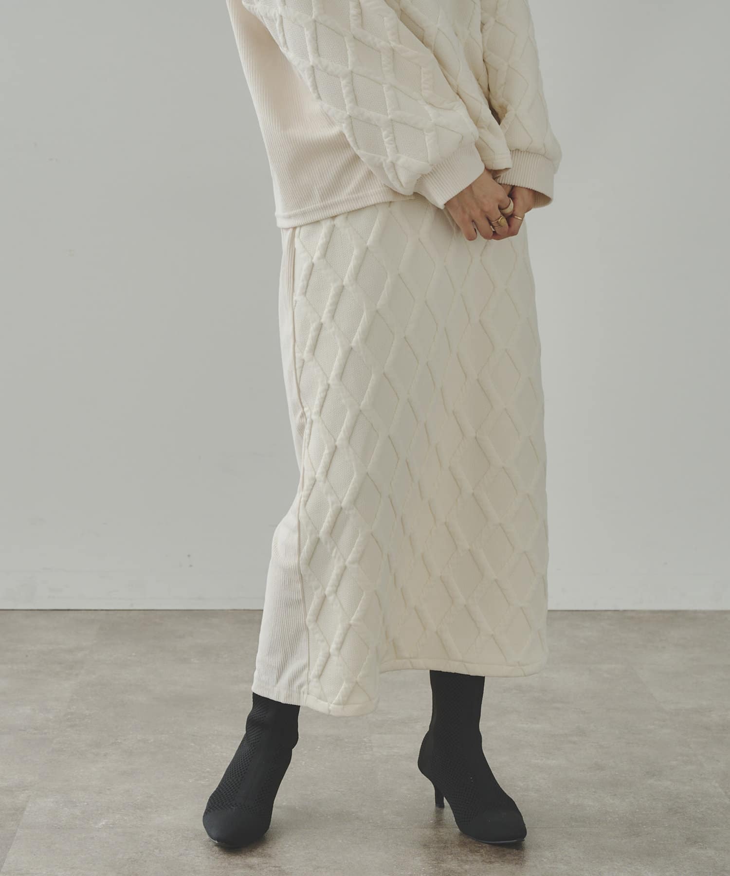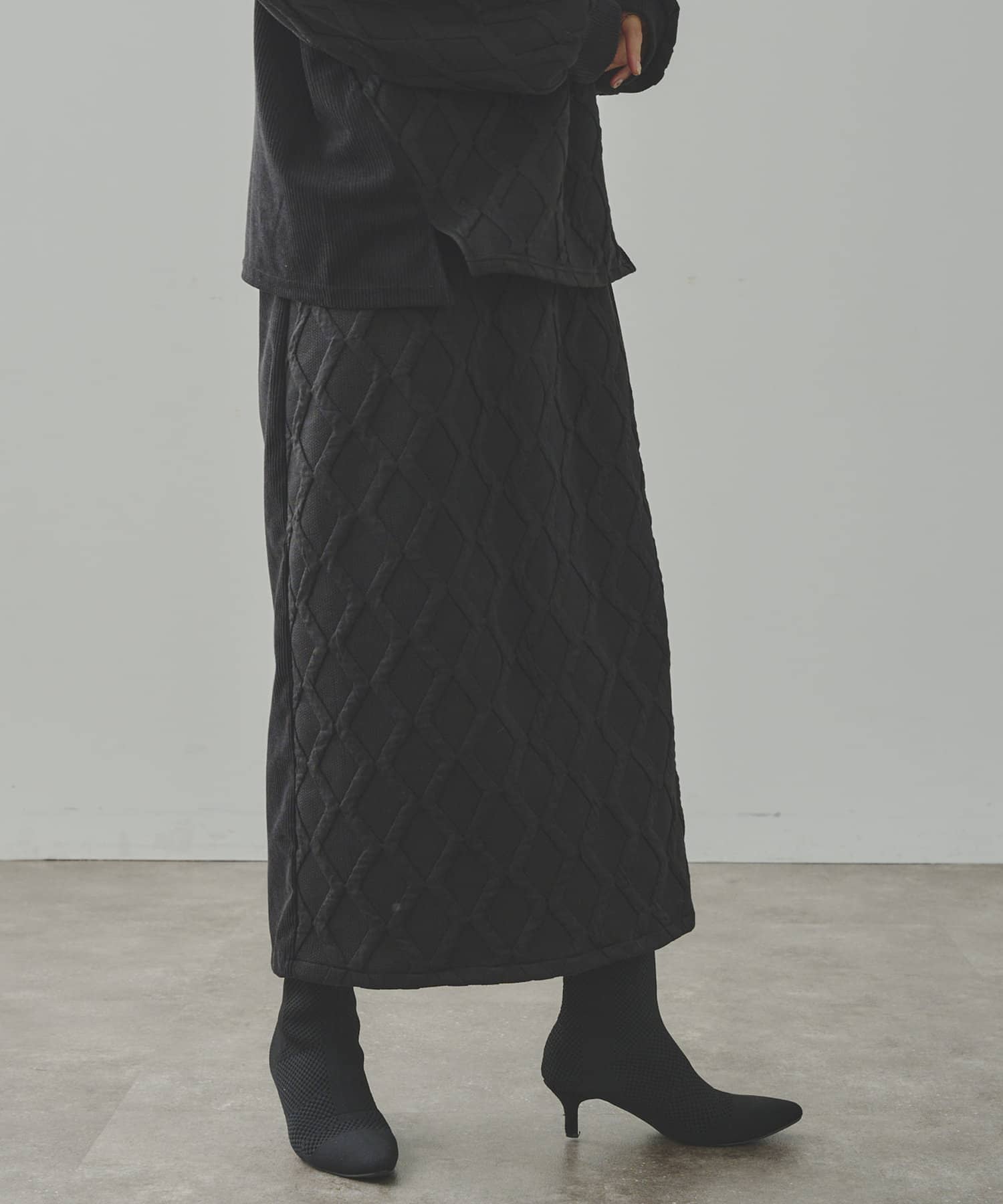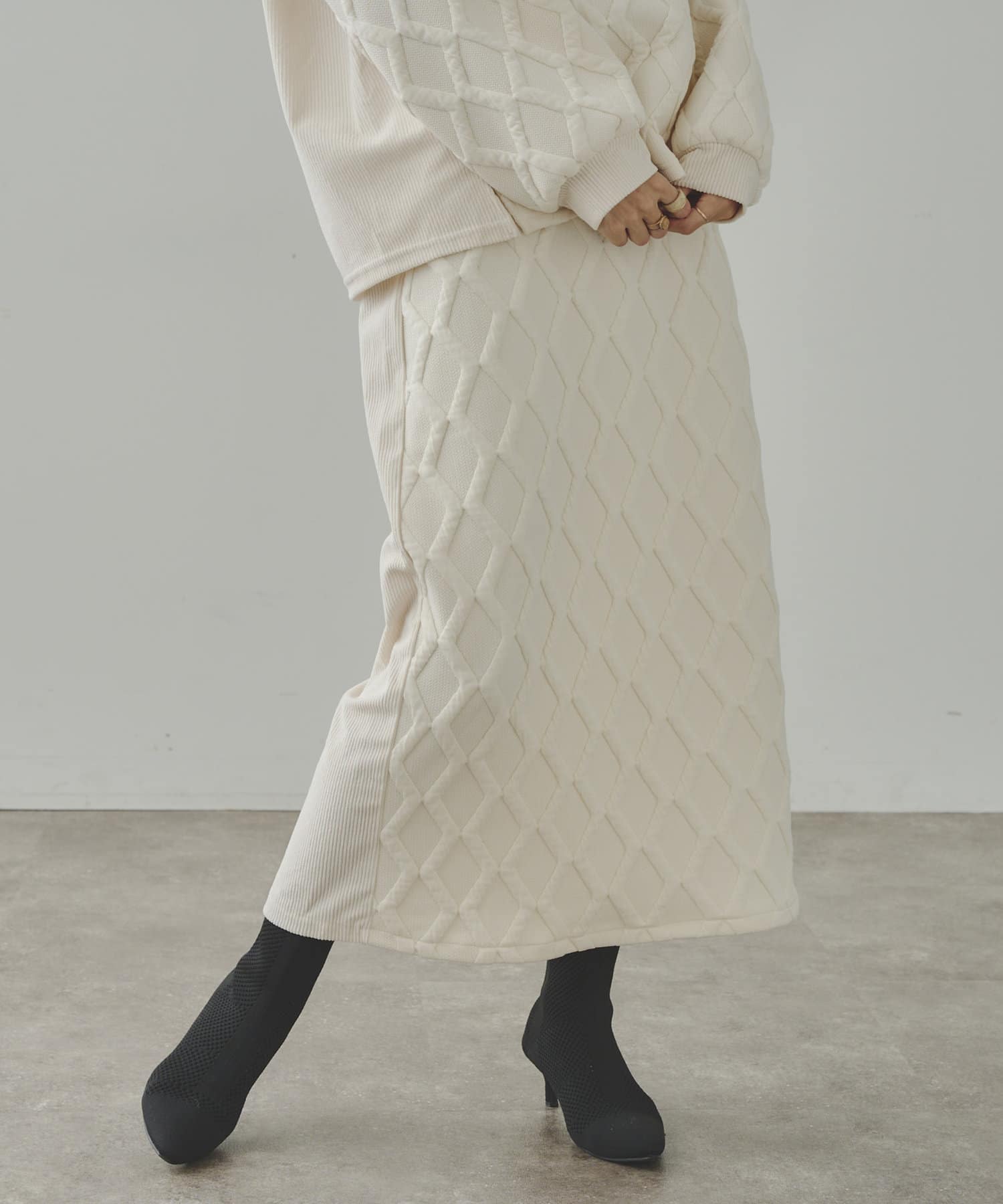 前面は凹凸感のあるダイヤ柄キルティング、後ろは細畝コーデュロイの切替デザインが新鮮なナロースカート。