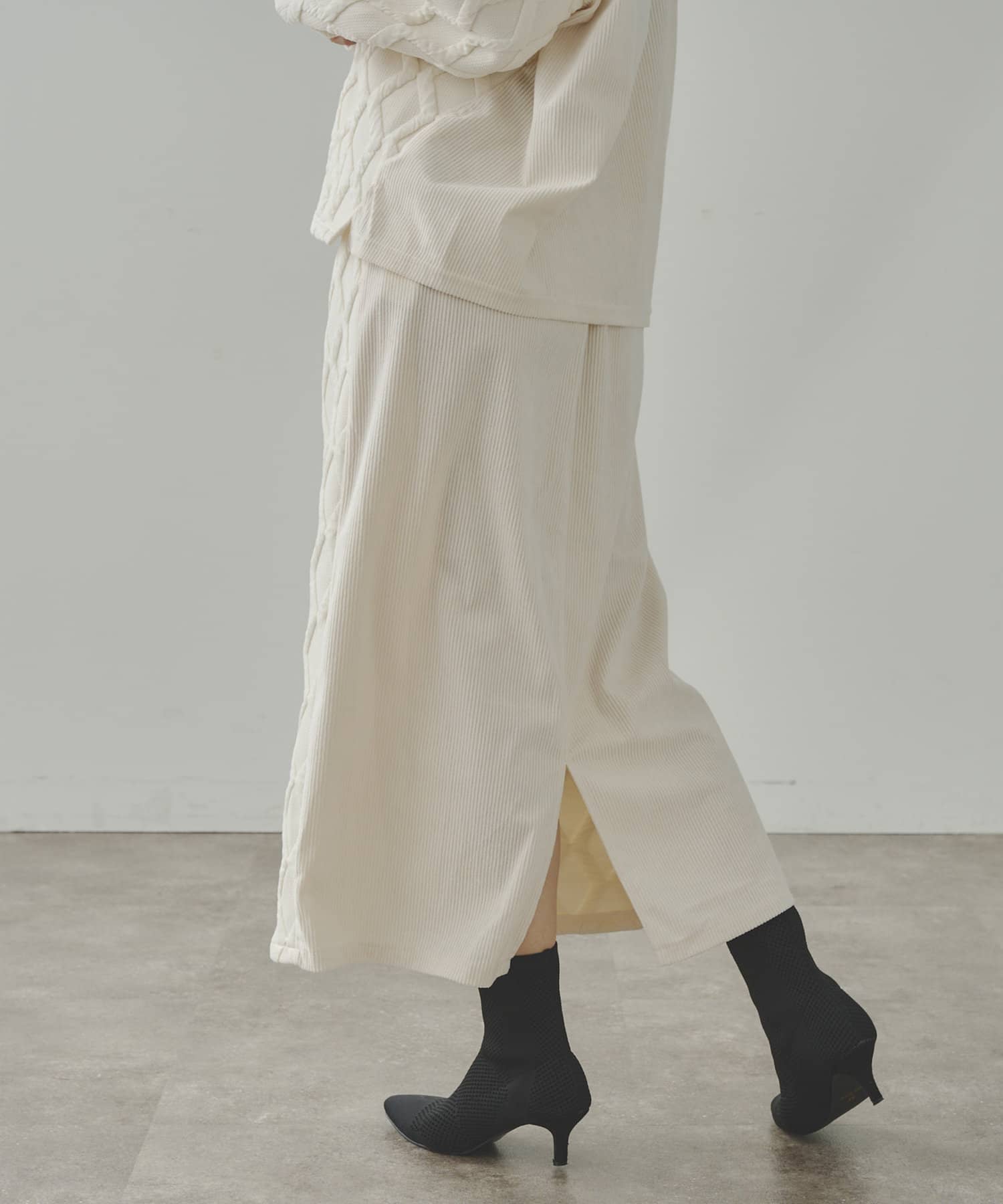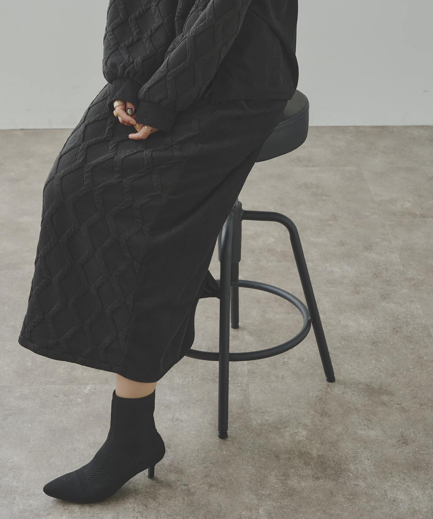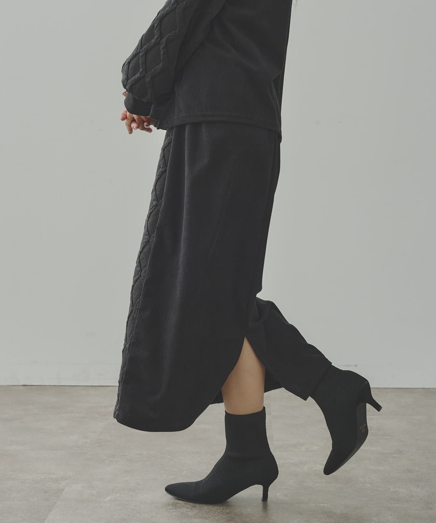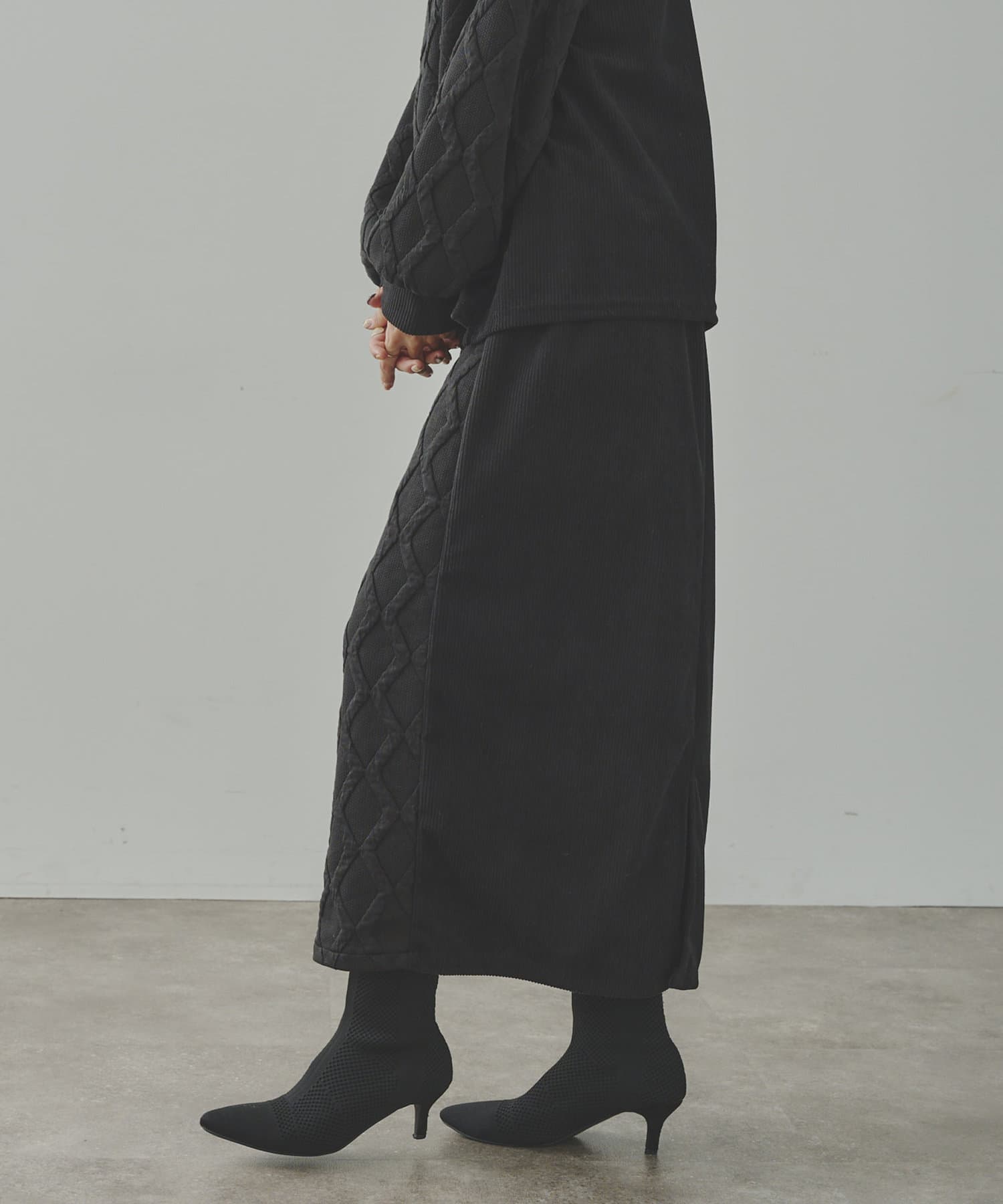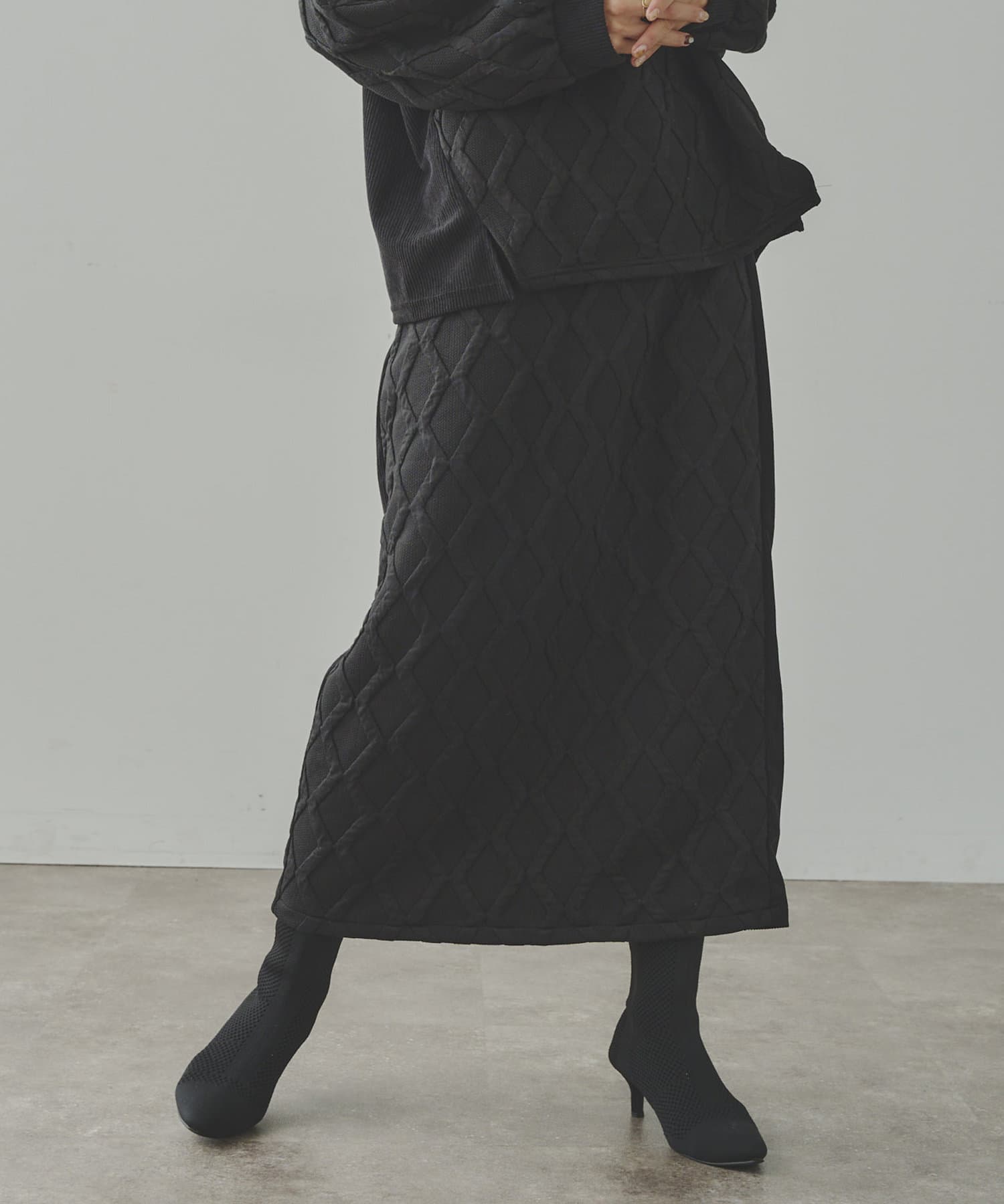 前面は凹凸感のあるダイヤ柄キルティング、後ろは細畝コーデュロイの切替デザインが新鮮なナロースカート。