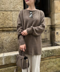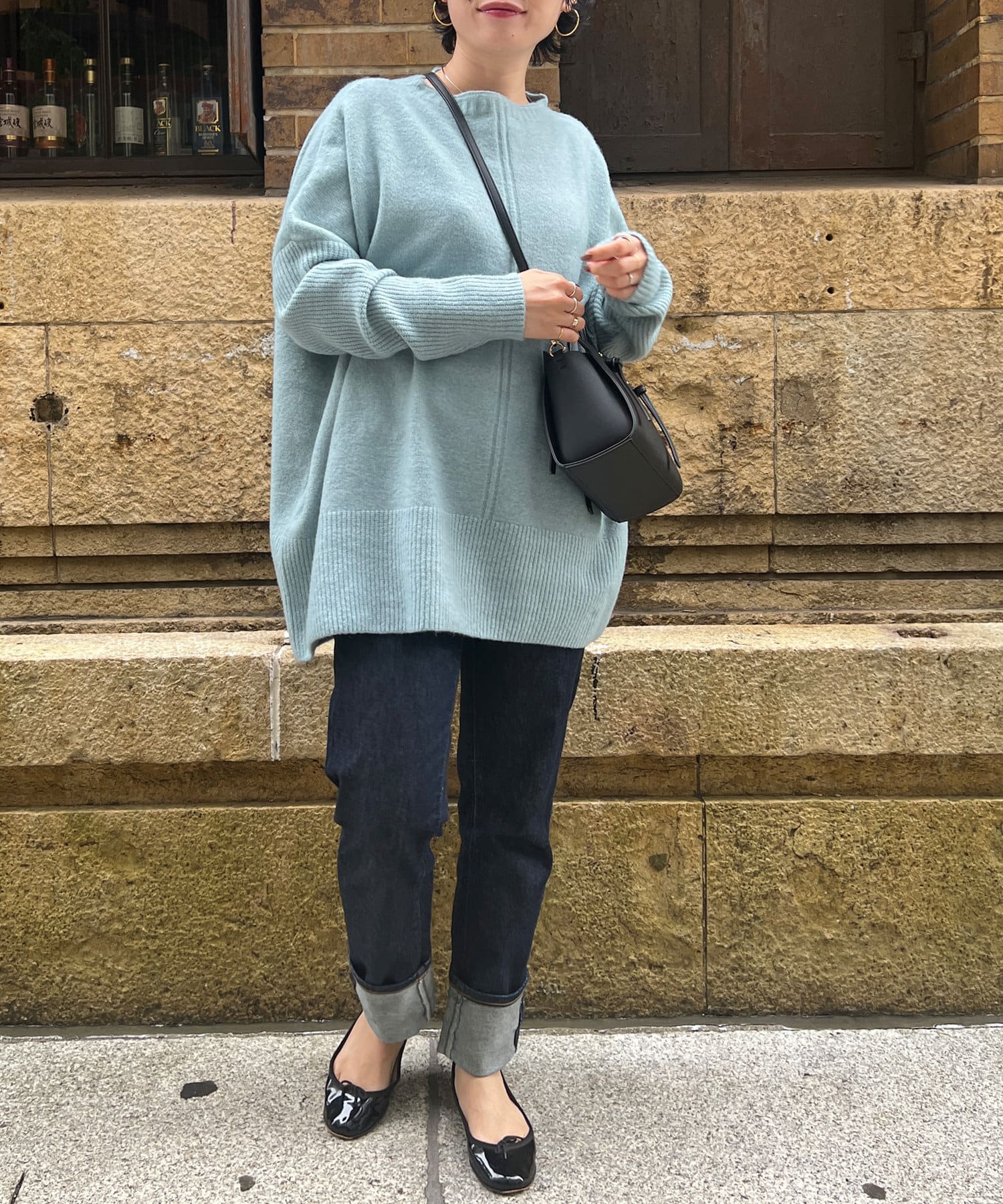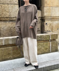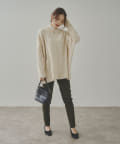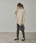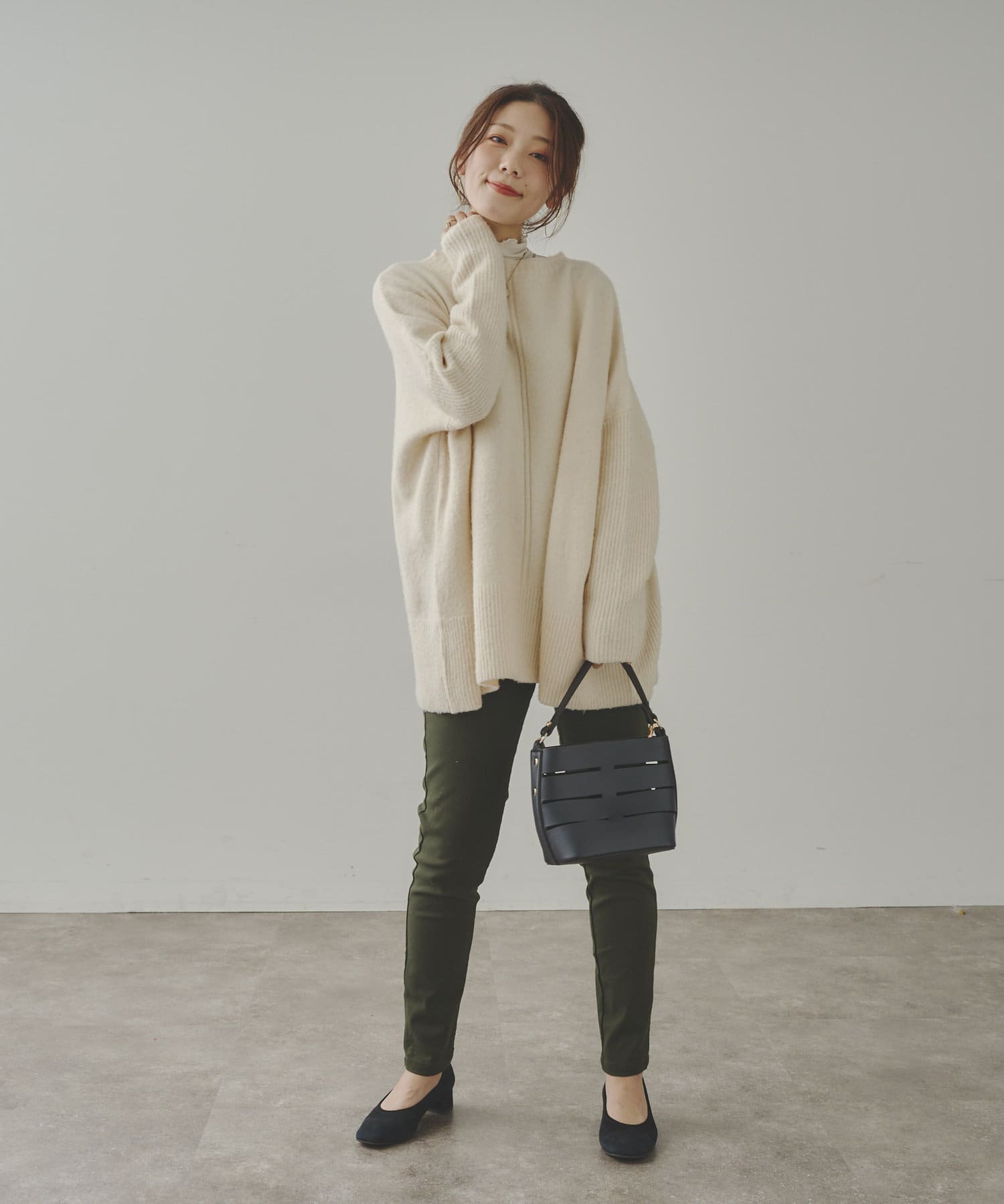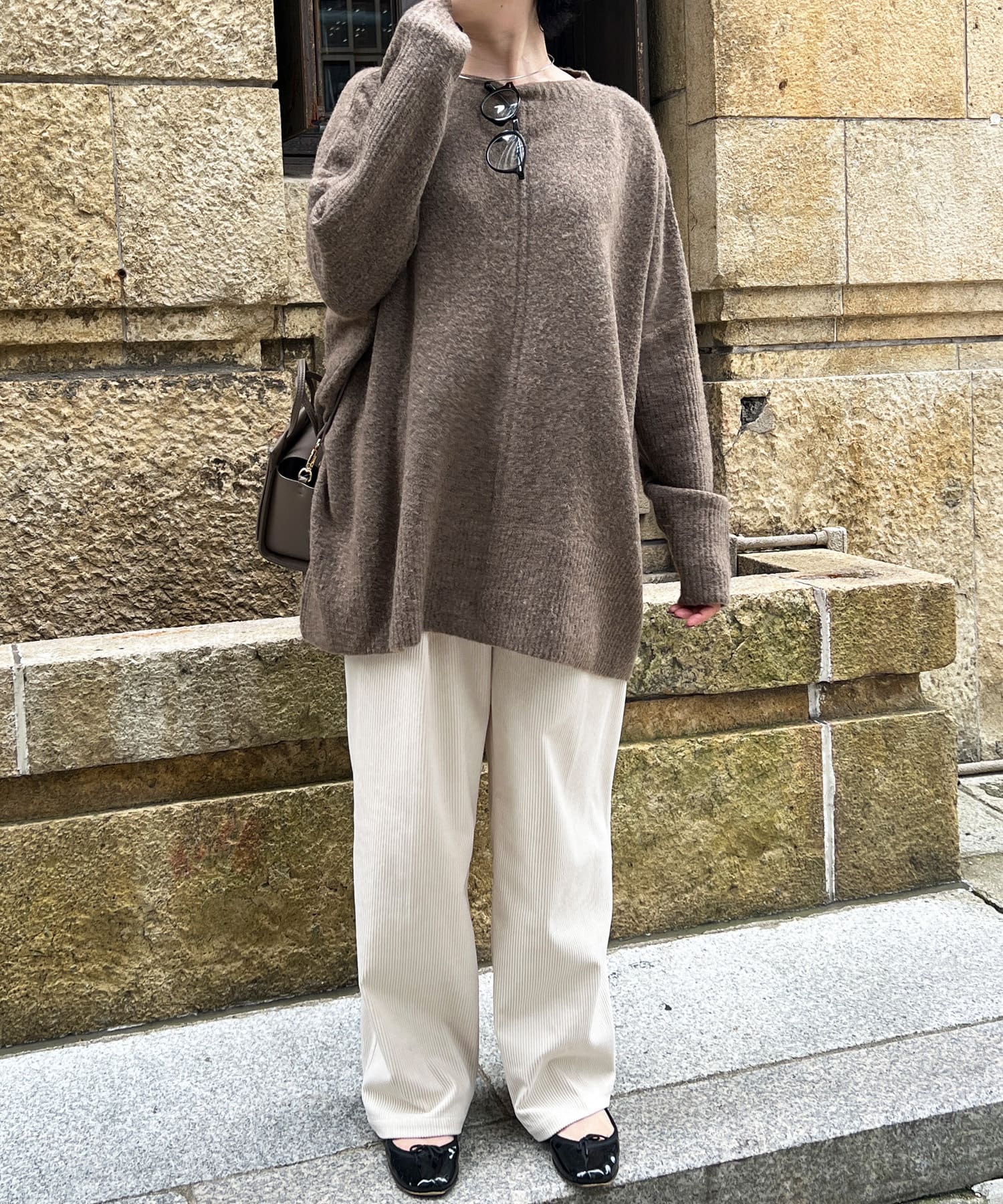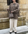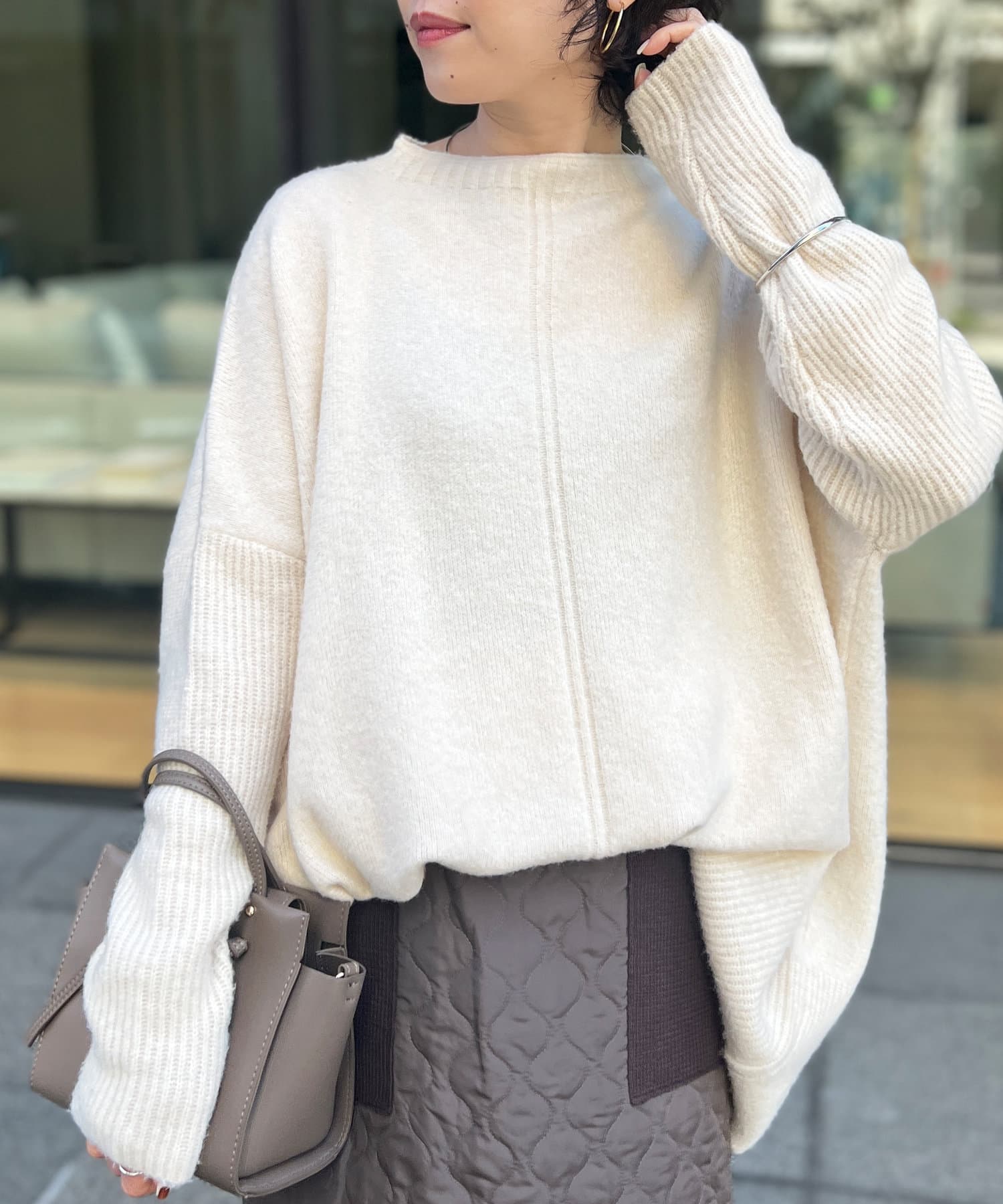 身幅のたっぷりとしたオーバーサイズに、袖はリブ編みのバランスの取れたシルエットに。大人カジュアルな雰囲気のあるコーディネートに仕上ります。