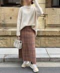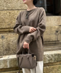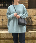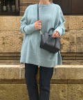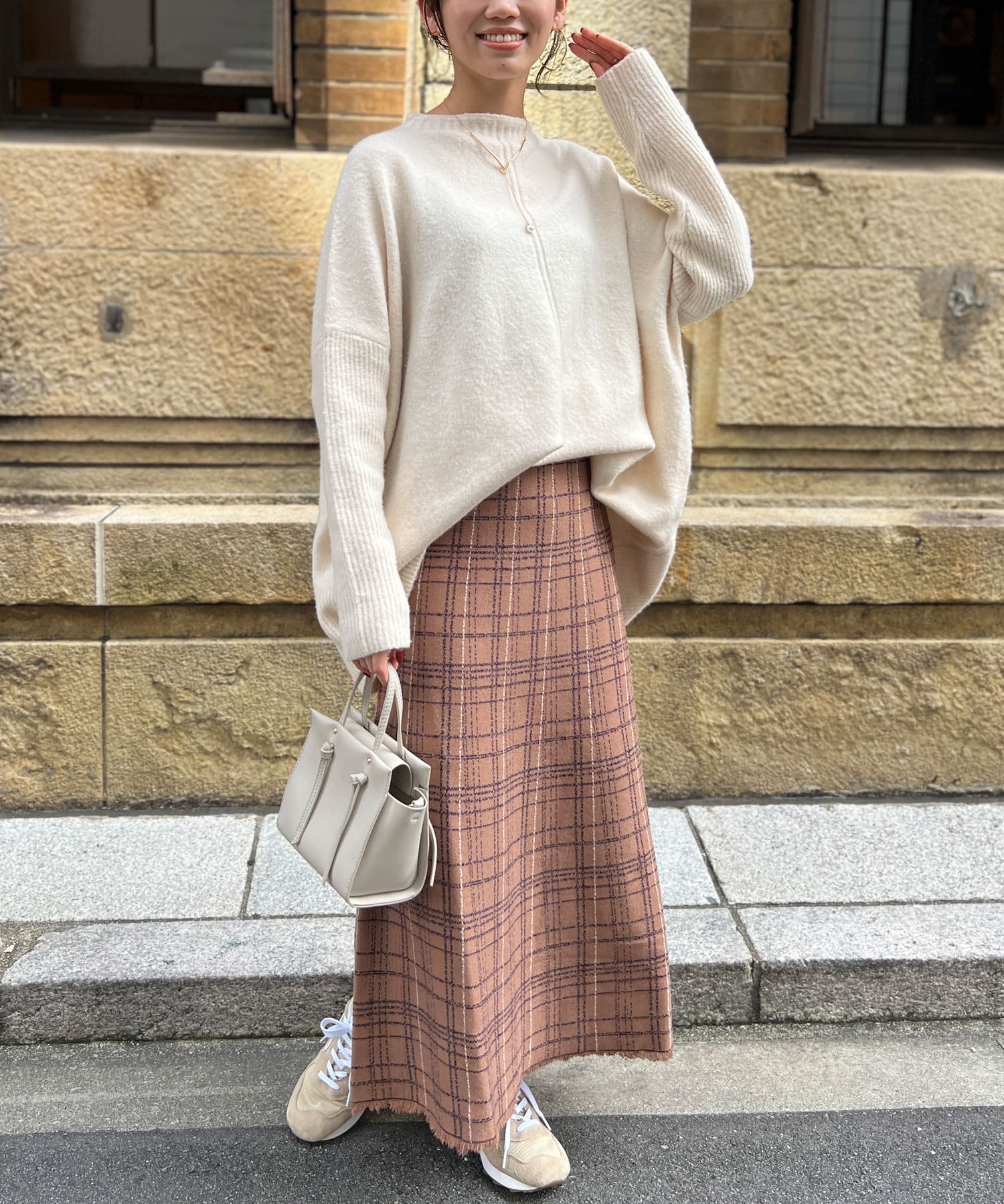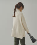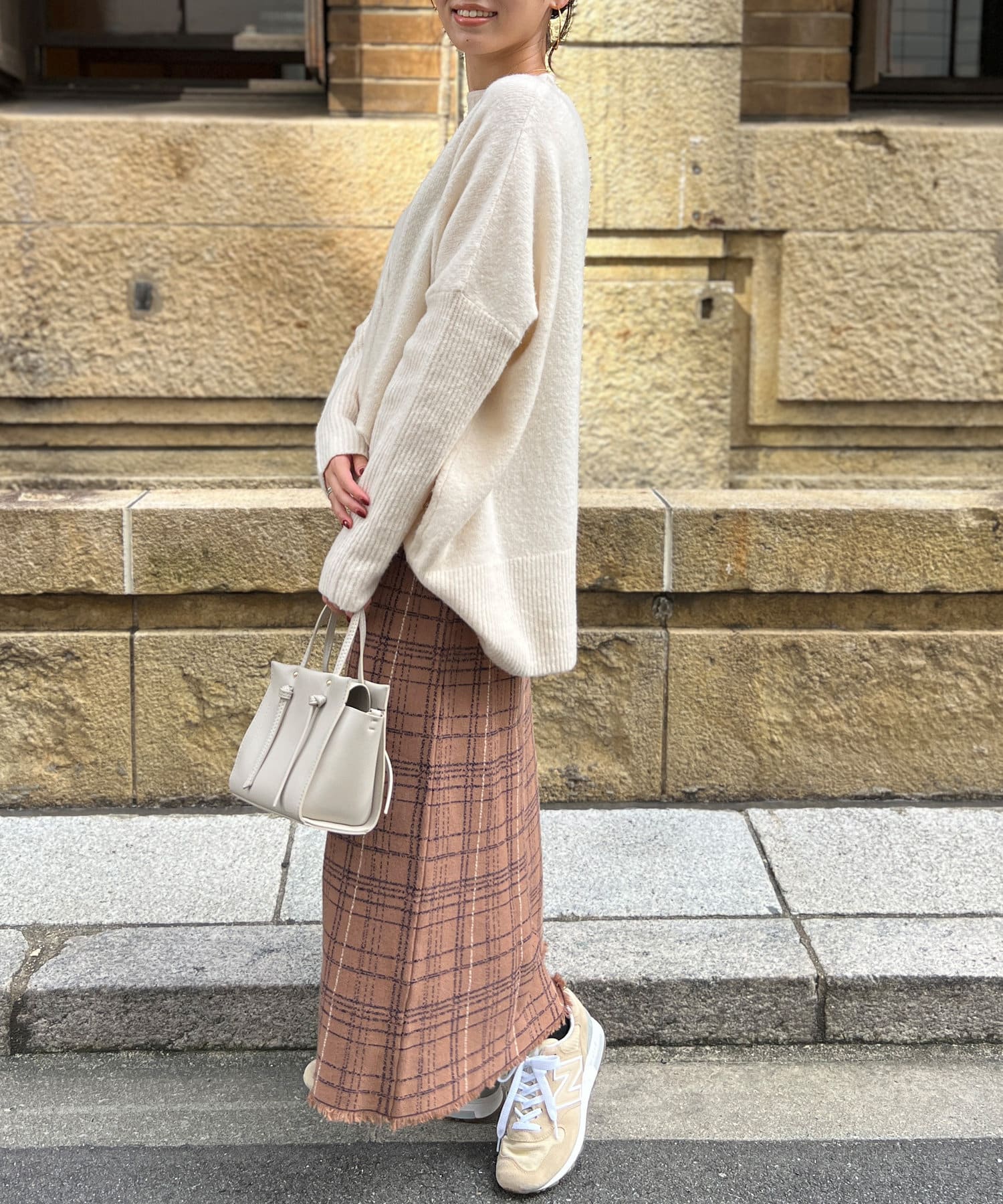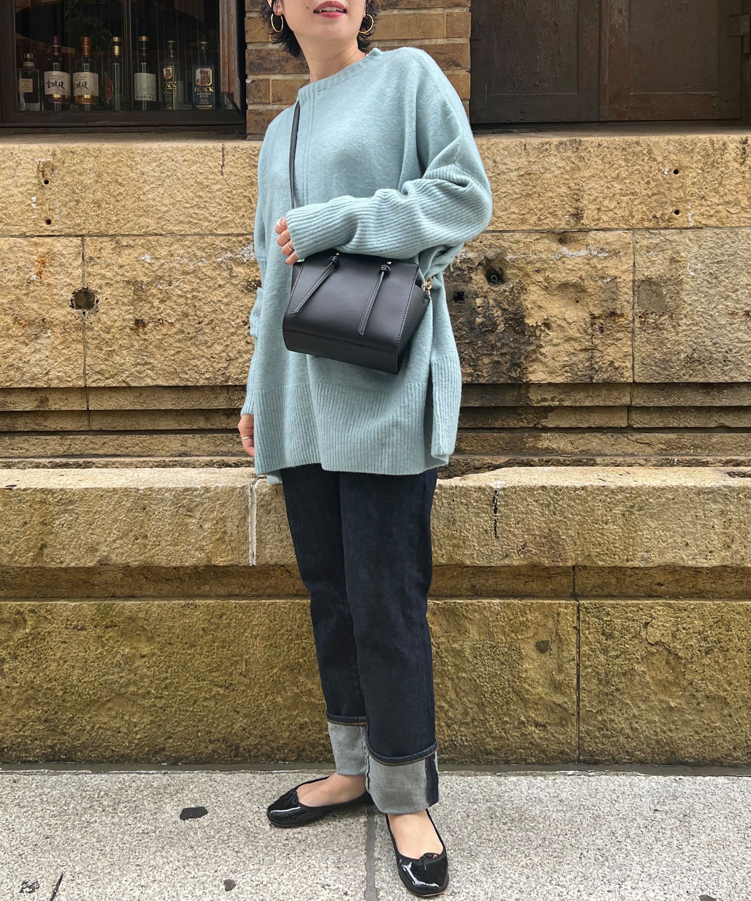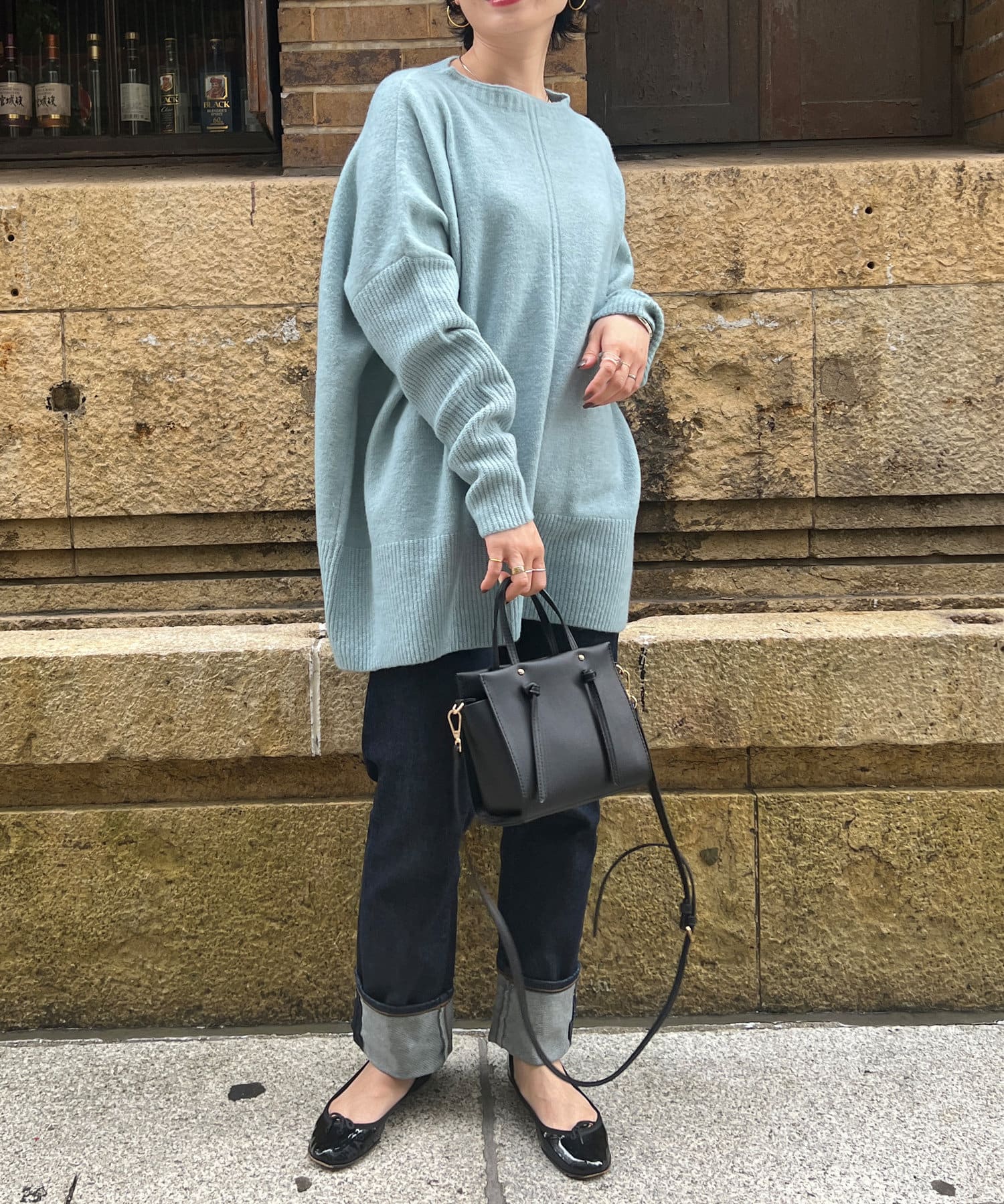 身幅のたっぷりとしたオーバーサイズに、袖はリブ編みのバランスの取れたシルエットに。大人カジュアルな雰囲気のあるコーディネートに仕上ります。