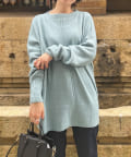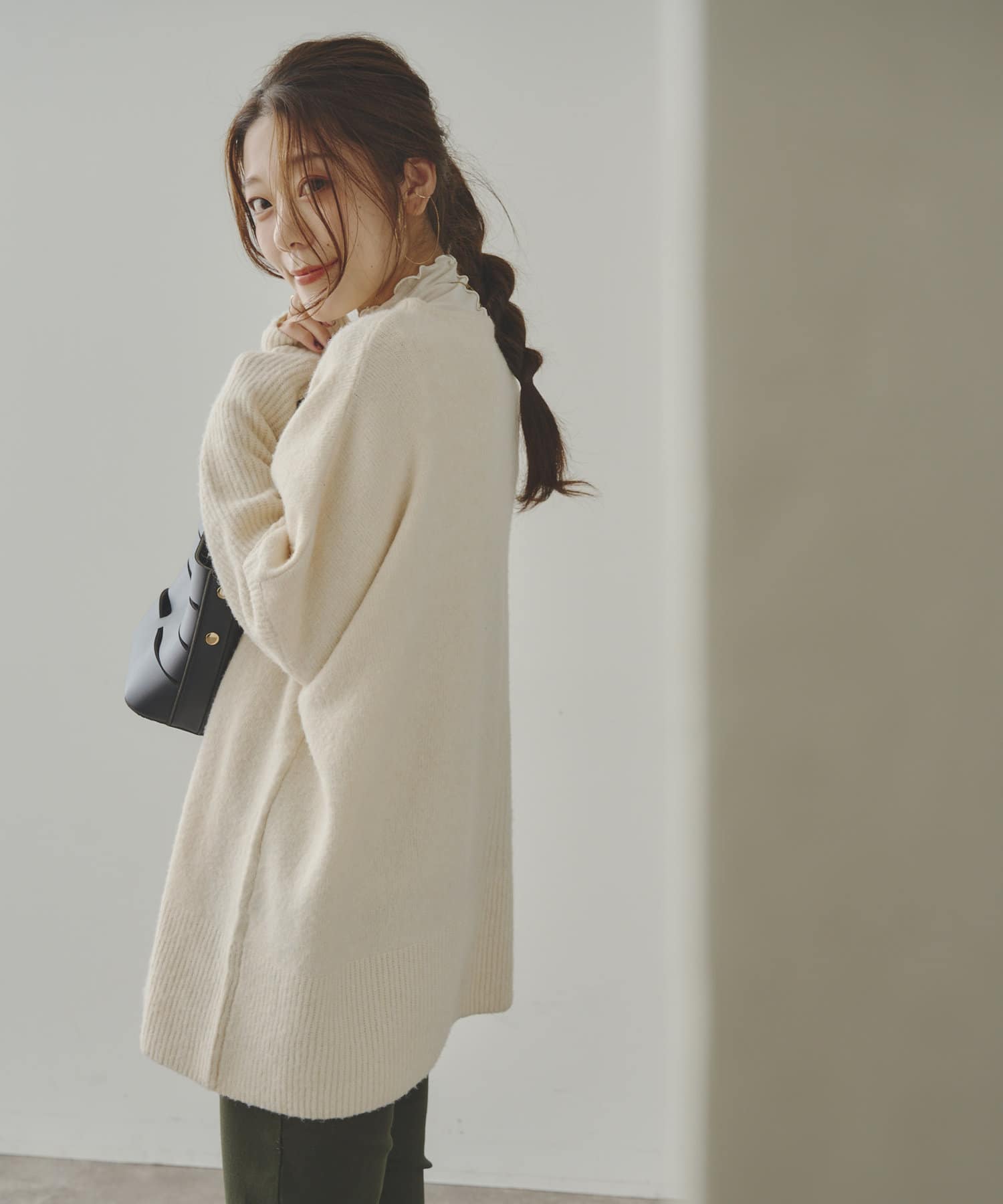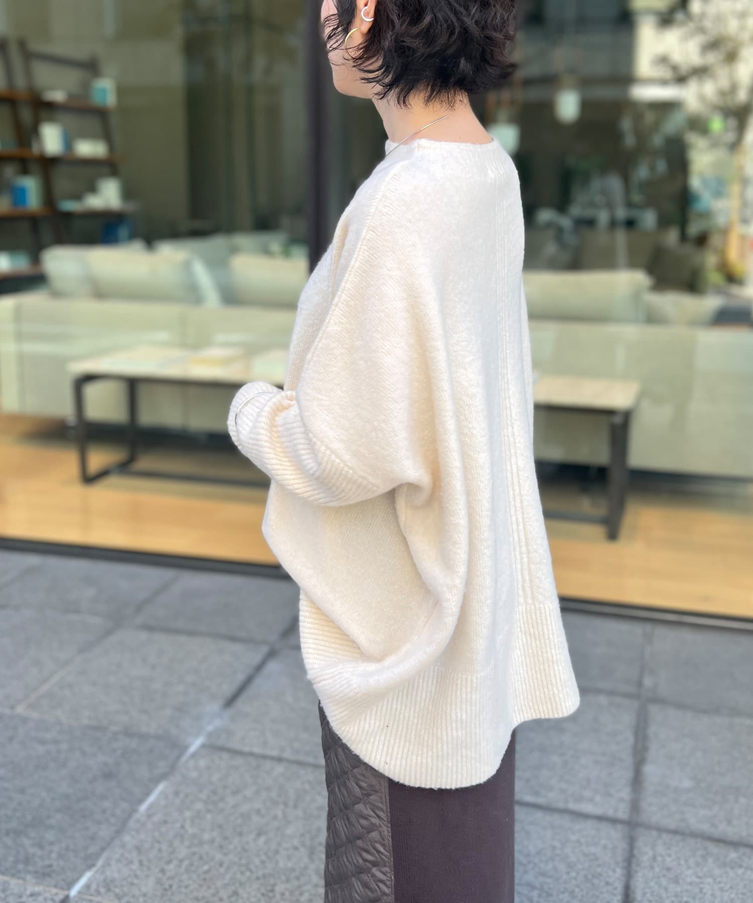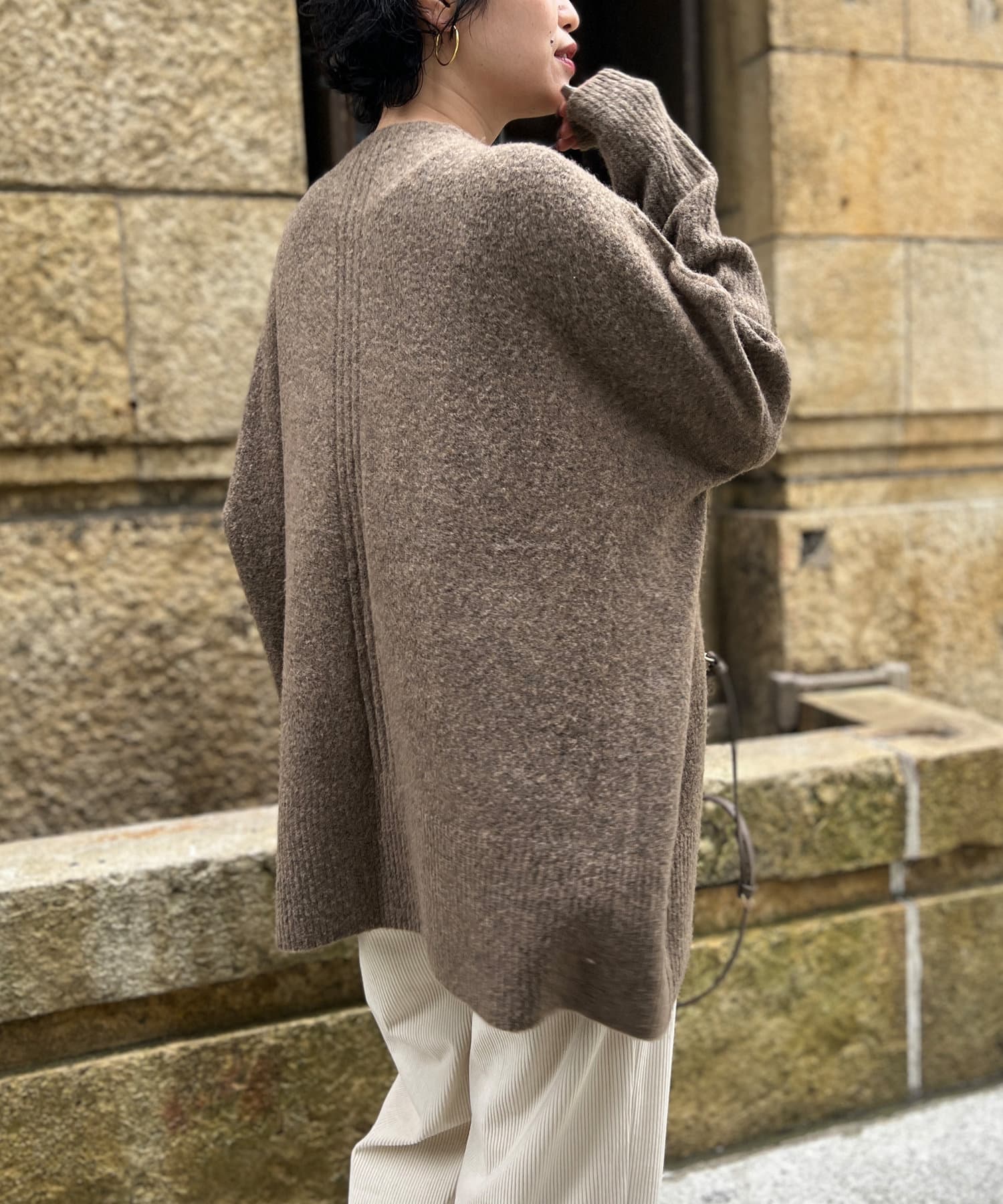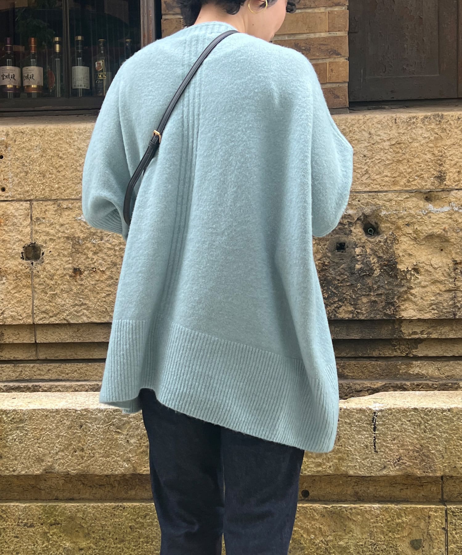 前中心と後ろ中心に柄編みをライン状に入れているので、ドルマンスリーブのボリューム感がありながらもすっきりとした印象に見せてくれるのも嬉しいポイント!