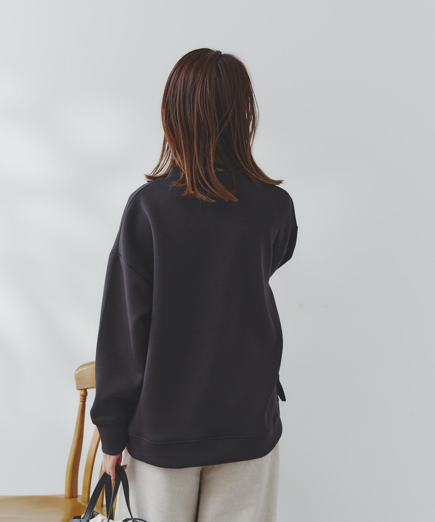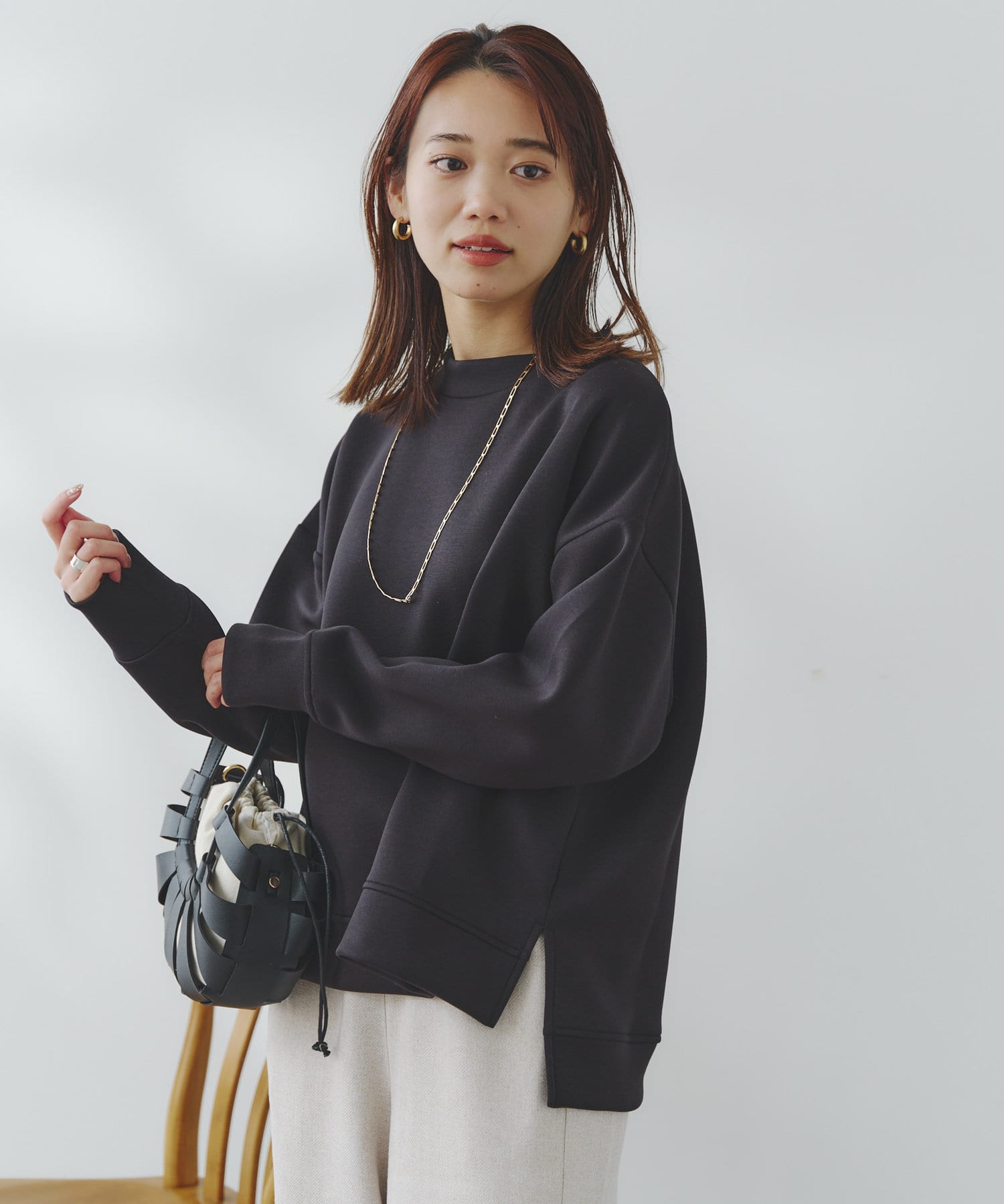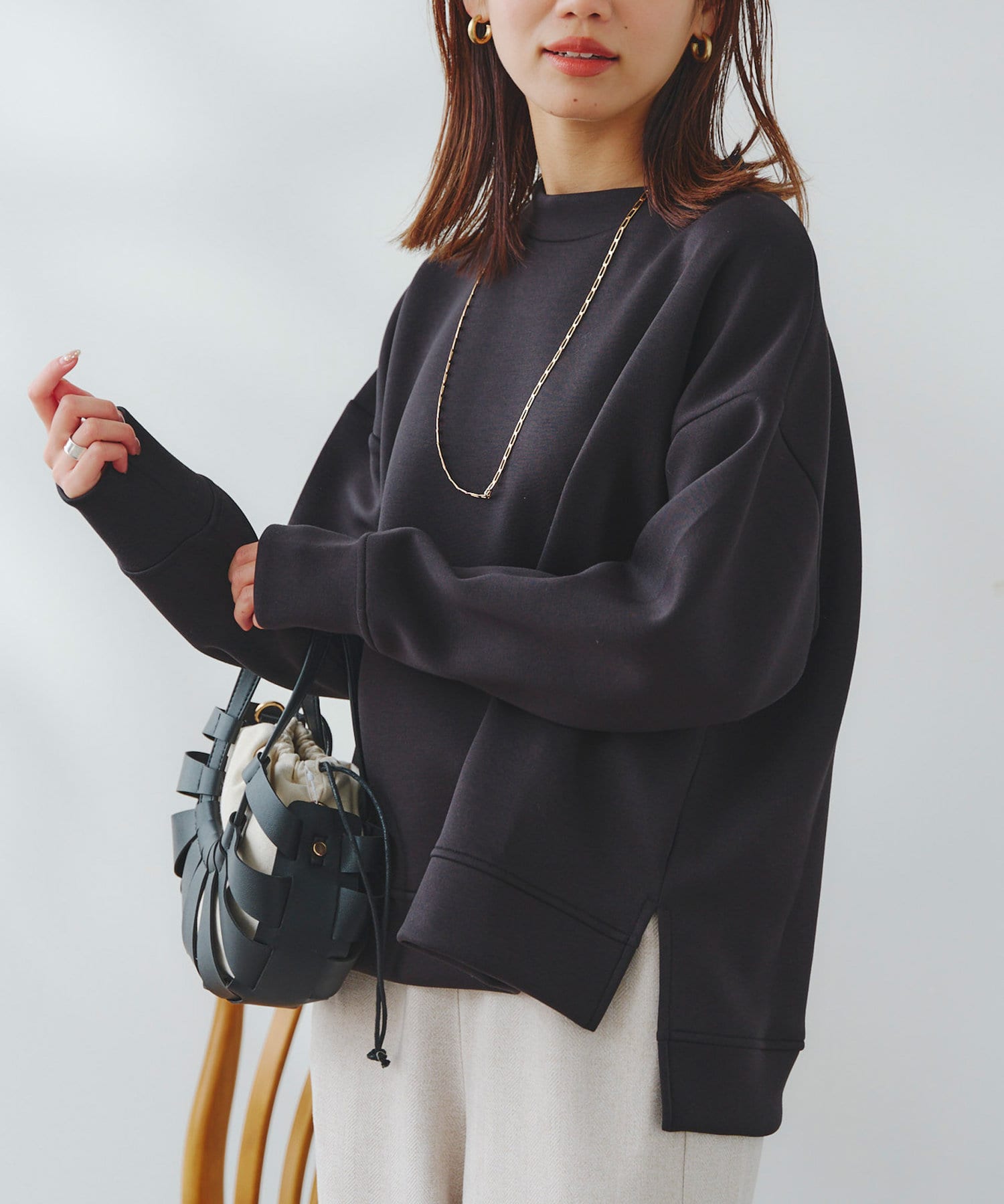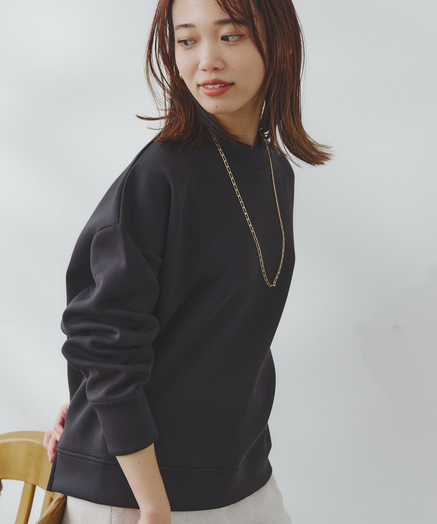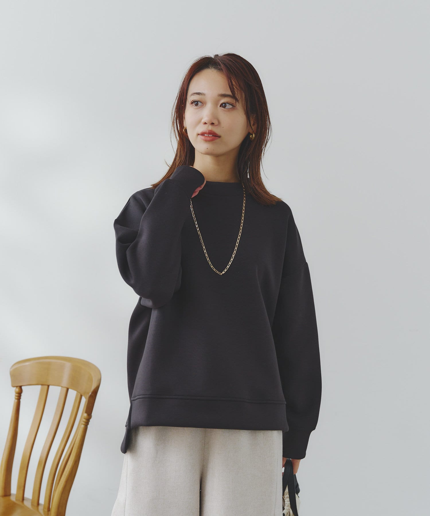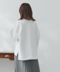 ややハイネックな首回りとサイドのスリットによる前後の丈差がベーシックながらもアクセントに。