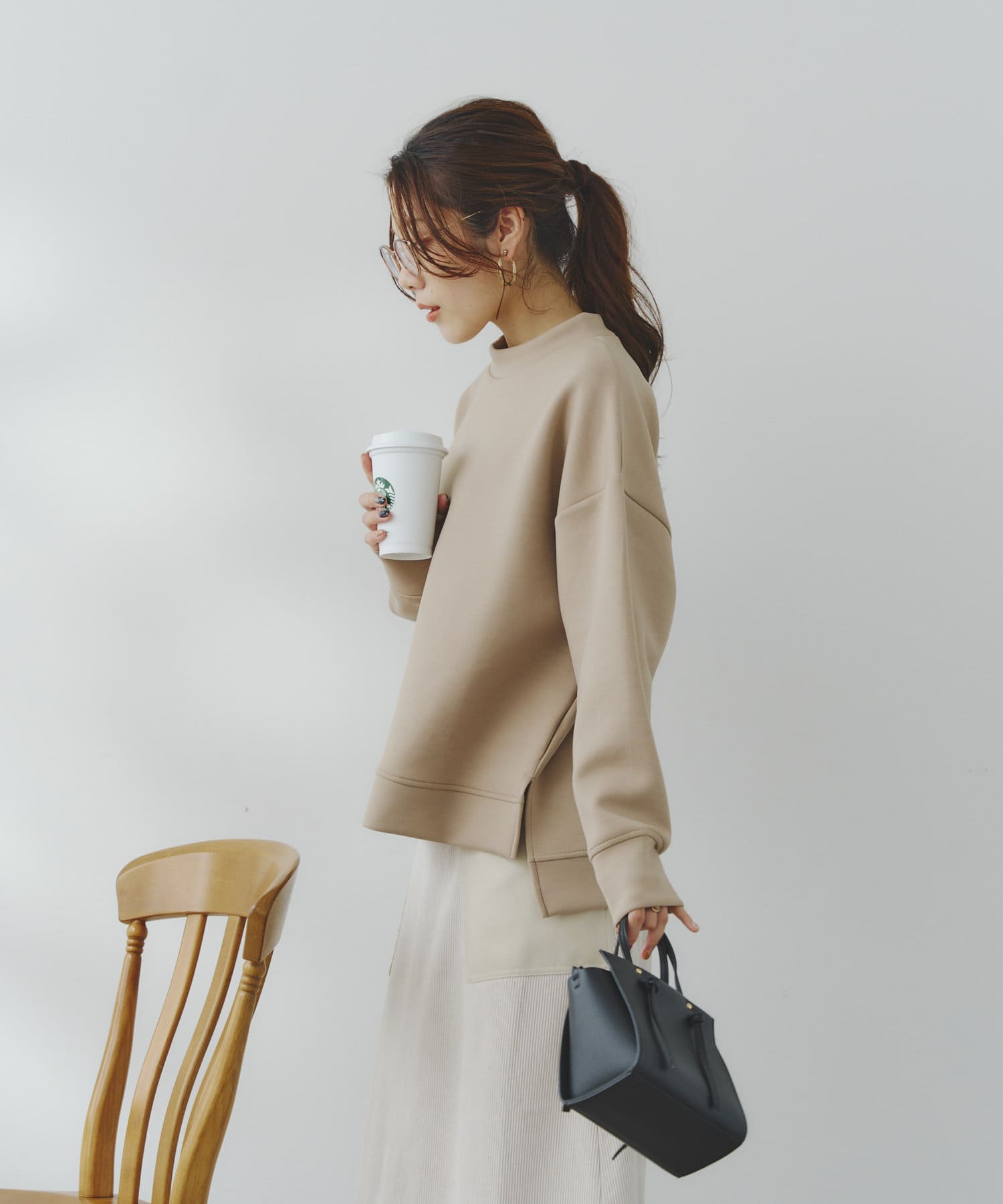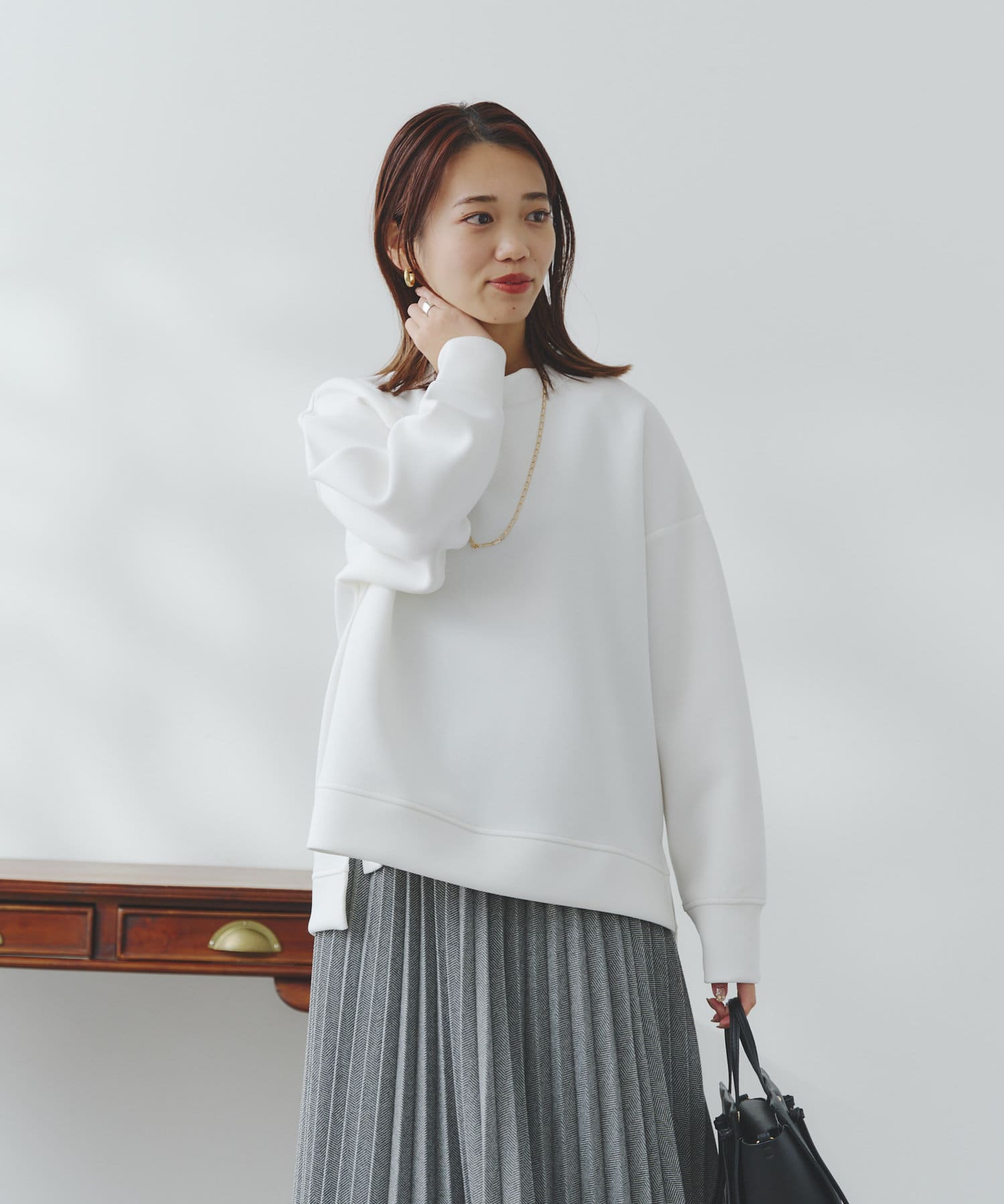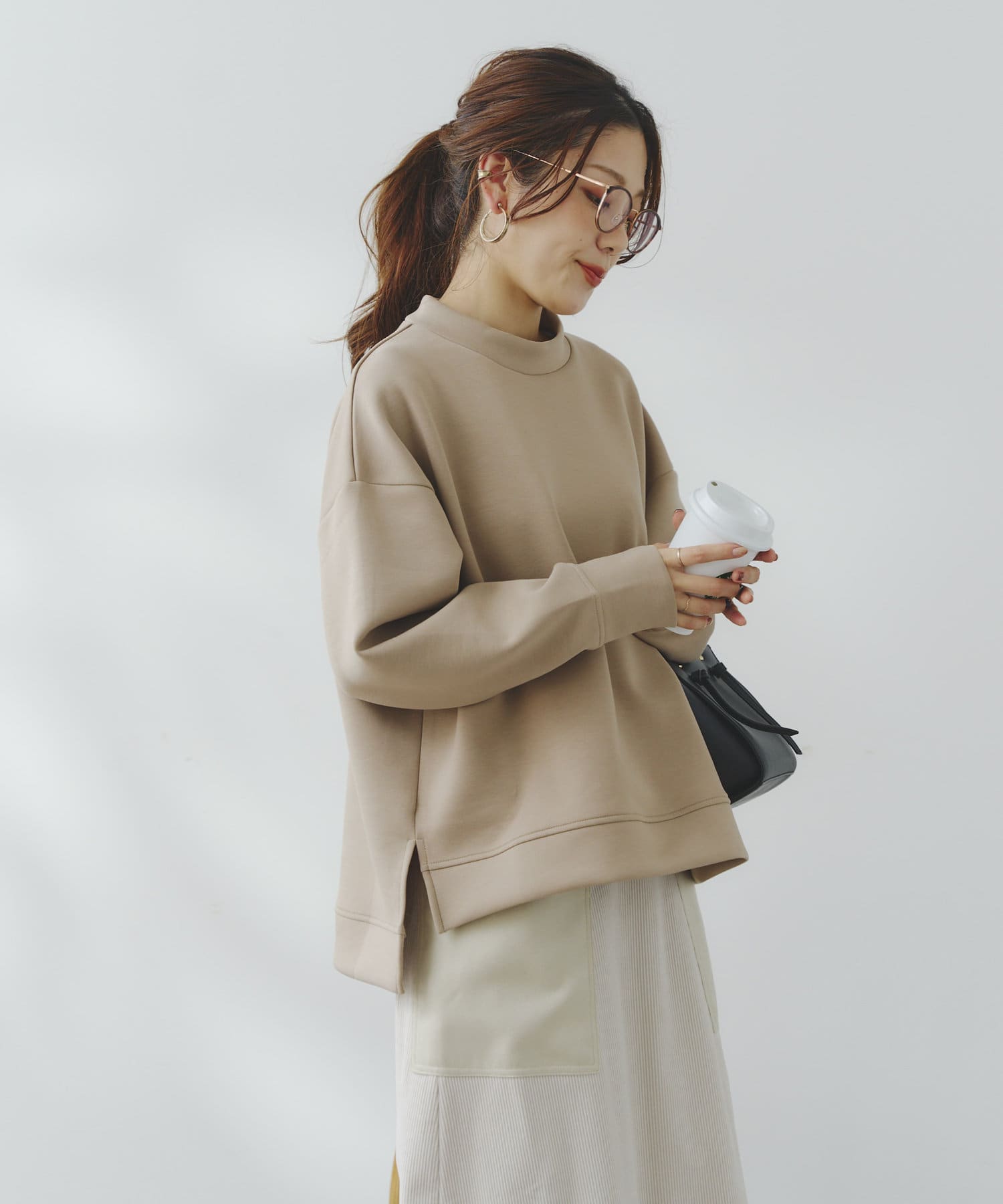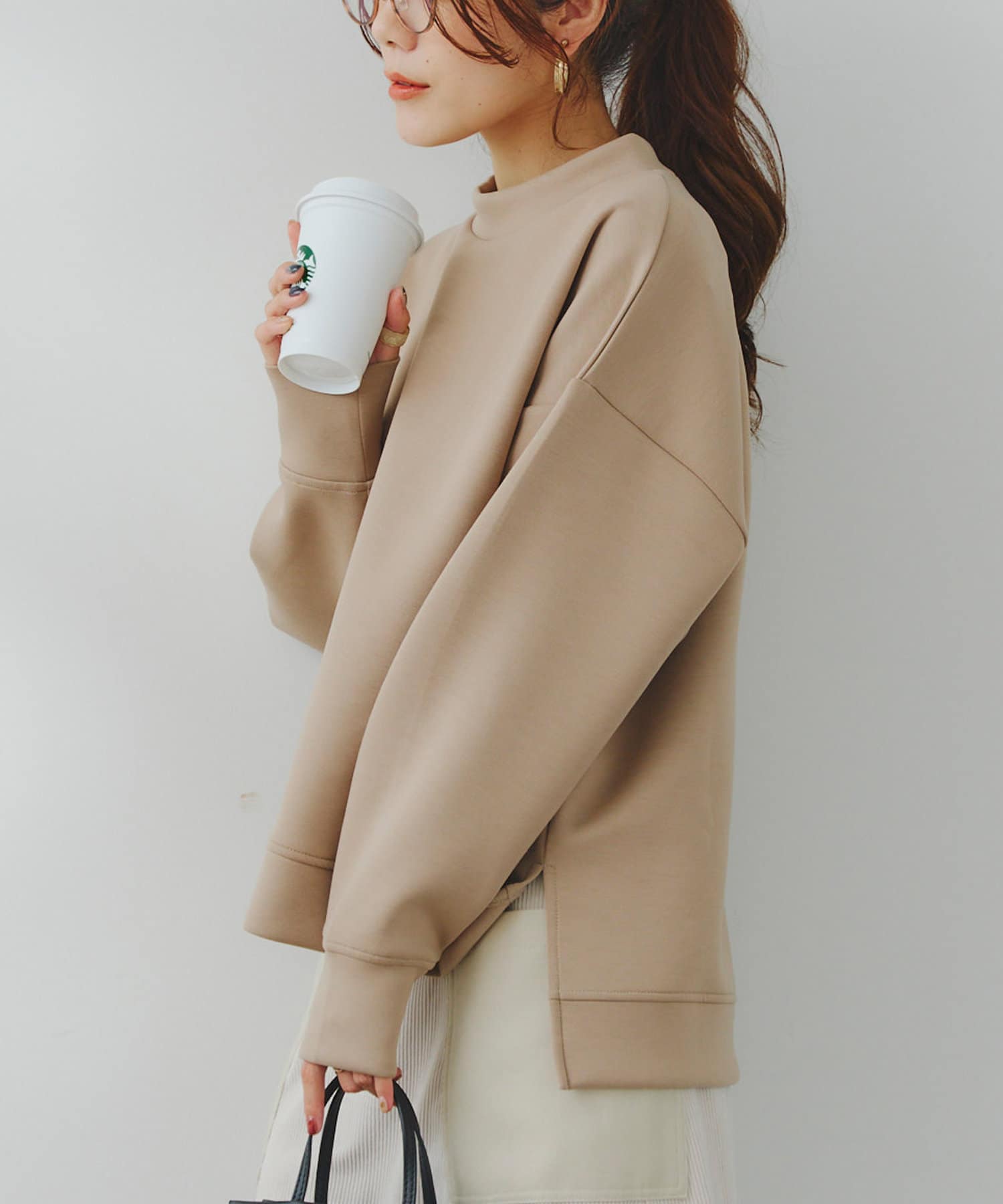 ややハイネックな首回りとサイドのスリットによる前後の丈差がベーシックながらもアクセントに。
