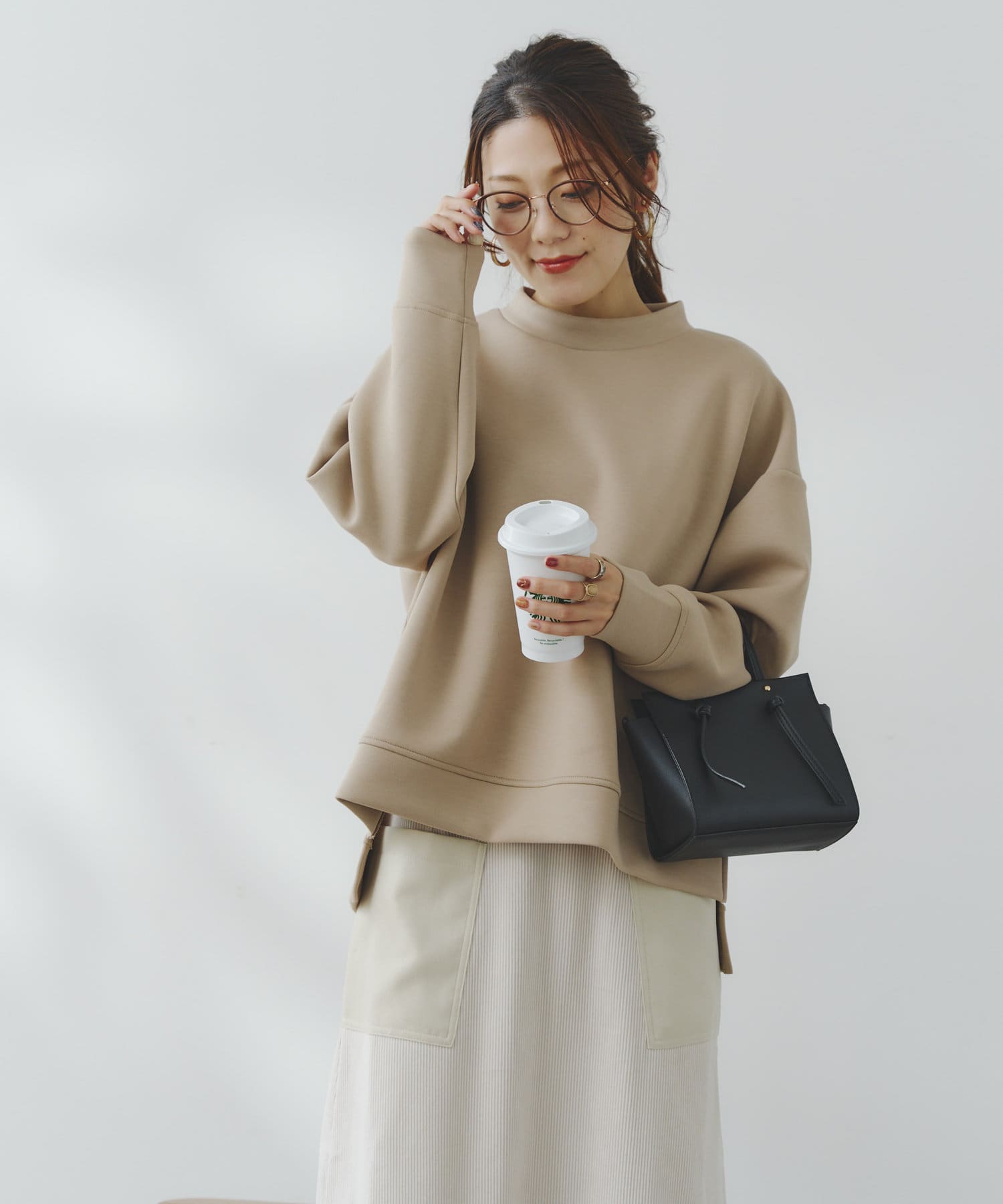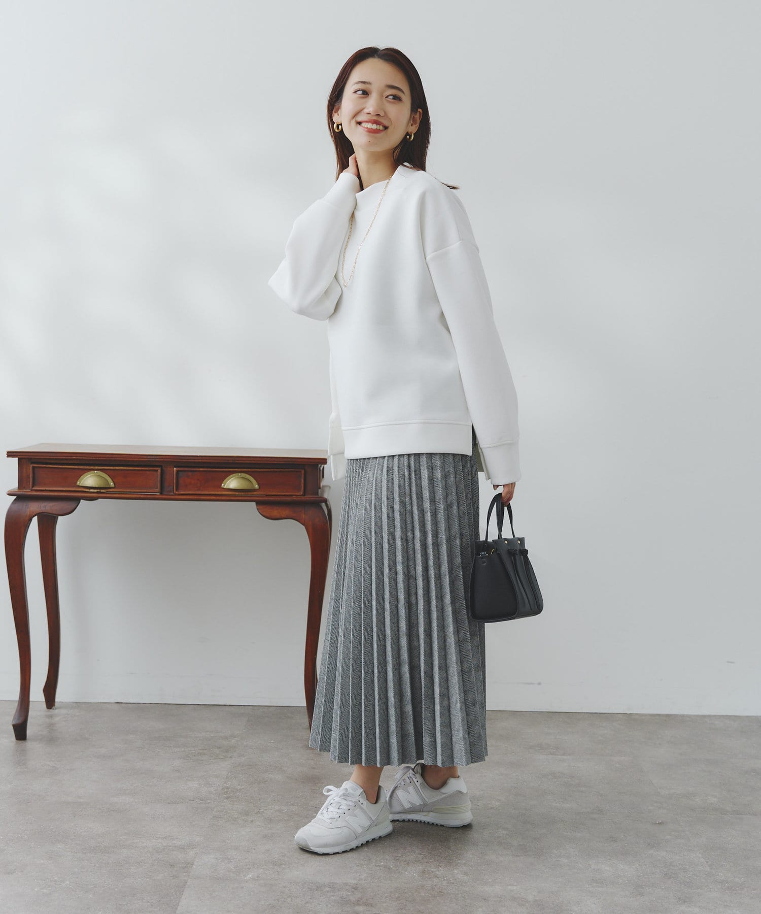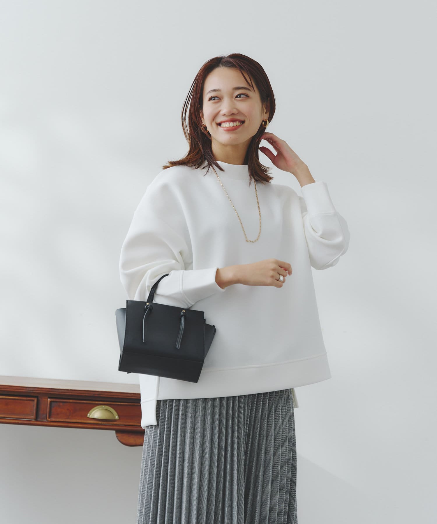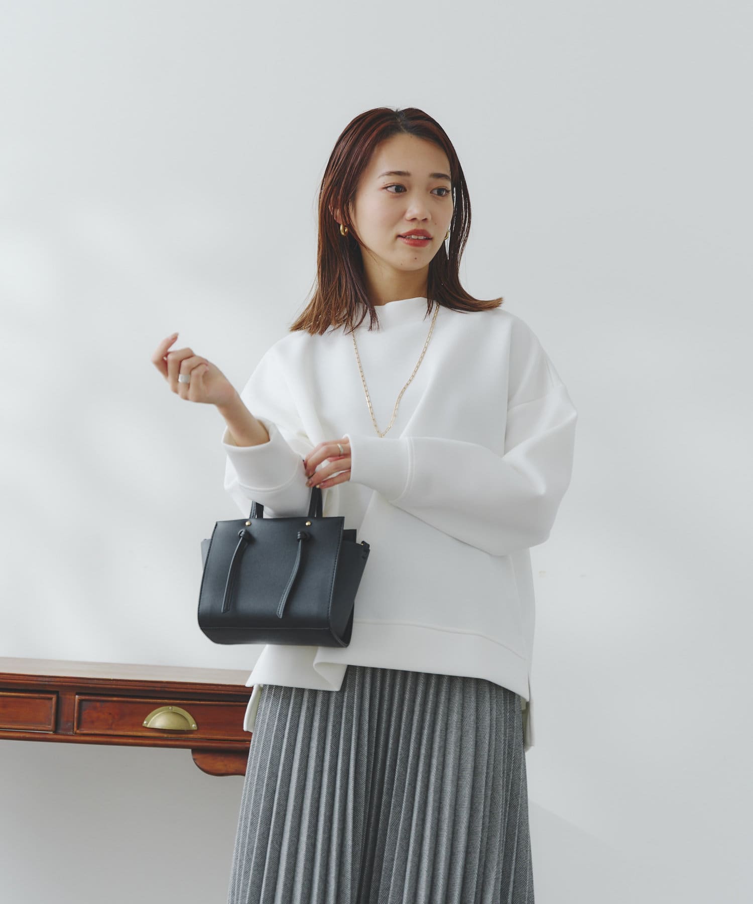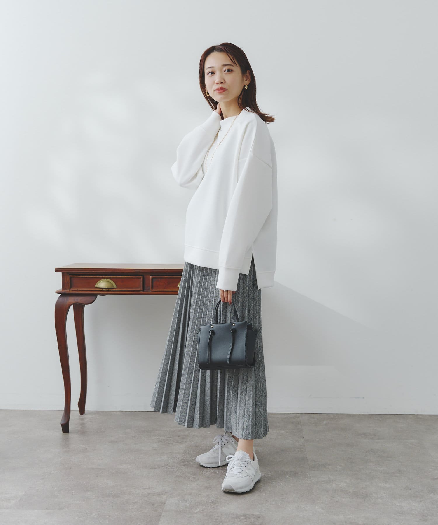 ややハイネックな首回りとサイドのスリットによる前後の丈差がベーシックながらもアクセントに。