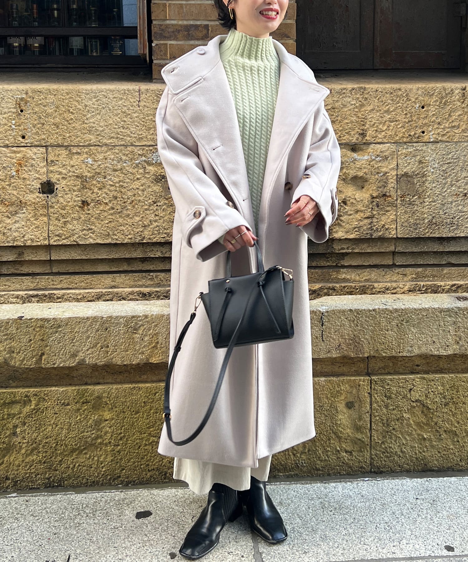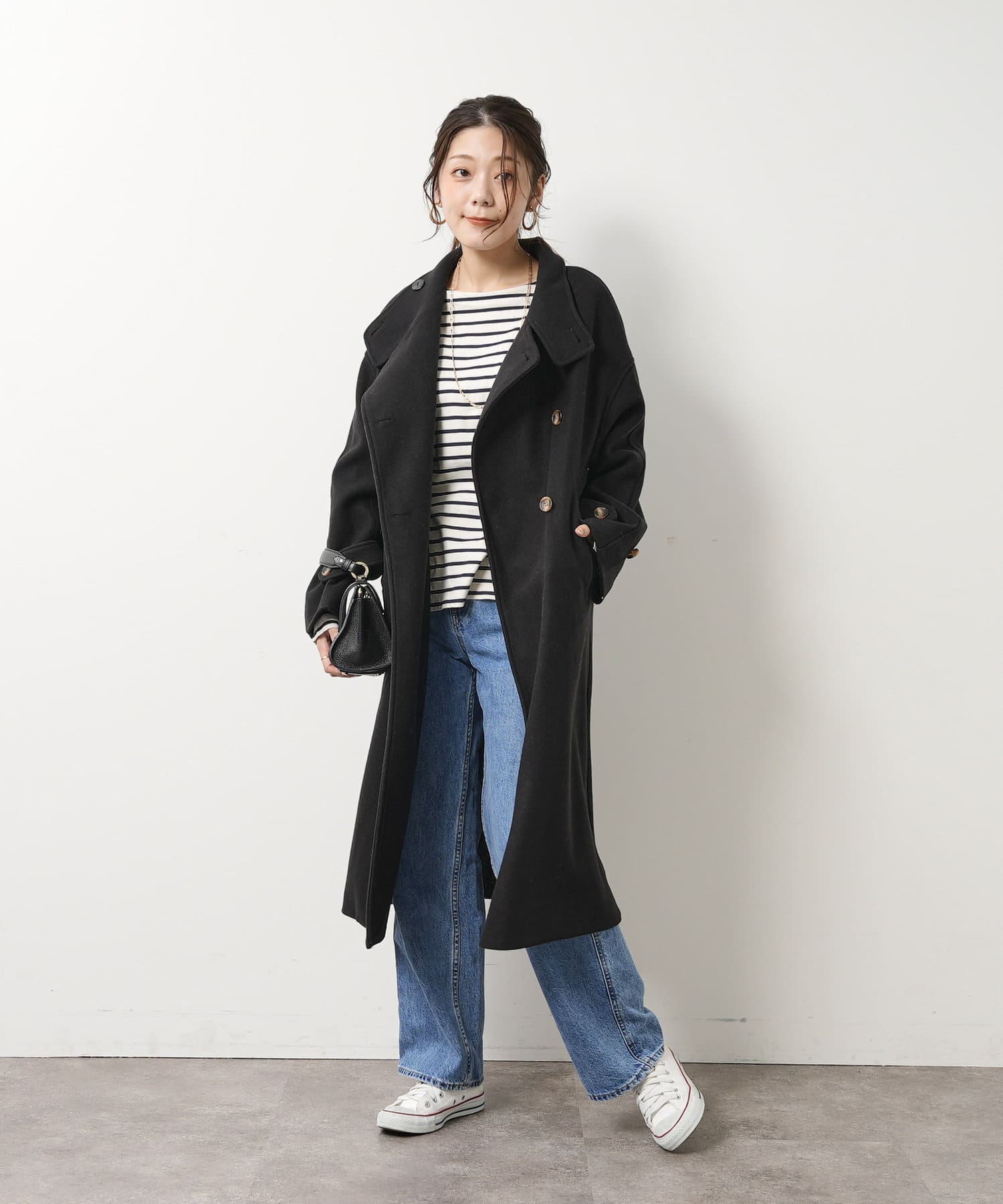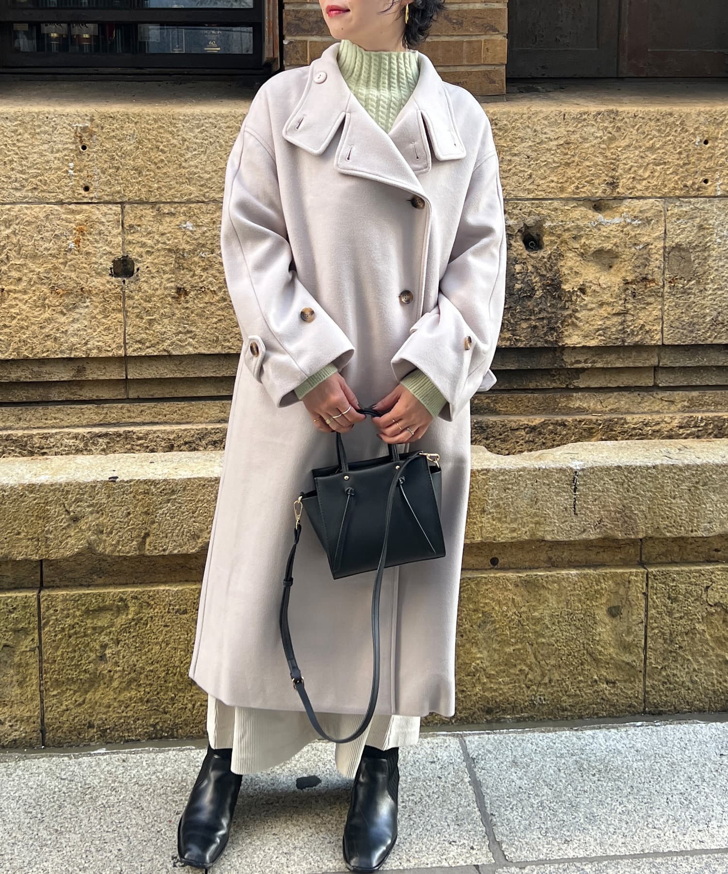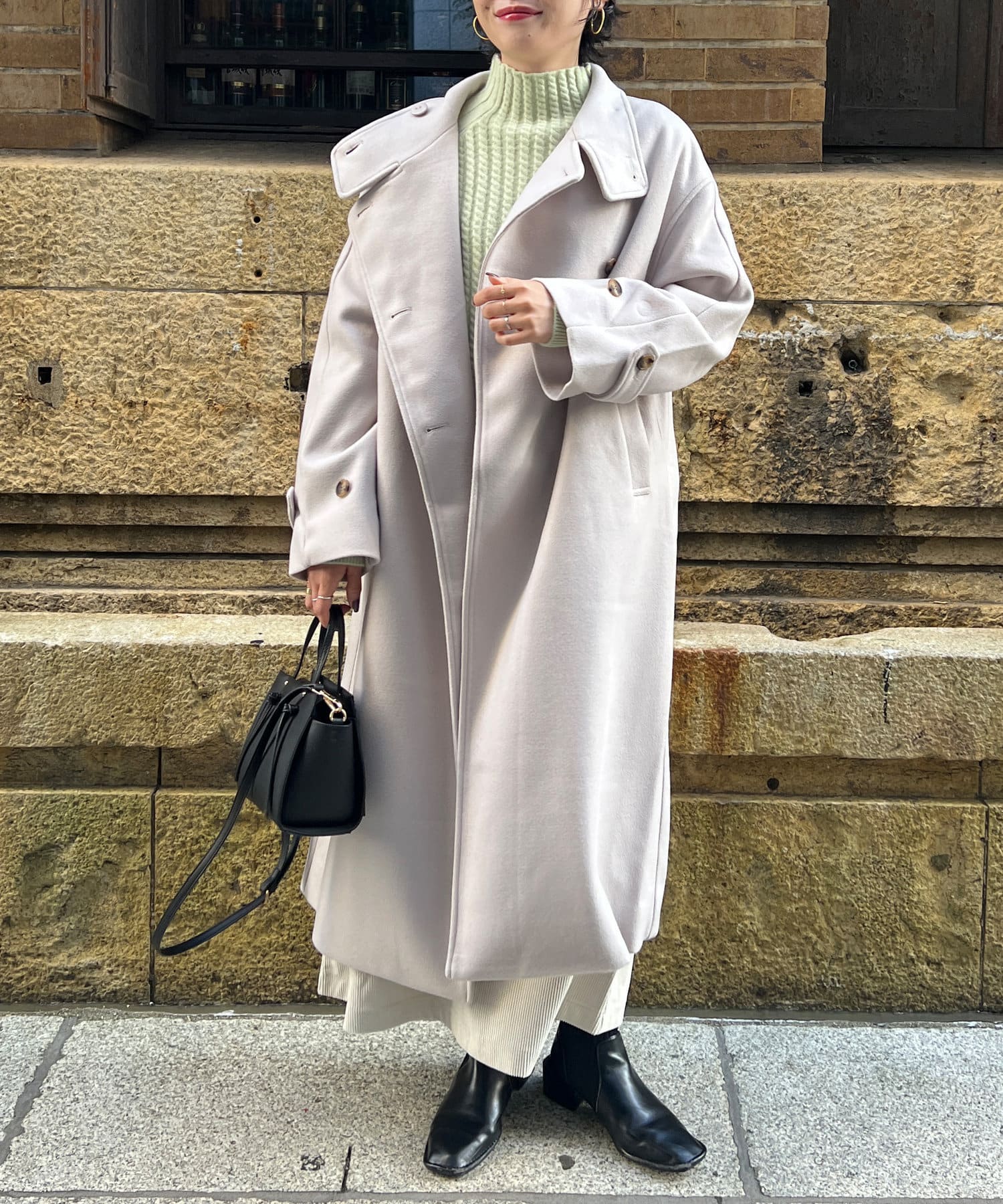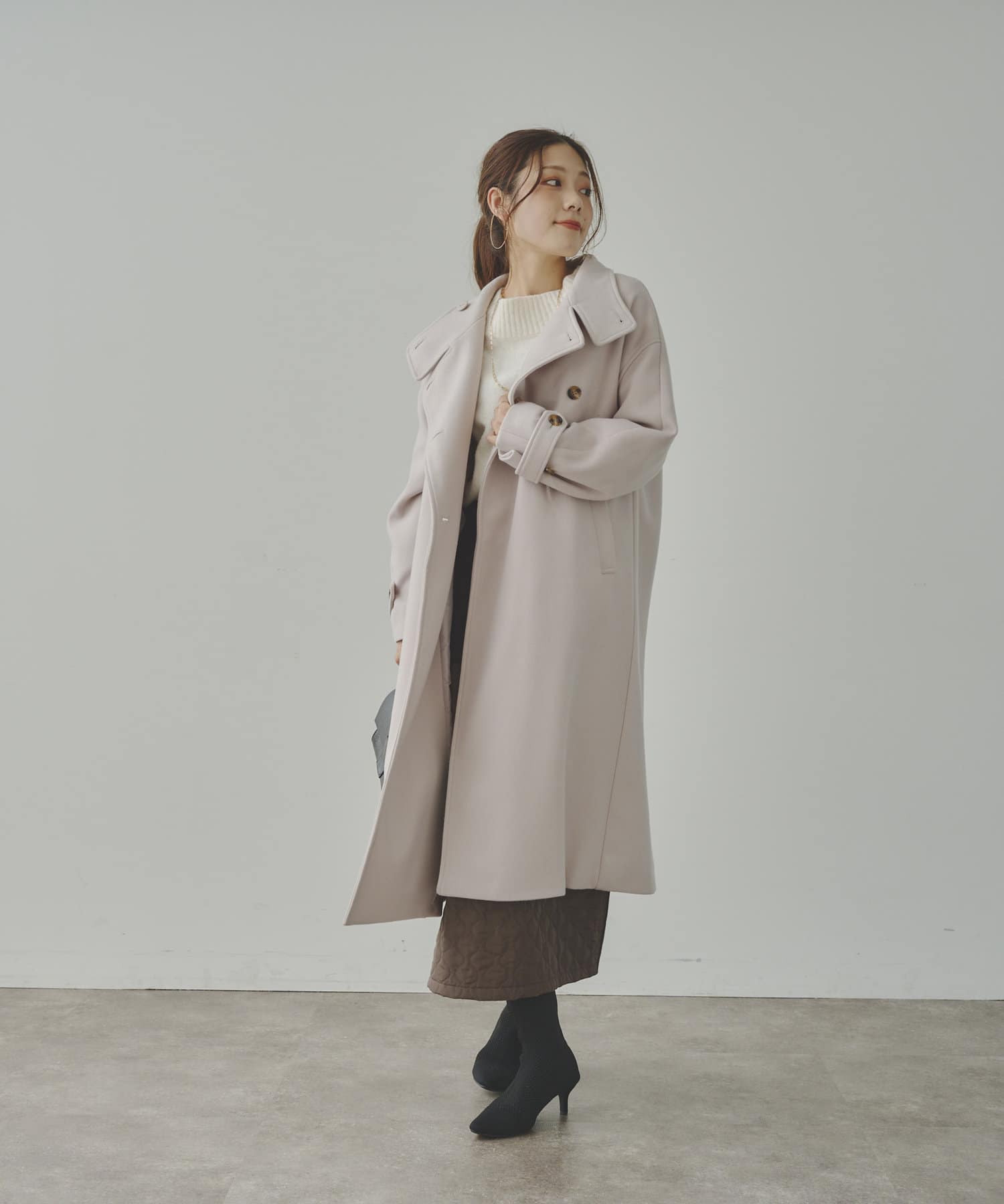 ベーシックなロングコートなので、どんなコーディネートにもマッチします。