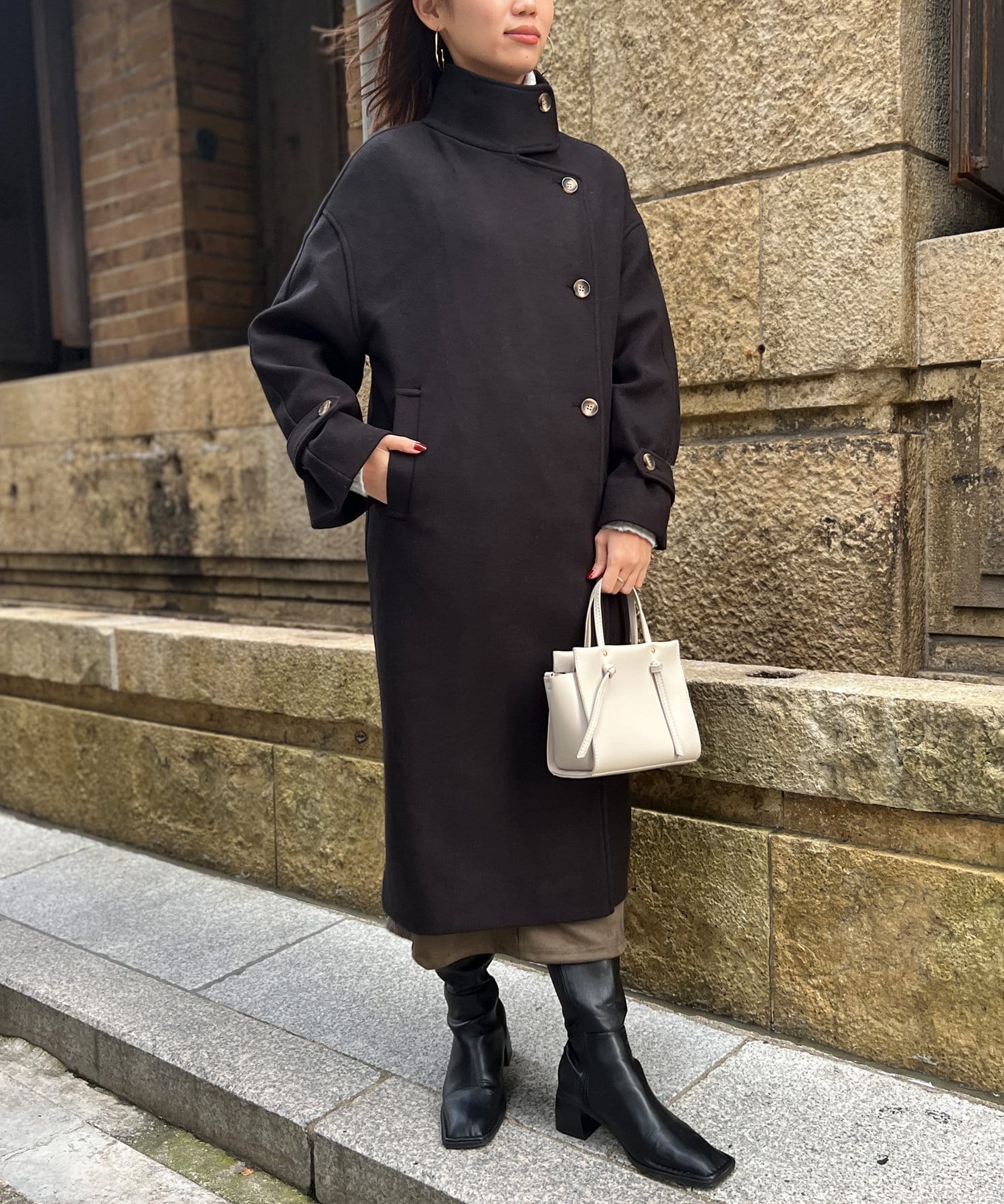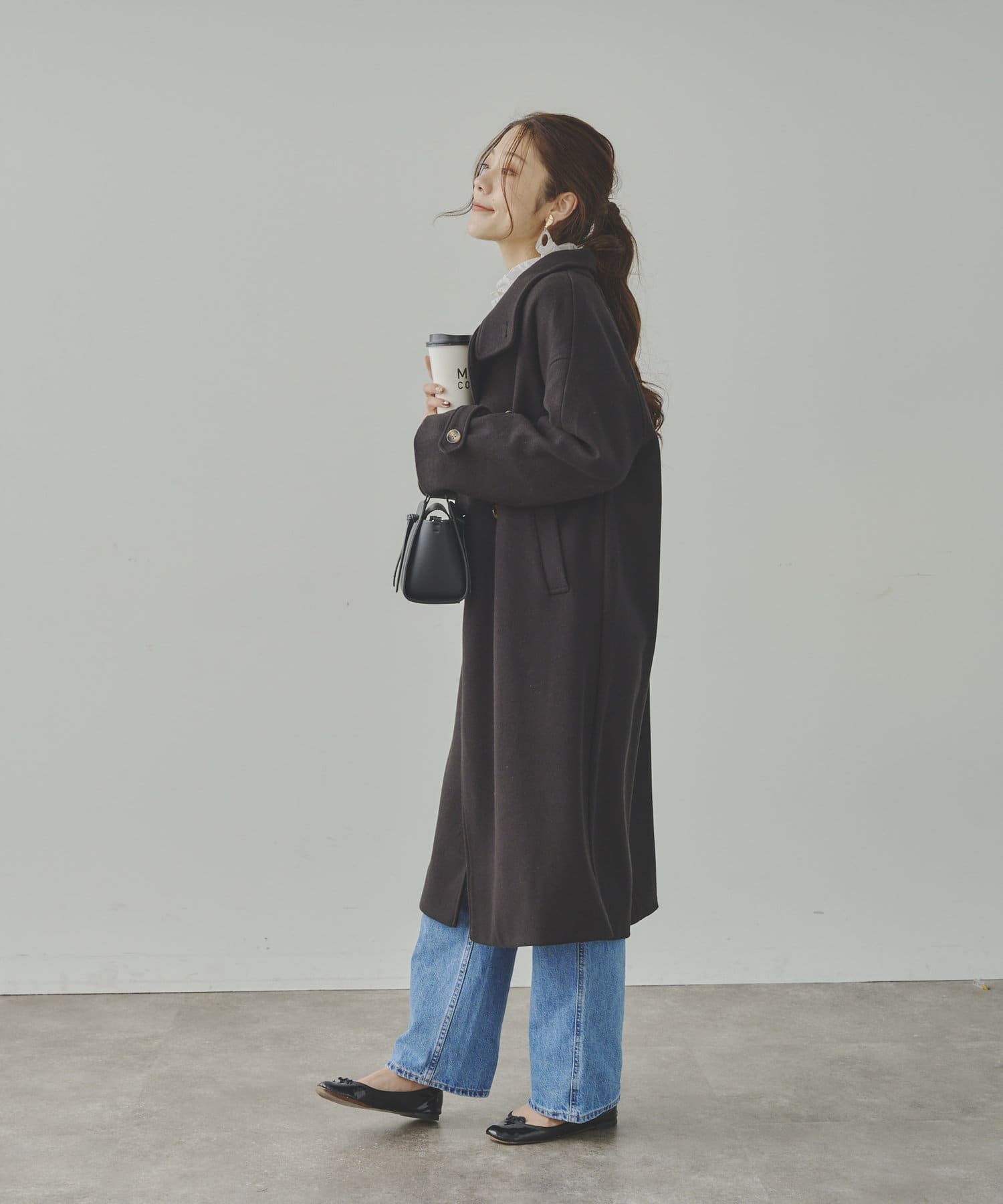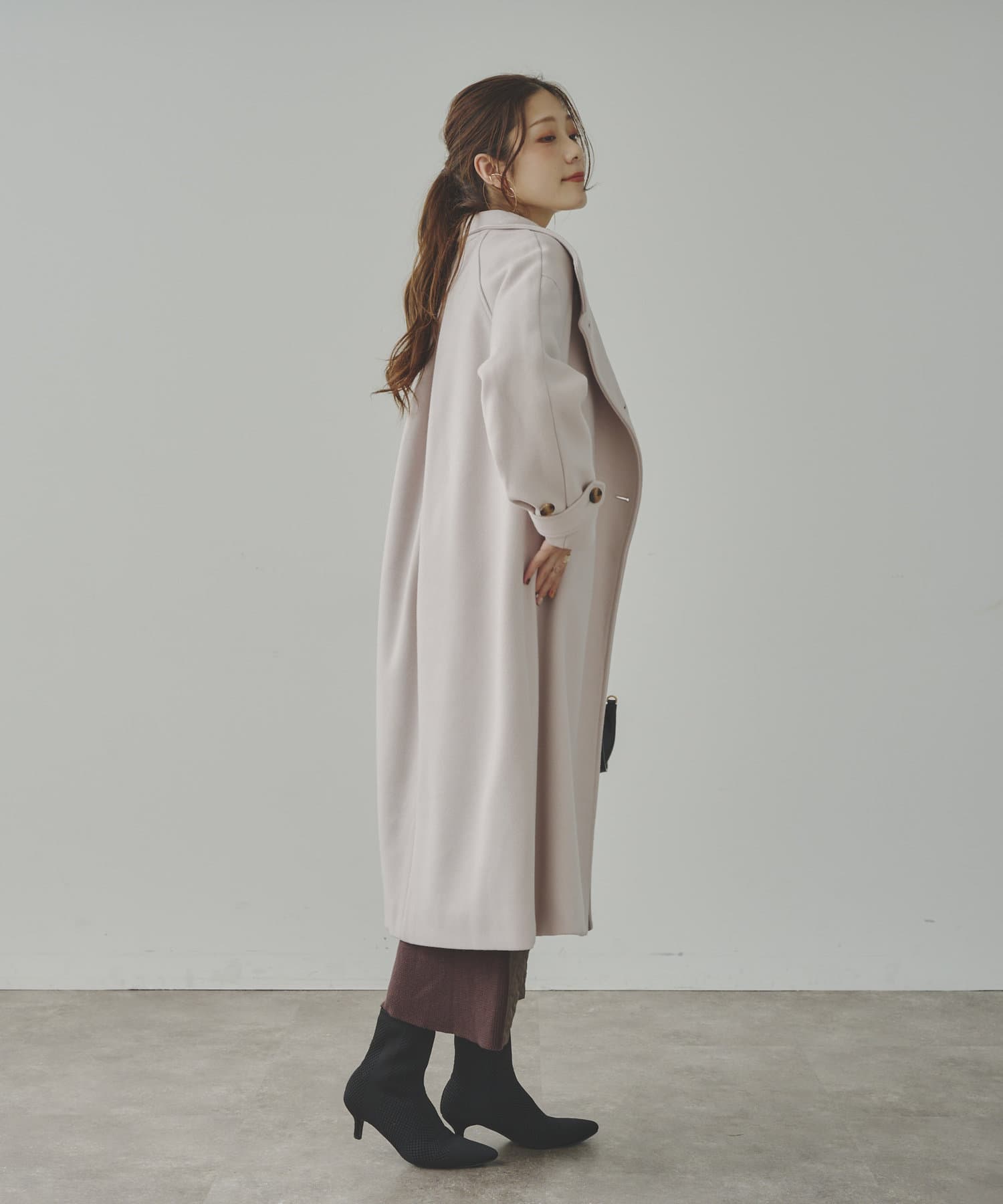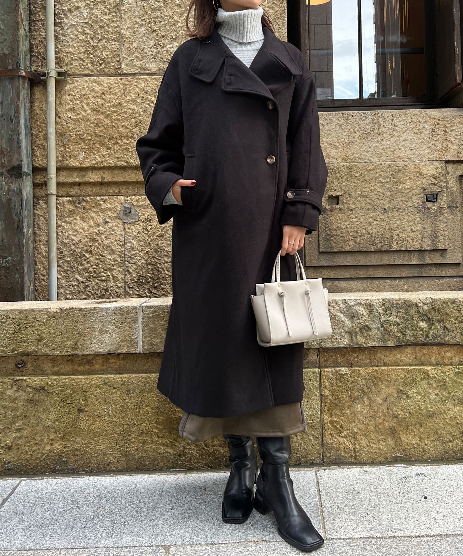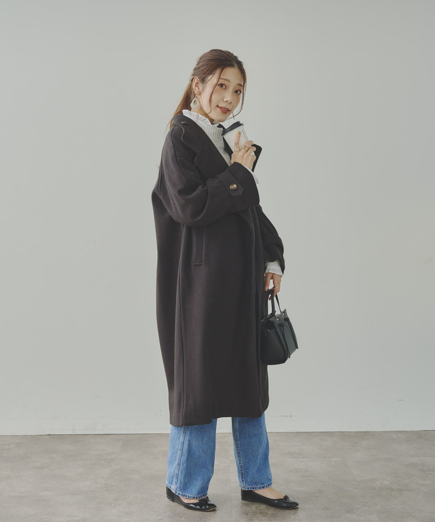 ベーシックなロングコートなので、どんなコーディネートにもマッチします。