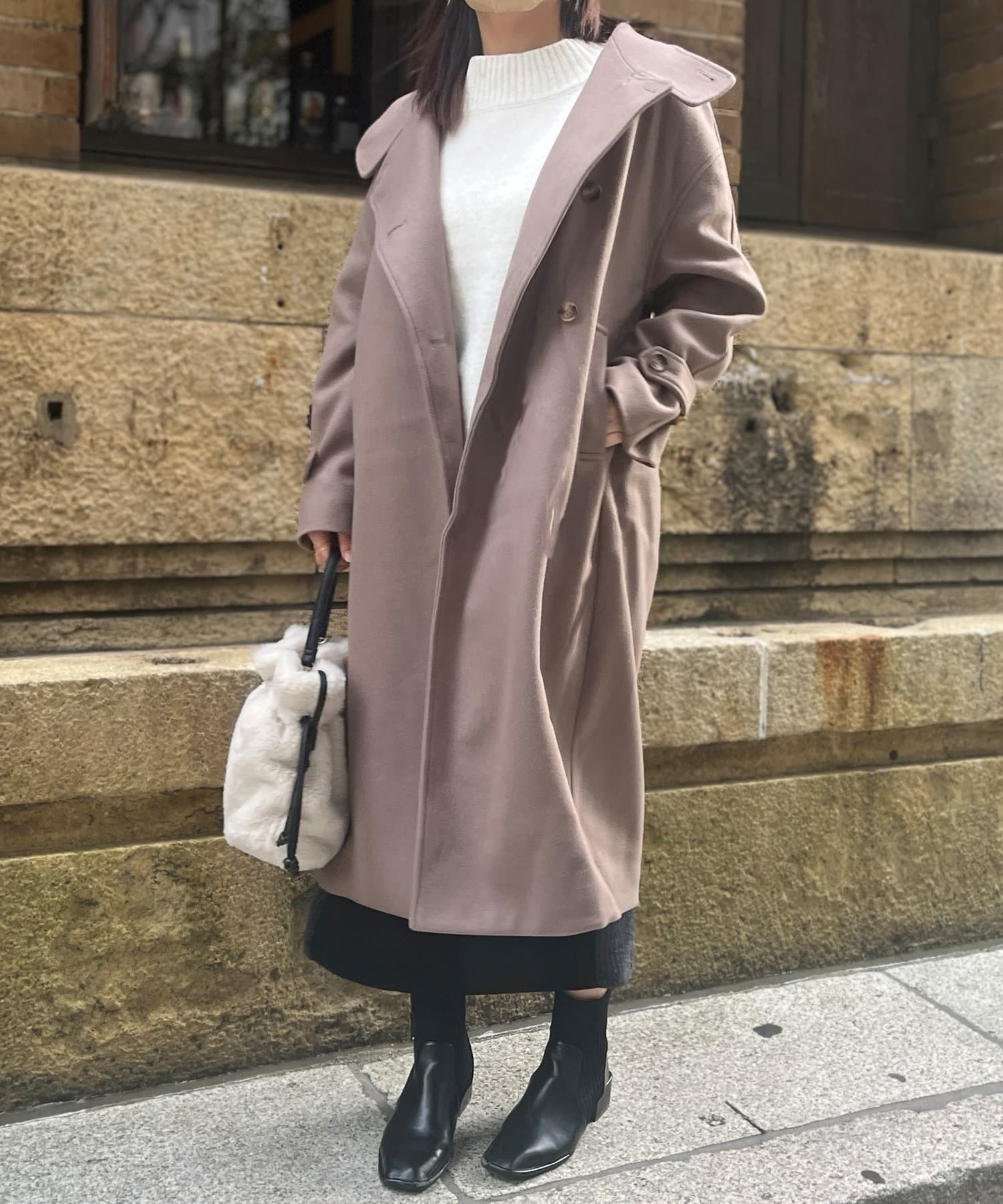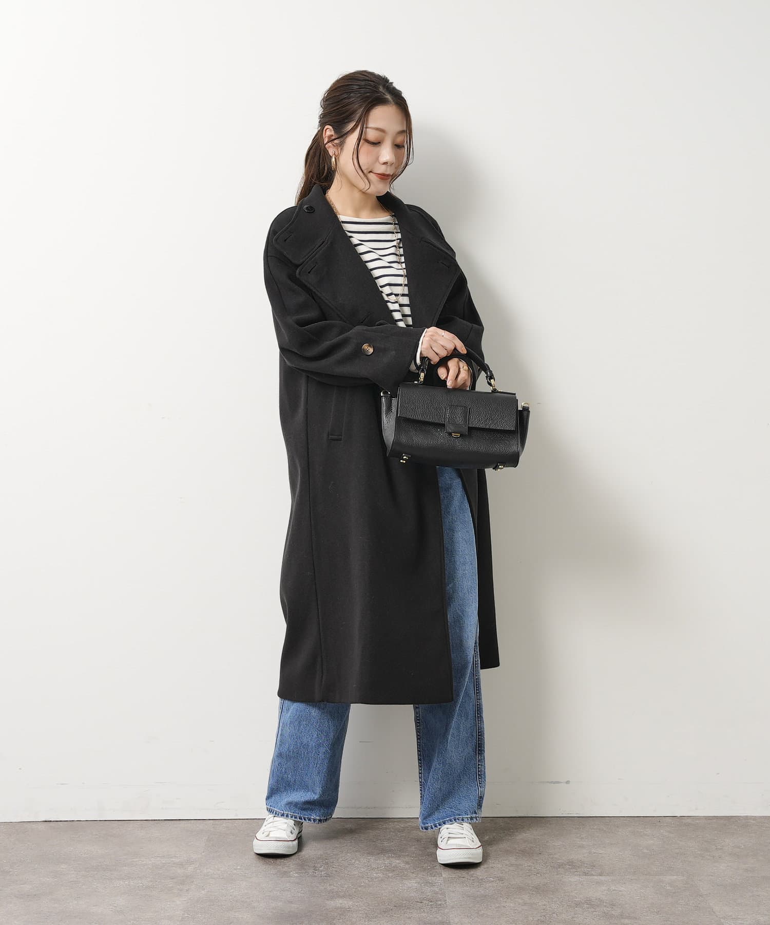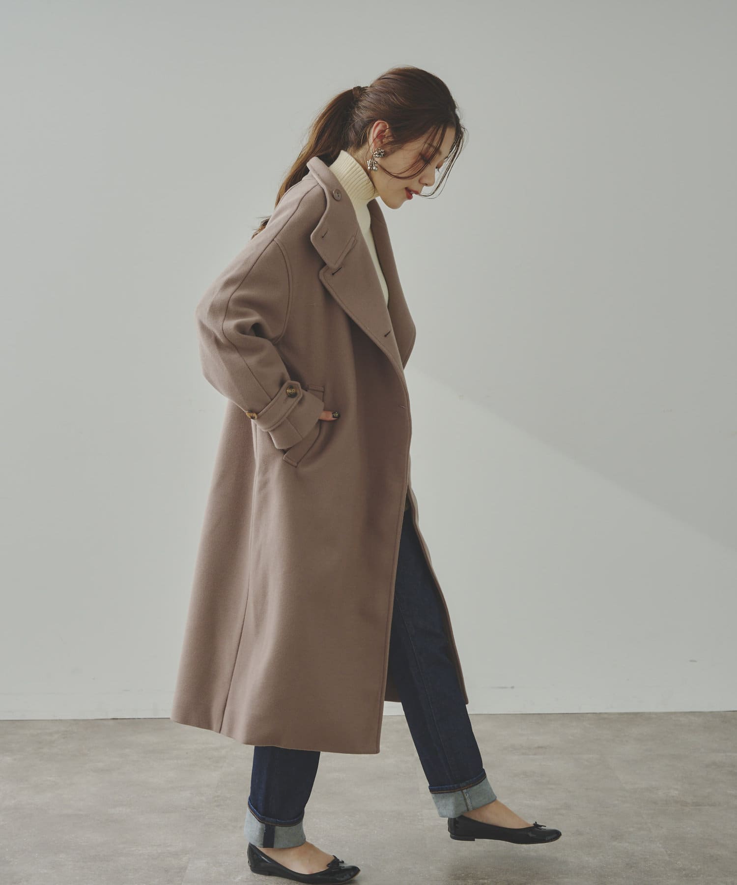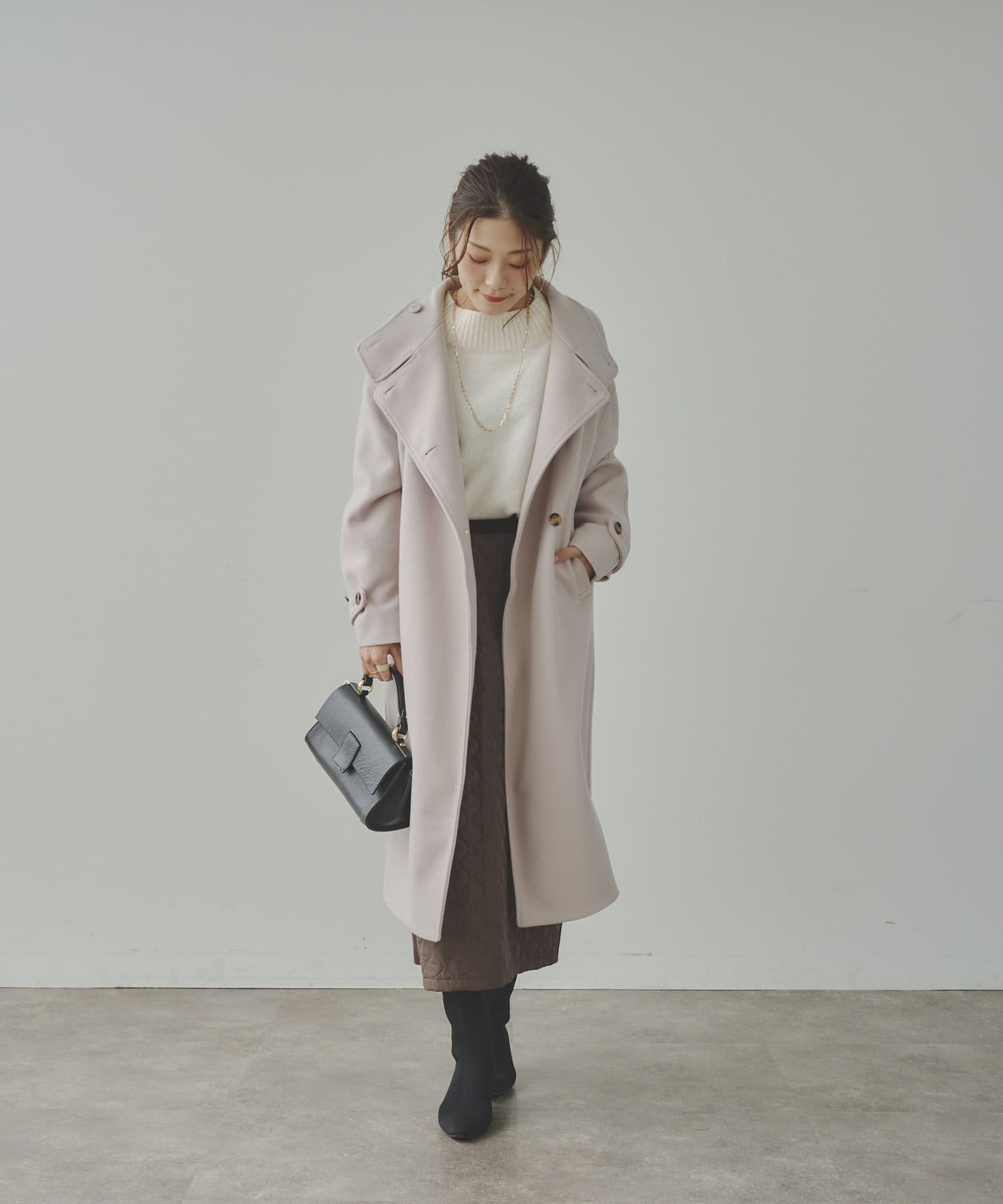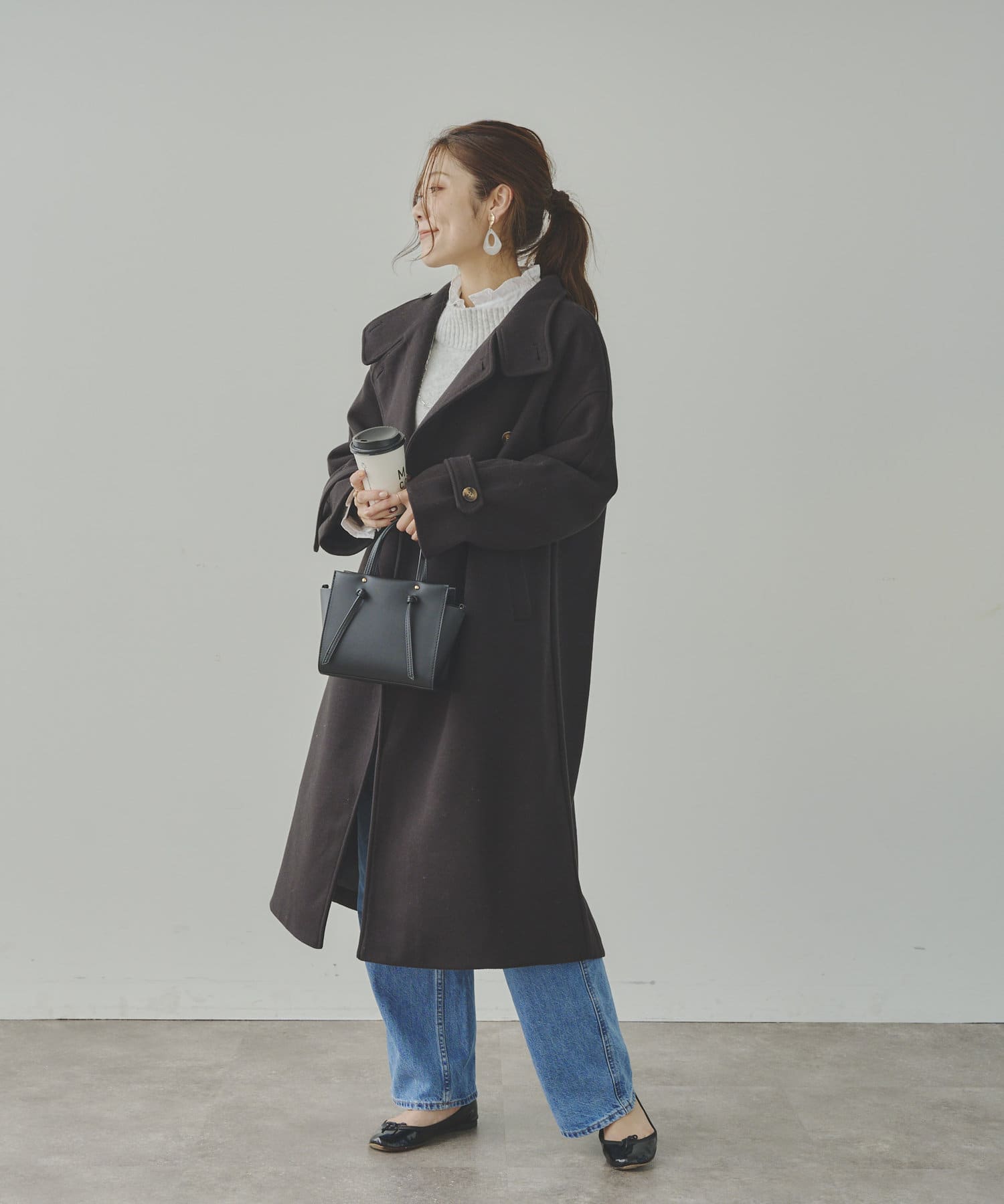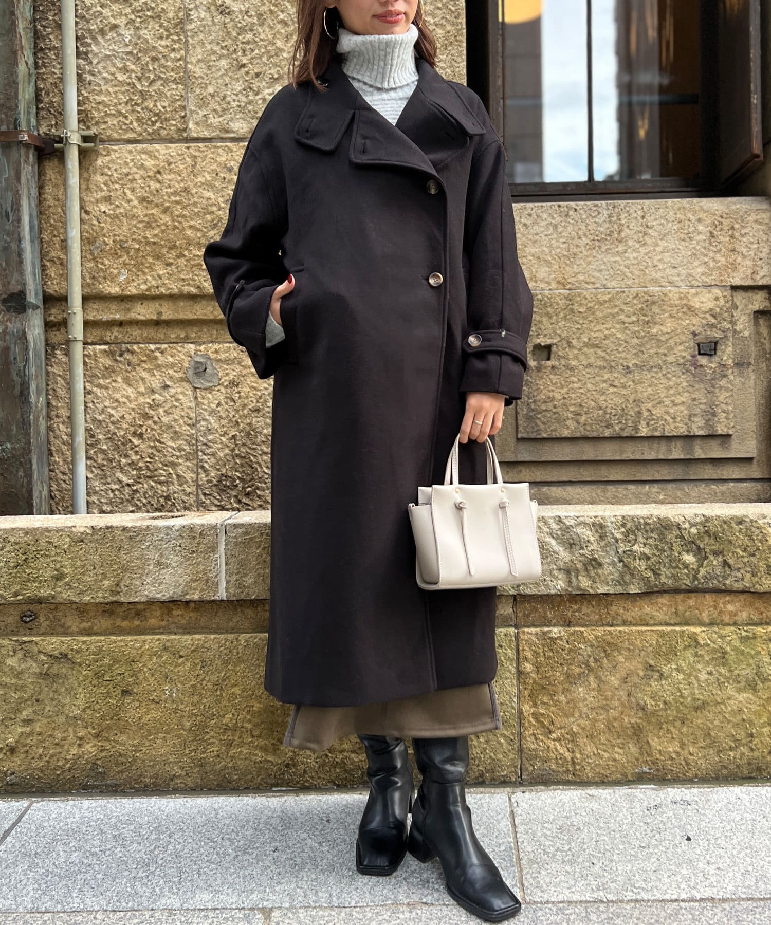 ベーシックなロングコートなので、どんなコーディネートにもマッチします。